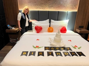 Quelques minutes dans le bus et nous étions de retour à l’hôtel. Denise a eu la surprise de voir que son garçon de chambre lui avait aménagé un beau décor de fête sur son lit!