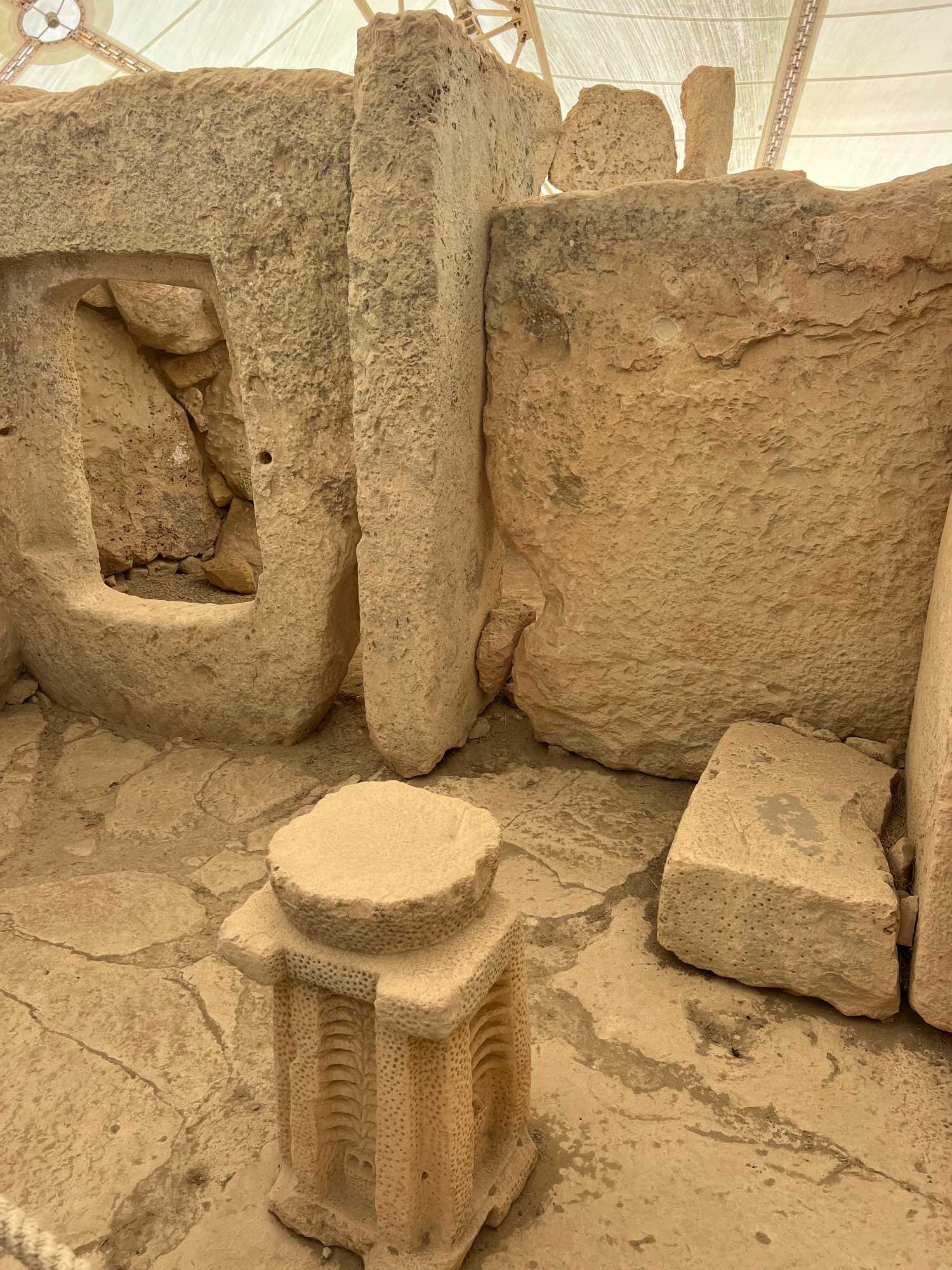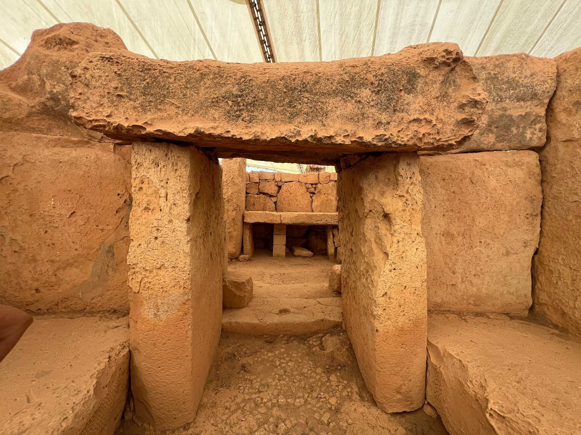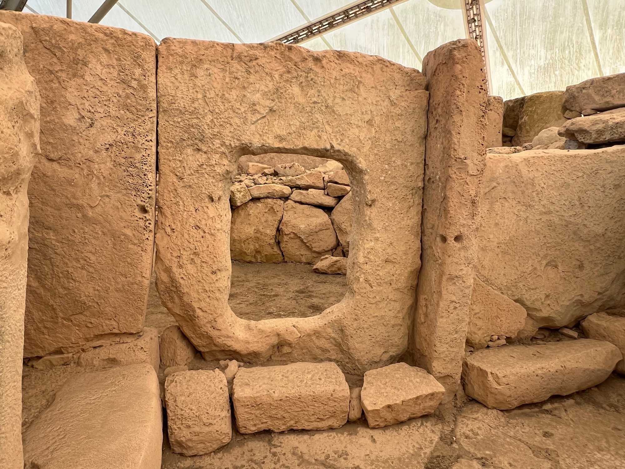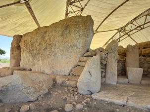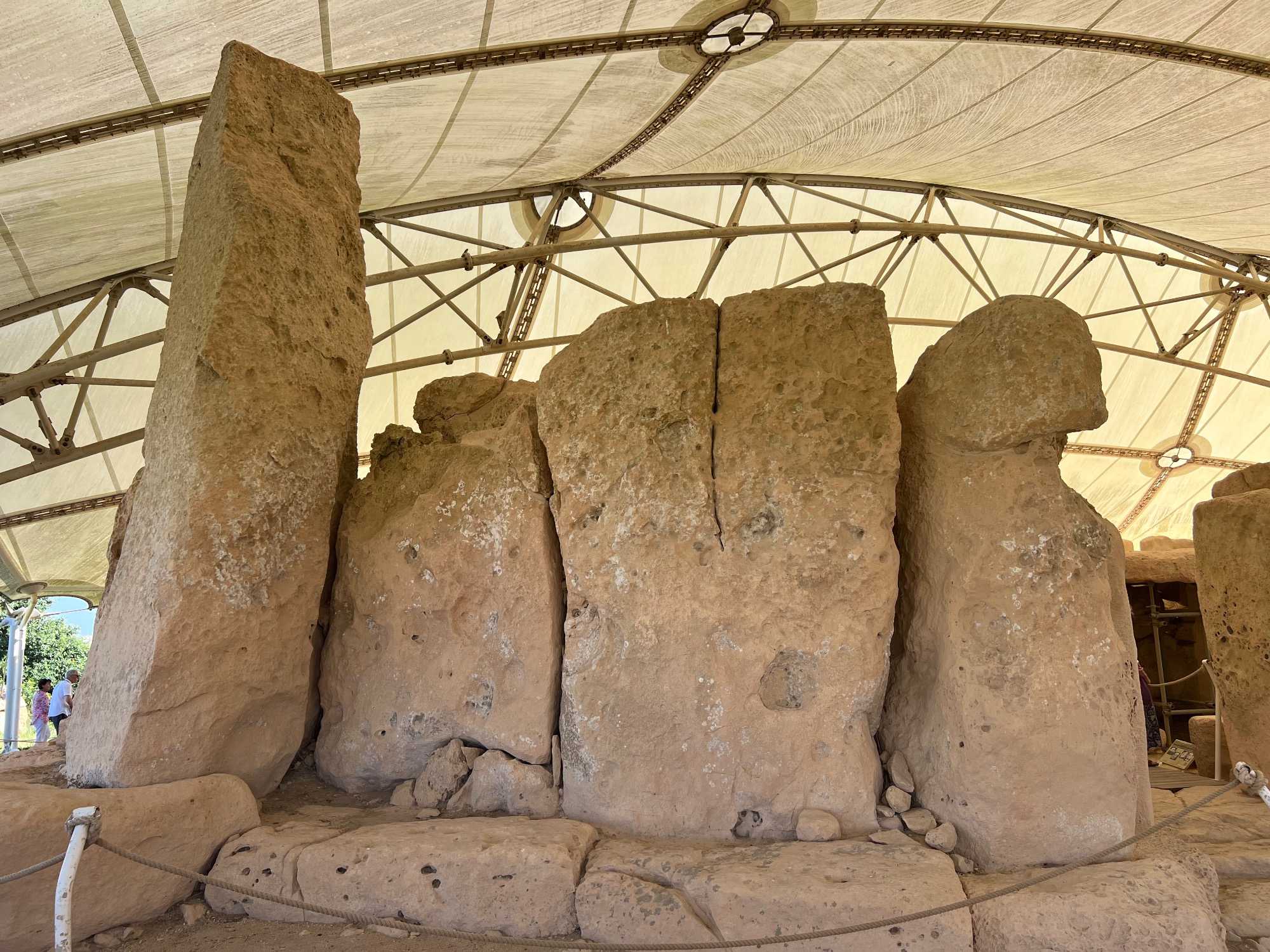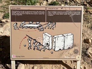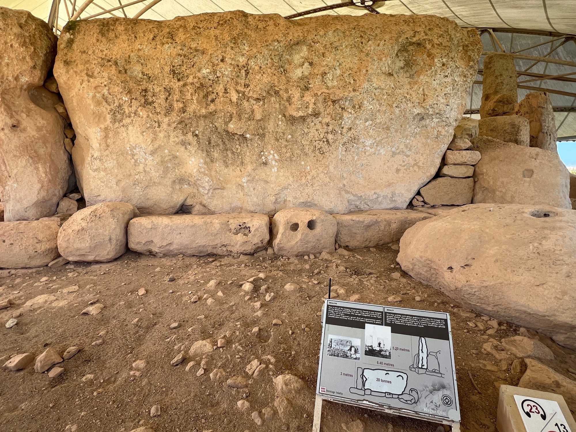 Hagar Qim signifie « les pierres dressées » : celles-ci sont très impressionnantes lorsque l'on arrive au pied du temple et de son porche monumental ouvrant sur deux cours successives. Une gigantesque pierre dressée de 4,50 m de haut domine l'enceinte extérieure ainsi que le plus gros mégalithe des temples de Malte, un géant de 7 m de long dont on estime le poids à 20 tonnes. Il ne manquait plus qu’Obélix dans le décor! 🤪