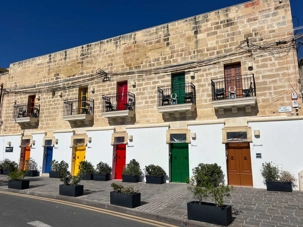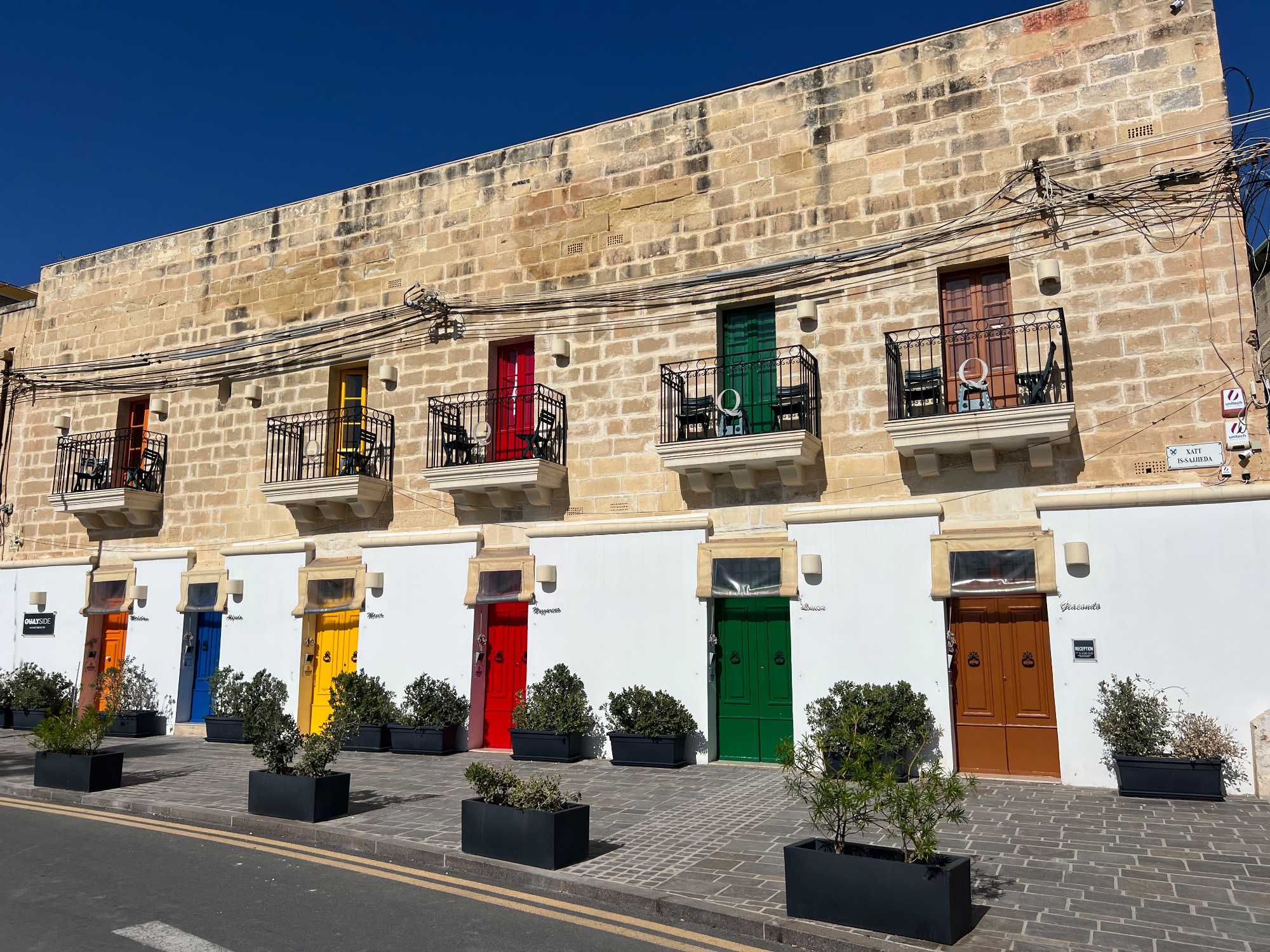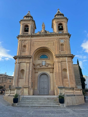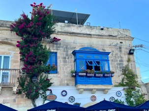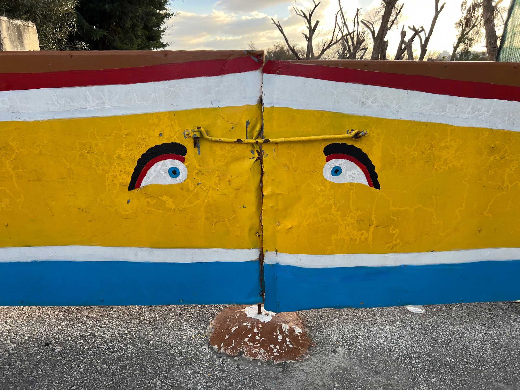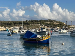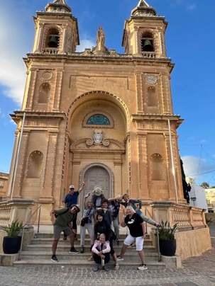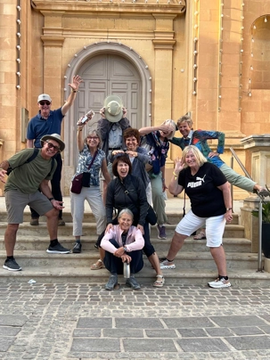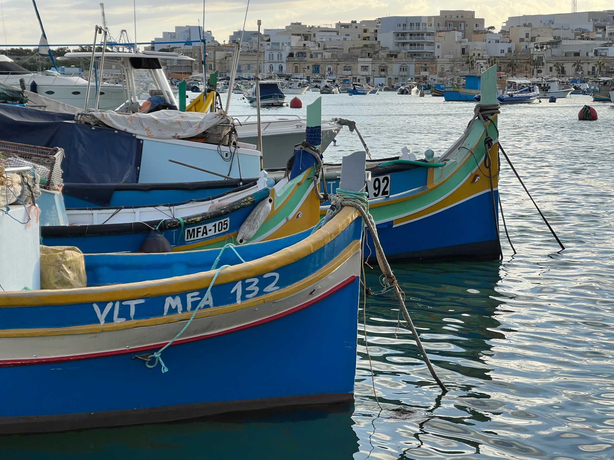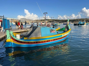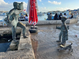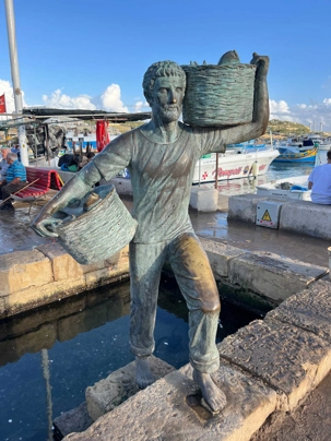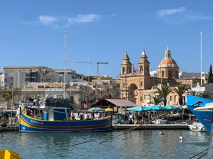 Aujourd'hui, Marsaxlokk est le plus grand port de pêche de l'archipel, ce qui ne l'empêche pas de rester un charmant village qui a gardé son authenticité. Sur la petite place pavée, face à la mer, l’église présente en haut de sa façade une statue de la Vierge à bord d'un « luzzu », une embarcation colorée dont la proue est peinte d'un œil d'Isis censé protéger du mauvais sort. C’est devant cette église que mes joyeux lurons ont pris une pose rigolote…