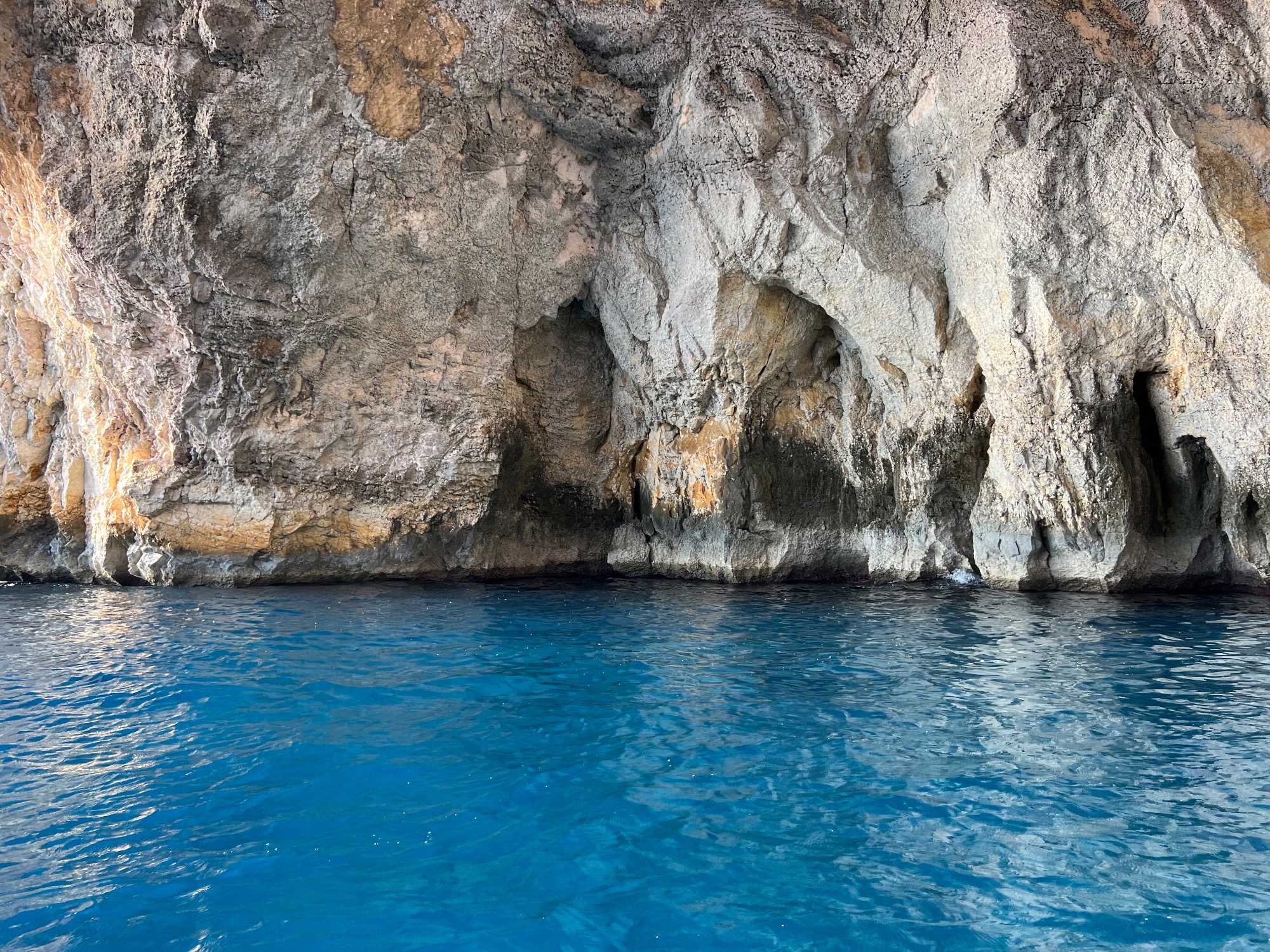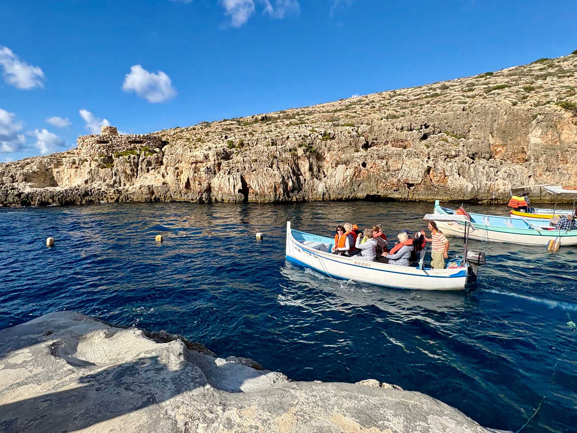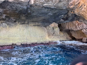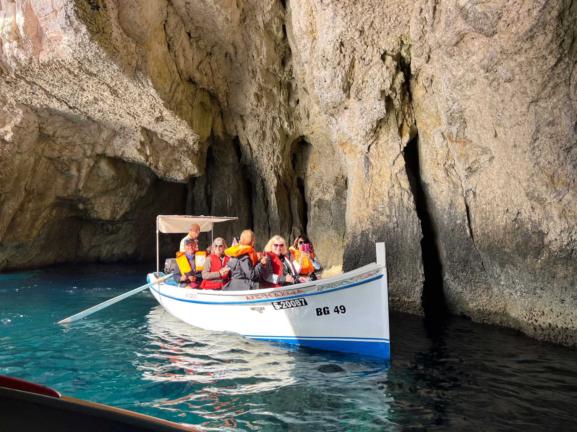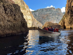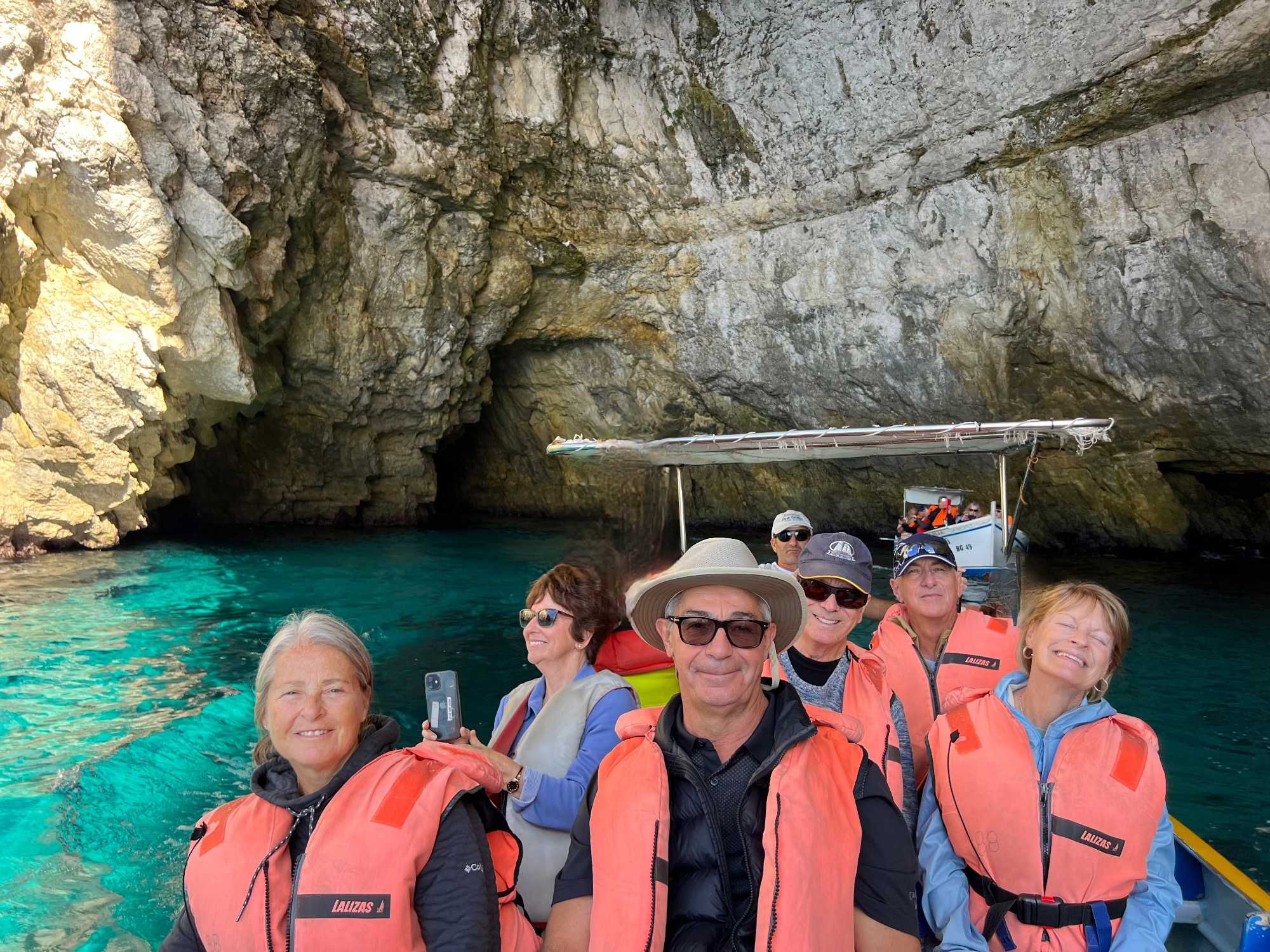 Notre premier arrêt se fait à la grotte bleue. Nous devions faire cette sortie en mer dimanche dernier mais le vent venant du sud nous en avait empêché. Aujourd’hui, le vent vient du nord-ouest, alors on peut s’y rendre. Quelle belle excursion! Nous embarquons dans de petits bateaux qui longent de hautes falaises. Wow! Que c’est beau. L’eau prend toutes les nuances de vert et bleu. On s’exclame, on prend des tonnes de photos, on se prend en photos mutuellement dans nos différents bateaux. C’est magique!