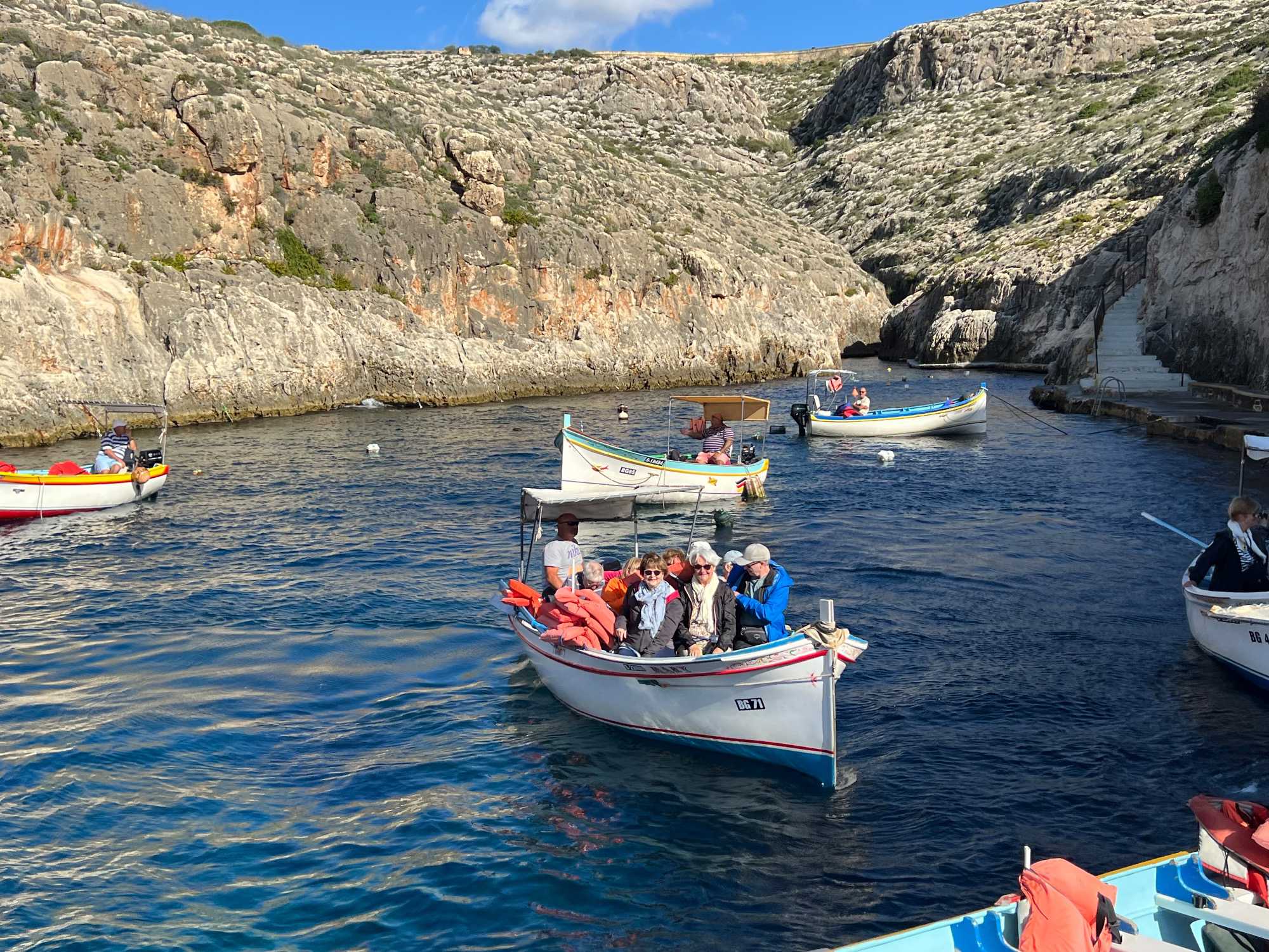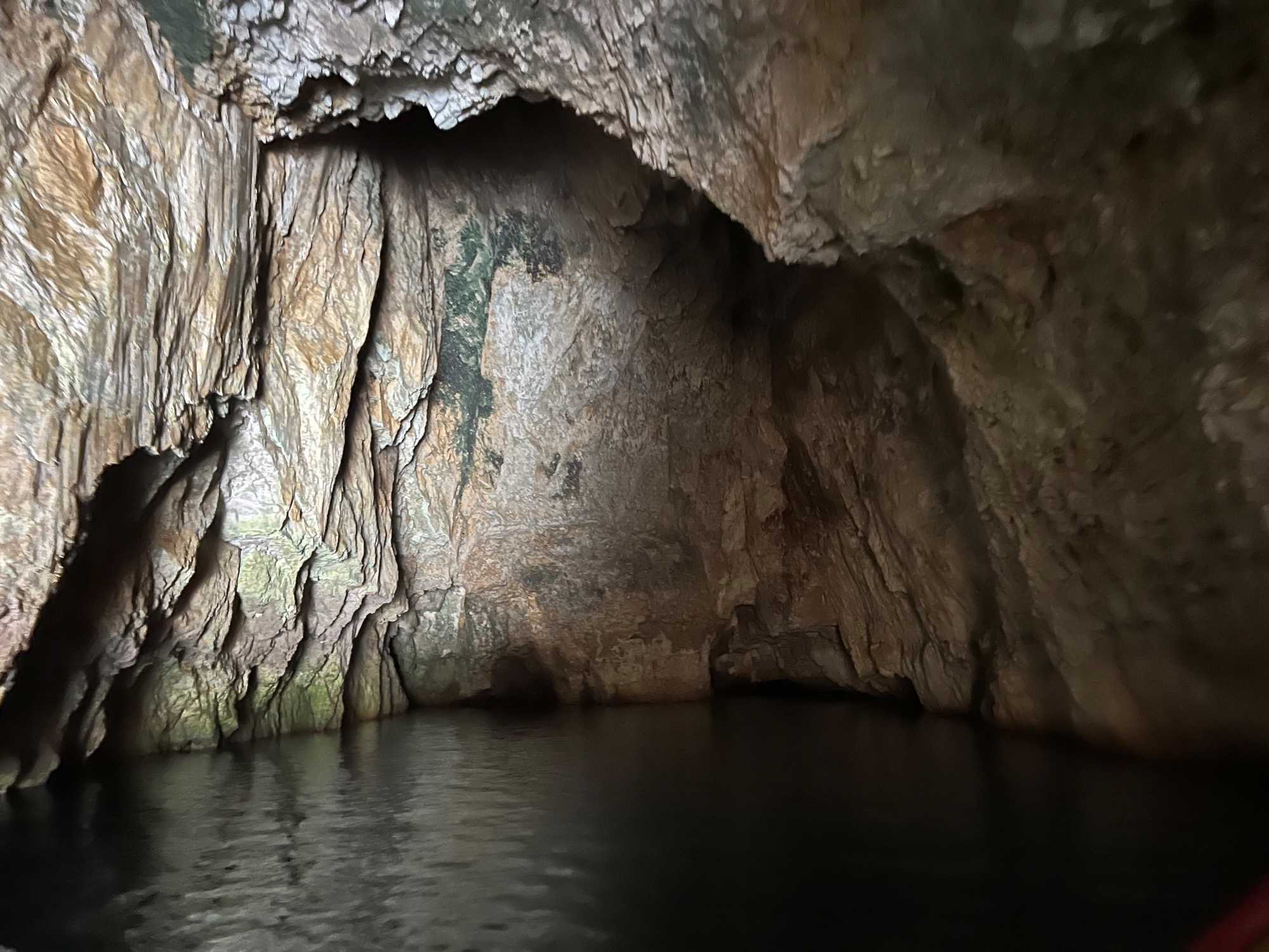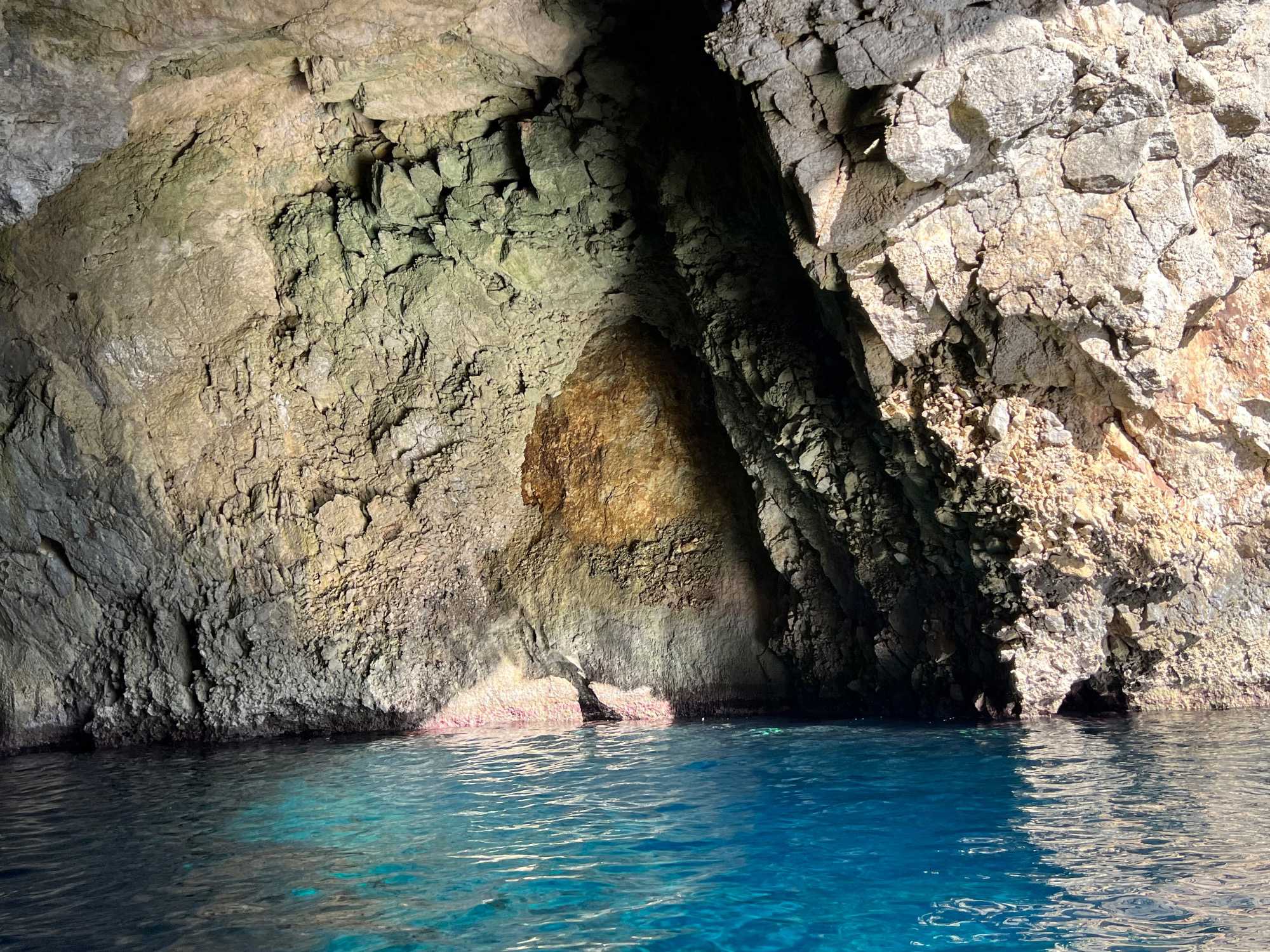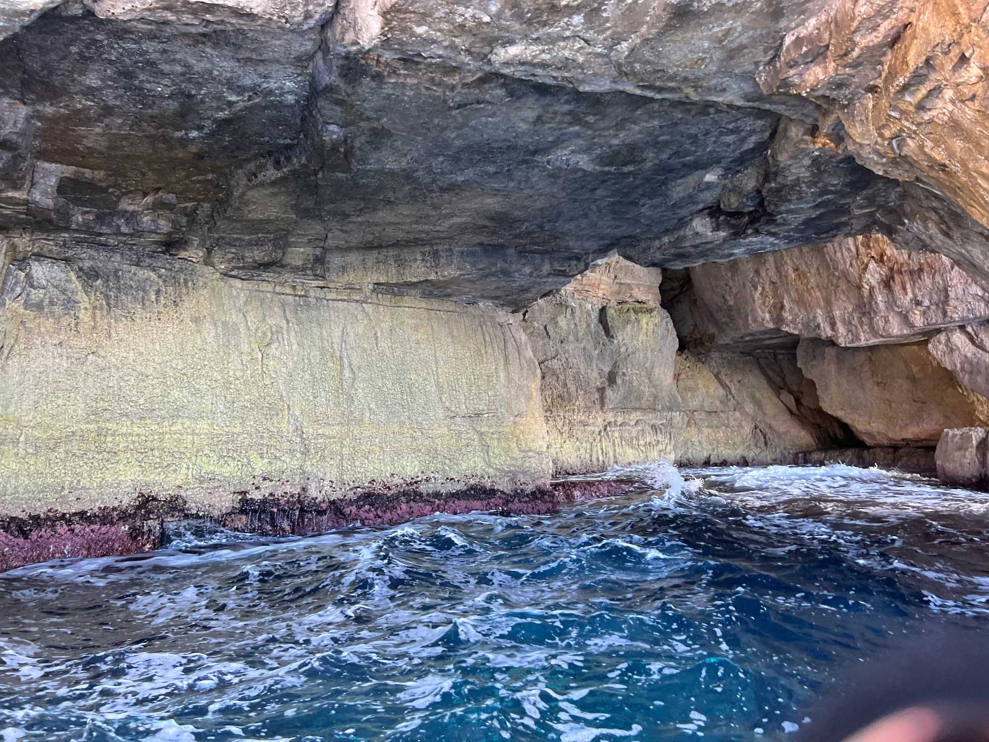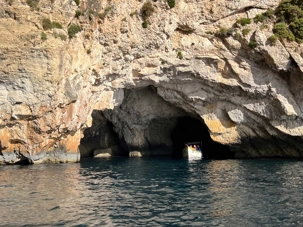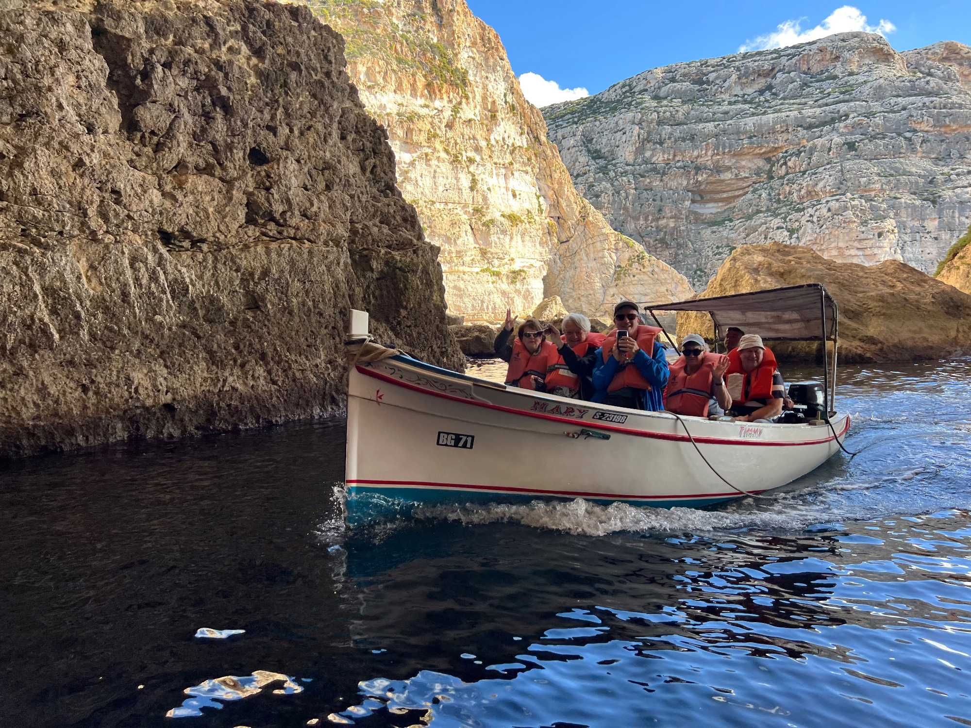 Notre premier arrêt se fait à la grotte bleue. Nous devions faire cette sortie en mer dimanche dernier mais le vent venant du sud nous en avait empêché. Aujourd’hui, le vent vient du nord-ouest, alors on peut s’y rendre. Quelle belle excursion! Nous embarquons dans de petits bateaux qui longent de hautes falaises. Wow! Que c’est beau. L’eau prend toutes les nuances de vert et bleu. On s’exclame, on prend des tonnes de photos, on se prend en photos mutuellement dans nos différents bateaux. C’est magique!
