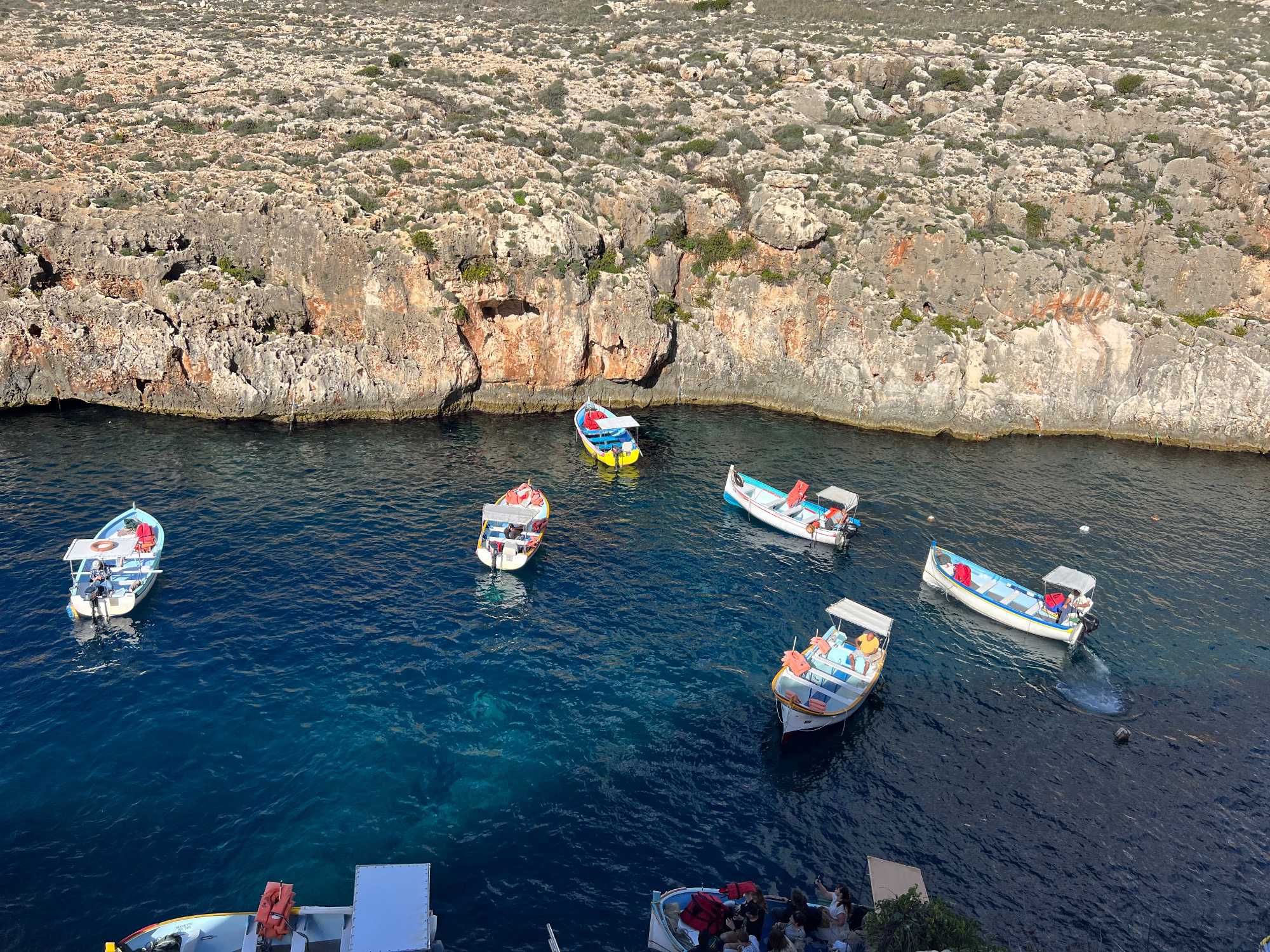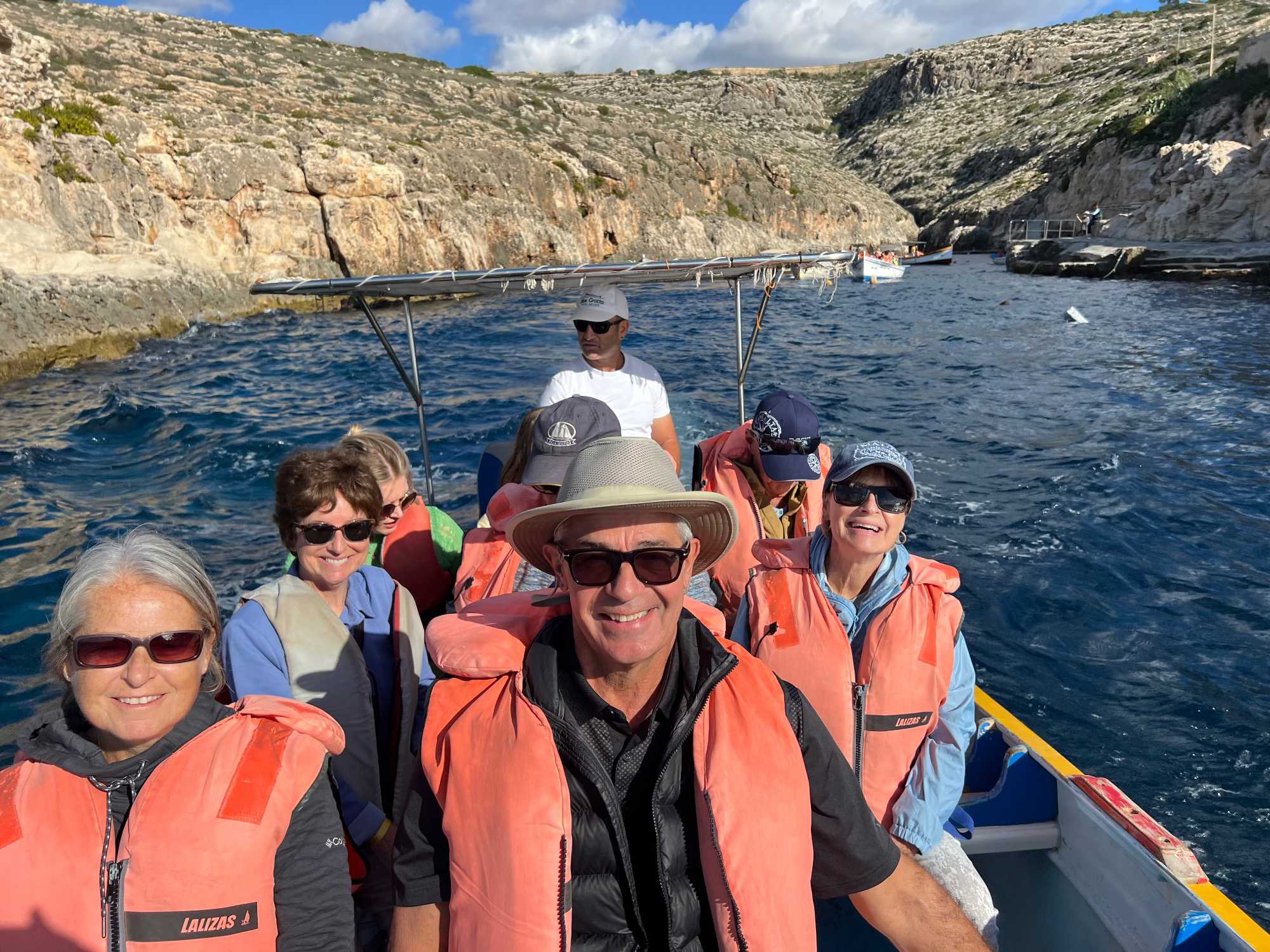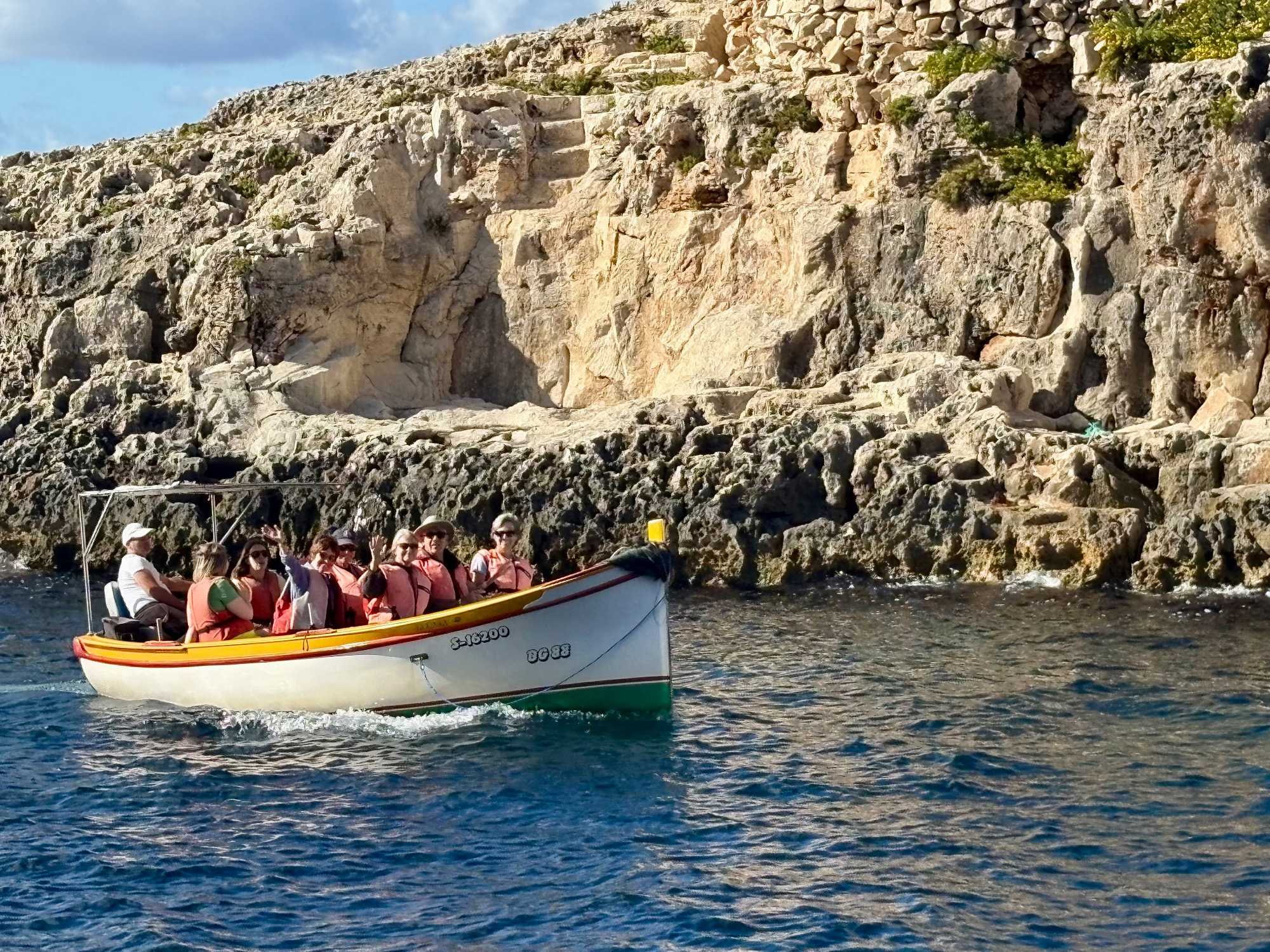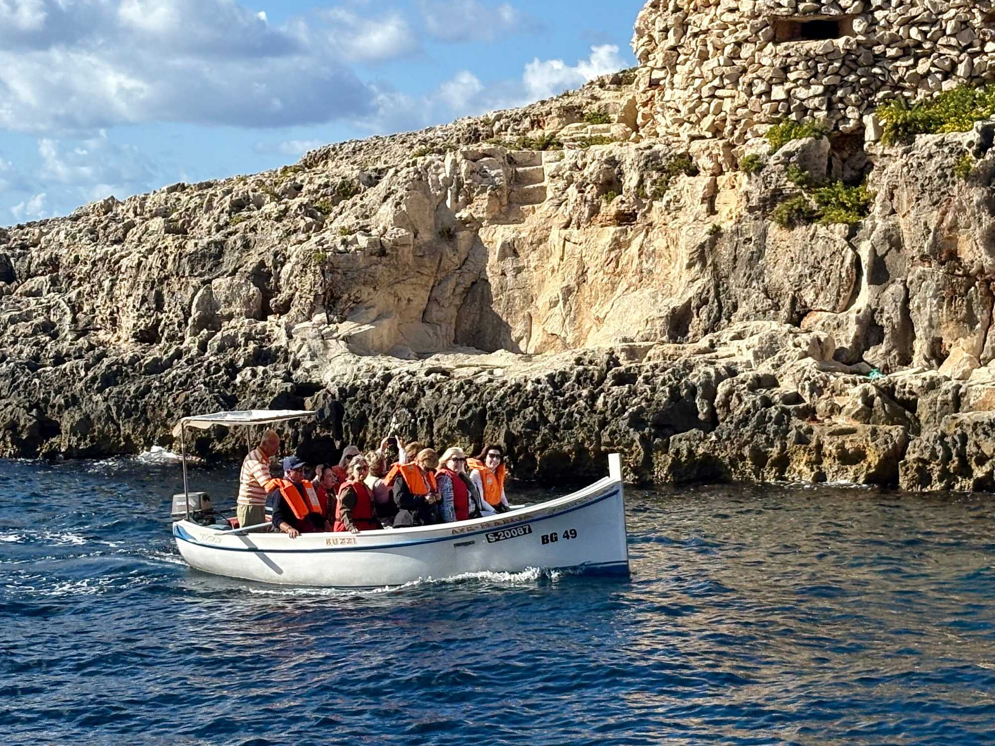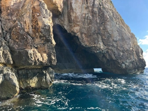Notre premier arrêt se fait à la grotte bleue. Nous devions faire cette sortie en mer dimanche dernier mais le vent venant du sud nous en avait empêché. Aujourd’hui, le vent vient du nord-ouest, alors on peut s’y rendre. Quelle belle excursion! Nous embarquons dans de petits bateaux qui longent de hautes falaises. Wow! Que c’est beau. L’eau prend toutes les nuances de vert et bleu. On s’exclame, on prend des tonnes de photos, on se prend en photos mutuellement dans nos différents bateaux. C’est magique!