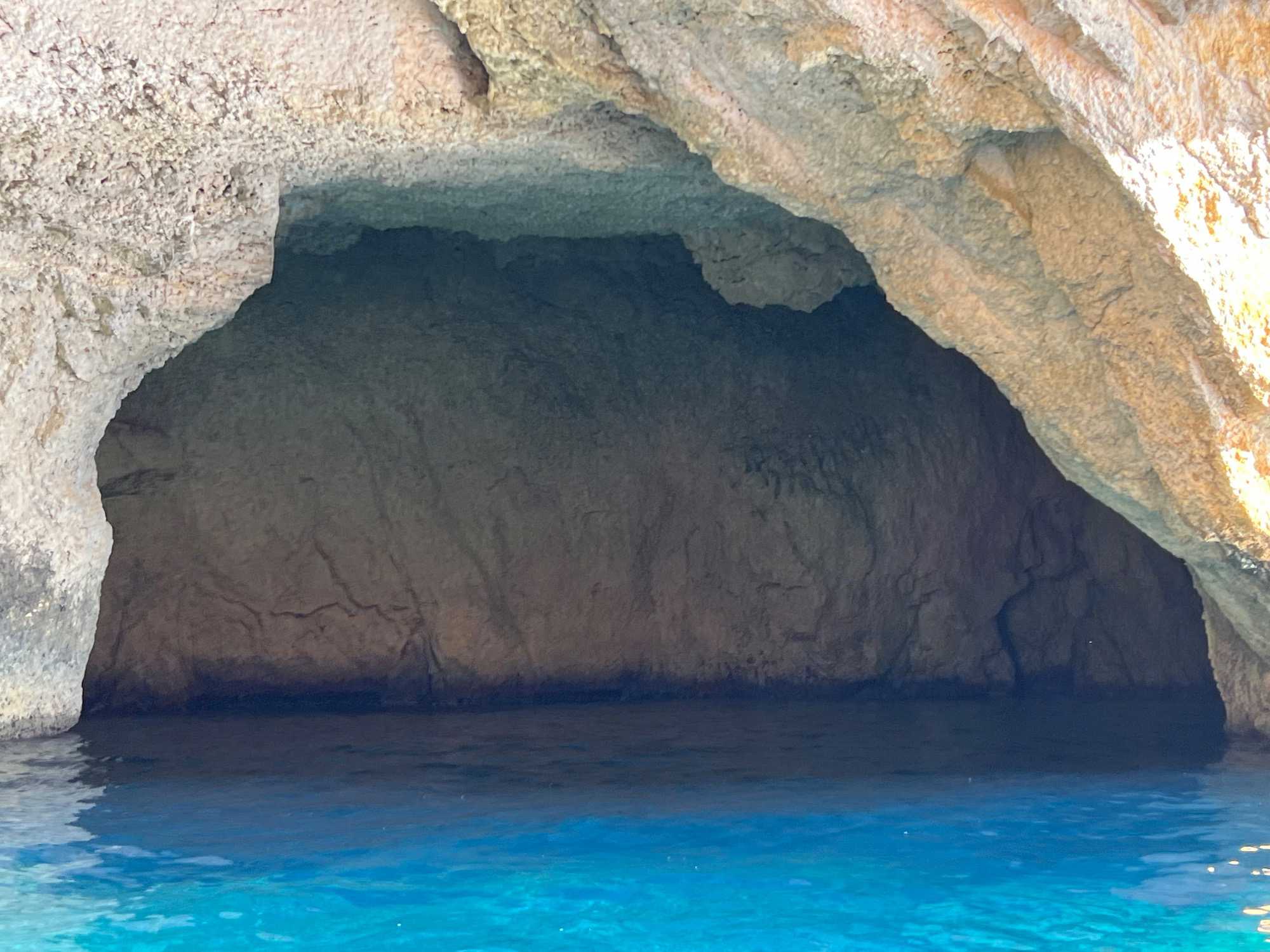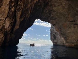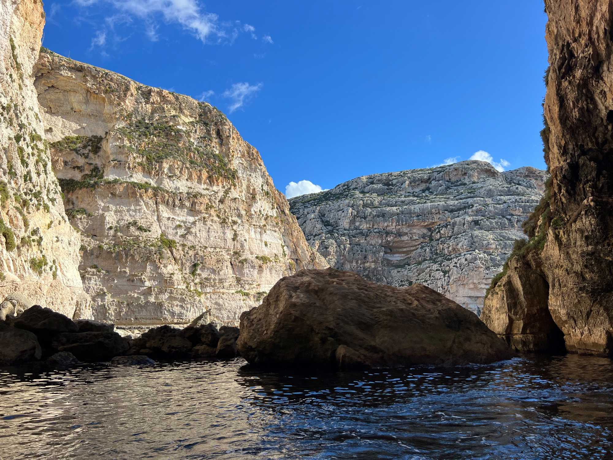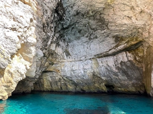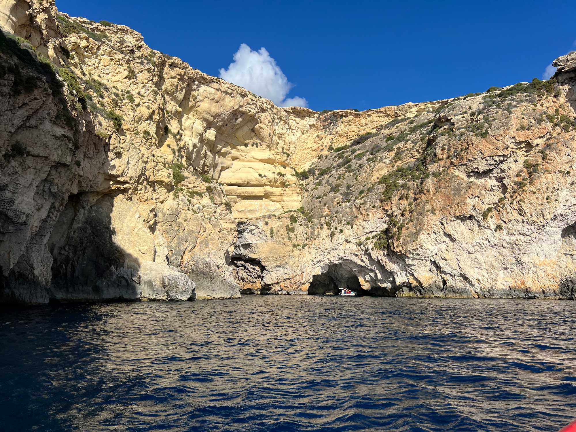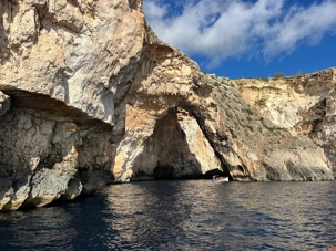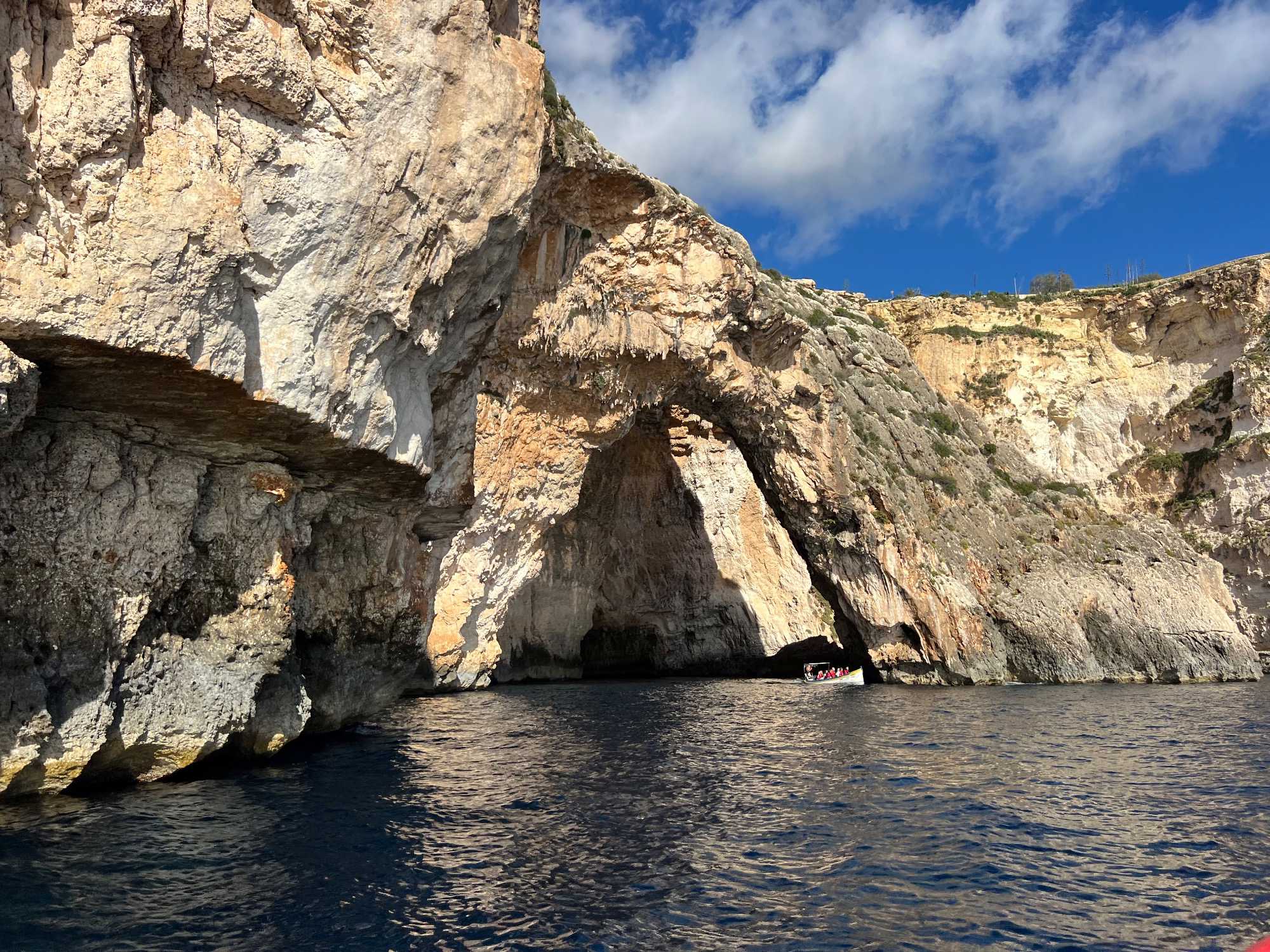 La grotte bleue est une immense arche naturelle. Longue de 43m et plongeant jusqu’à 40m sous la mer, elle est enchevêtrée avec six autres grottes successives. On doit son nom à des soldats britanniques basés à Malte dans les années 50 qui trouvaient qu’elle ressemblait à la Grotta Azzura de l’île de Capri.