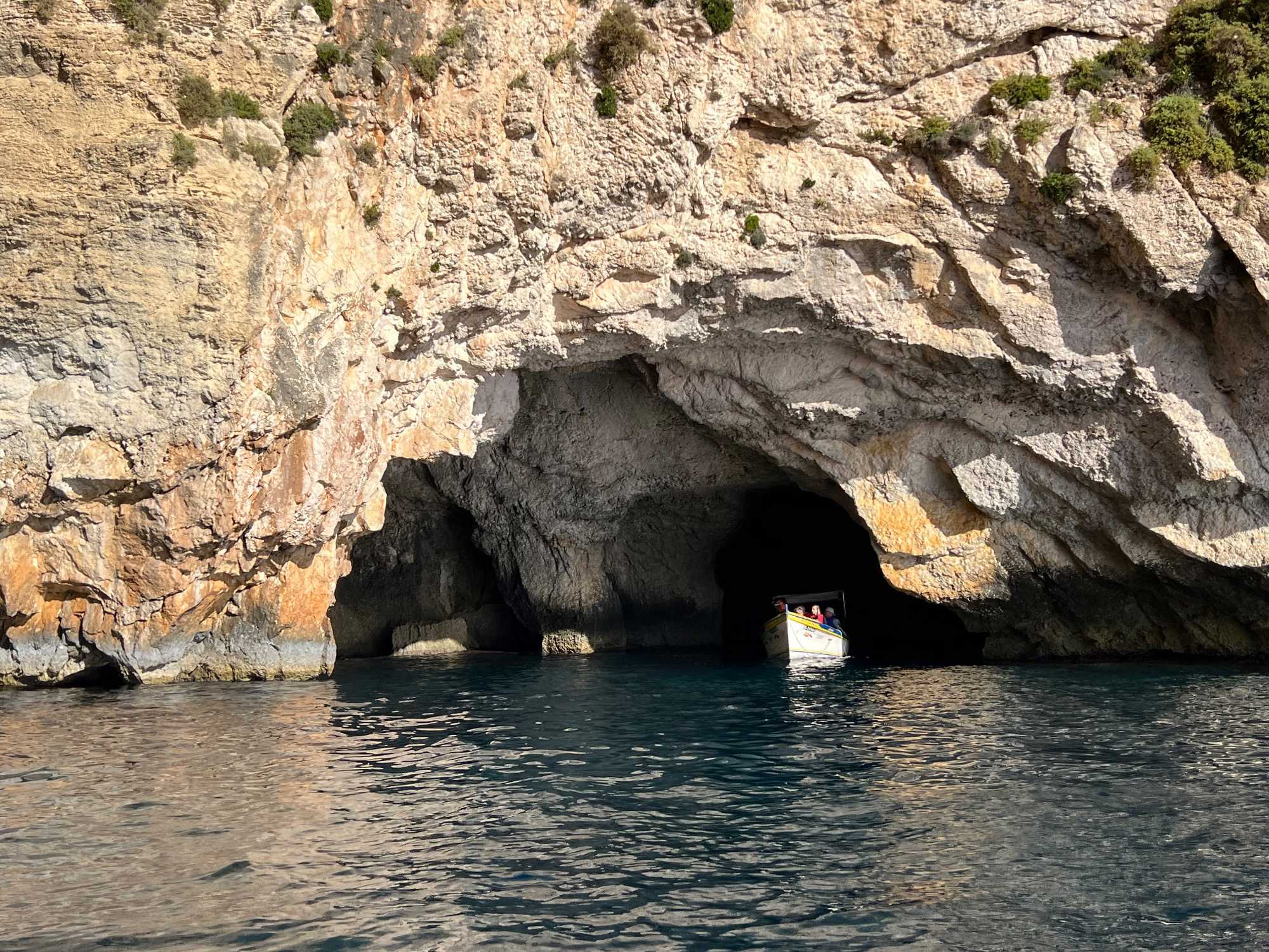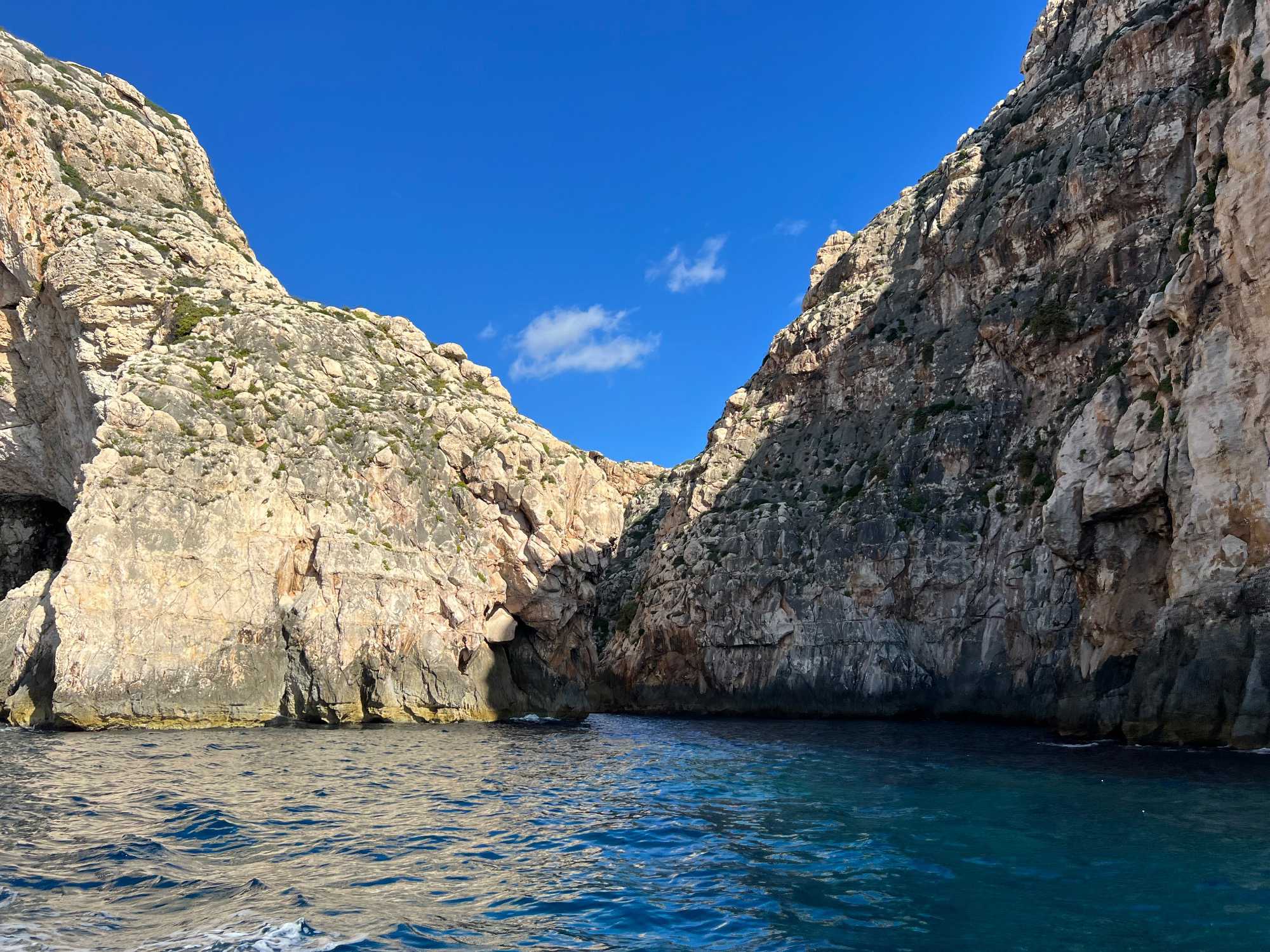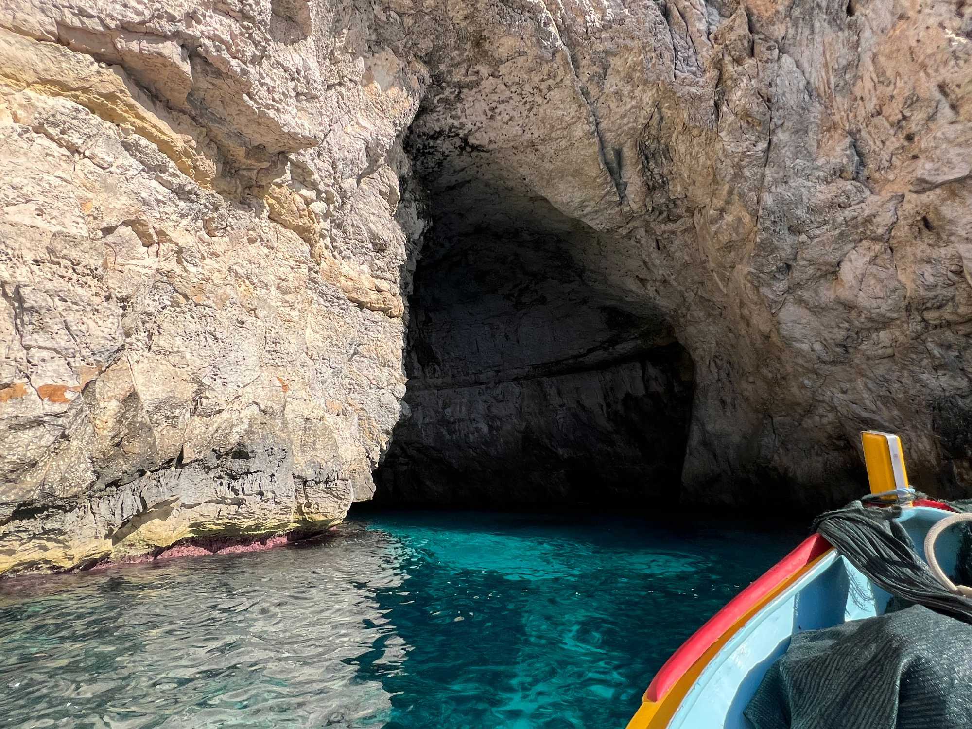 La grotte bleue est une immense arche naturelle. Longue de 43m et plongeant jusqu’à 40m sous la mer, elle est enchevêtrée avec six autres grottes successives. On doit son nom à des soldats britanniques basés à Malte dans les années 50 qui trouvaient qu’elle ressemblait à la Grotta Azzura de l’île de Capri.