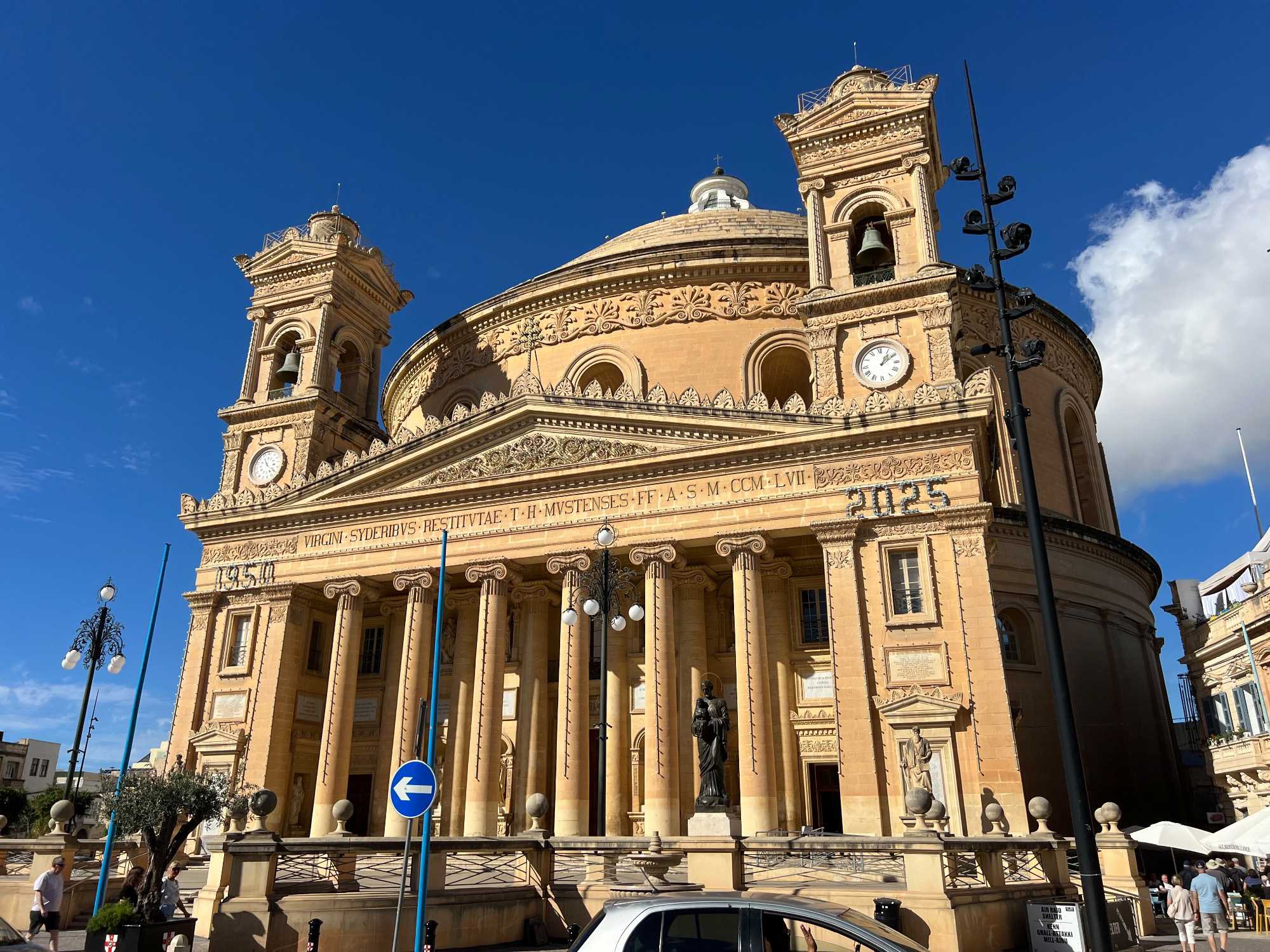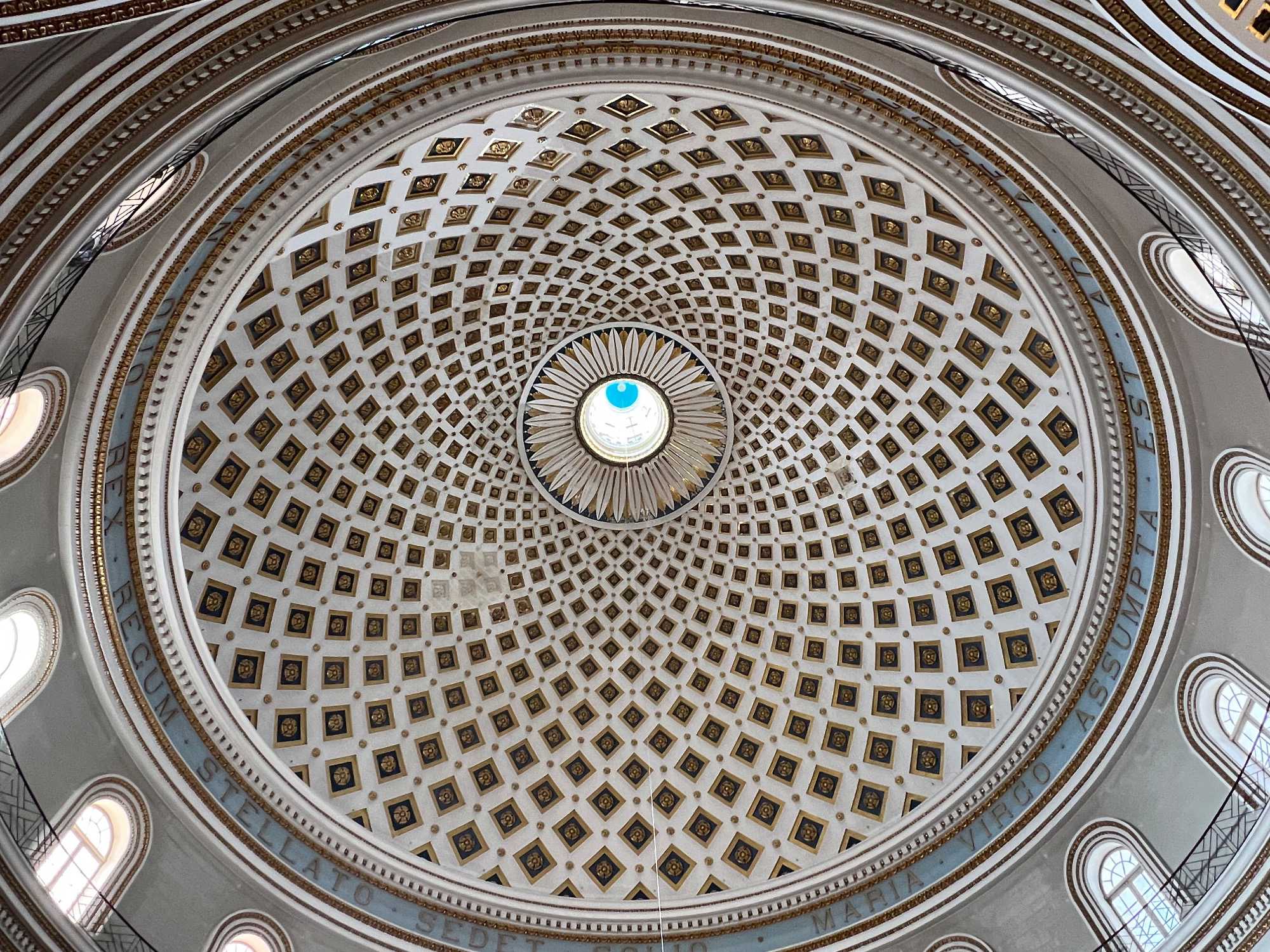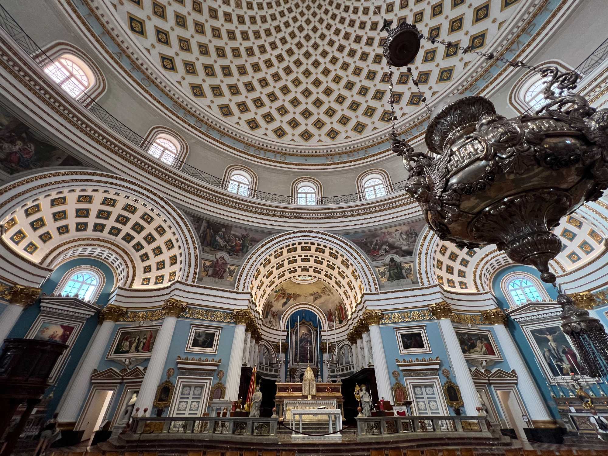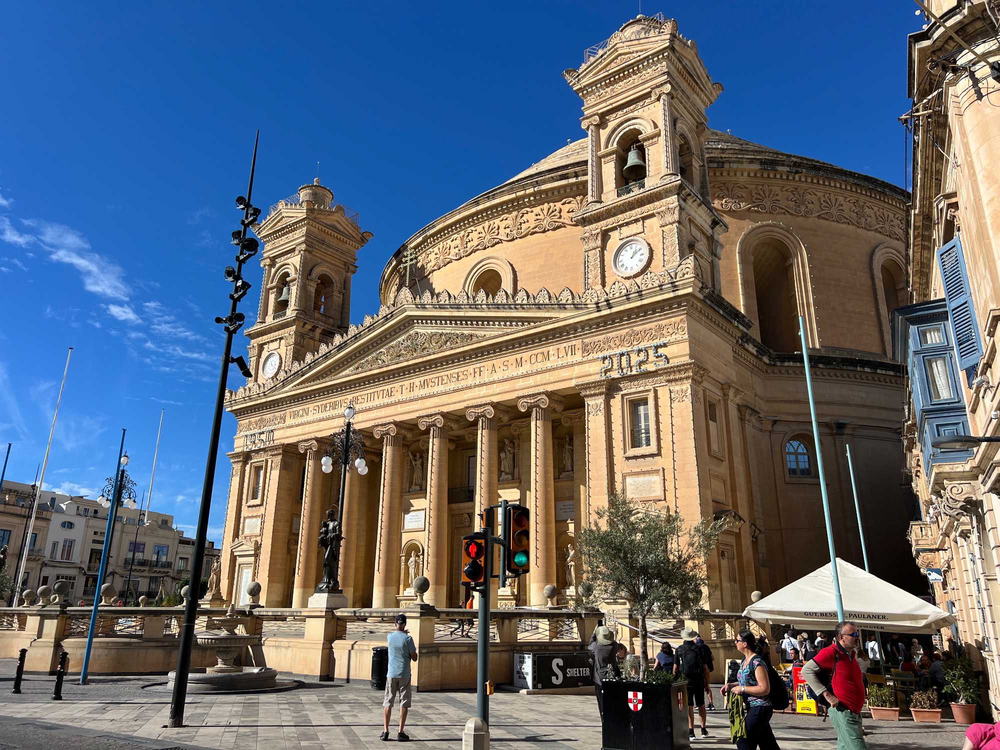 Par la suite nous visitons l’emblème de Mosta: son église. La cité de Mosta, troisième ville la plus peuplée de l'île, est surtout réputée du fait de son impressionnant dôme. La coupole colossale de l'église paroissiale dédiée à la Vierge constitue toute la fierté de Mosta. Conçu par l'architecte Glorgio Grognet de Vasse, elle fut en partie construite par des bénévoles grâce aux dons de paroissiens. Achevé en 1860, l'imposant édifice est une véritable gageure pour l'époque: Il peut accueillir jusqu'à 10 000 personnes, et son dôme, haut de 61 m, passe pour être le quatrième au monde par son diamètre (39,60 m) après ceux de Saint-Pierre de Rome, de Sainte-Sophie à Istanbul et de Xewkija (également à Malte). Bâtie dans le style néoclassique, la façade, scandée d'immenses colonnes ioniques, s'inspire du Panthéon de Rome. La sacristie conserve la bombe qui traversa la Rotunda le 9 avril 1942 sans exploser: un vrai miracle comme les aiment les Maltais!