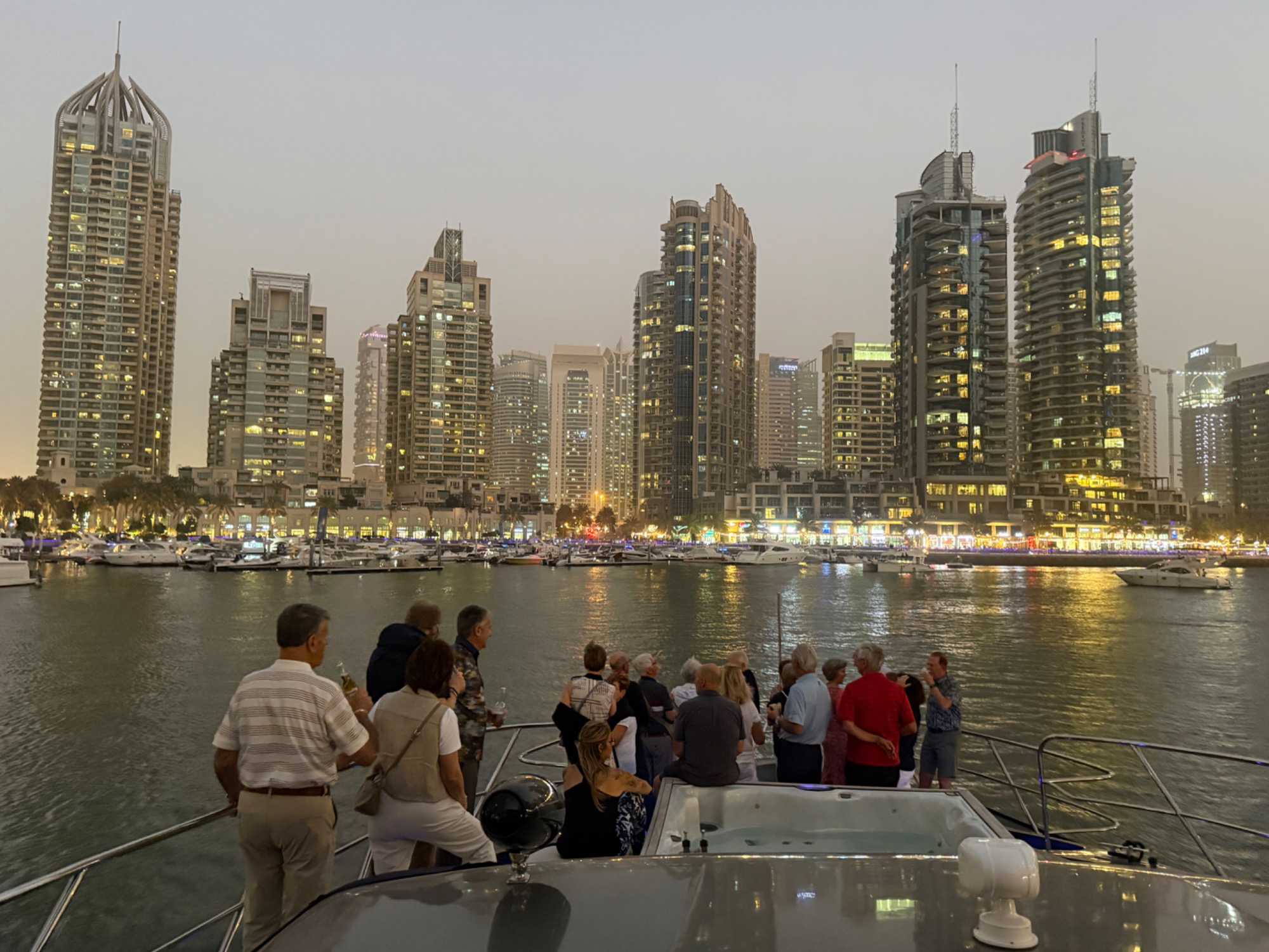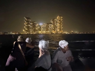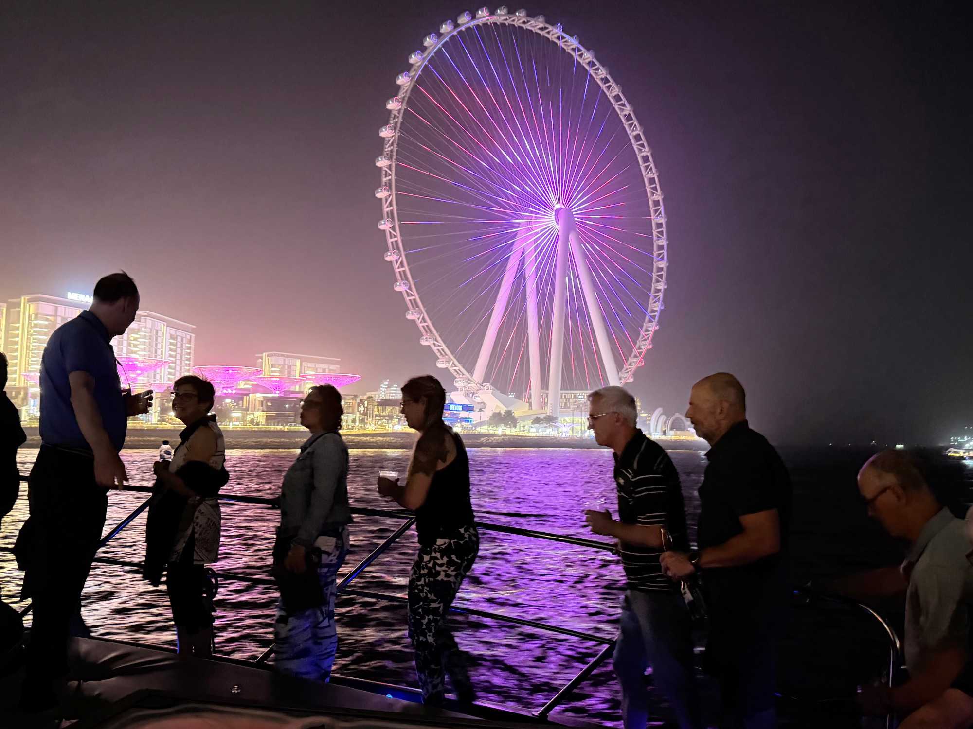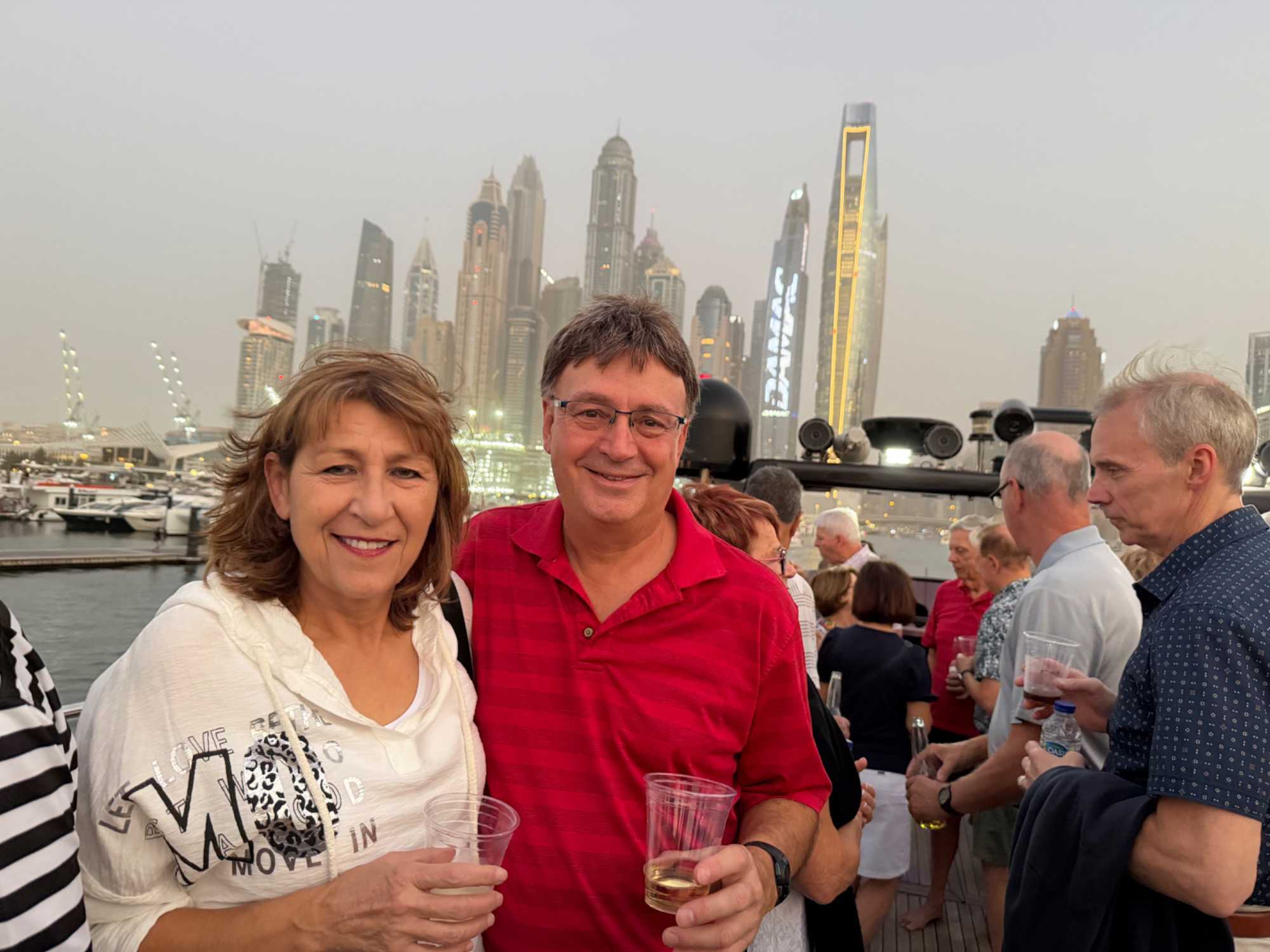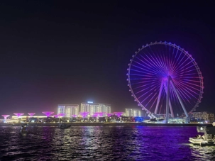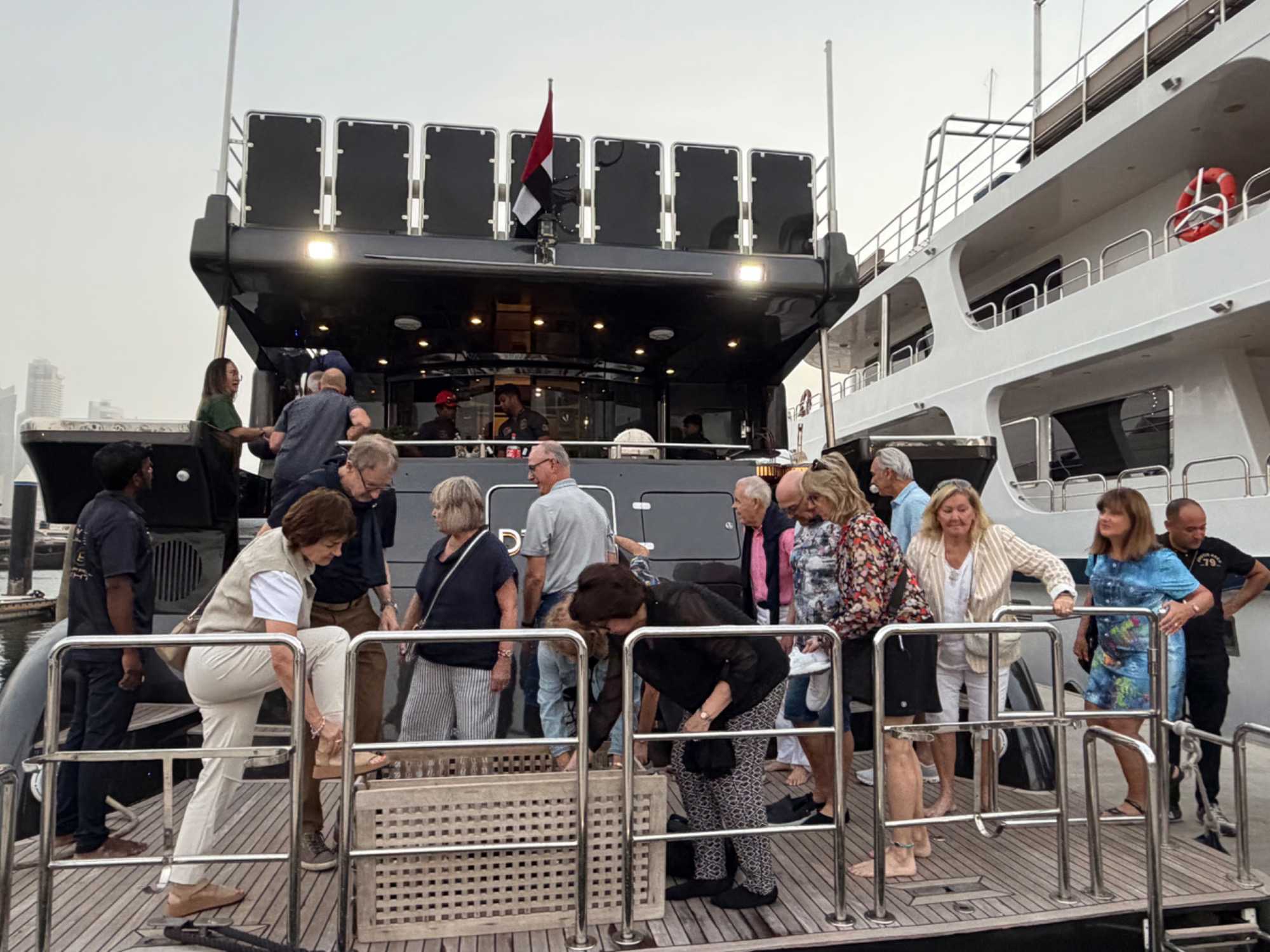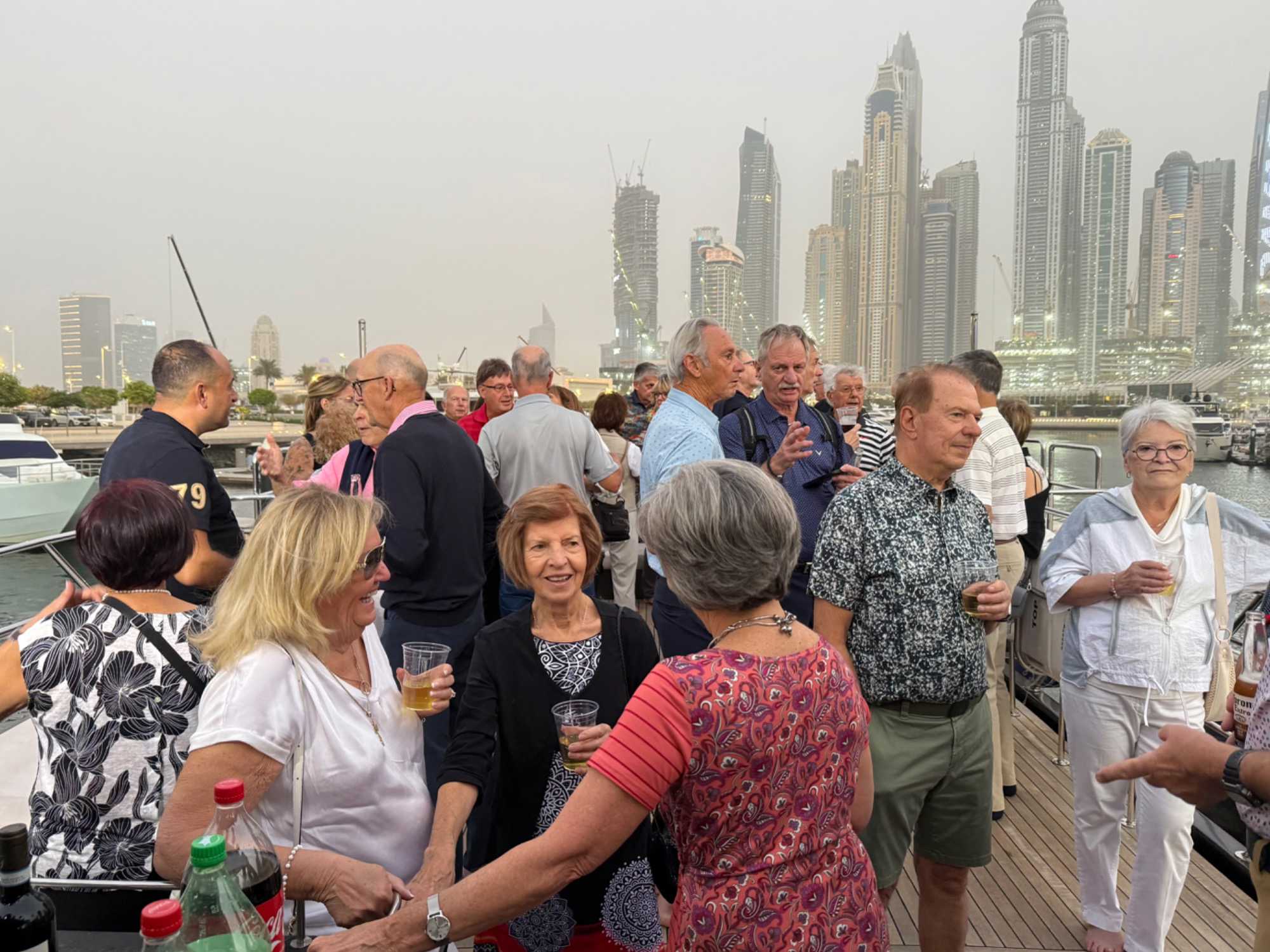 En fin d’après-midi, un transfert privé nous attendait pour rejoindre la Marina de Dubaï et embarquer sur notre yacht privatisé. Ce bateau de 65 pieds offrait tout le confort imaginable : salon lumineux, coin repas convivial, terrasse ombragée et espace de détente en plein air. Nous avons levé l’ancre pour une croisière au coucher du soleil, admirant tour à tour les emblèmes de Dubaï : Ain Dubaï, la plus grande roue du monde, l’île Bluewaters, le Palm Jumeirah et le mythique Burj Al Arab. Un cocktail au soleil couchant, un souper à bord et une ambiance festive ont fait de cette soirée un moment d’exception. De retour à l’hôtel, les sourires sur les visages témoignaient de l’émerveillement de tous. Une journée parfaite, alliant détente, découvertes et magie — un avant-goût du rêve que promet ce voyage inoubliable aux Émirats arabes unis. 🌟