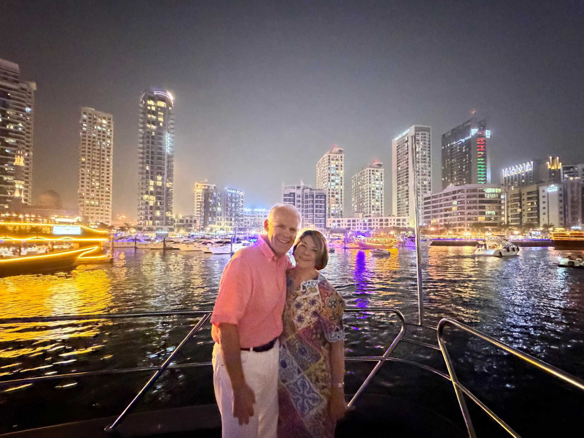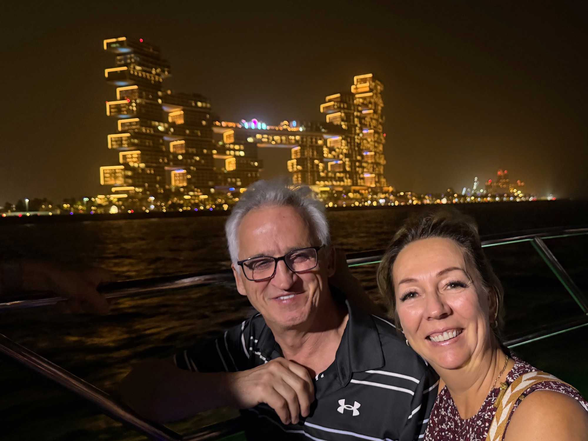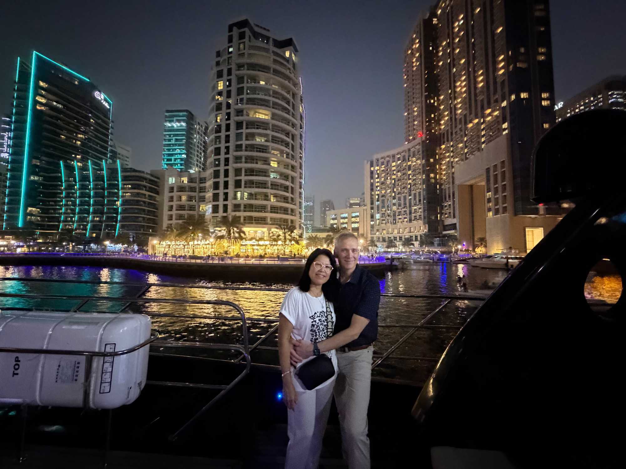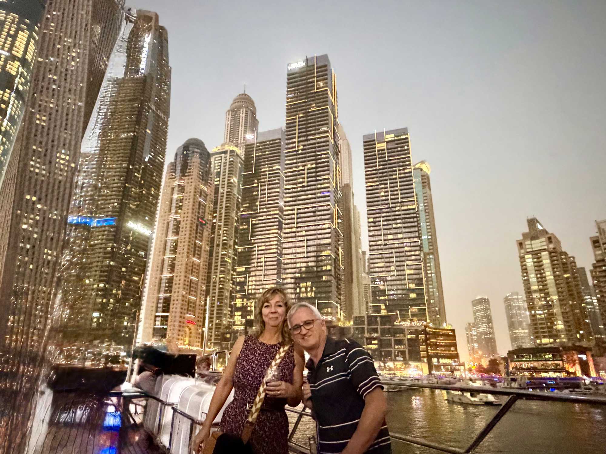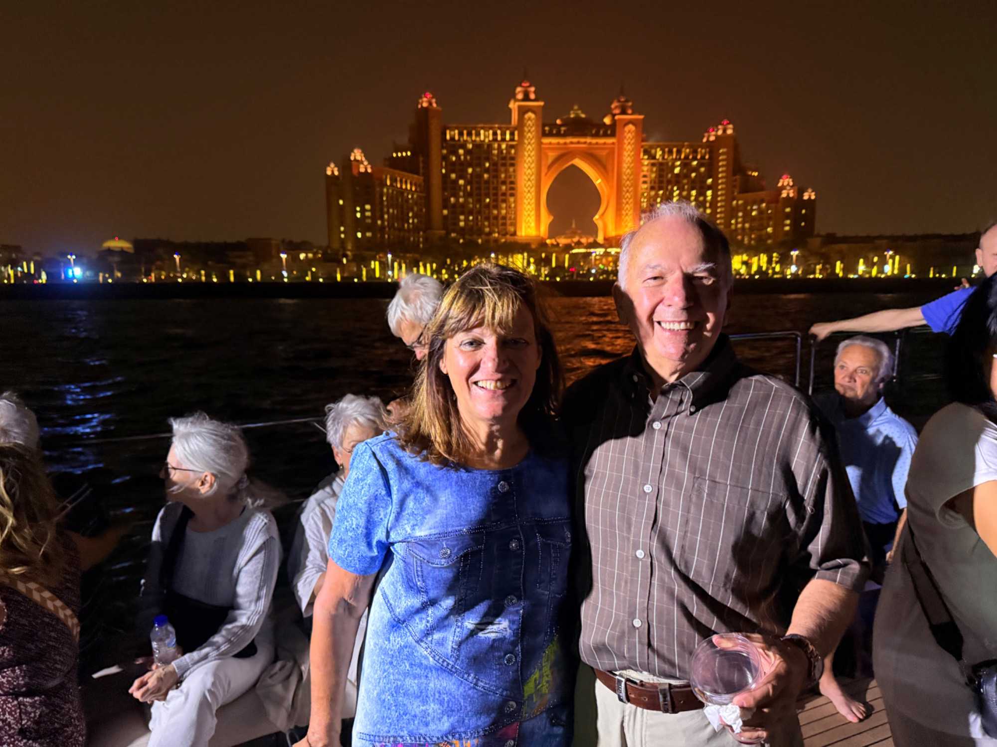 En fin d’après-midi, un transfert privé nous attendait pour rejoindre la Marina de Dubaï et embarquer sur notre yacht privatisé. Ce bateau de 65 pieds offrait tout le confort imaginable : salon lumineux, coin repas convivial, terrasse ombragée et espace de détente en plein air. Nous avons levé l’ancre pour une croisière au coucher du soleil, admirant tour à tour les emblèmes de Dubaï : Ain Dubaï, la plus grande roue du monde, l’île Bluewaters, le Palm Jumeirah et le mythique Burj Al Arab. Un cocktail au soleil couchant, un souper à bord et une ambiance festive ont fait de cette soirée un moment d’exception. De retour à l’hôtel, les sourires sur les visages témoignaient de l’émerveillement de tous. Une journée parfaite, alliant détente, découvertes et magie — un avant-goût du rêve que promet ce voyage inoubliable aux Émirats arabes unis. 🌟