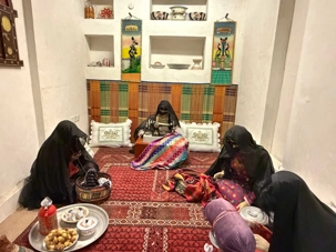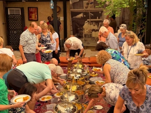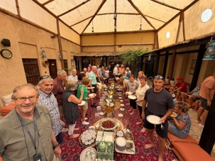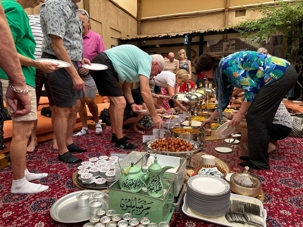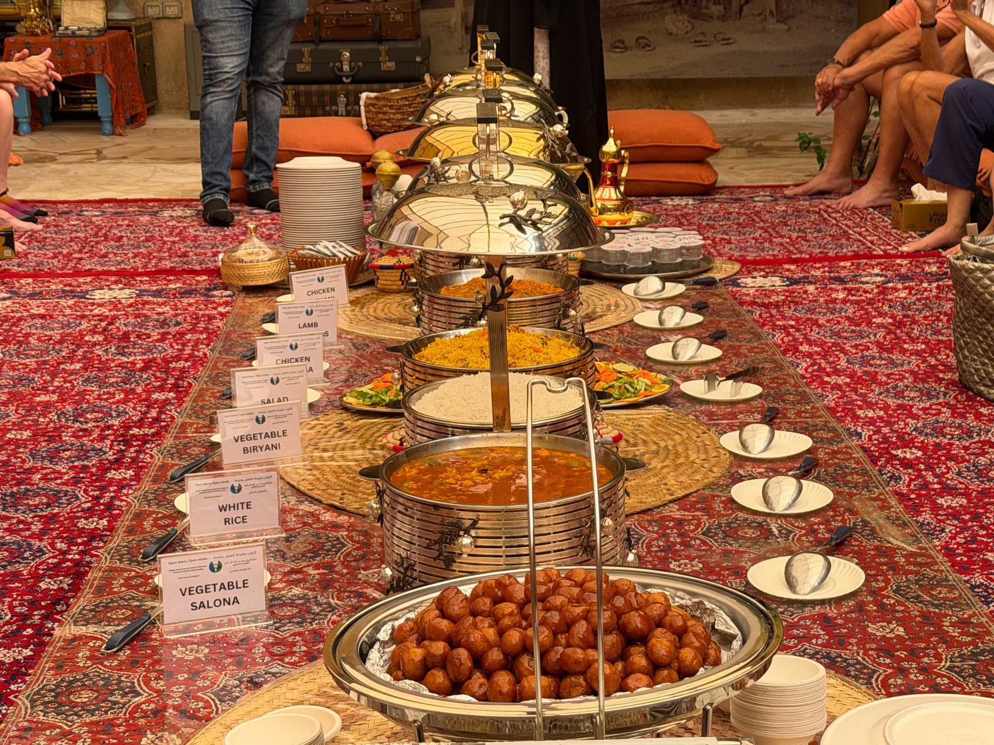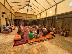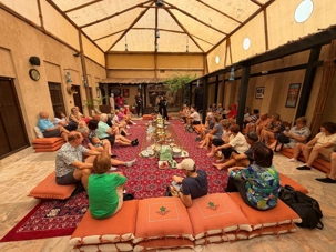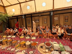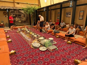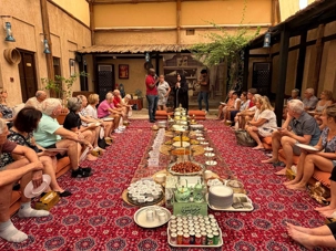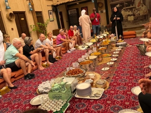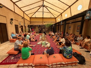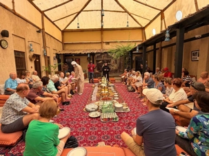 Assis sur des coussins dans une grande cour intérieure, nous partageons un repas traditionnel : riz parfumé, viandes fondantes, légumes épicés, desserts au miel, dattes et café arabe ☕.