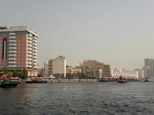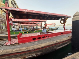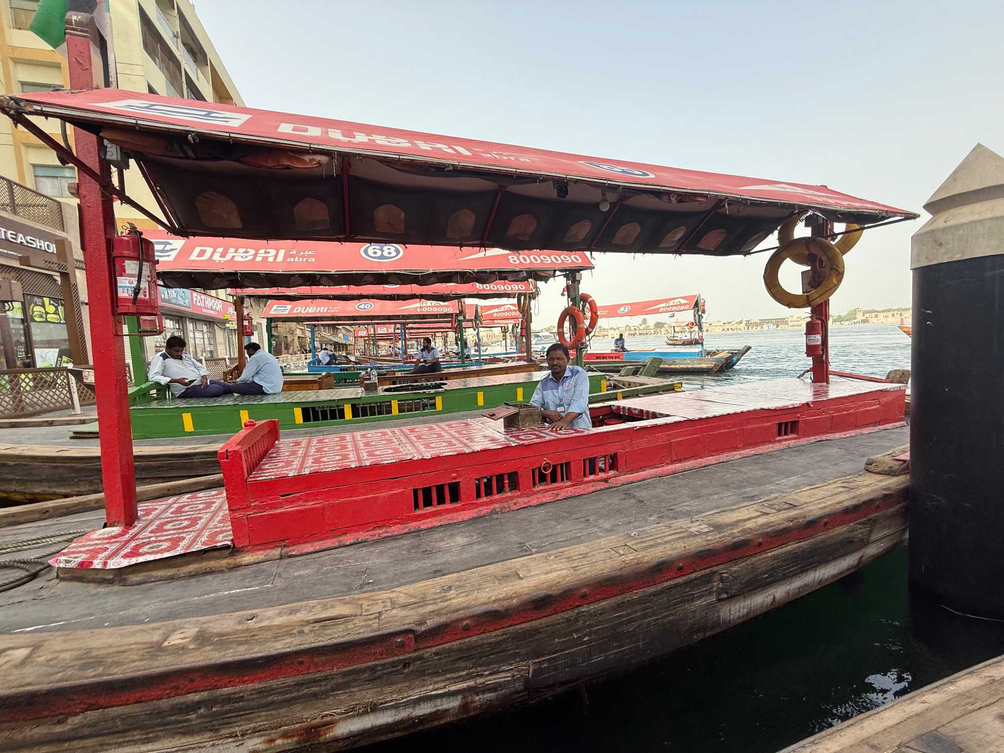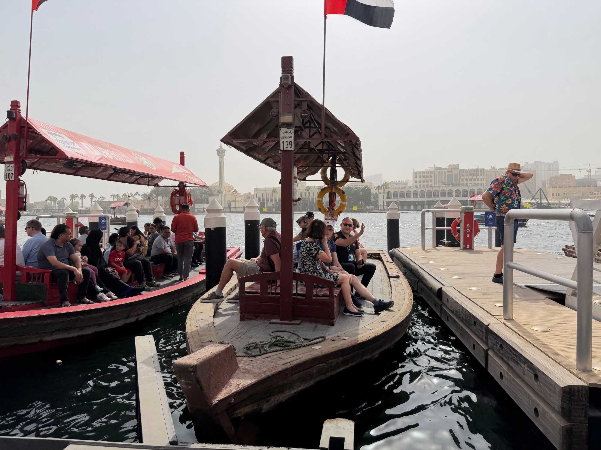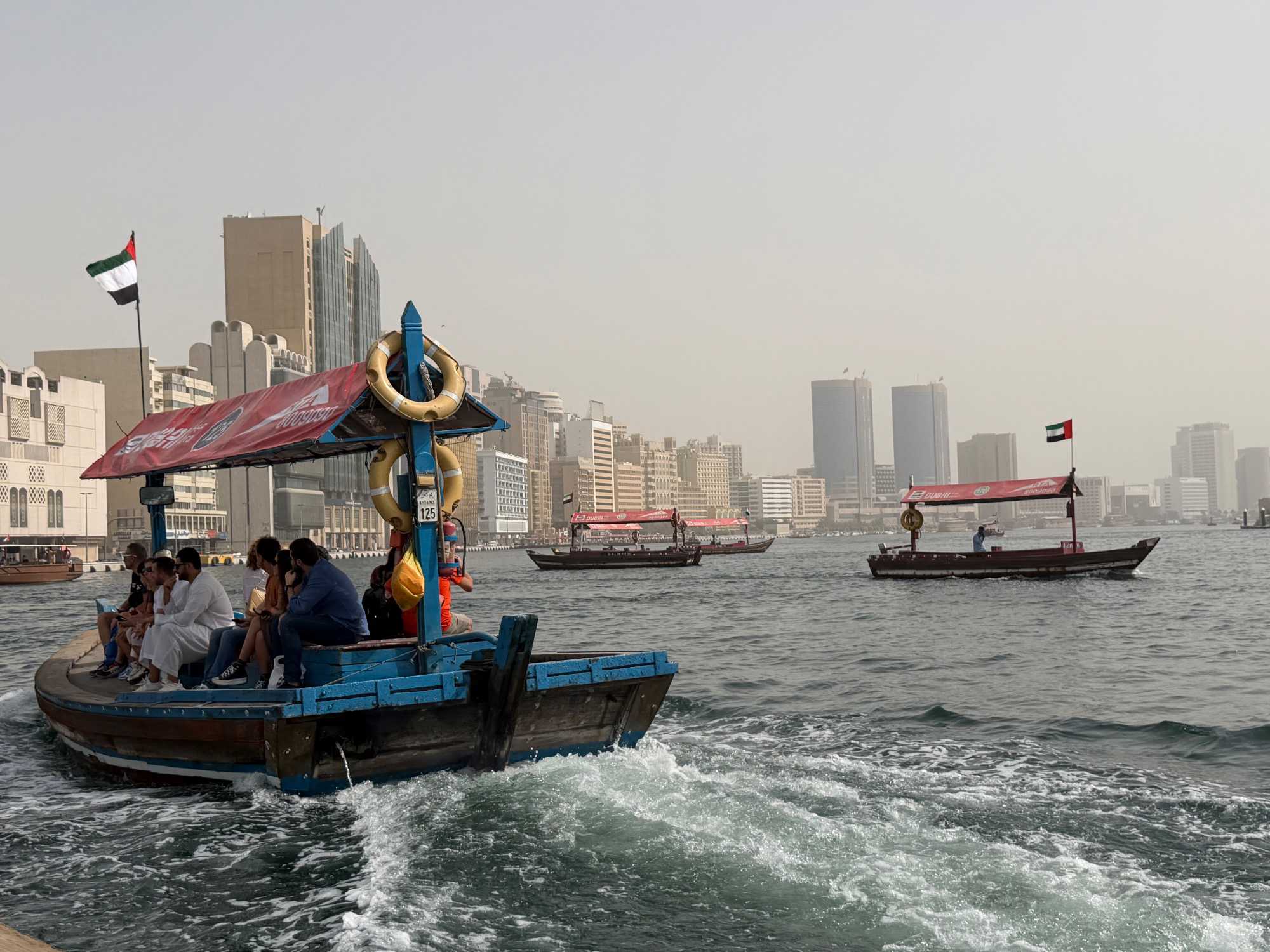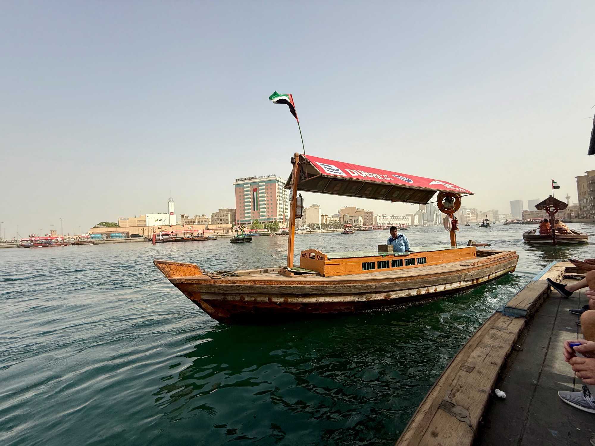 Pour rejoindre l’autre rive du Dubai Creek, nous embarquons à bord d’une abra, une petite embarcation traditionnelle en bois 🚤. Le clapotis de l’eau, la brise tiède et les reflets du soleil sur les flots créent une atmosphère paisible. Devant nous défilent les boutres chargés de marchandises, les maisons anciennes et les silhouettes des minarets. C’est un instant suspendu, une remontée dans le temps.