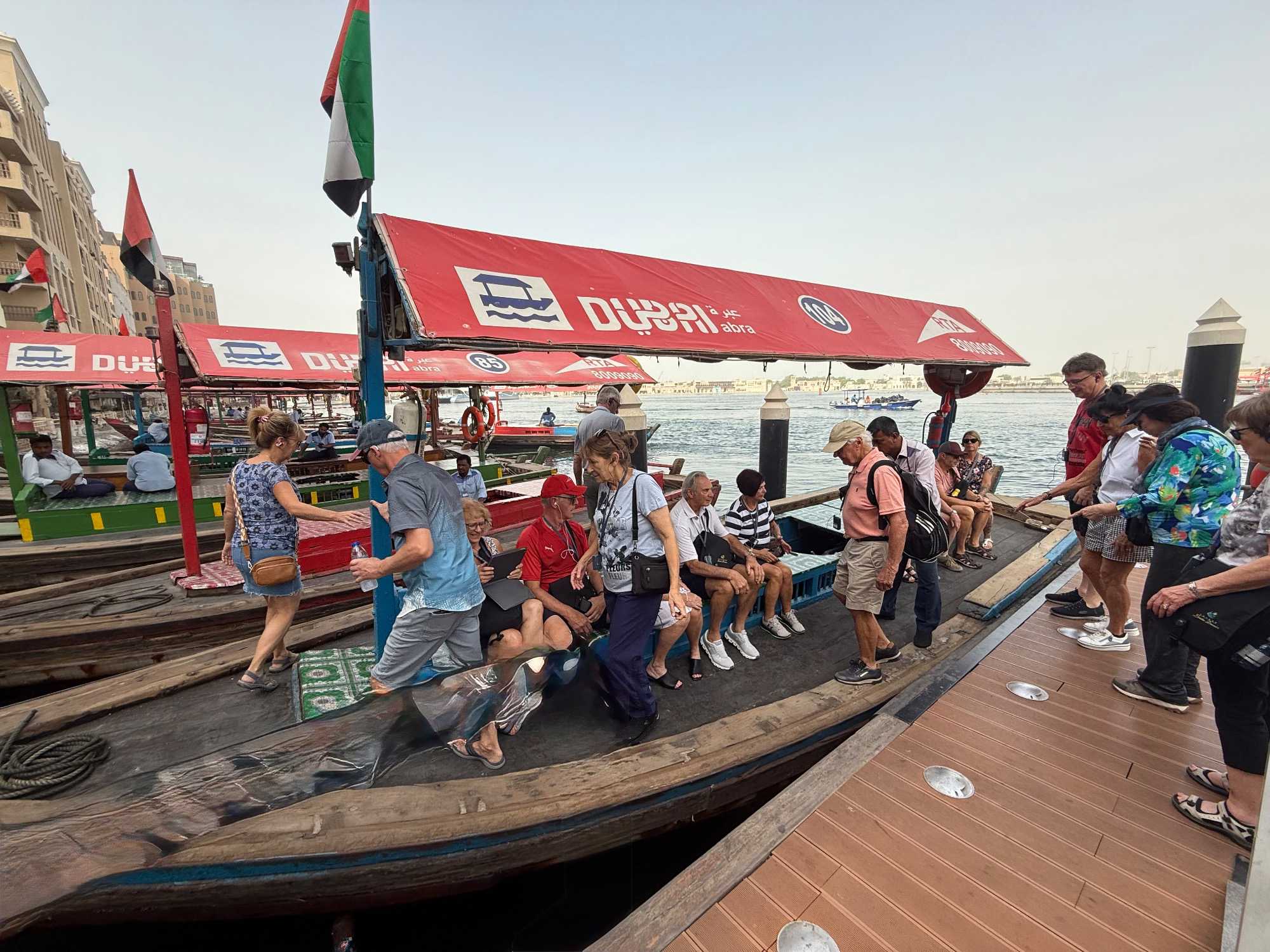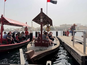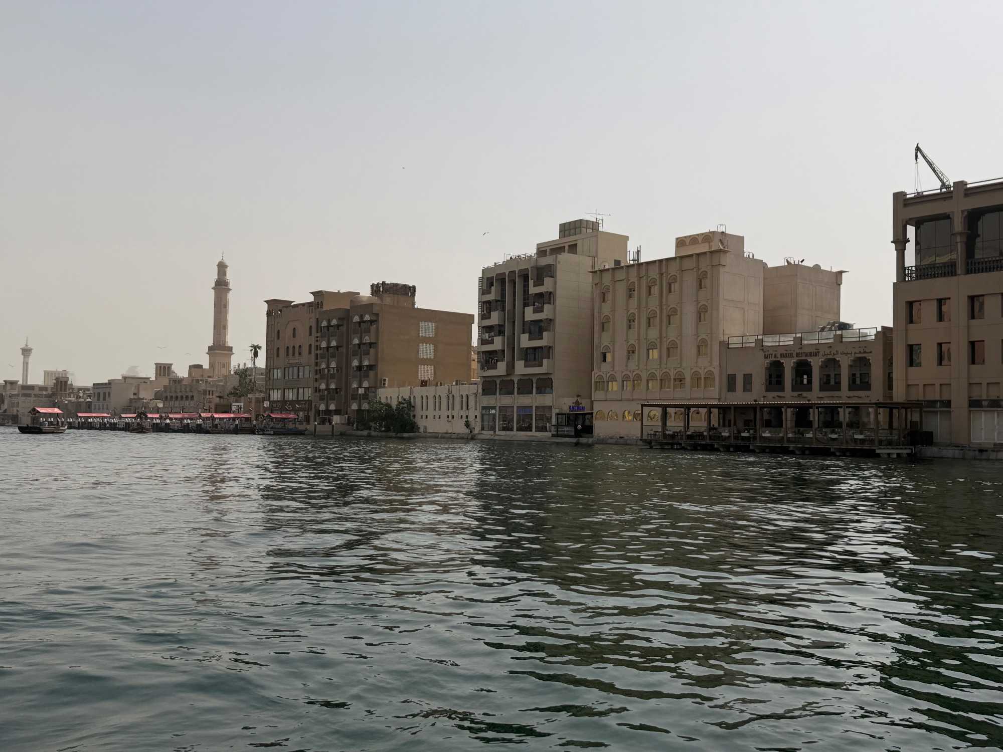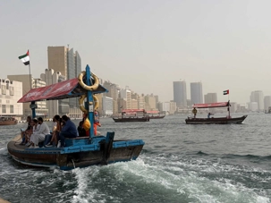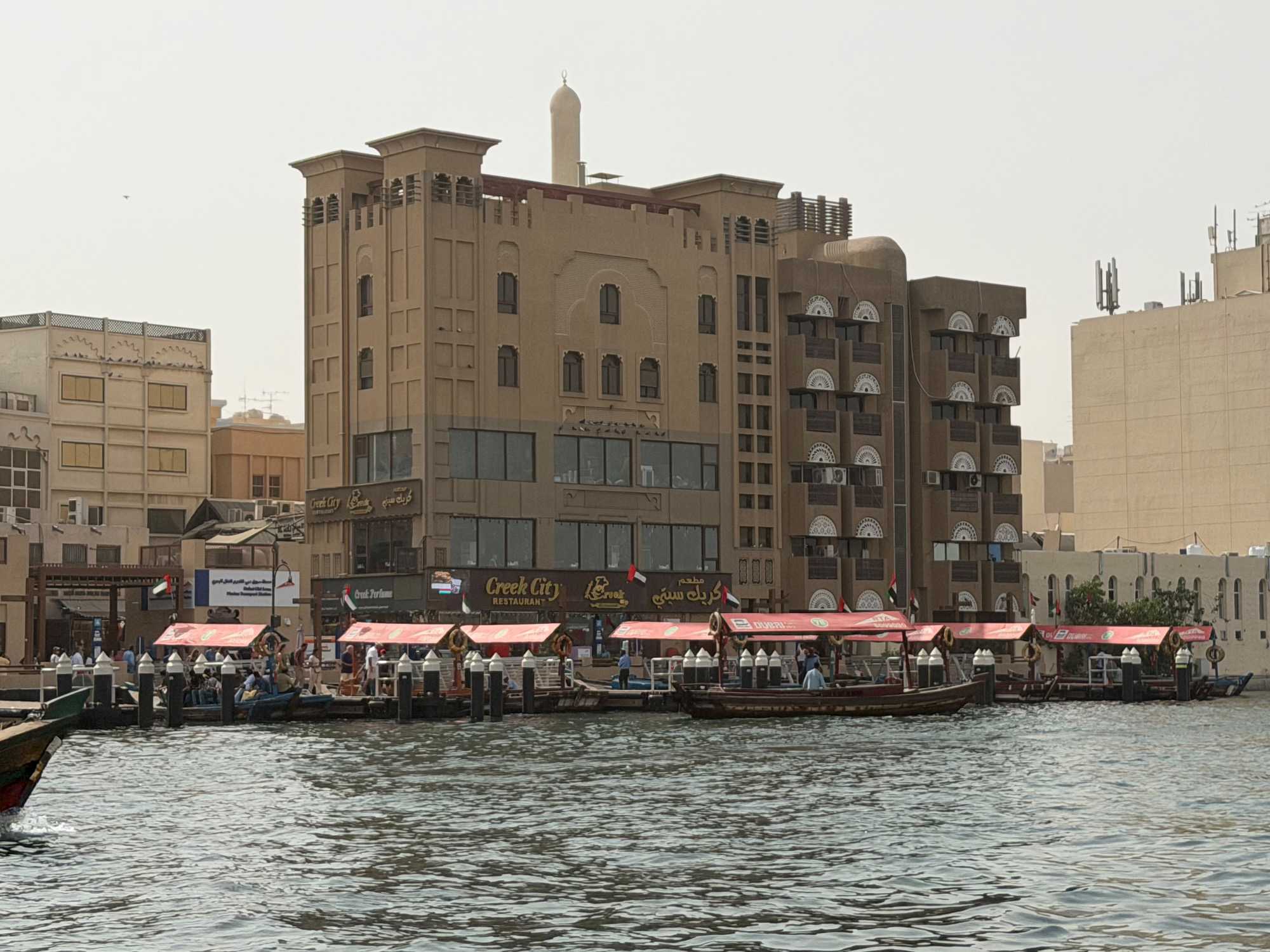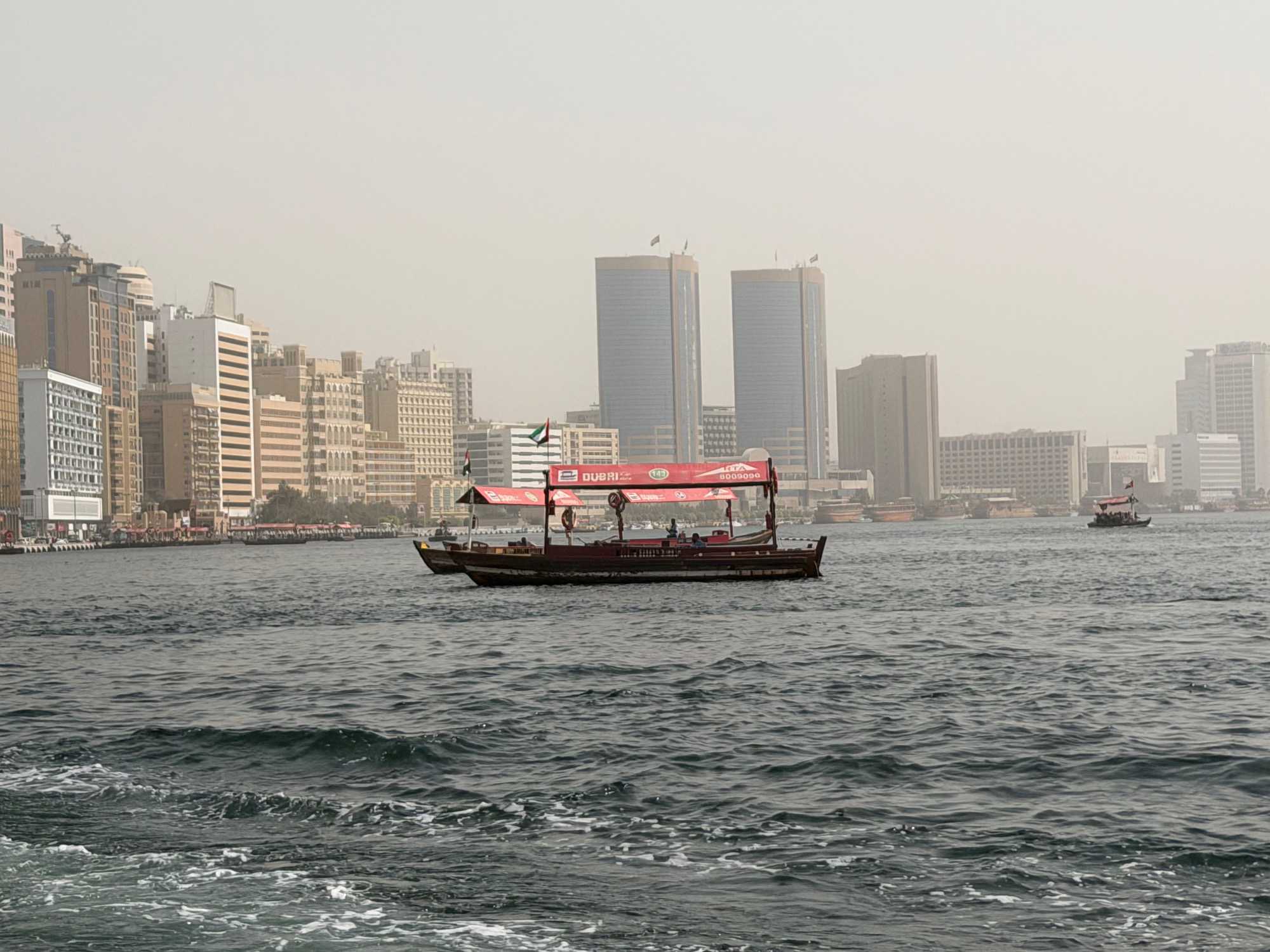 Pour rejoindre l’autre rive du Dubai Creek, nous embarquons à bord d’une abra, une petite embarcation traditionnelle en bois 🚤. Le clapotis de l’eau, la brise tiède et les reflets du soleil sur les flots créent une atmosphère paisible. Devant nous défilent les boutres chargés de marchandises, les maisons anciennes et les silhouettes des minarets. C’est un instant suspendu, une remontée dans le temps.