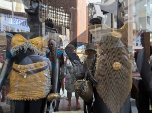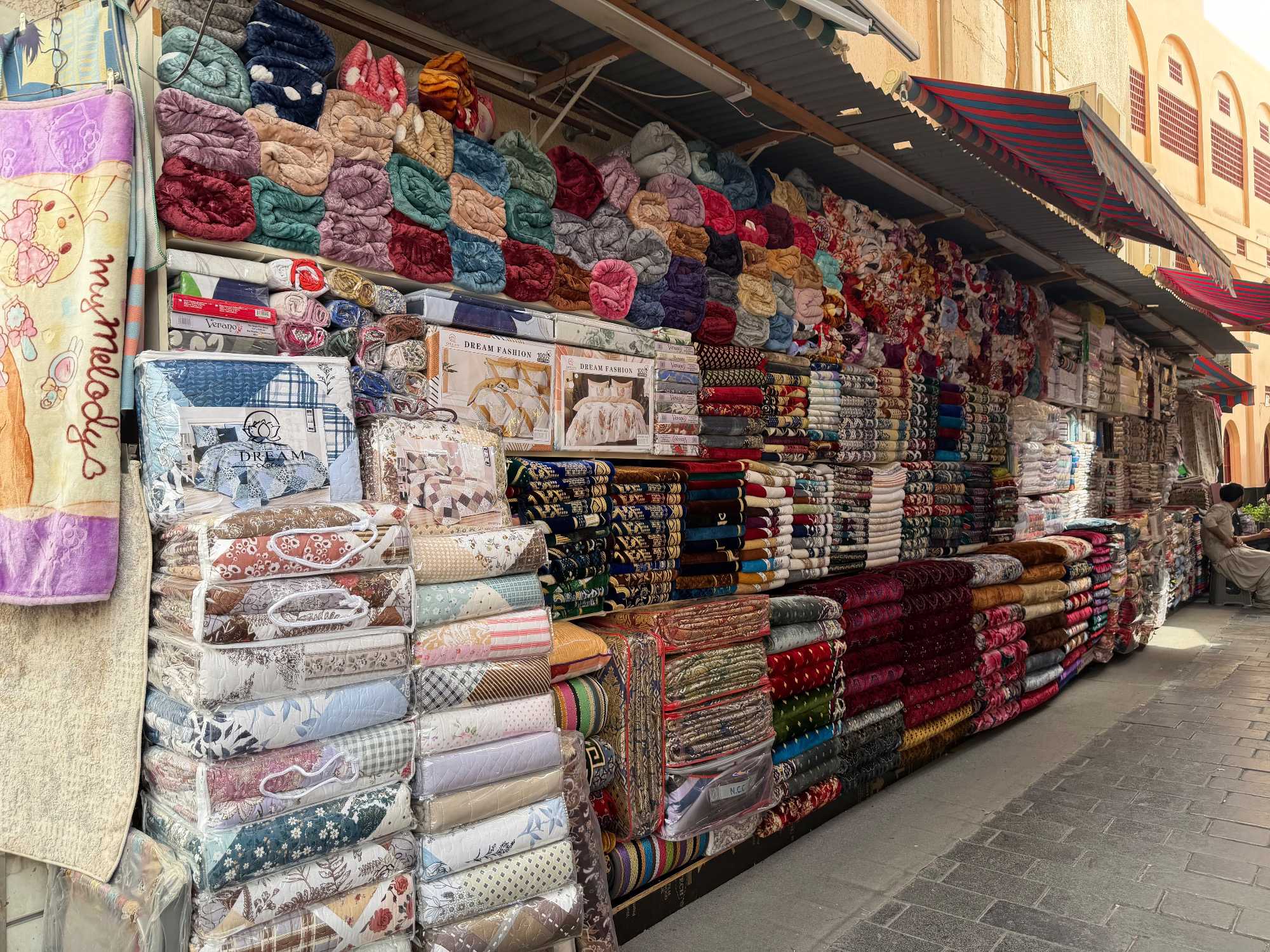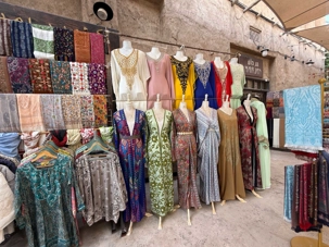 Les étoffes chatoyantes venues d’Inde et du Cachemire se déploient comme des vagues de soie et de brocards dorés. Les marchands souriants nous accueillent avec fierté et bonne humeur. Les tissus glissent sous nos doigts, doux comme le vent du désert.