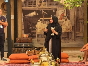 À midi, nous arrivons au Sheikh Mohammed Center for Cultural Understanding, dans le vieux quartier d’Al Bastakiya 🕌. Une femme émiratie souriante nous accueille avec grâce.