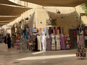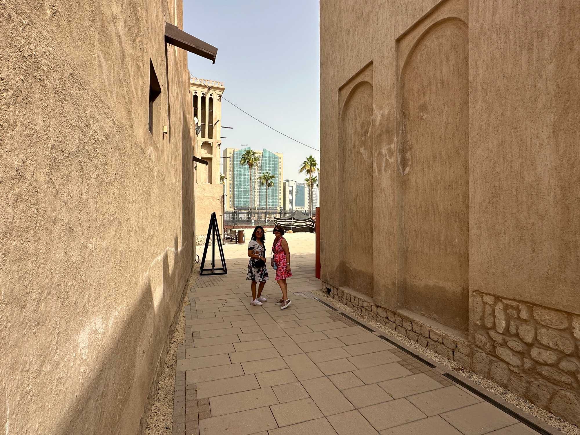 Nous atteignons ensuite le quartier historique d’Al Fahidi, véritable mémoire de la ville. Les ruelles étroites, bordées de maisons en corail et en argile, respirent la sérénité. Les tours à vent — ancêtres de la climatisation naturelle — témoignent de l’ingéniosité d’autrefois. Le temps semble suspendu, comme si les murs de sable murmuraient encore les histoires des anciens marchands.