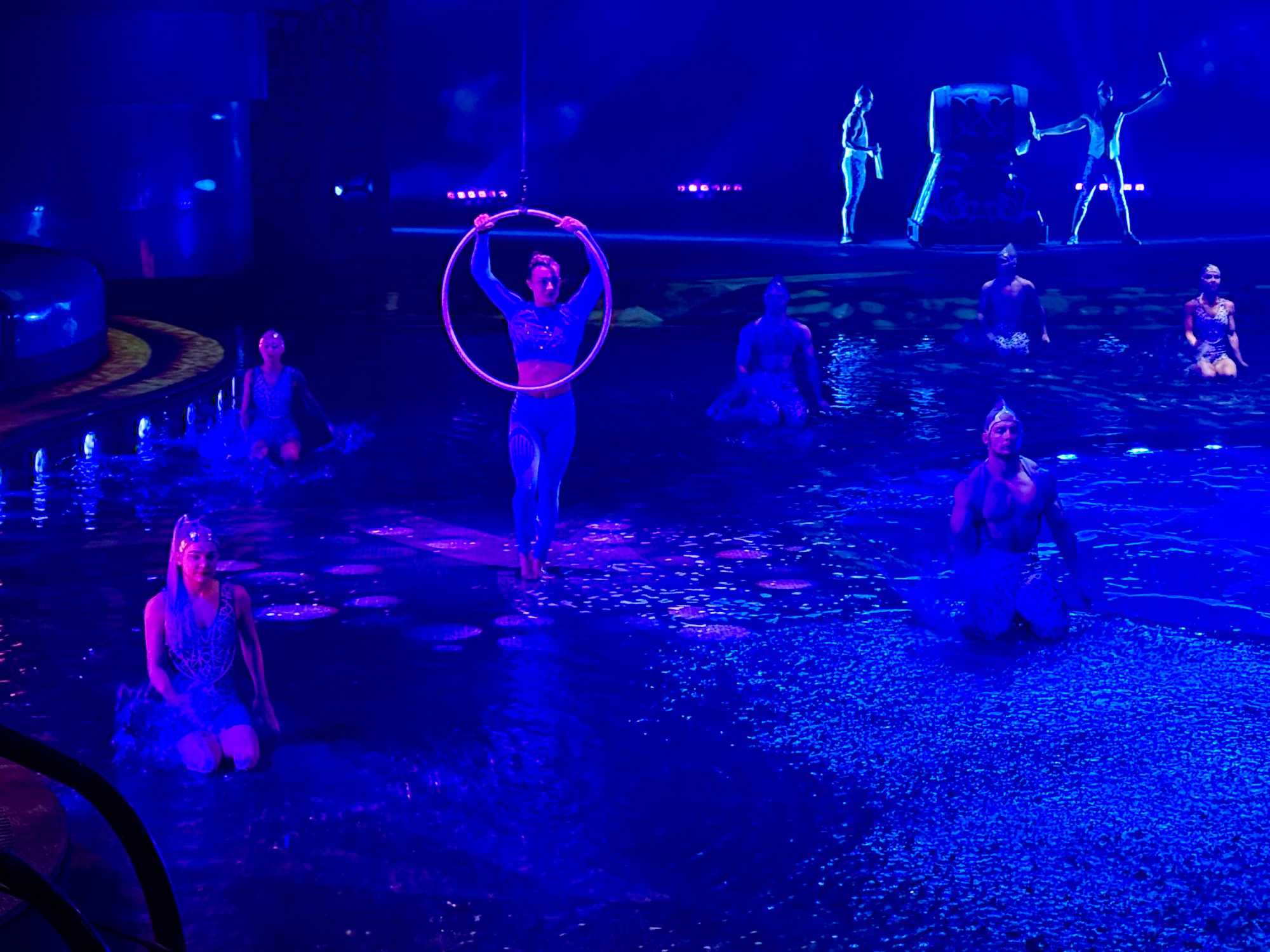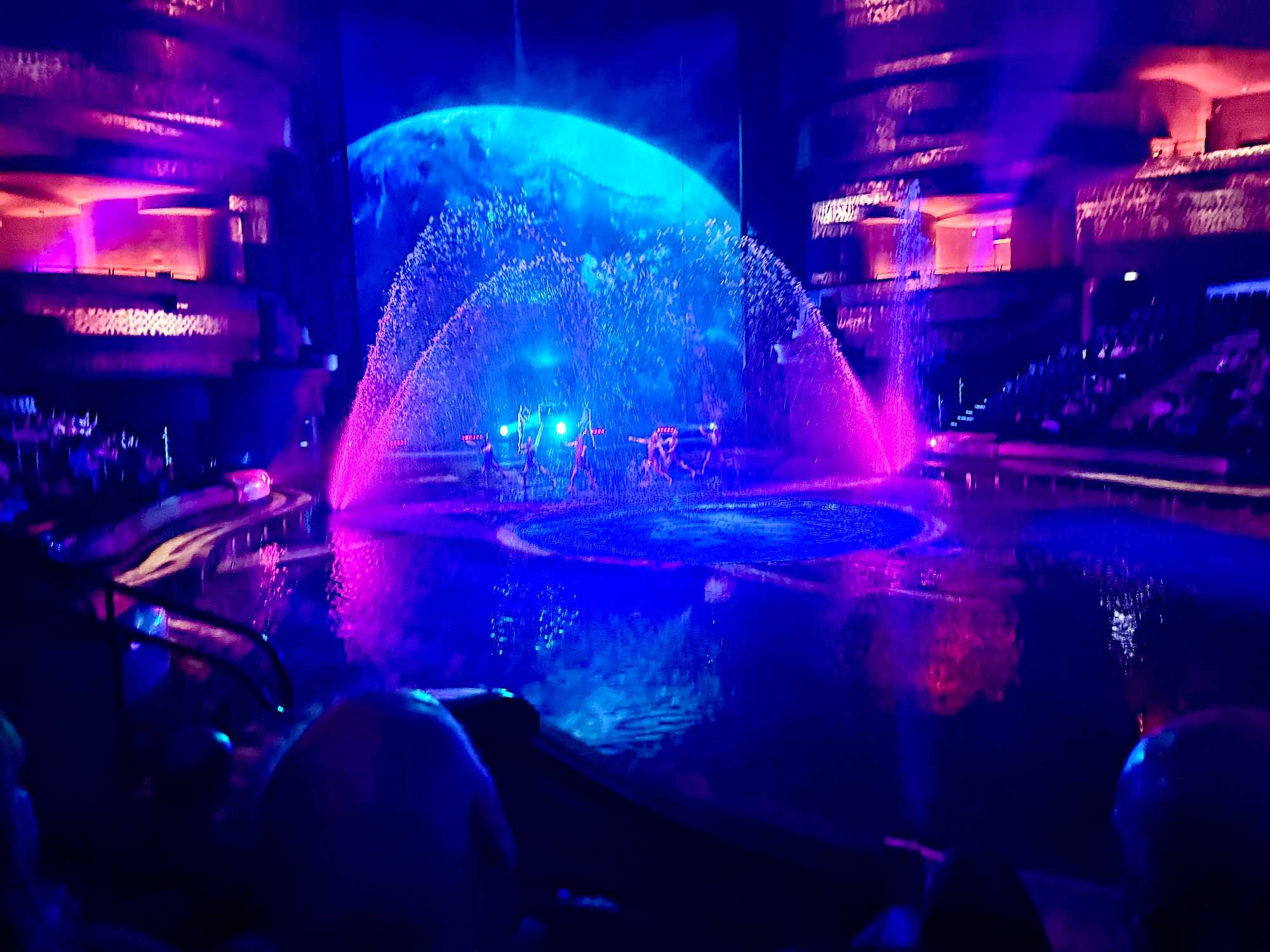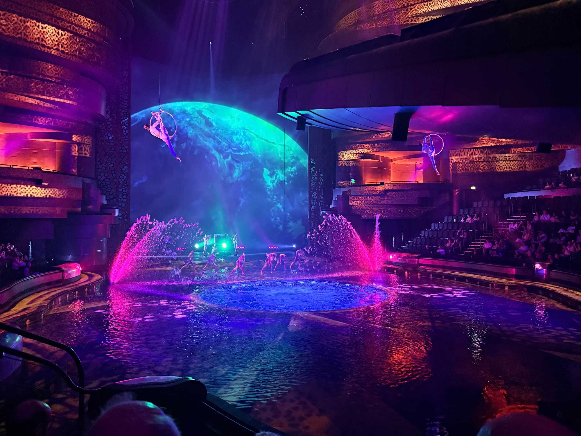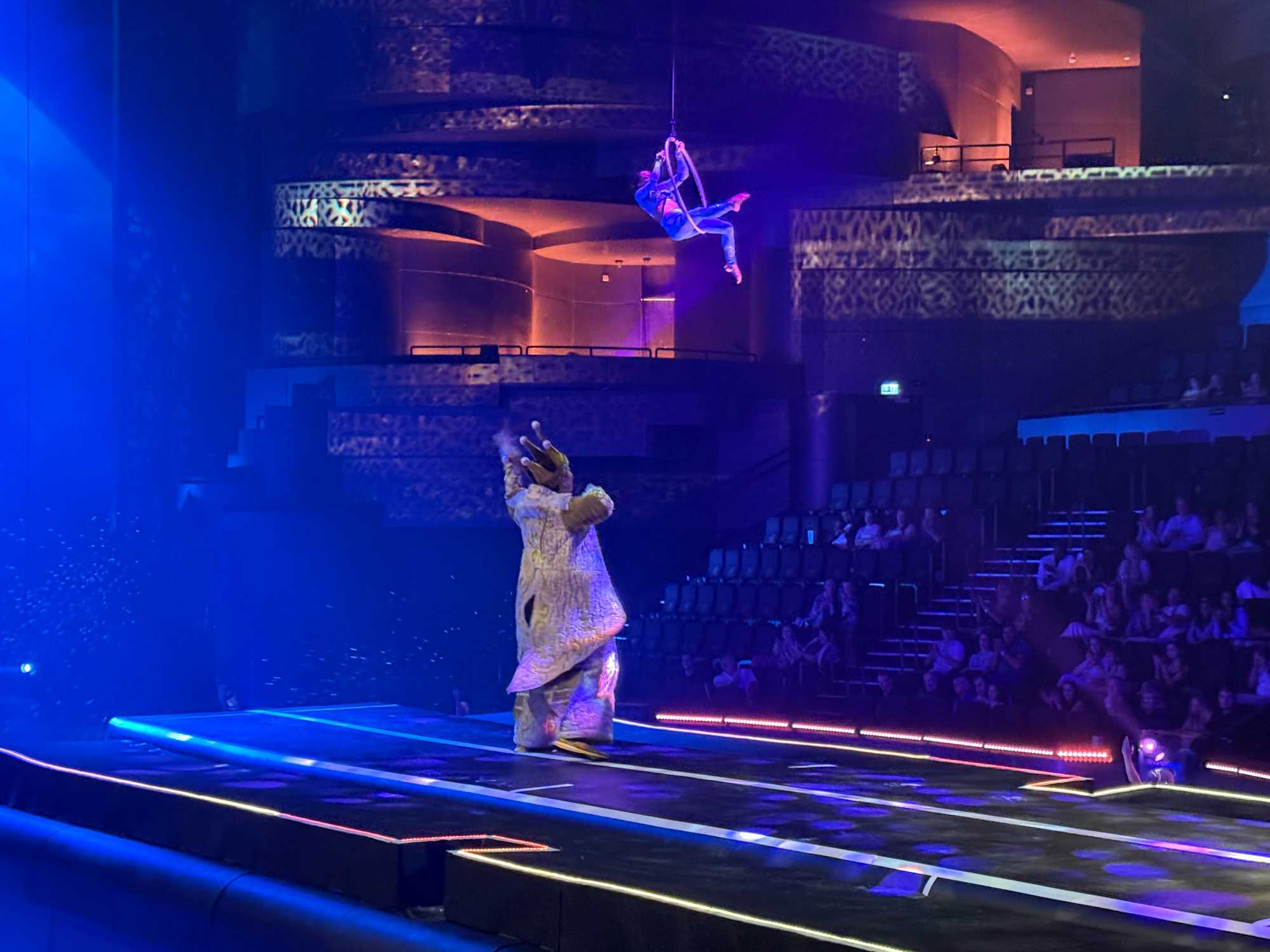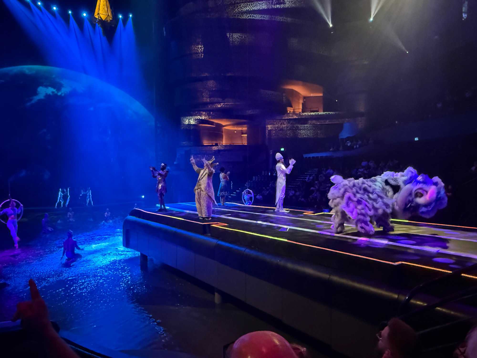 La salle est grandiose, la scène impressionnante. À 18 h 30, les lumières s’éteignent, la musique s’élève… et la magie opère. Sous nos yeux émerveillés, des artistes venus du monde entier exécutent des acrobaties vertigineuses, dansent dans l’eau, s’élancent entre feu et lumière 🔥💧. Chaque tableau semble suspendu dans le temps, mêlant poésie, technologie et émotion pure. Nous sommes littéralement transportés dans un univers futuriste, reflet de l’audace et du rêve dubaïote 🌌.