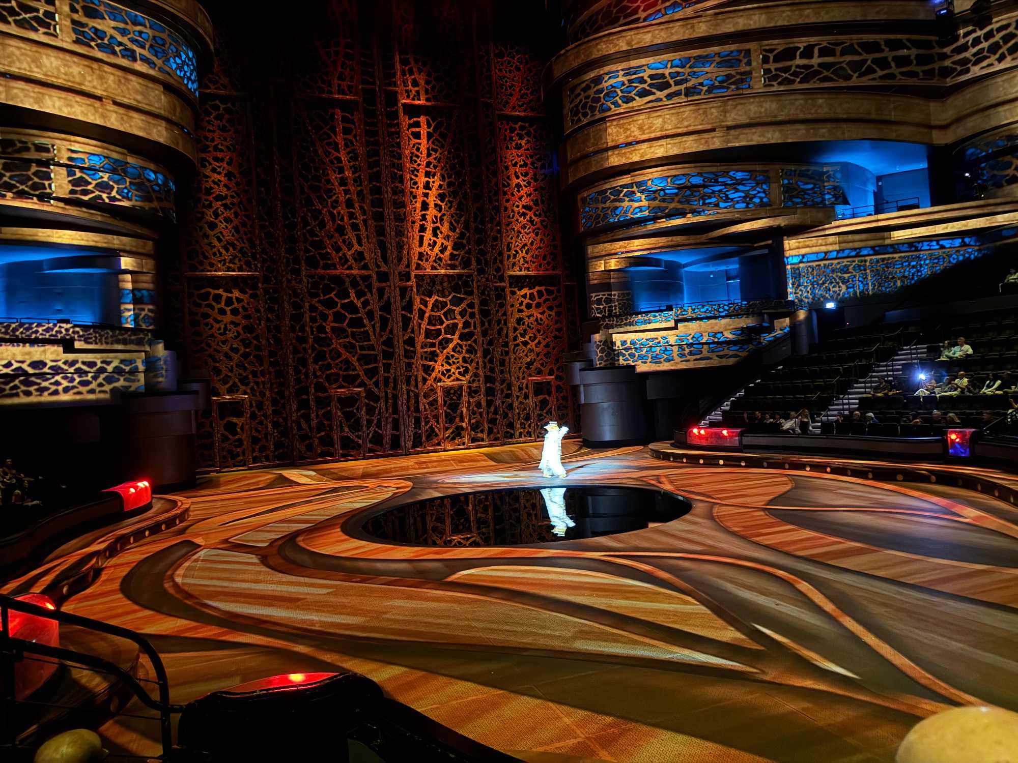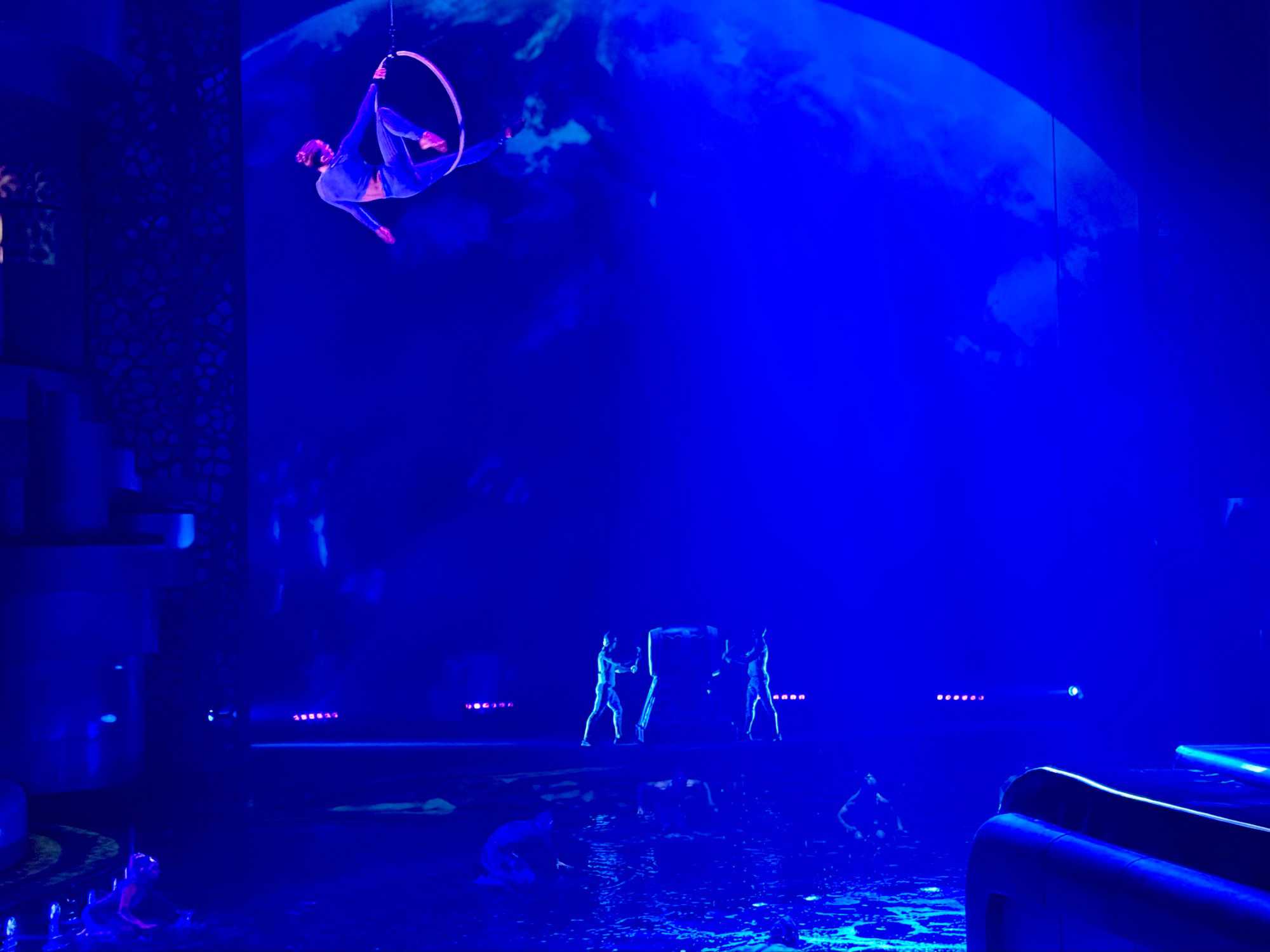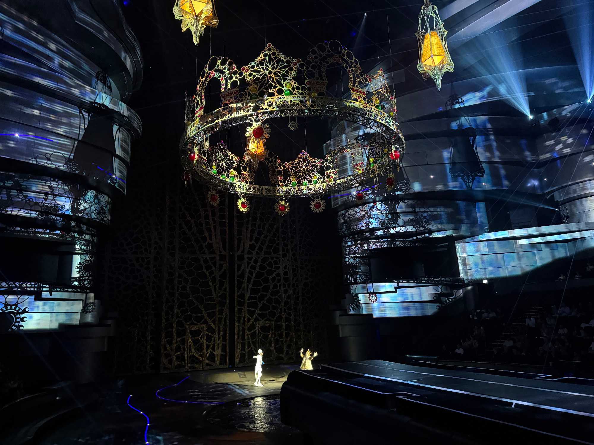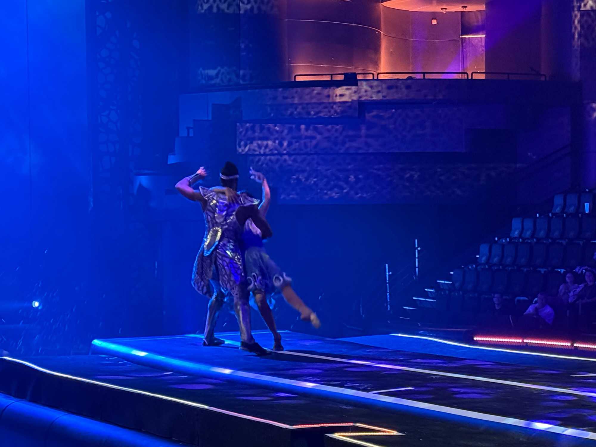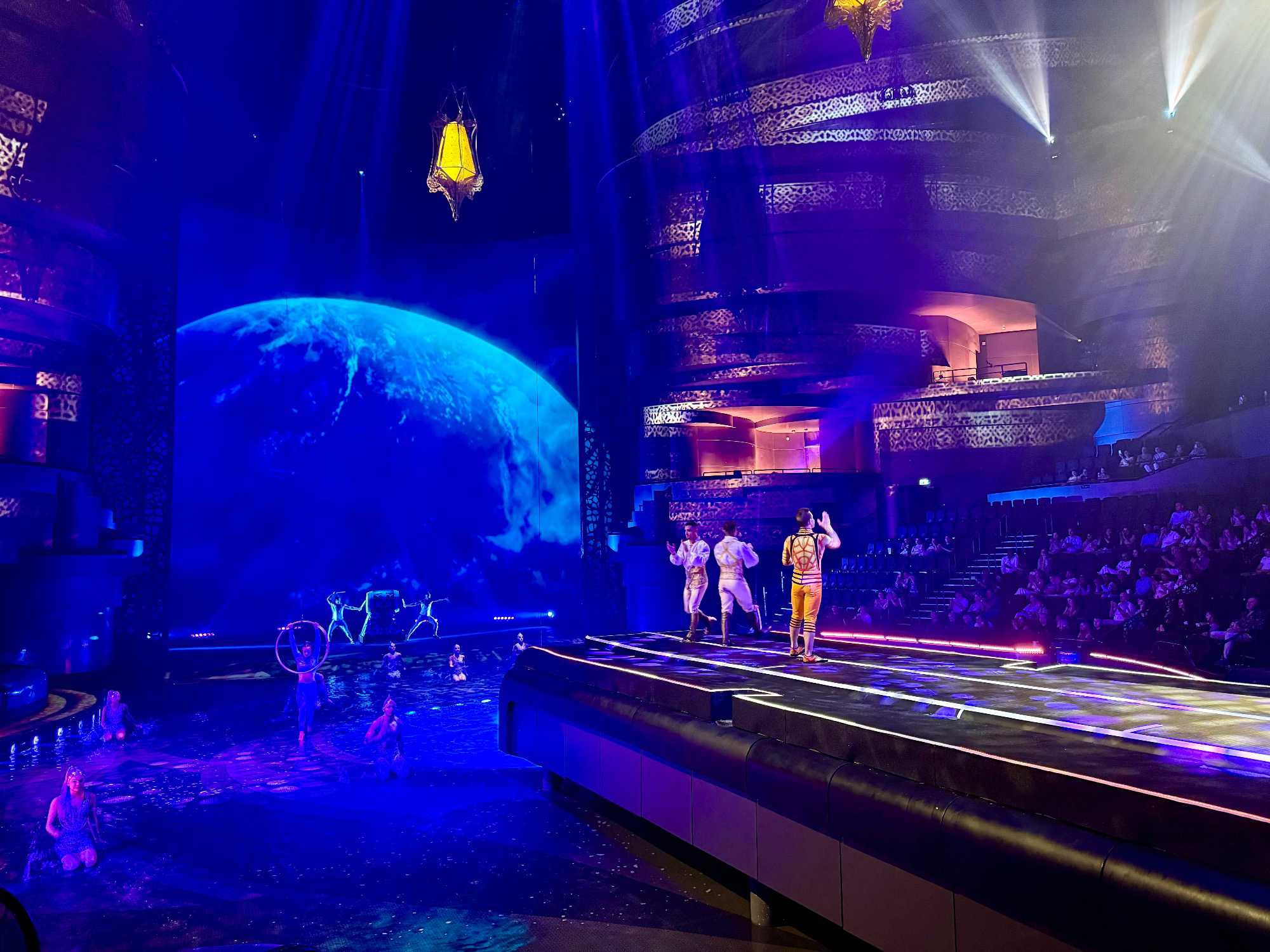 La salle est grandiose, la scène impressionnante. À 18 h 30, les lumières s’éteignent, la musique s’élève… et la magie opère. Sous nos yeux émerveillés, des artistes venus du monde entier exécutent des acrobaties vertigineuses, dansent dans l’eau, s’élancent entre feu et lumière 🔥💧. Chaque tableau semble suspendu dans le temps, mêlant poésie, technologie et émotion pure. Nous sommes littéralement transportés dans un univers futuriste, reflet de l’audace et du rêve dubaïote 🌌.