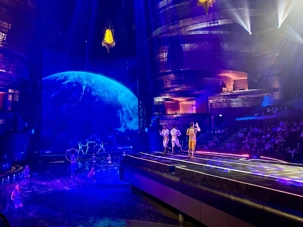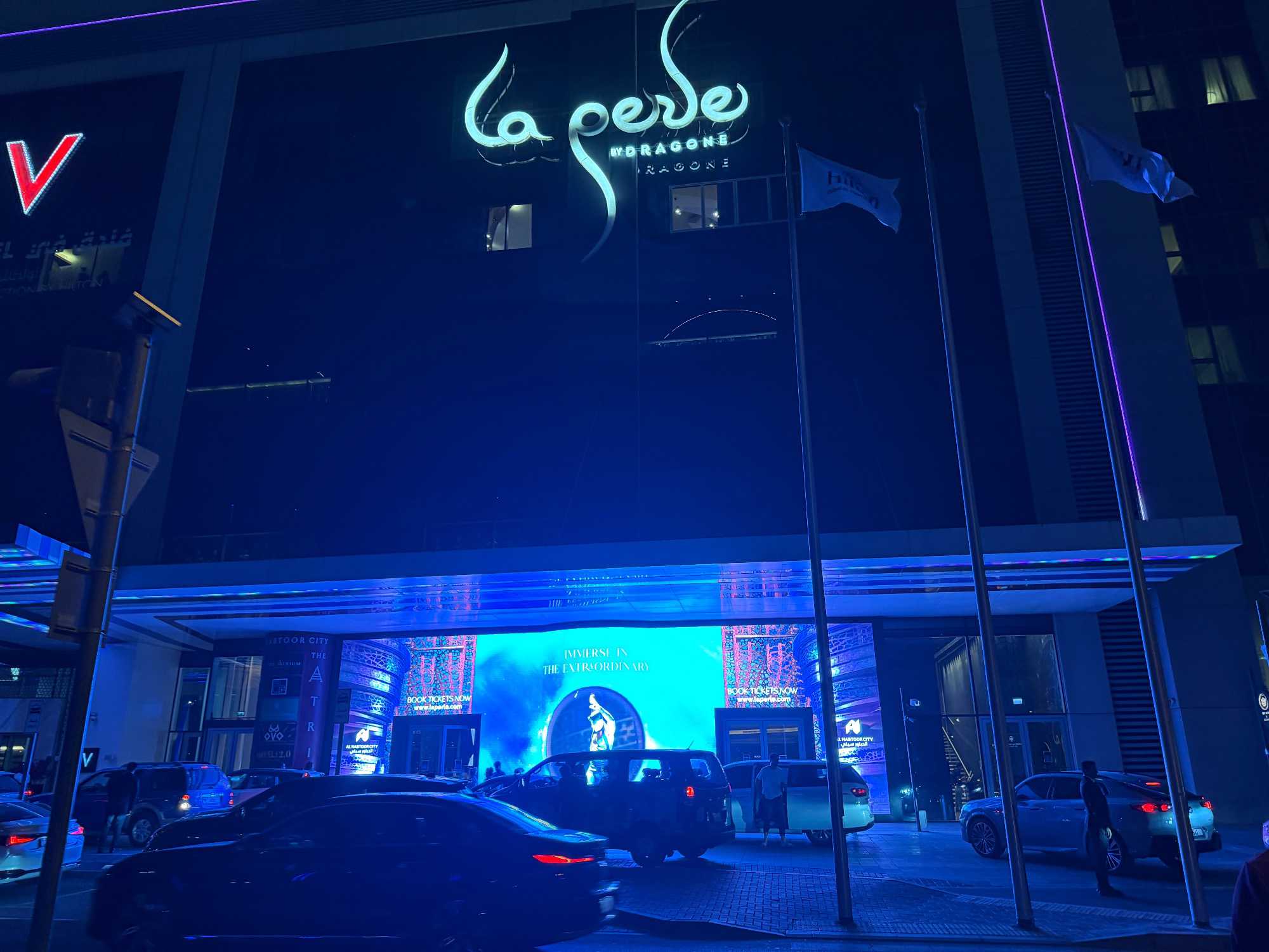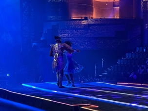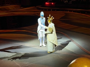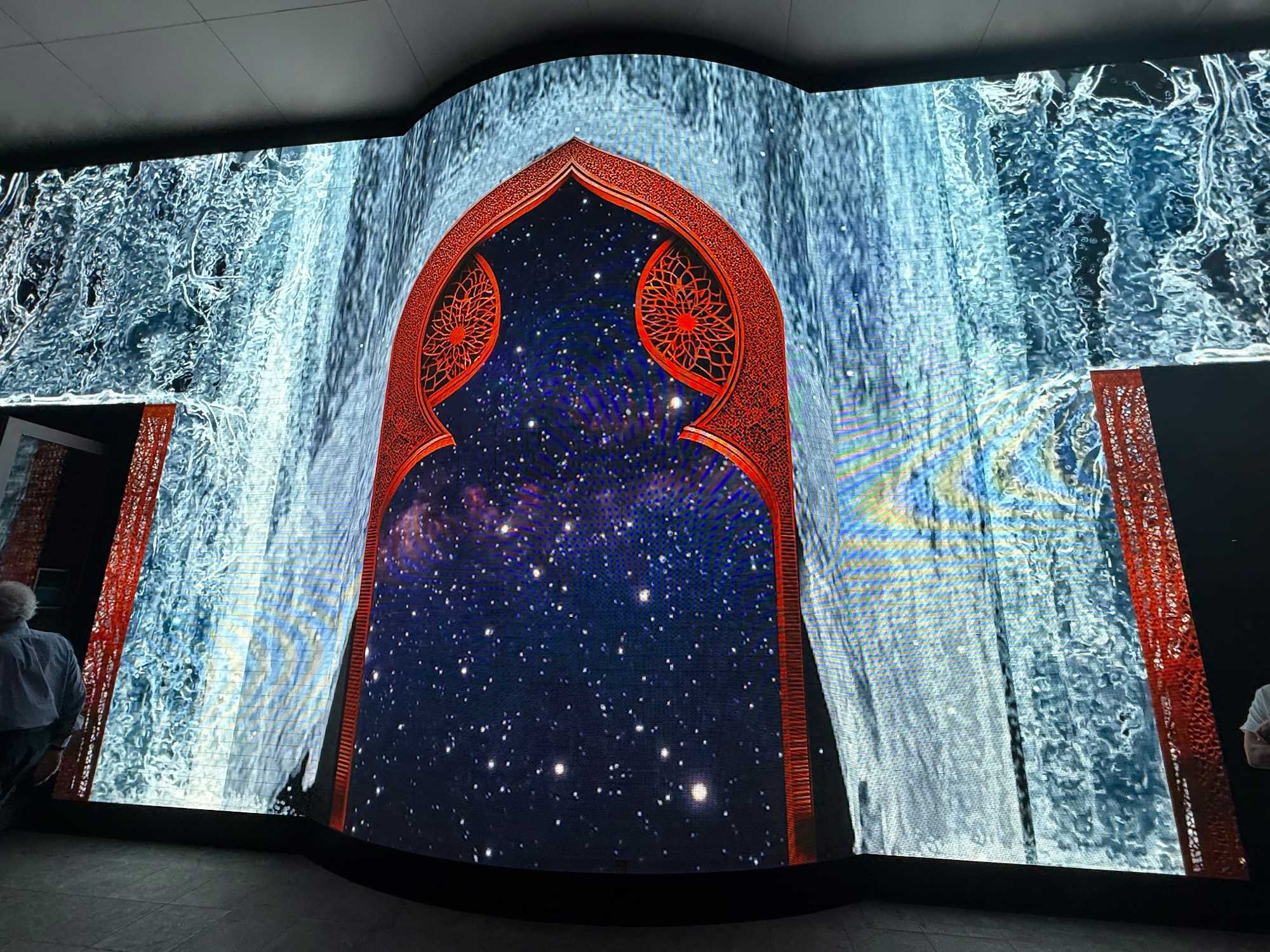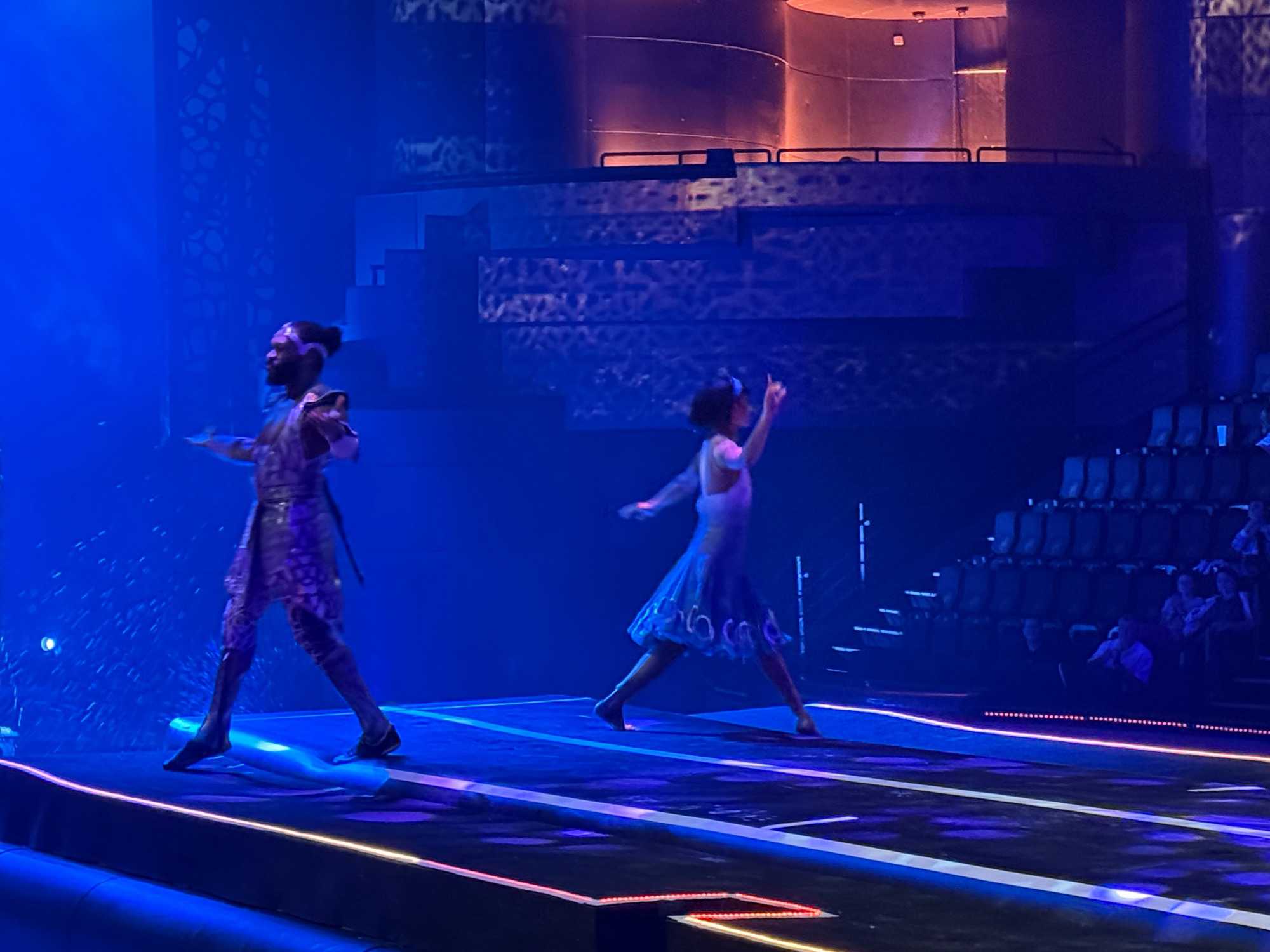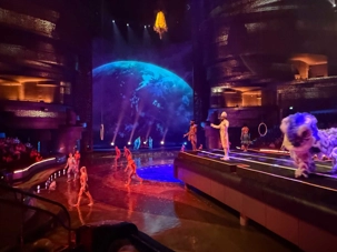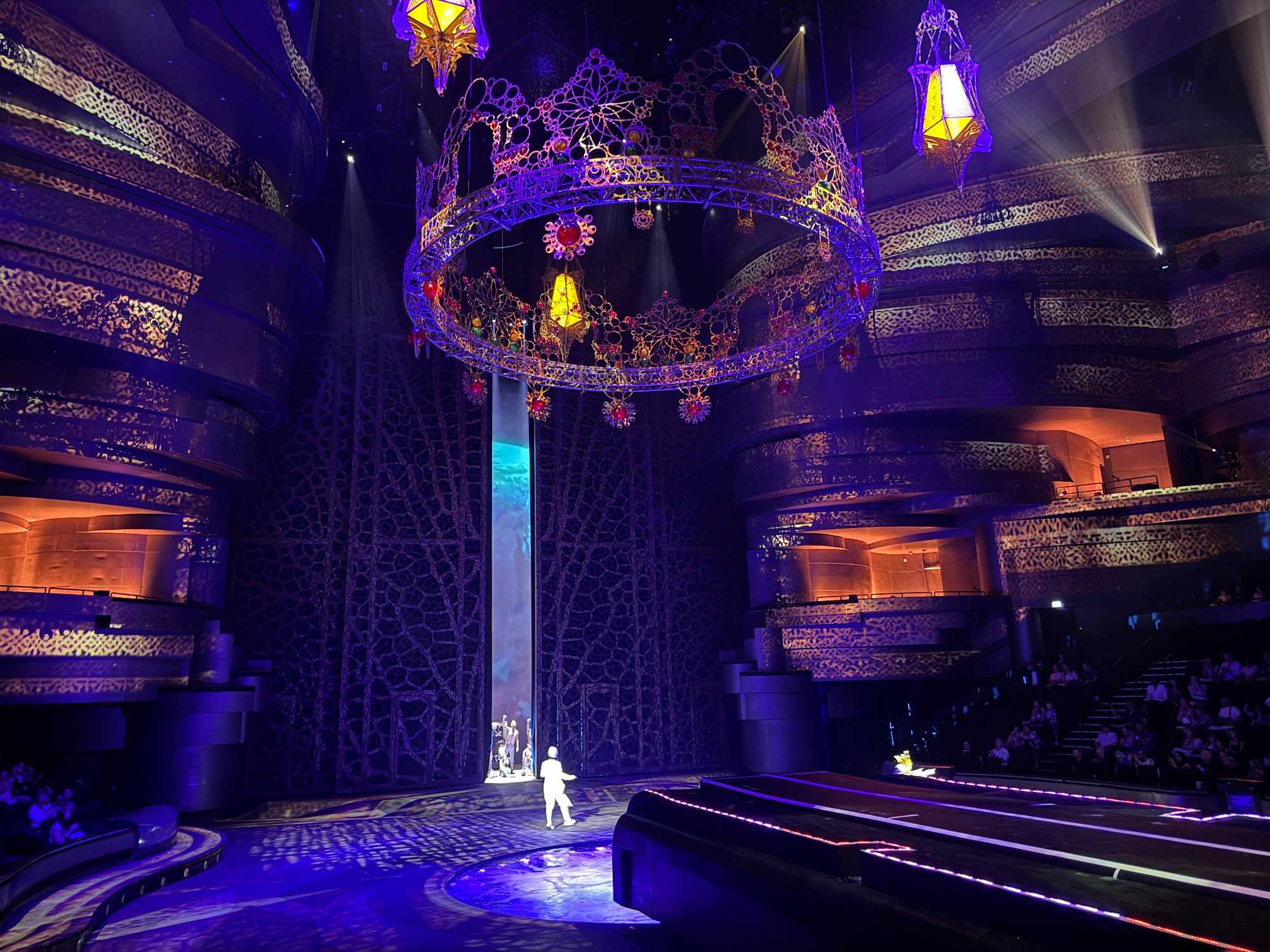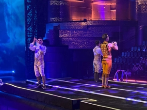 La salle est grandiose, la scène impressionnante. À 18 h 30, les lumières s’éteignent, la musique s’élève… et la magie opère. Sous nos yeux émerveillés, des artistes venus du monde entier exécutent des acrobaties vertigineuses, dansent dans l’eau, s’élancent entre feu et lumière 🔥💧. Chaque tableau semble suspendu dans le temps, mêlant poésie, technologie et émotion pure. Nous sommes littéralement transportés dans un univers futuriste, reflet de l’audace et du rêve dubaïote 🌌.