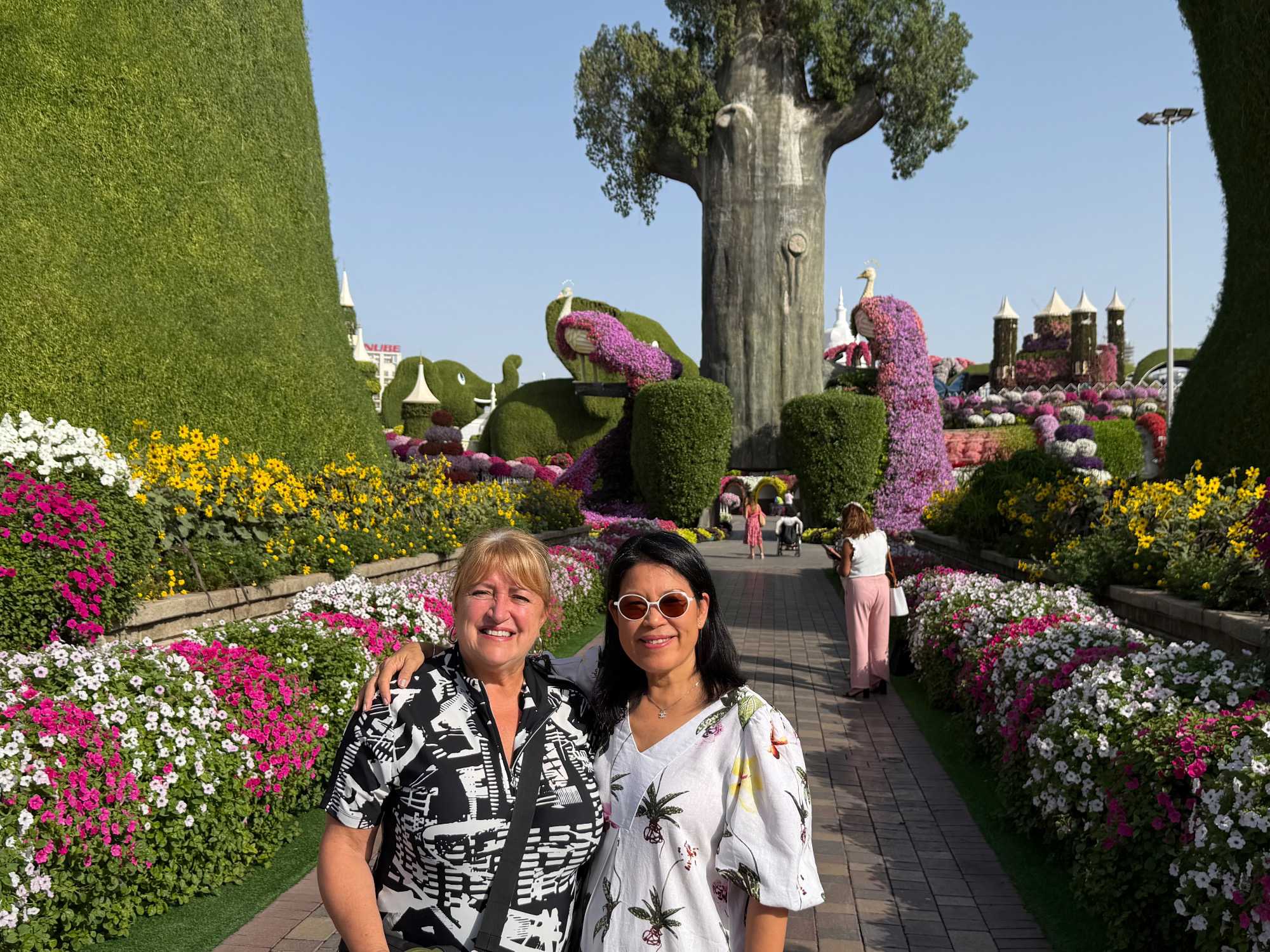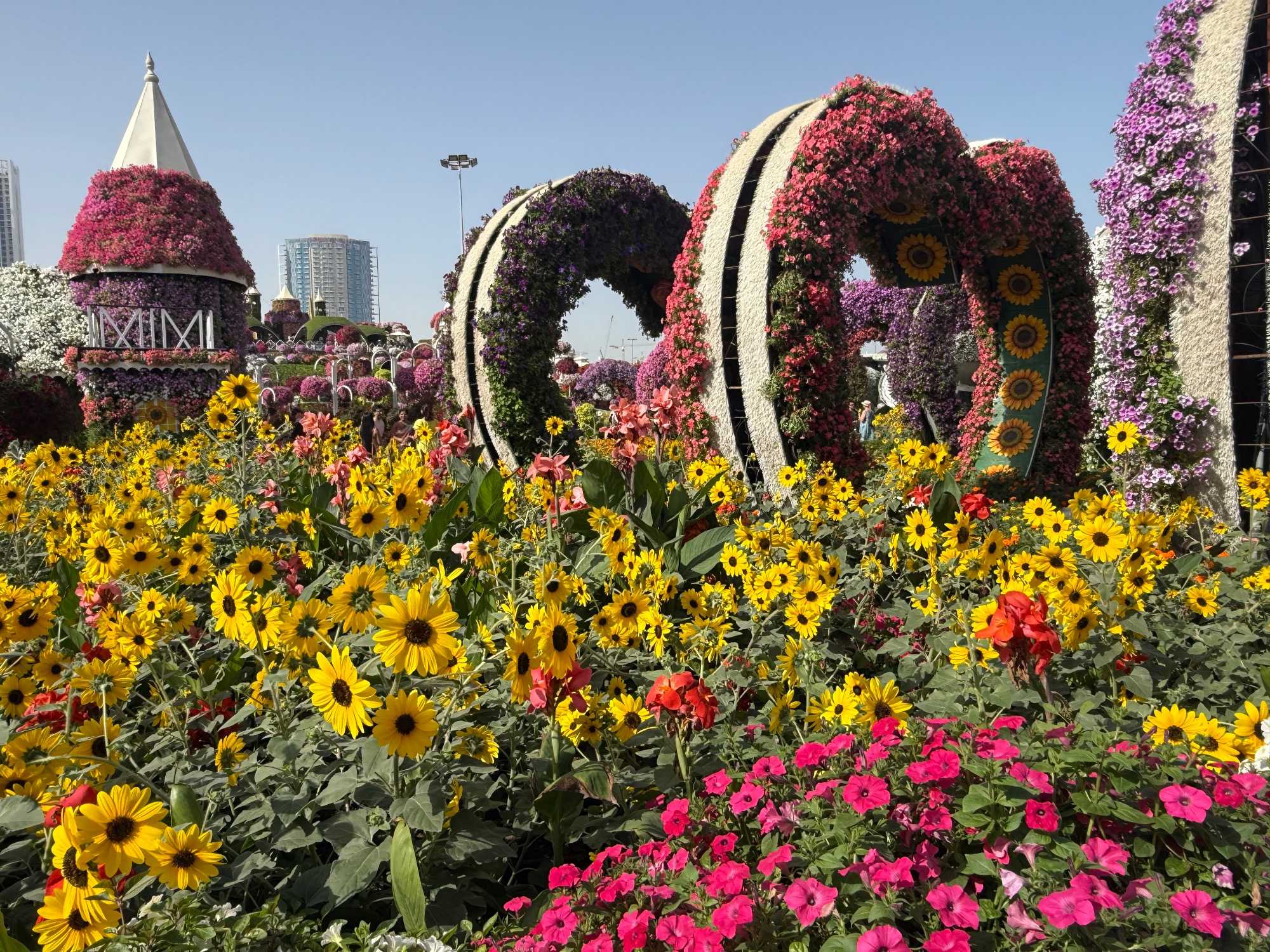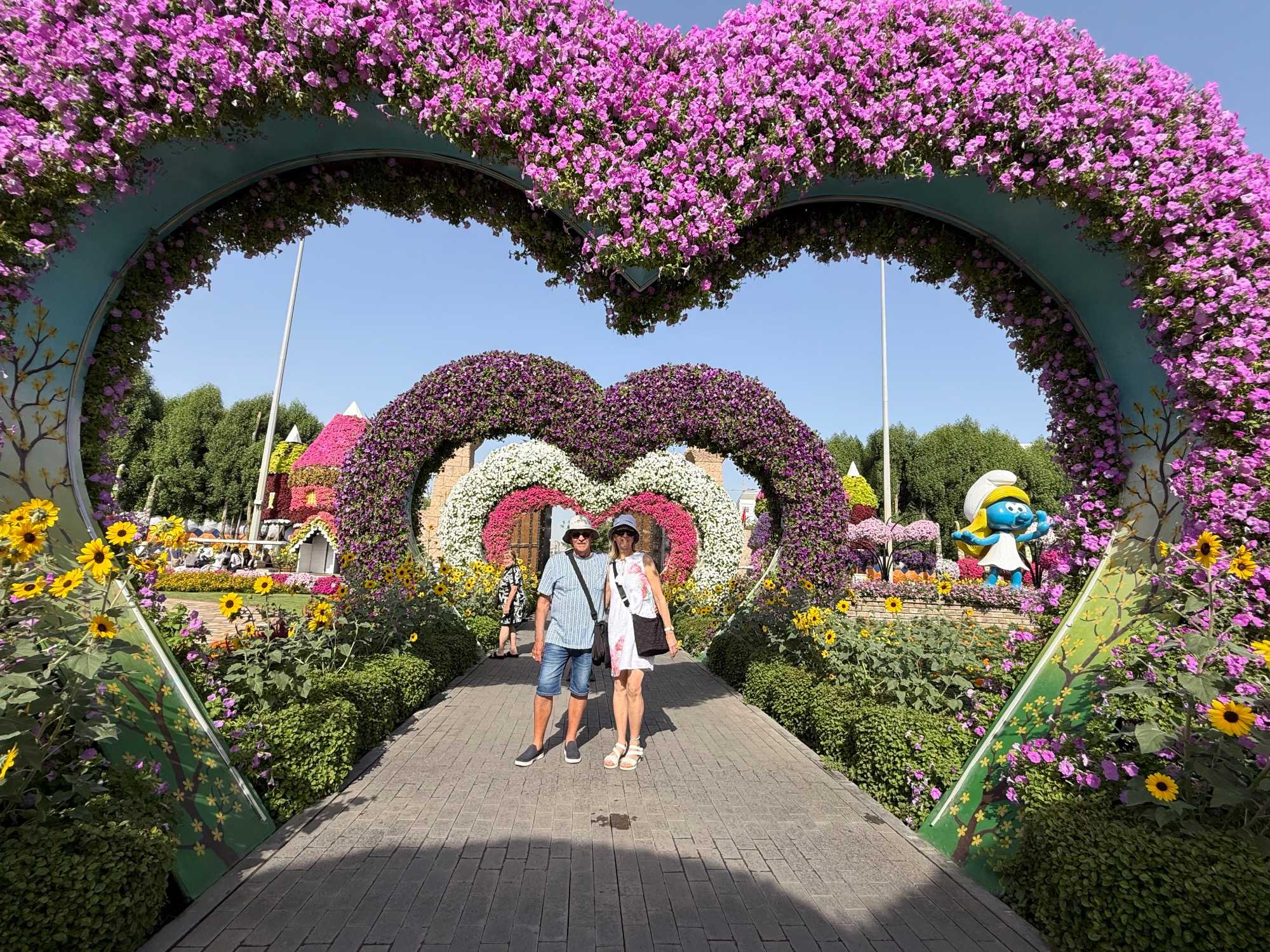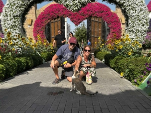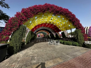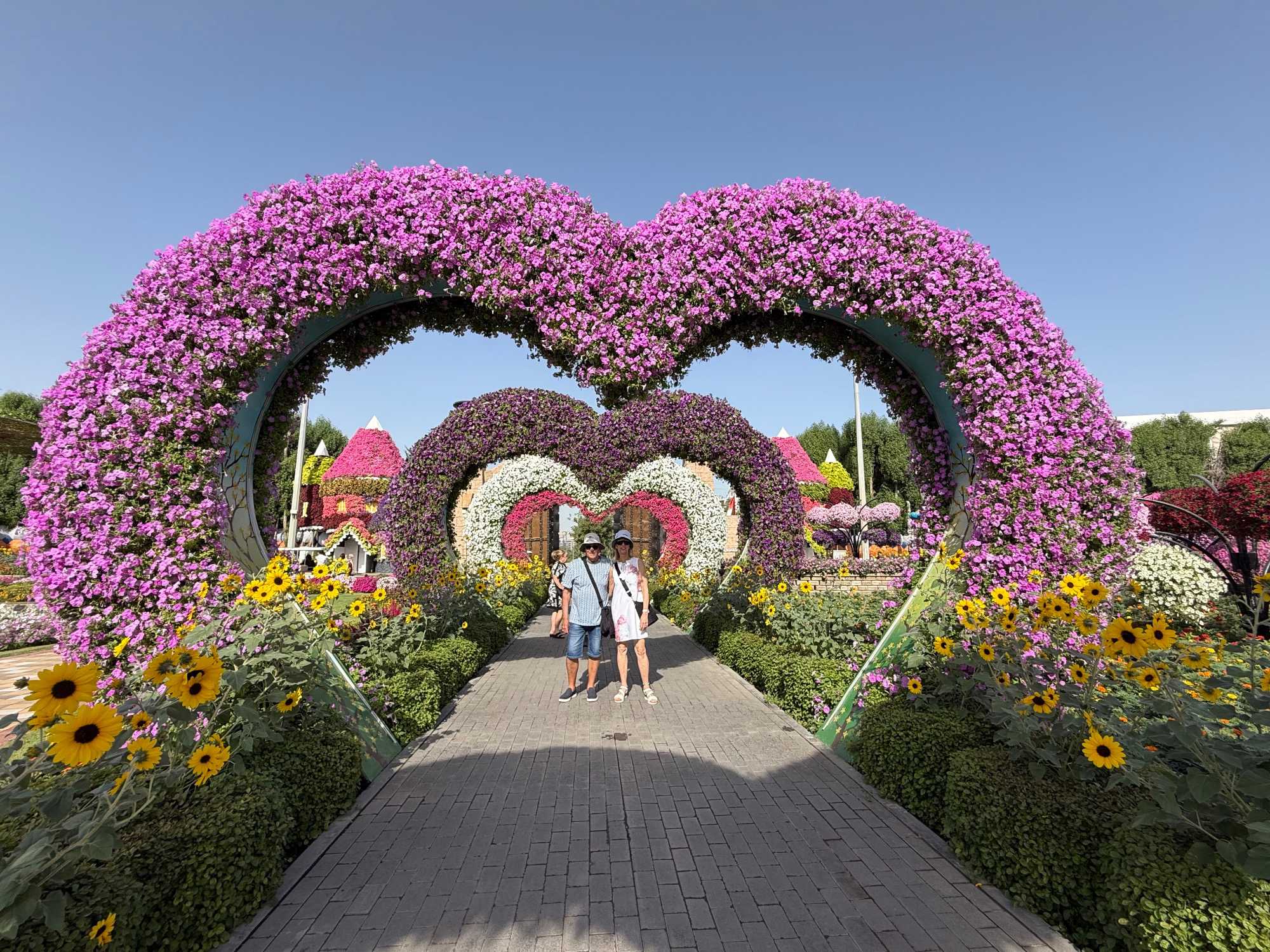 Nous prenons la route vers le Dubaï Miracle Garden, un lieu absolument féérique situé dans le quartier de Dubailand. Dès notre arrivée, c’est l’émerveillement total : une explosion de couleurs et de parfums nous enveloppe aussitôt 🌸💫.