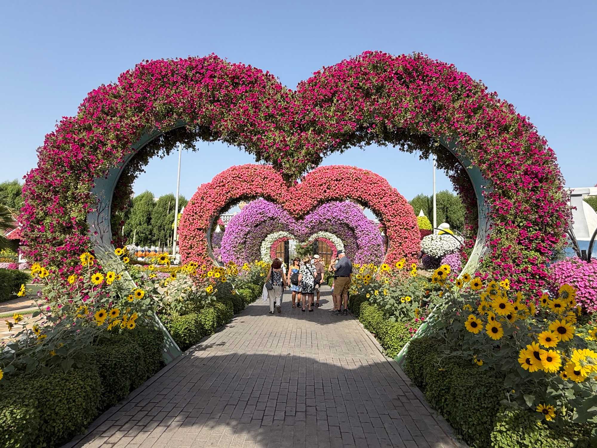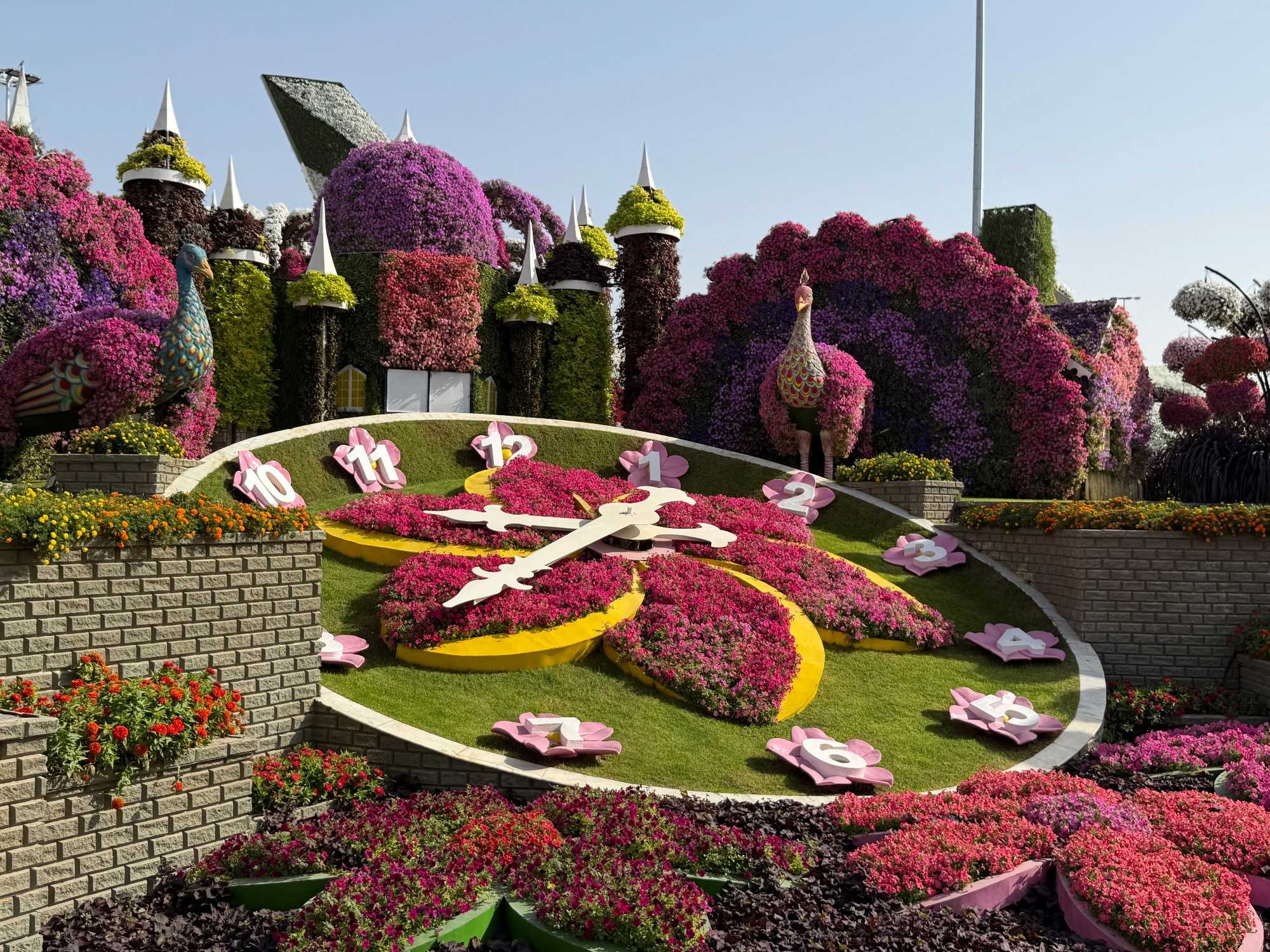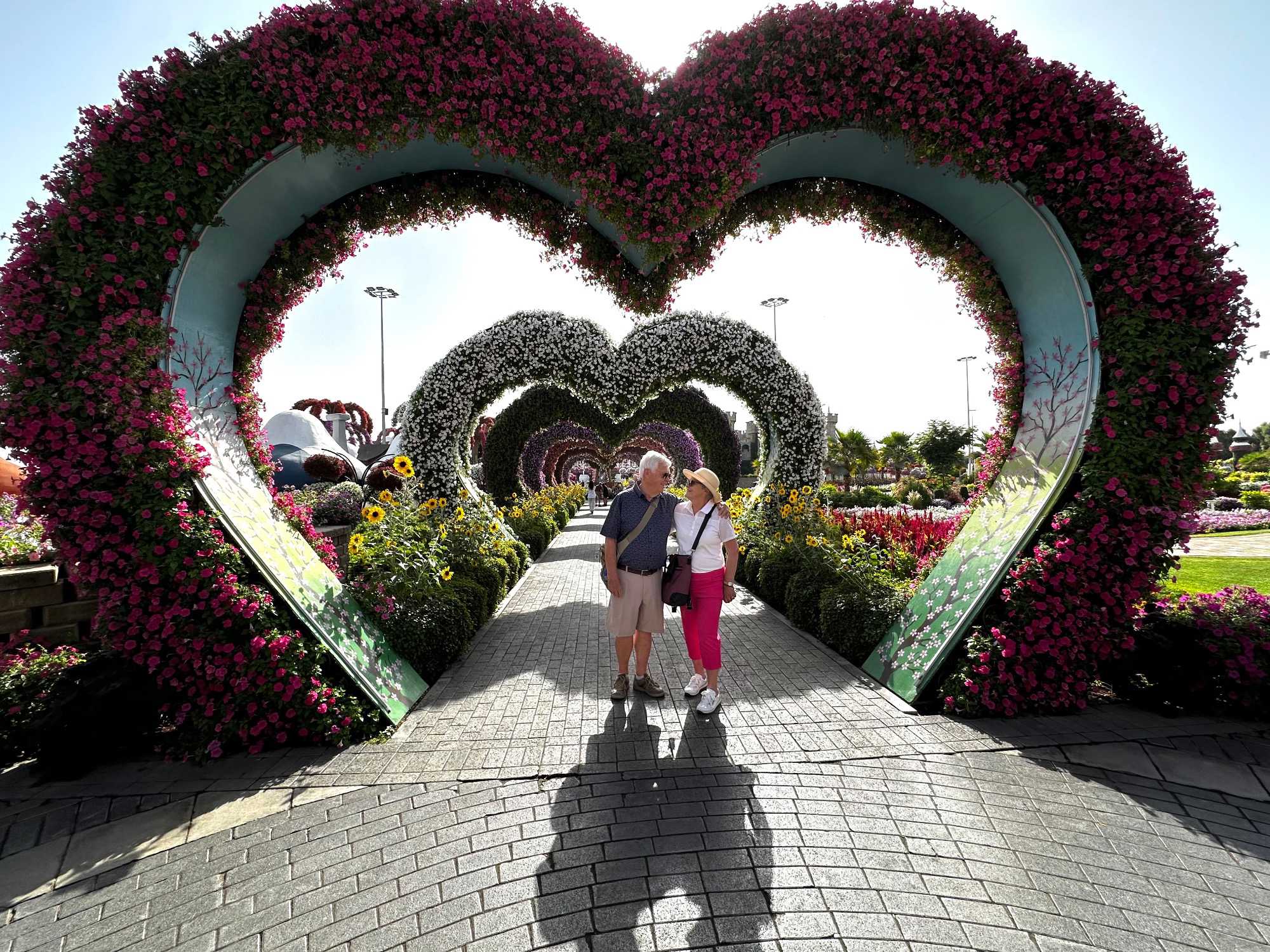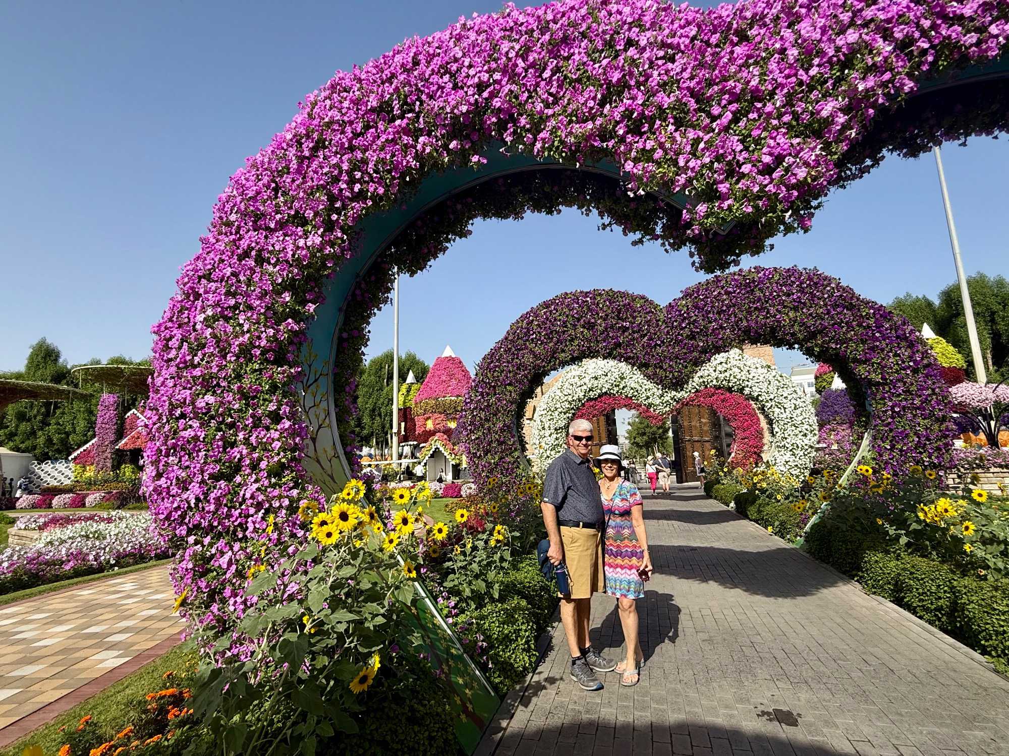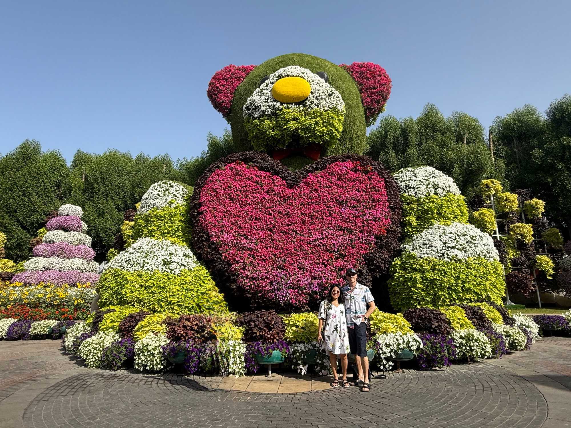 Nous prenons la route vers le Dubaï Miracle Garden, un lieu absolument féérique situé dans le quartier de Dubailand. Dès notre arrivée, c’est l’émerveillement total : une explosion de couleurs et de parfums nous enveloppe aussitôt 🌸💫.