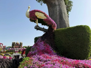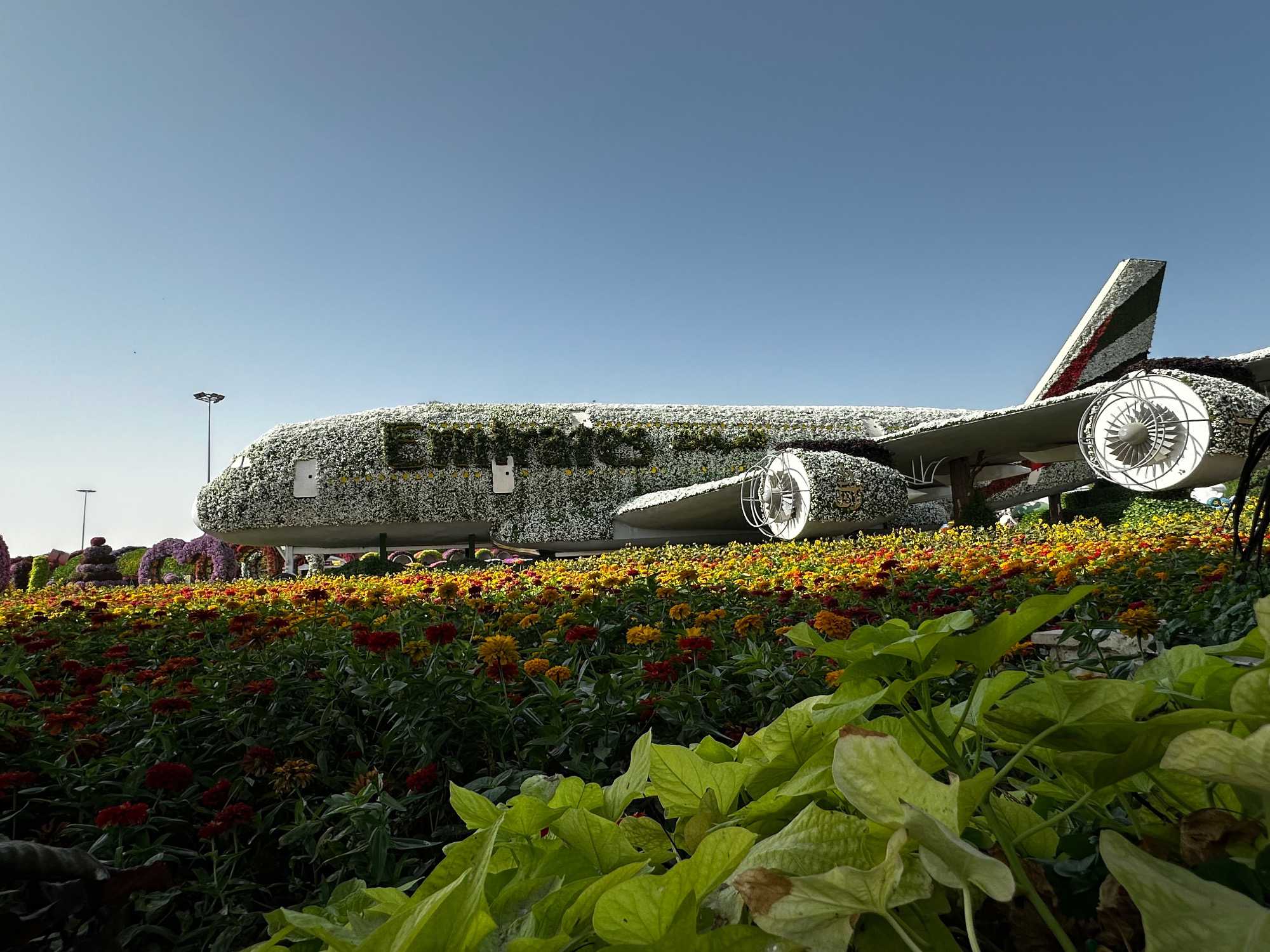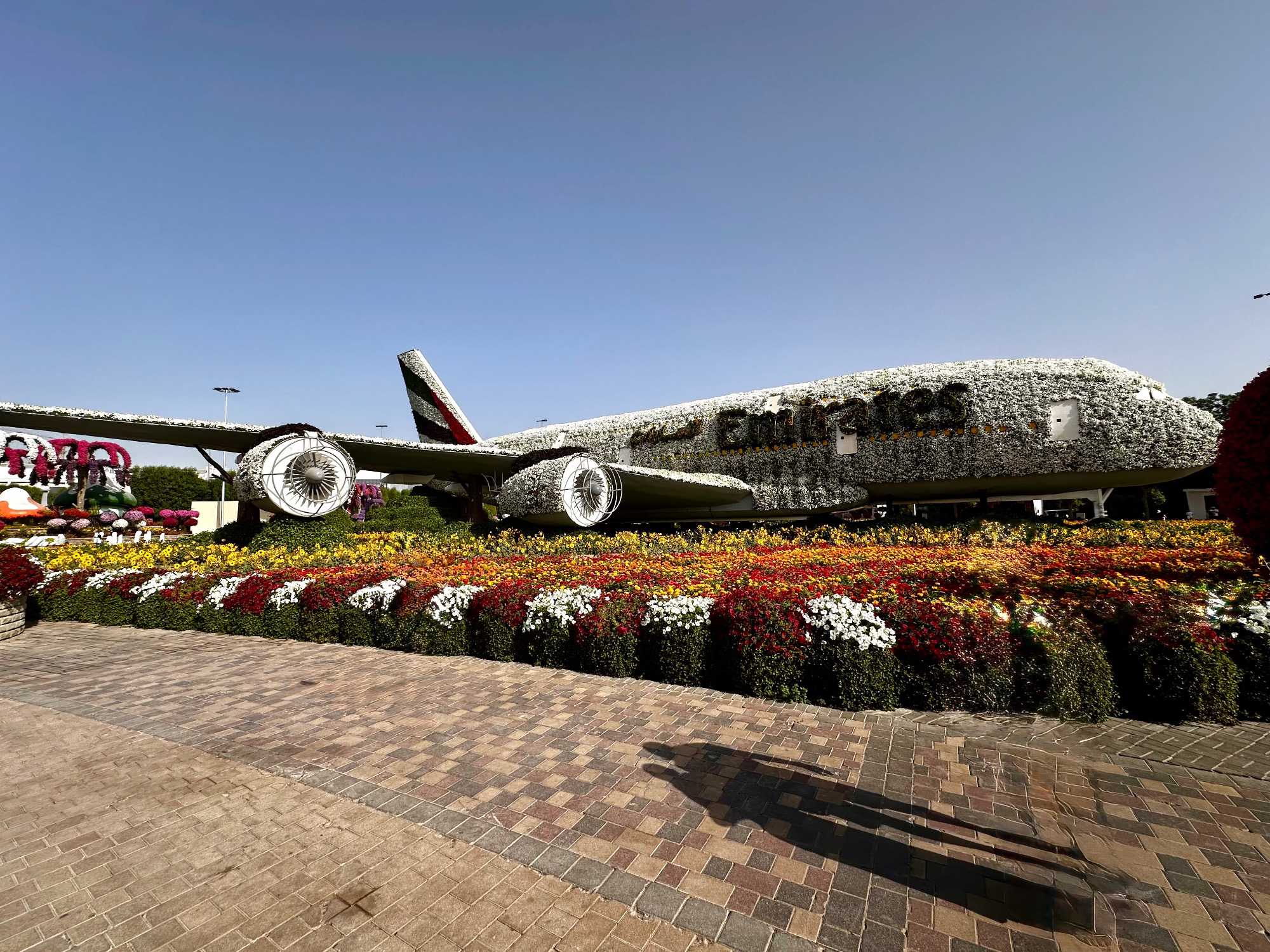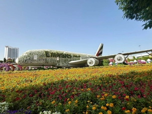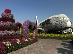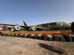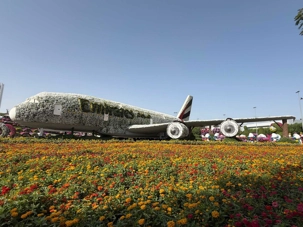 🌷 Des sculptures florales monumentales, comme l’Airbus A380 d’Emirates entièrement recouvert de pétales et inscrit au Guinness World Record, symbole de la fierté émiratie ✈️🌺.