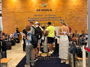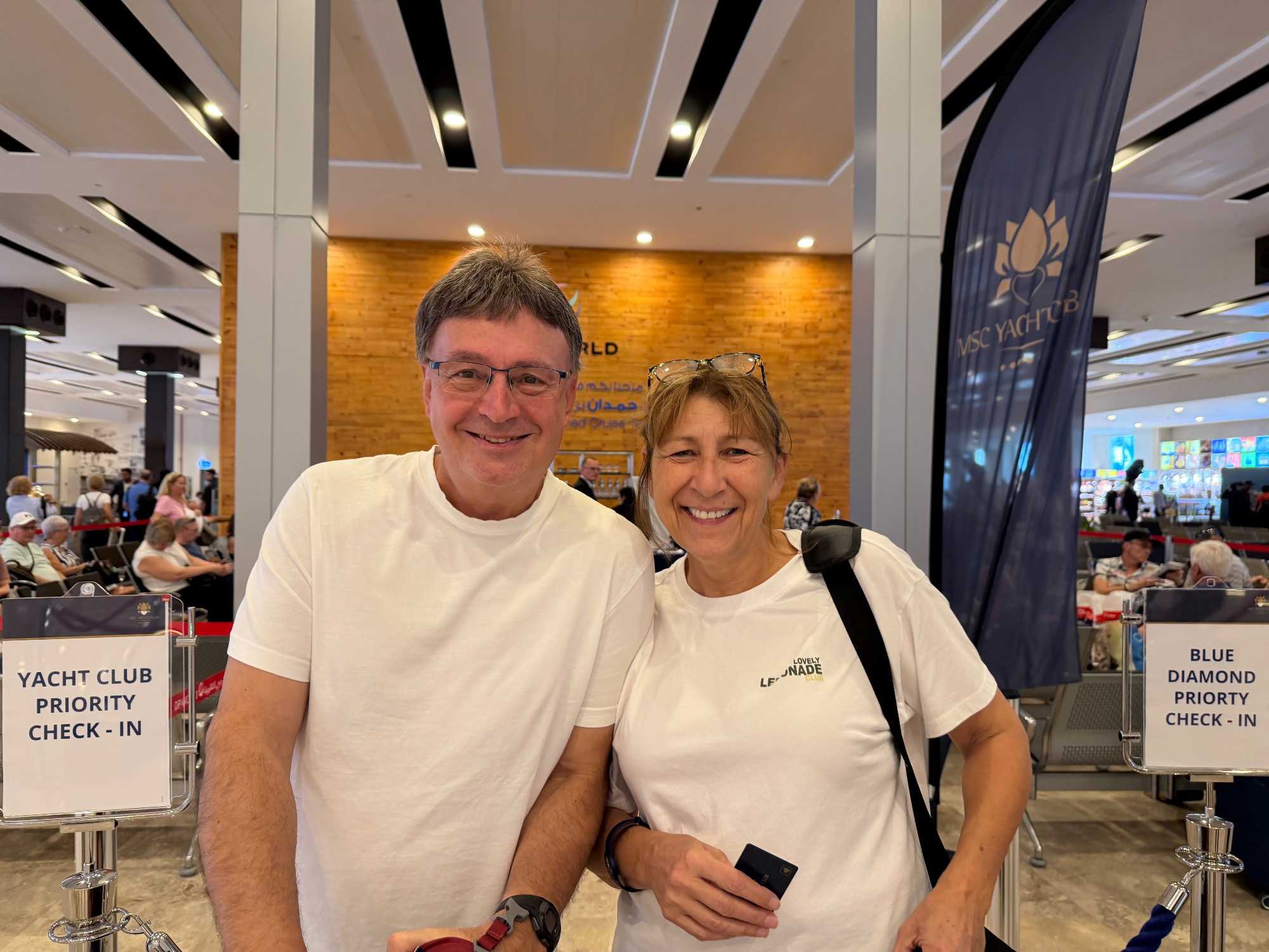 Après cette matinée haute en couleurs et en émerveillement, nous quittons le jardin, encore sous le charme de ce décor féérique. Achille et Mohamed nous accompagnent jusqu’au terminal des croisières de Dubaï, où nous allons embarquer sur le magnifique MSC Euribia, pour une croisière de sept nuits à travers les plus belles escales du Golfe. À notre arrivée, la silhouette du navire se dresse devant nous, imposante et élégante, scintillant sous le soleil du désert ☀️. L’excitation est à son comble — le rêve devient réalité ! ✨