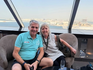 Depuis le pont supérieur, nous admirons la ville de Dubaï qui s’éloigne — la Burj Khalifa scintille dans la nuit, comme un dernier au revoir 🌃💫. Cap sur Doha, au Qatar 🇶🇦, première escale de notre croisière de rêve.