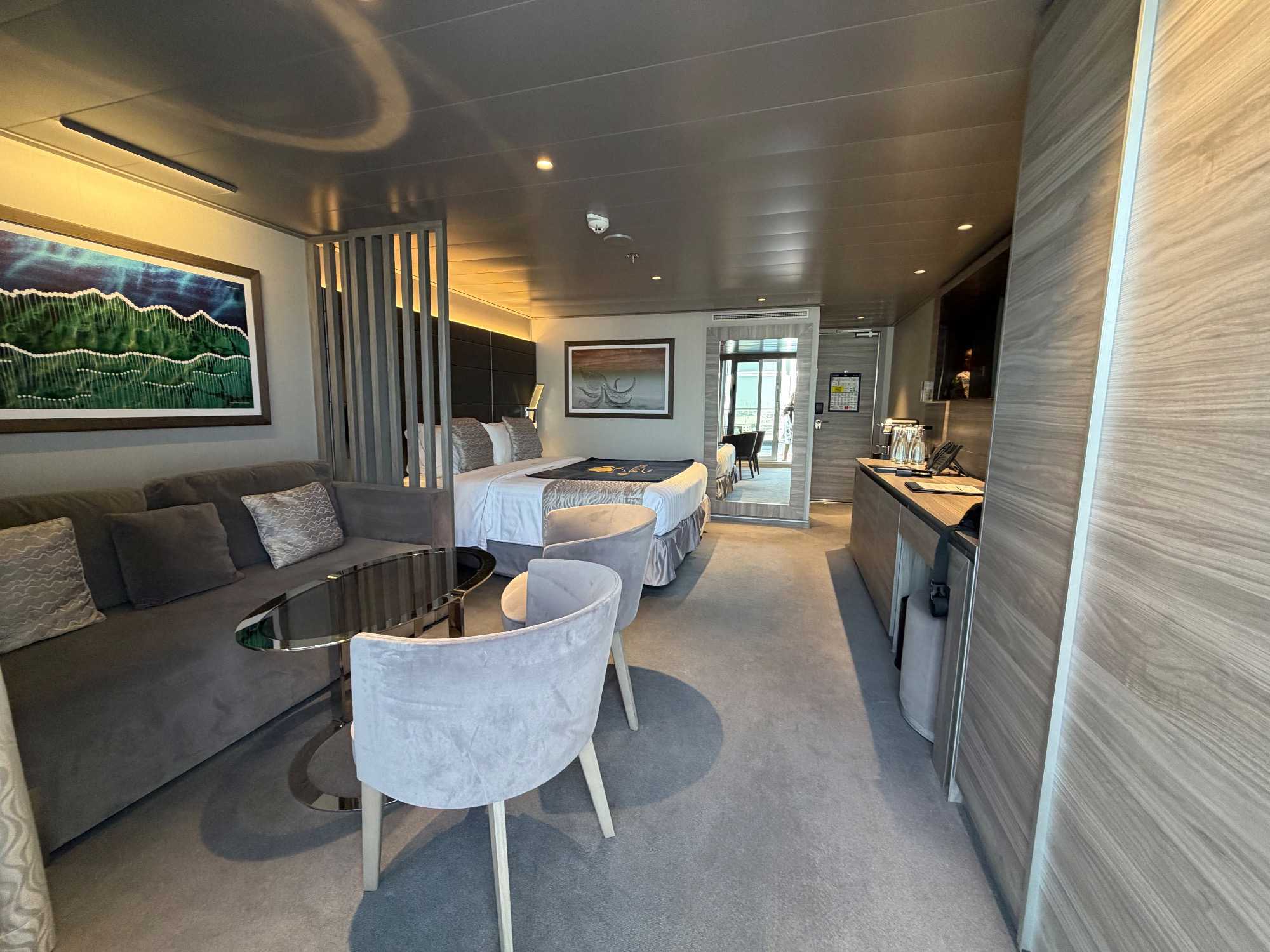 Un majordome nous souhaite la bienvenue et nous accompagne jusqu’à nos magnifiques suites, déjà prêtes à nous recevoir. Les cabines sont somptueuses : spacieuses, lumineuses et décorées avec élégance.