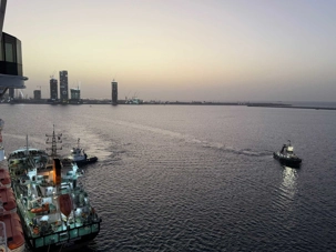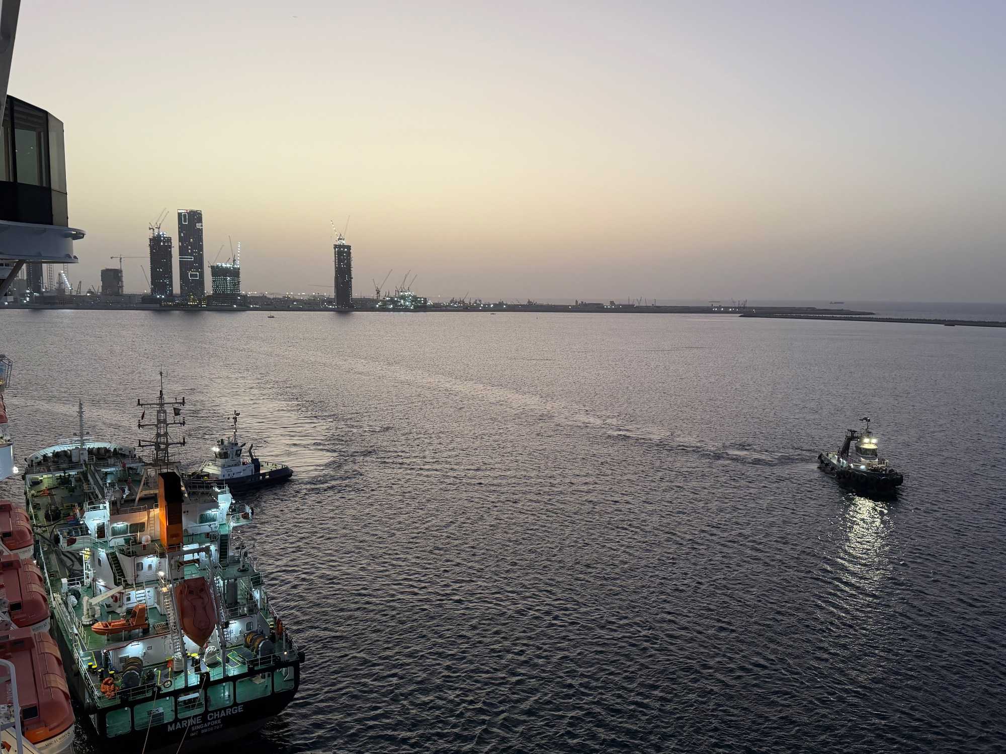 Pendant la soirée, le MSC Euribia lève l’ancre et glisse lentement sur les eaux calmes du Golfe Persique.