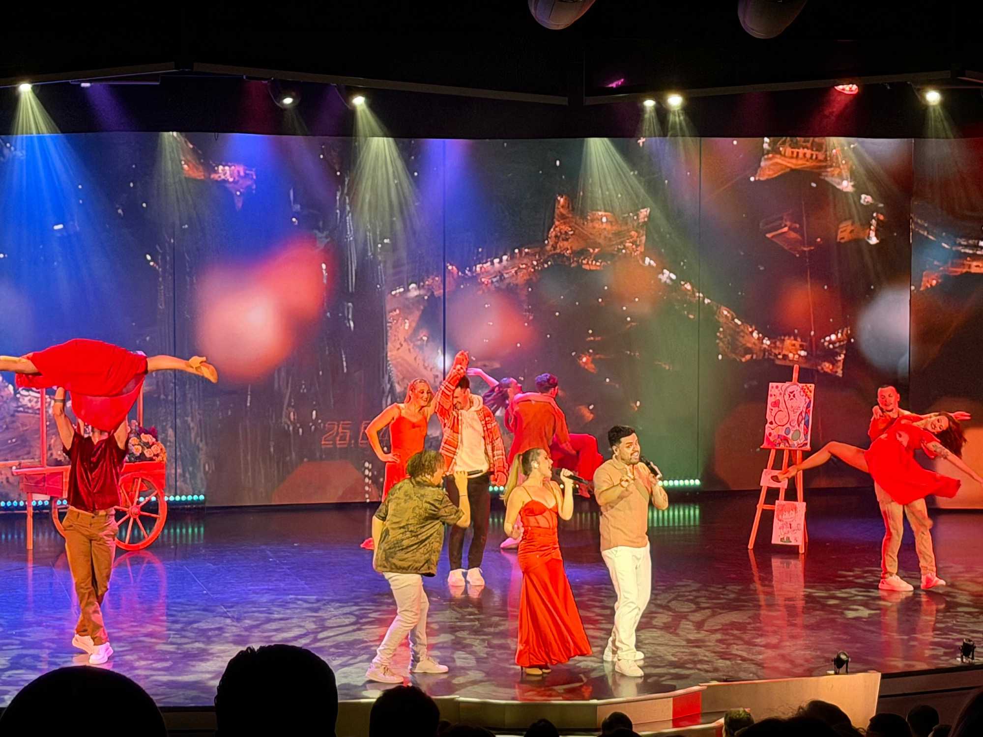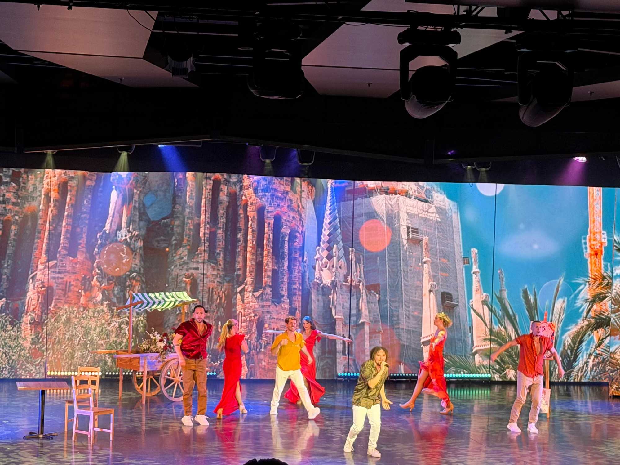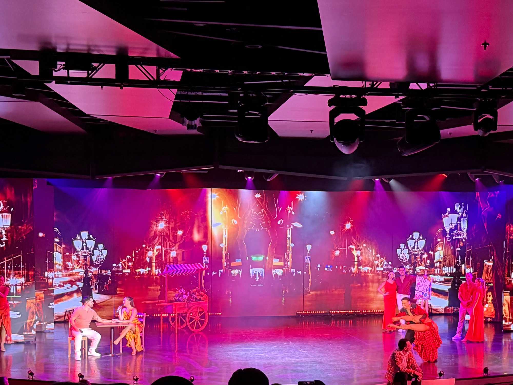 En fin d’après-midi, nous avons assisté au spectacle d’ouverture de la croisière, un moment inoubliable et haut en couleur. Une troupe de danseurs et de chanteurs a offert une performance éblouissante, mêlant musique, lumière et énergie — un vrai plaisir pour les yeux et les oreilles !