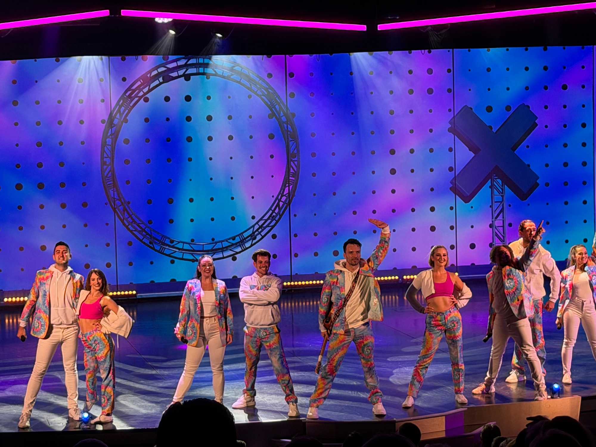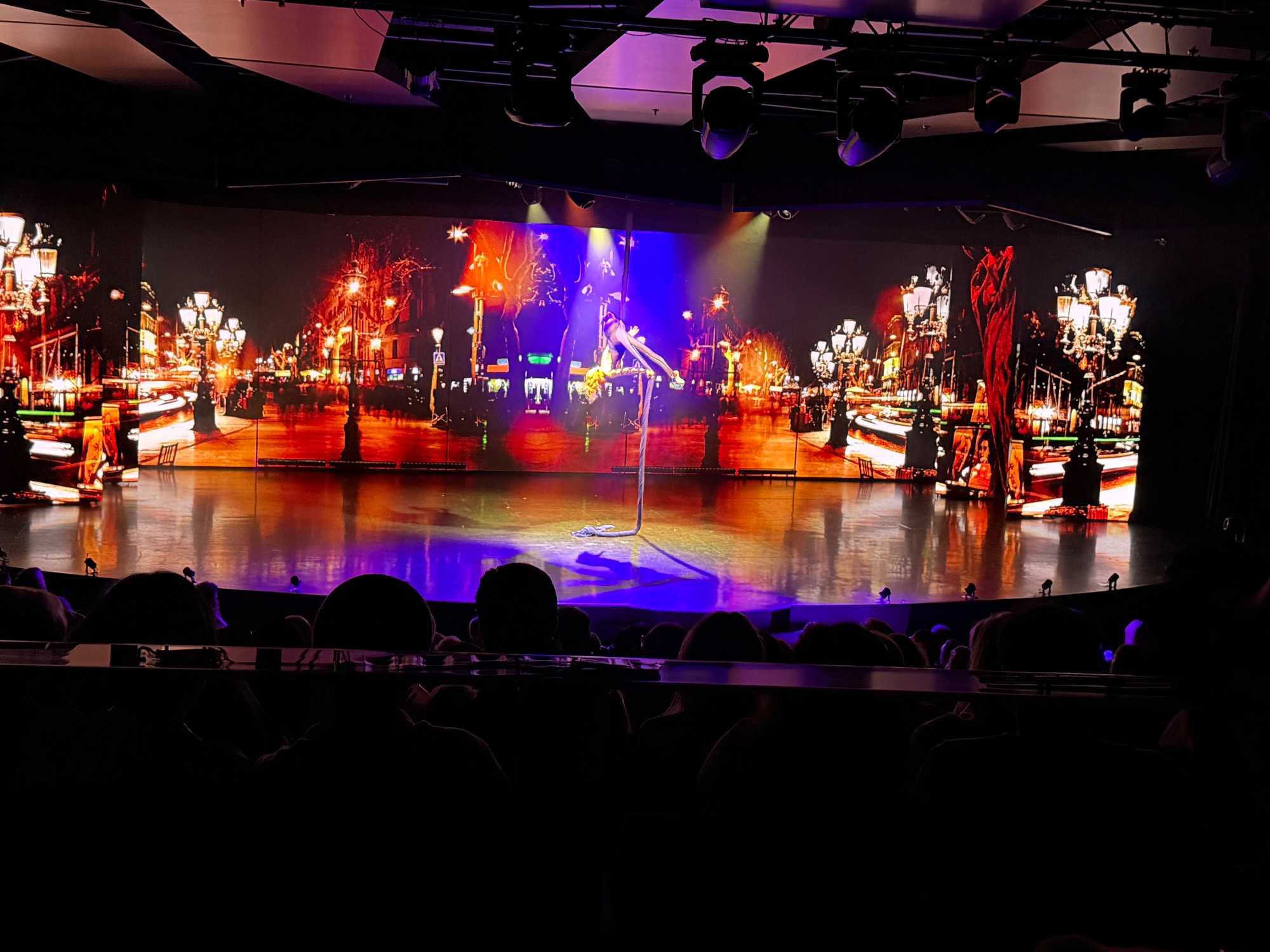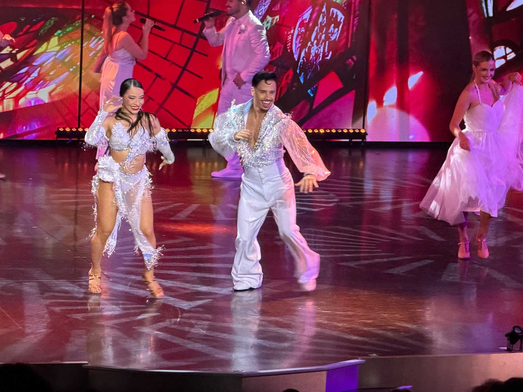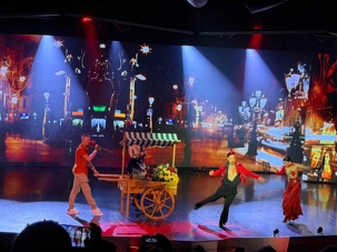 En fin d’après-midi, nous avons assisté au spectacle d’ouverture de la croisière, un moment inoubliable et haut en couleur. Une troupe de danseurs et de chanteurs a offert une performance éblouissante, mêlant musique, lumière et énergie — un vrai plaisir pour les yeux et les oreilles !