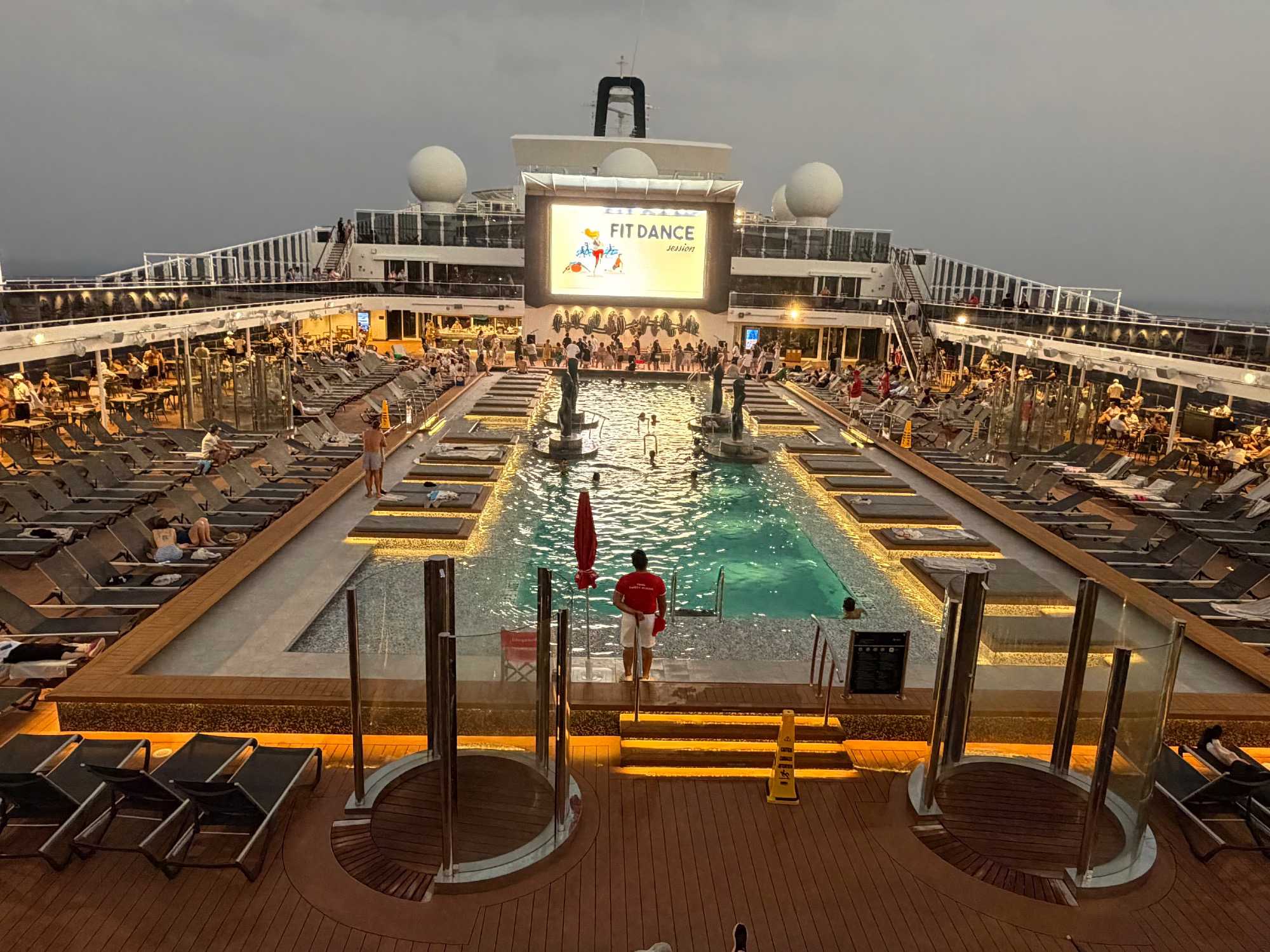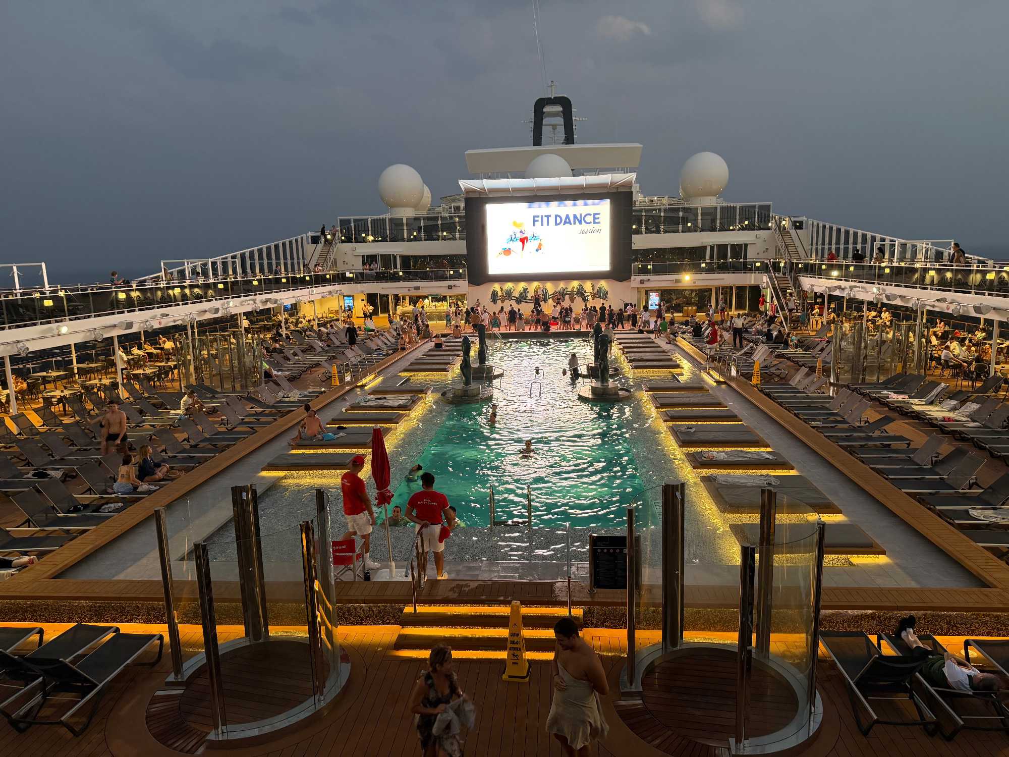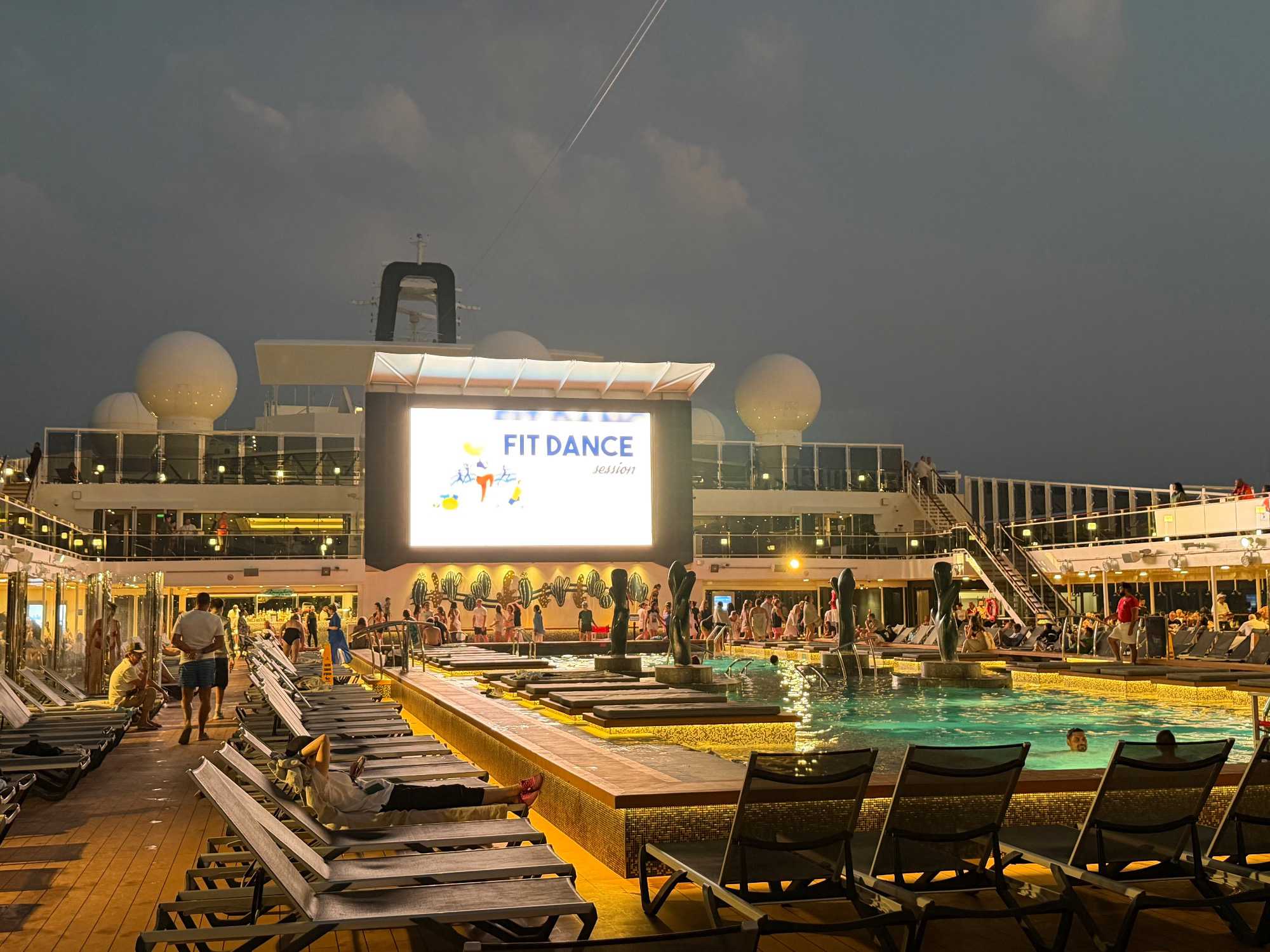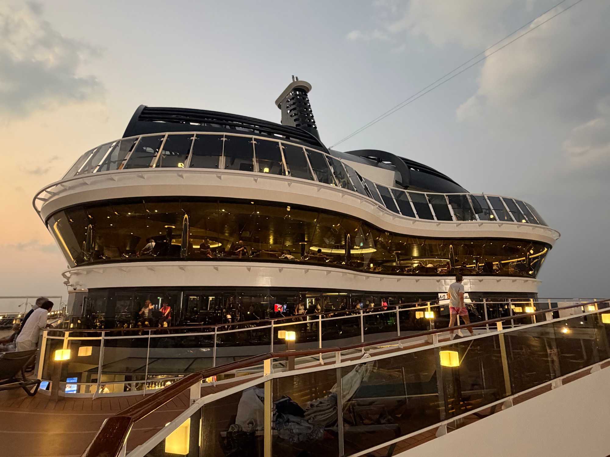 Après ce beau moment, nous avons poursuivi la journée avec un dîner décontracté, toujours délicieux, dans la salle à manger du Yacht Club. Les conversations tournaient autour de la qualité du service, des paysages marins et de la beauté du navire. 💬🥂 L’après-midi s’est ensuite déroulé dans la douceur, comme une parenthèse de calme et de plaisir. Certains se sont installés sur les chaises longues du pont supérieur pour profiter du soleil, d’autres ont préféré le spa, la lecture ou la piscine. Une mer d’huile, un ciel sans nuage et un air tiède rendaient l’atmosphère simplement parfaite. 🌞🌴