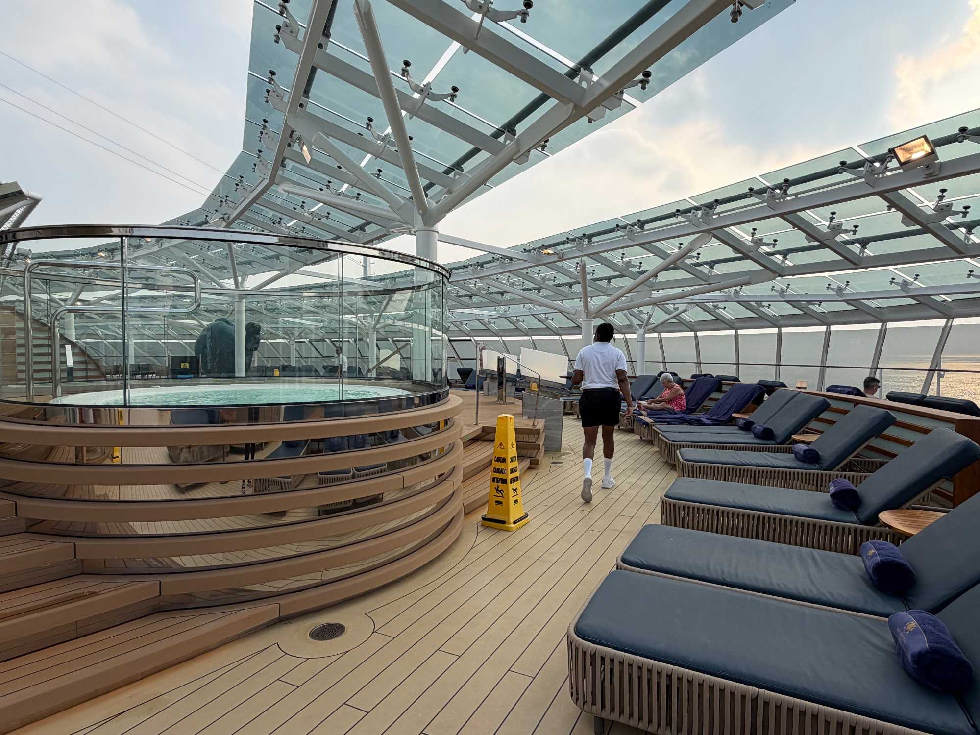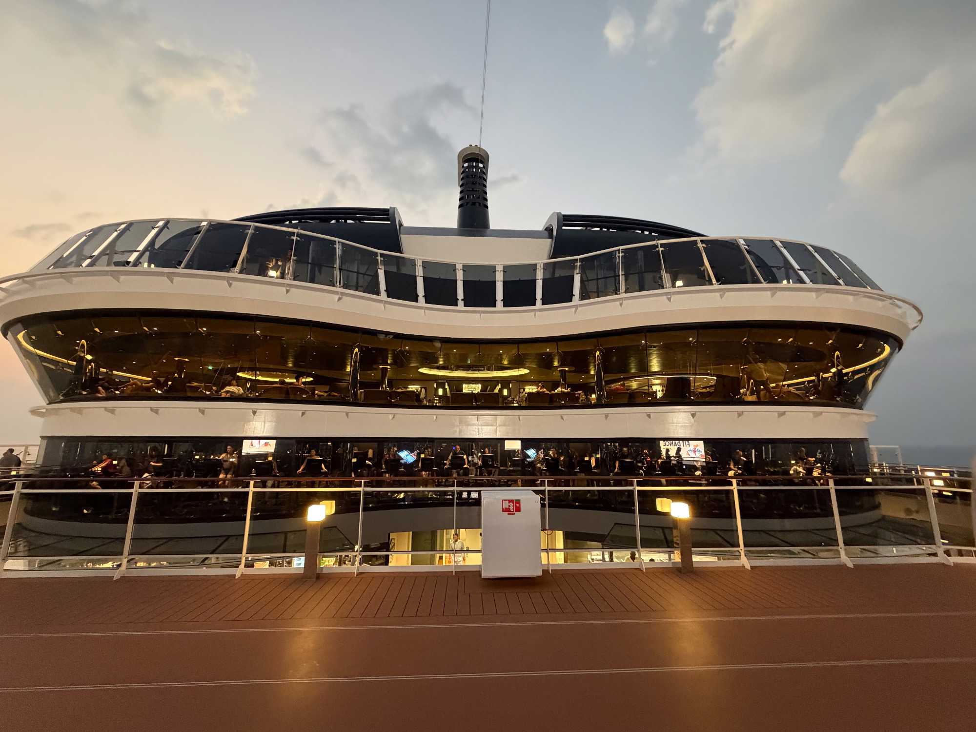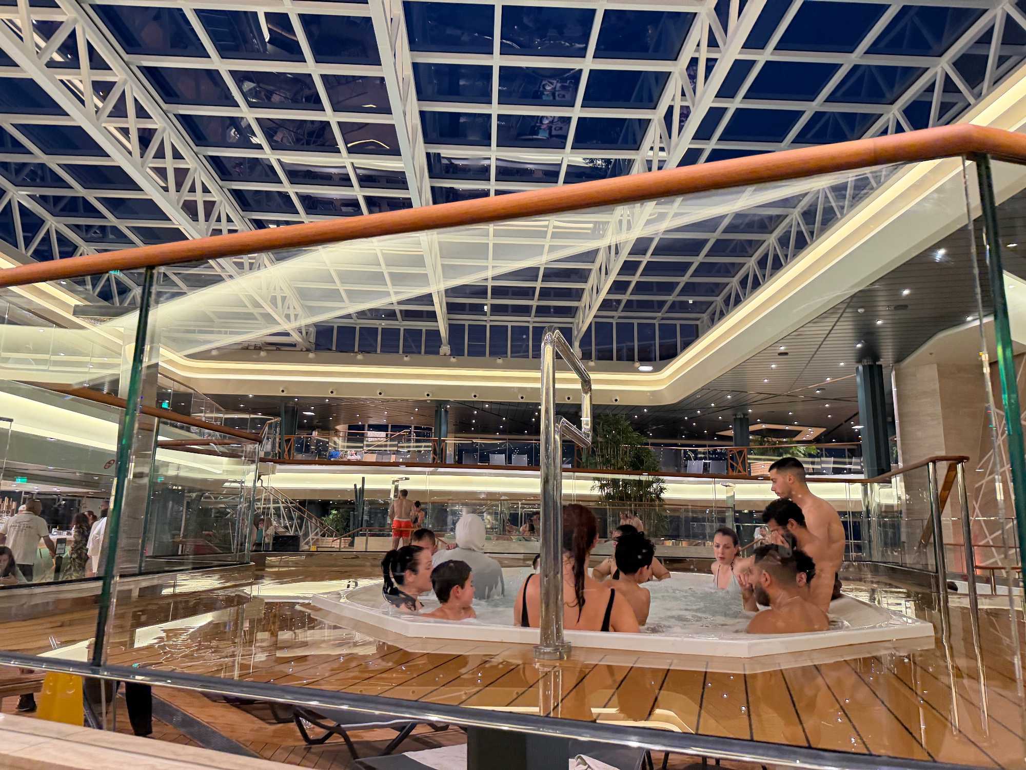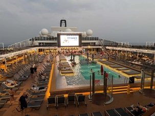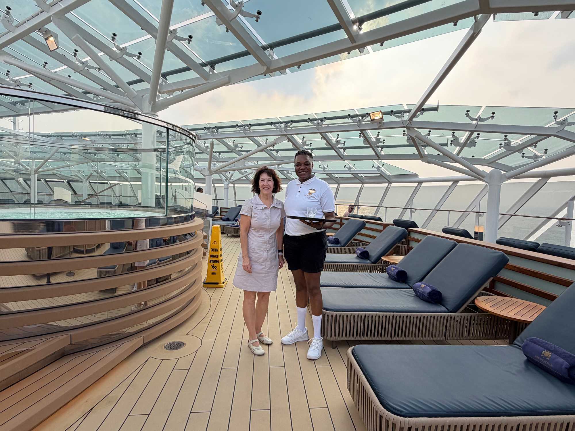 Après ce beau moment, nous avons poursuivi la journée avec un dîner décontracté, toujours délicieux, dans la salle à manger du Yacht Club. Les conversations tournaient autour de la qualité du service, des paysages marins et de la beauté du navire. 💬🥂 L’après-midi s’est ensuite déroulé dans la douceur, comme une parenthèse de calme et de plaisir. Certains se sont installés sur les chaises longues du pont supérieur pour profiter du soleil, d’autres ont préféré le spa, la lecture ou la piscine. Une mer d’huile, un ciel sans nuage et un air tiède rendaient l’atmosphère simplement parfaite. 🌞🌴