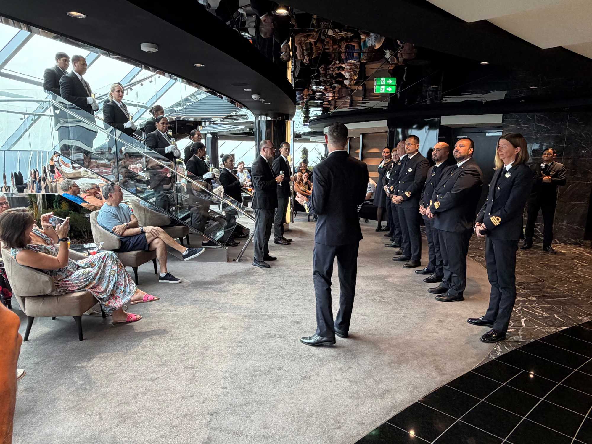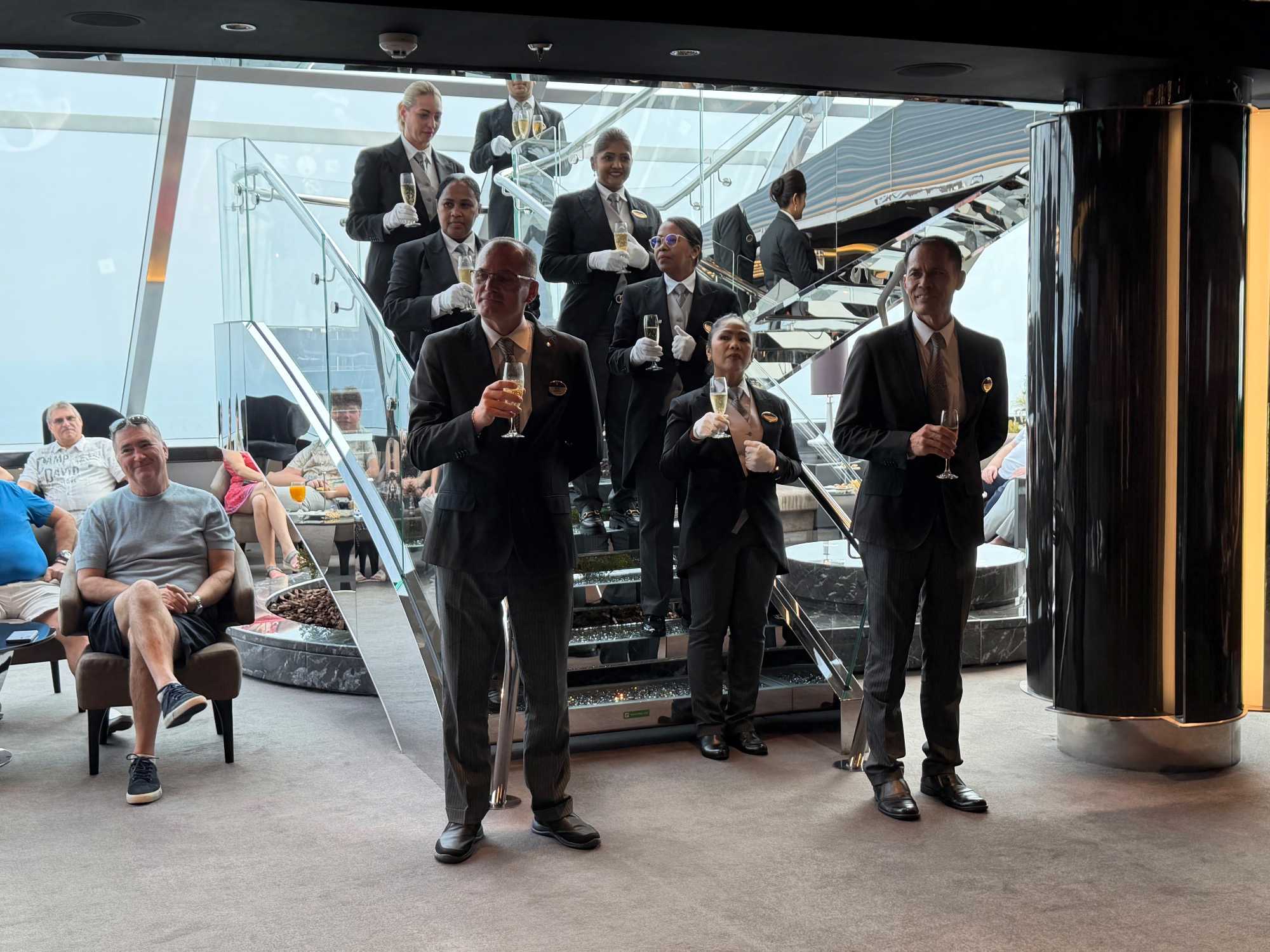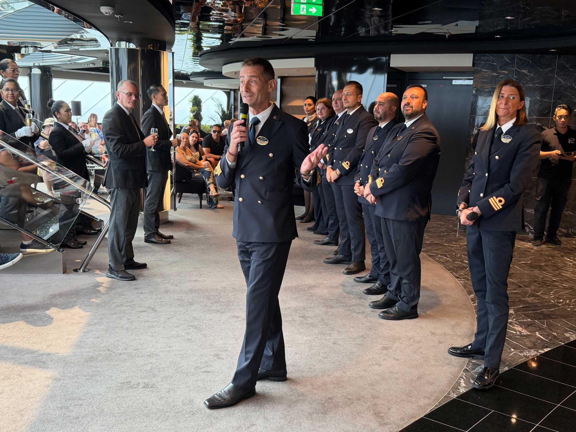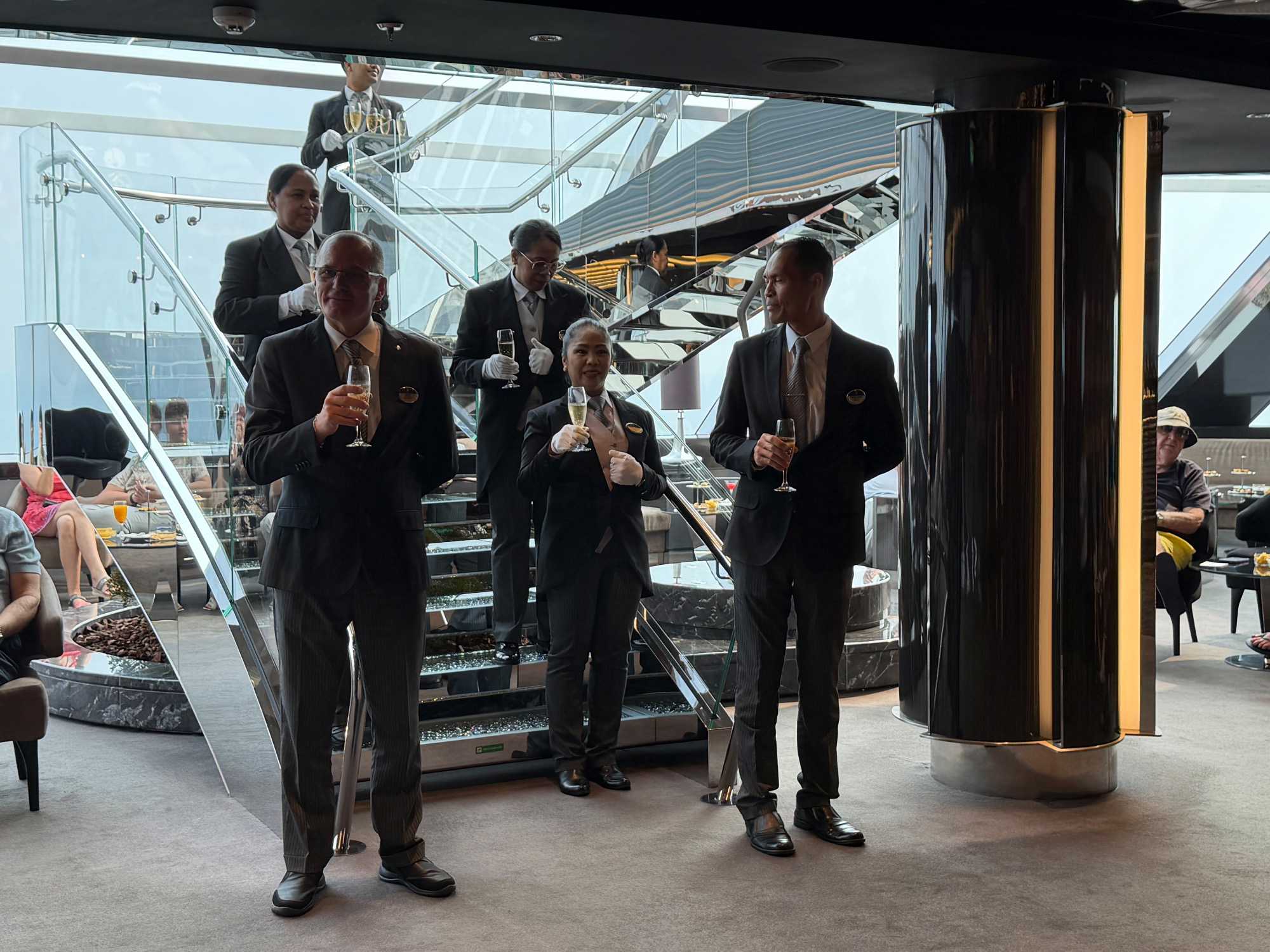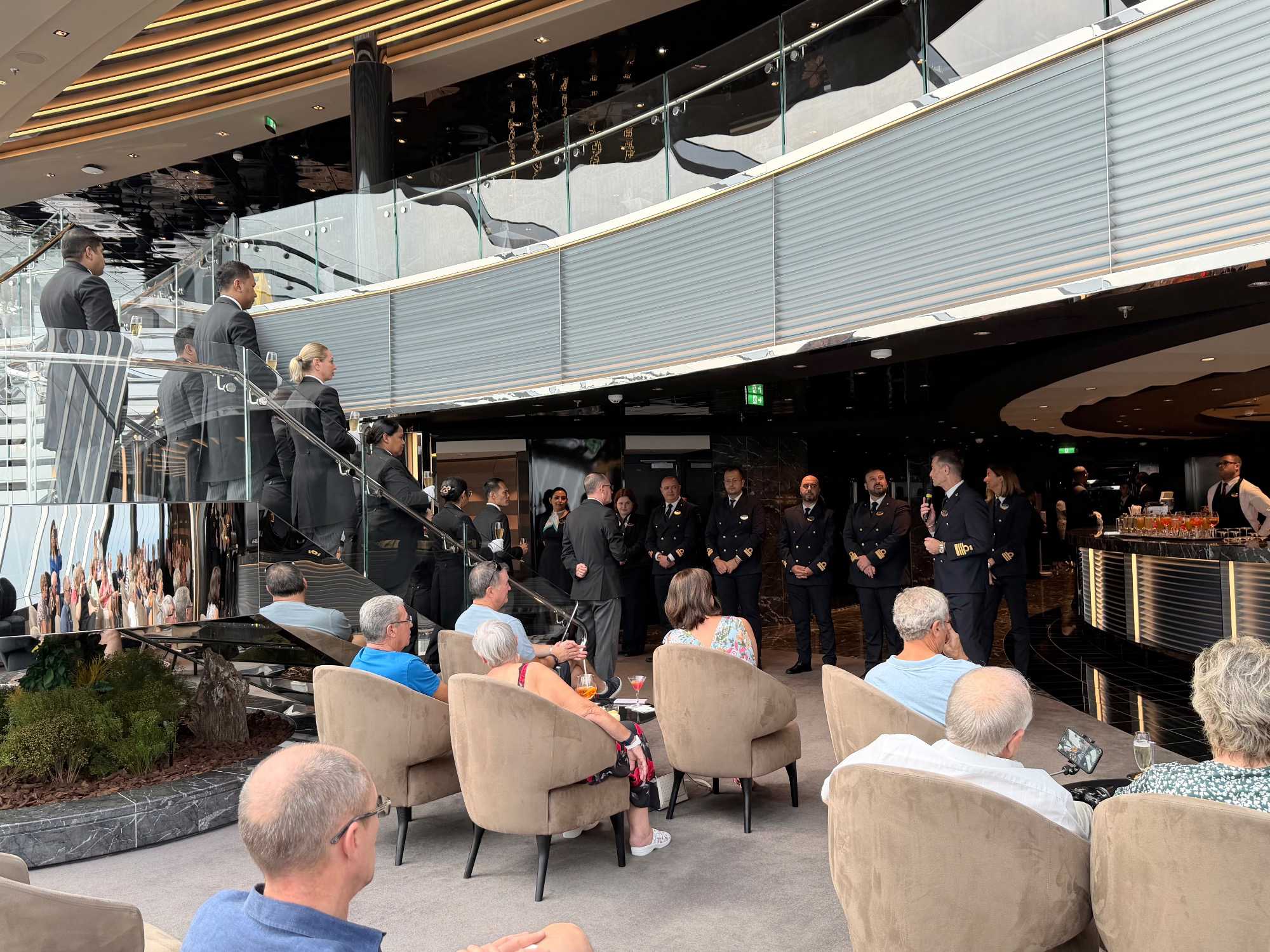 L’événement se tenait dans le superbe salon privé, décoré avec élégance, où tout le personnel du Yacht Club est venu se présenter. Le commandant du navire lui-même est passé nous saluer, sourire aux lèvres, pour nous souhaiter la bienvenue et souligner sa fierté de nous compter à bord. ⚓👨✈️Ce fut un moment de grande classe, ponctué de musique, de canapés raffinés, et bien sûr de boissons à volonté servies avec art. Tous les Butlers, se démarquaient par leur gentillesse, leur humour et leur attention constante : ils veillaient à ce que chacun ne manque de rien, toujours présents avec un service impeccable. 🍸💫 on les adore ces Butlers, et en plus ils sont au moins cinq à parler français. Même le capitaine ce matin nous a parlé en français. Un autre point positif, le français à bord est omniprésent. Les menus à la salle à manger, les journaux de bord, le service concierge de notre Yacht Club avec deux personnes pouvant nous répondre en français. Incroyable!