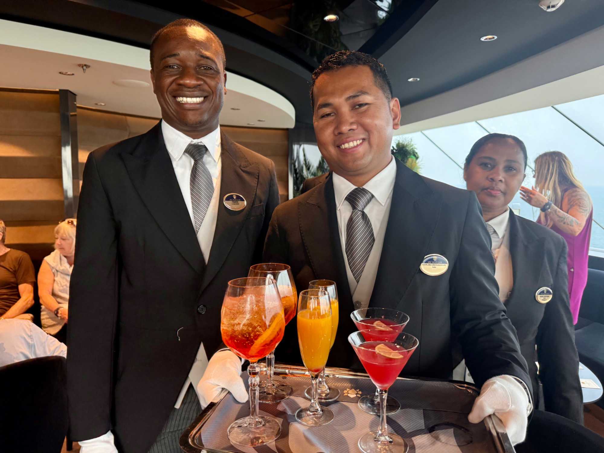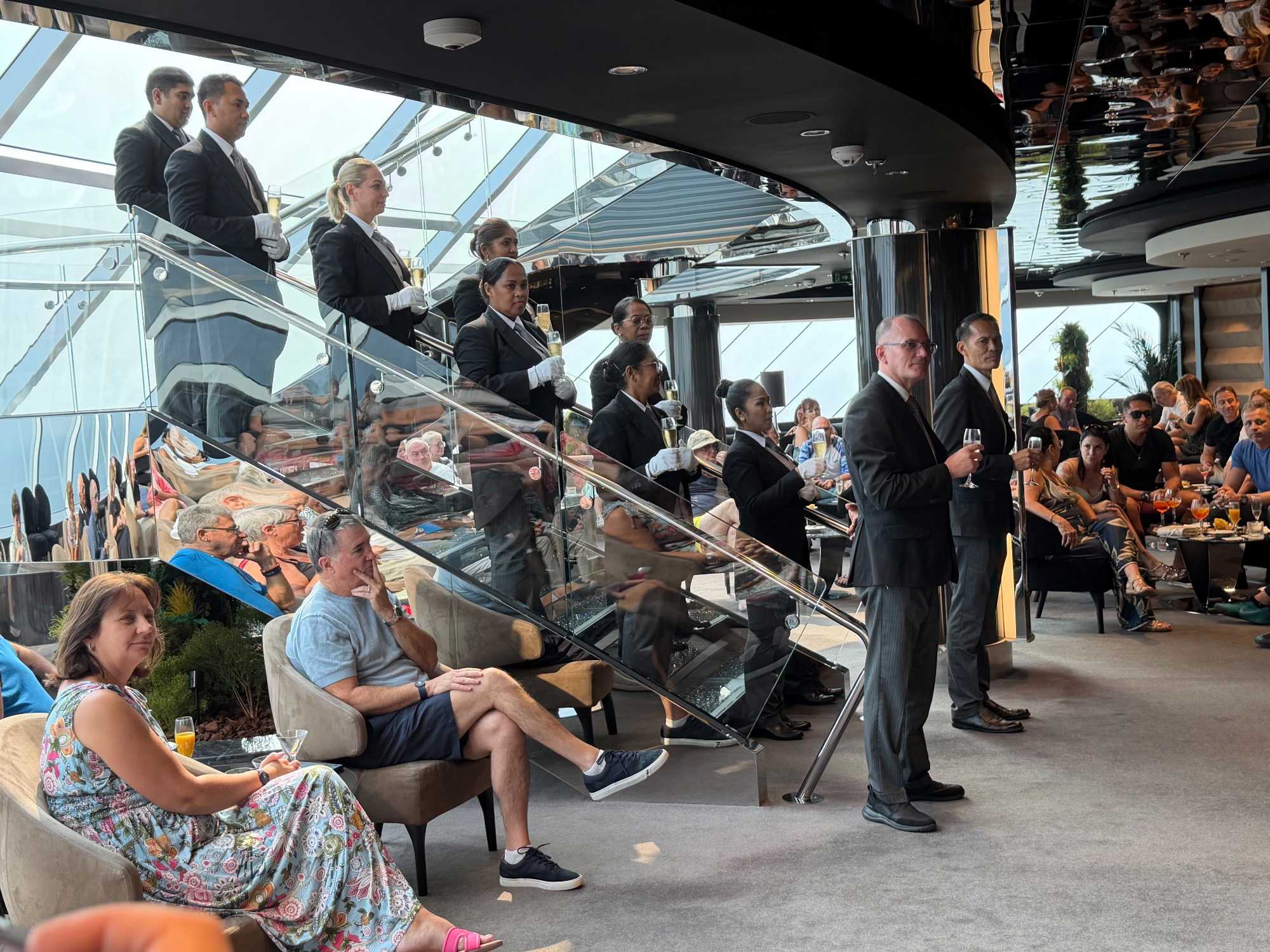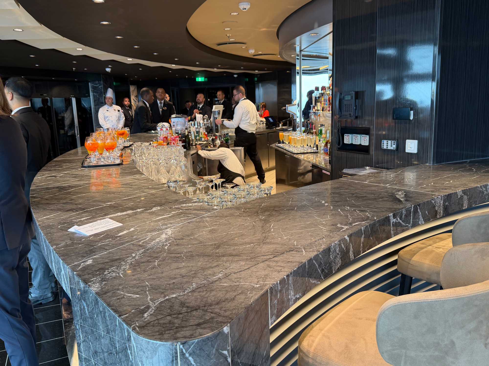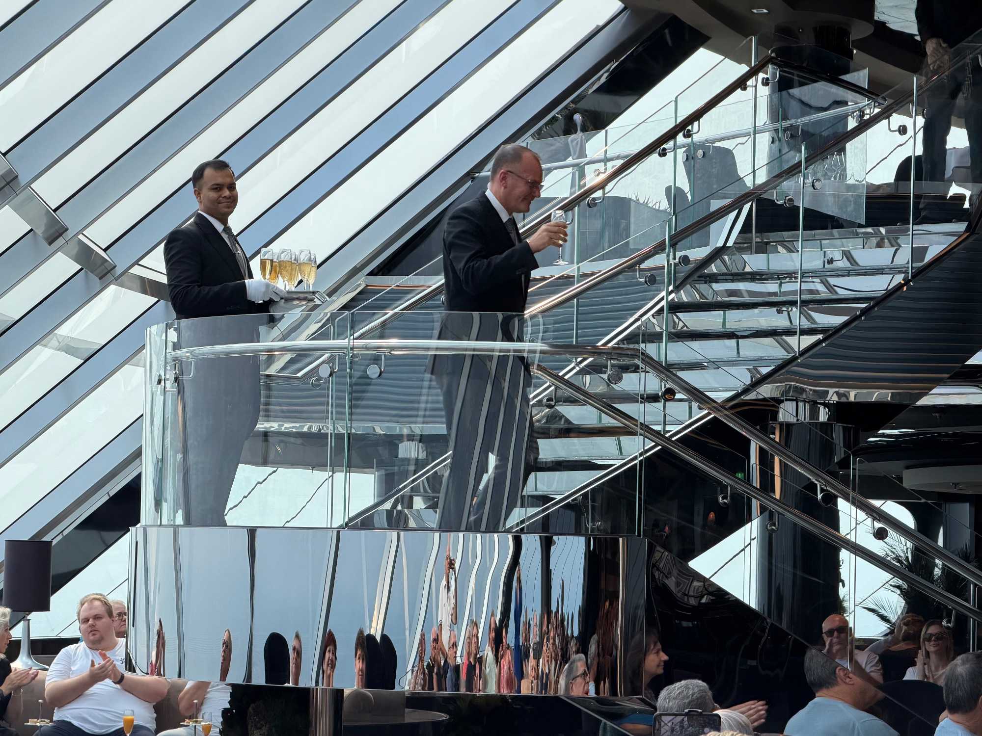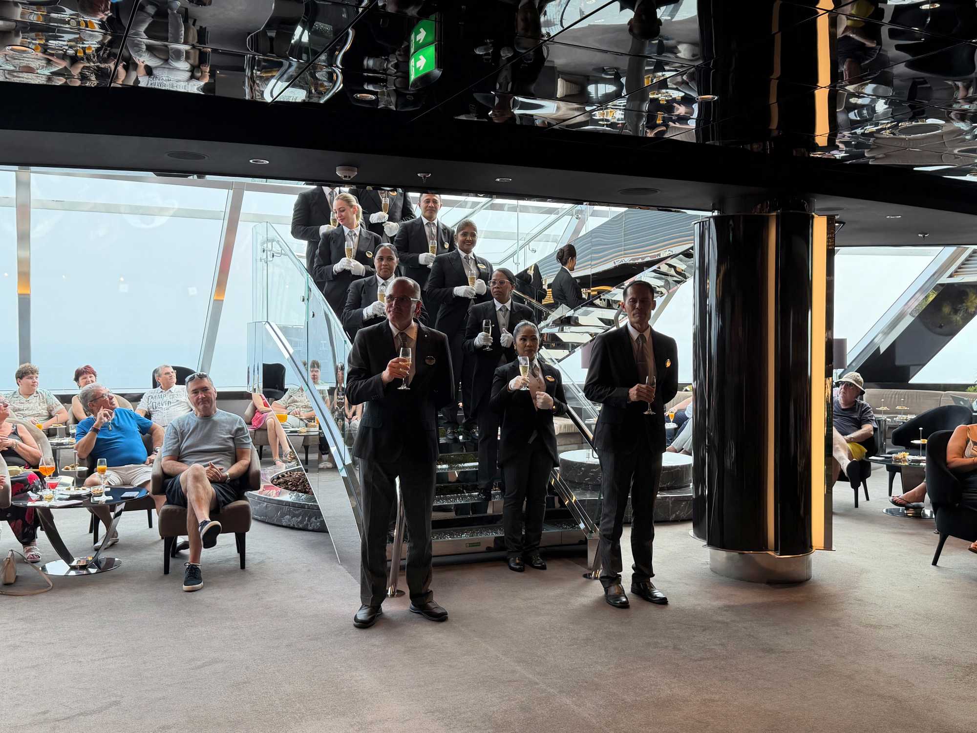 L’événement se tenait dans le superbe salon privé, décoré avec élégance, où tout le personnel du Yacht Club est venu se présenter. Le commandant du navire lui-même est passé nous saluer, sourire aux lèvres, pour nous souhaiter la bienvenue et souligner sa fierté de nous compter à bord. ⚓👨✈️Ce fut un moment de grande classe, ponctué de musique, de canapés raffinés, et bien sûr de boissons à volonté servies avec art. Tous les Butlers, se démarquaient par leur gentillesse, leur humour et leur attention constante : ils veillaient à ce que chacun ne manque de rien, toujours présents avec un service impeccable. 🍸💫 on les adore ces Butlers, et en plus ils sont au moins cinq à parler français. Même le capitaine ce matin nous a parlé en français. Un autre point positif, le français à bord est omniprésent. Les menus à la salle à manger, les journaux de bord, le service concierge de notre Yacht Club avec deux personnes pouvant nous répondre en français. Incroyable!