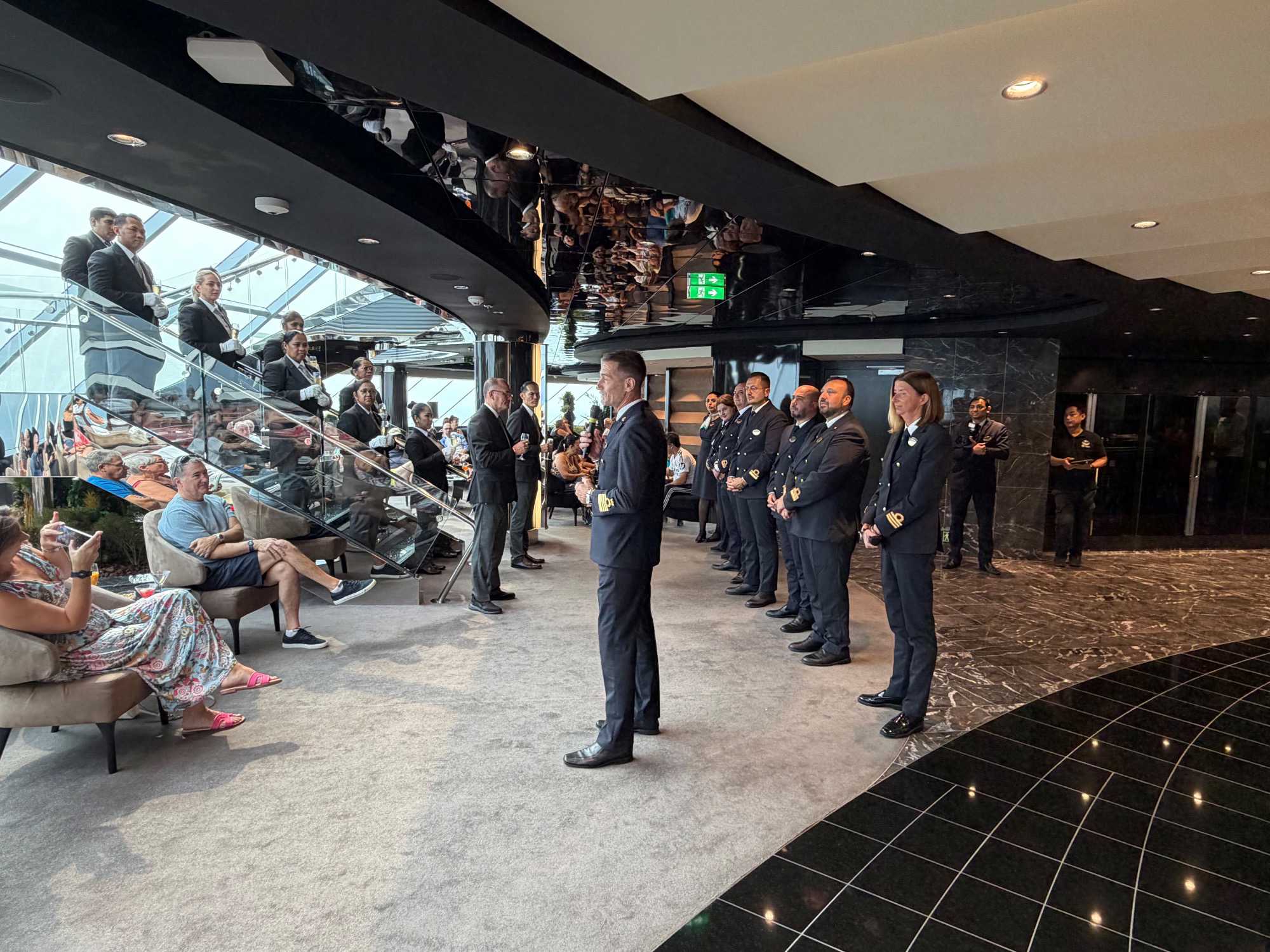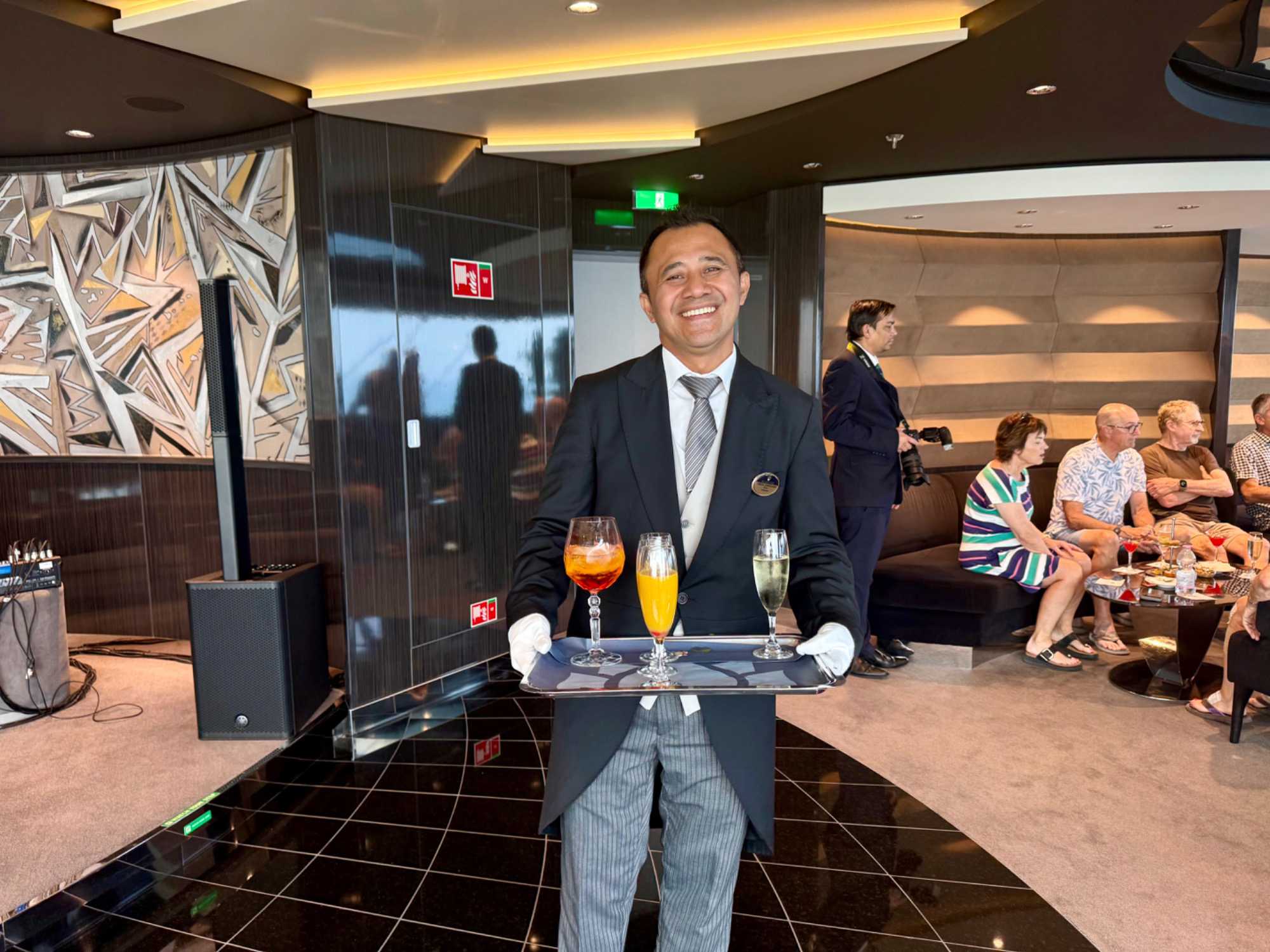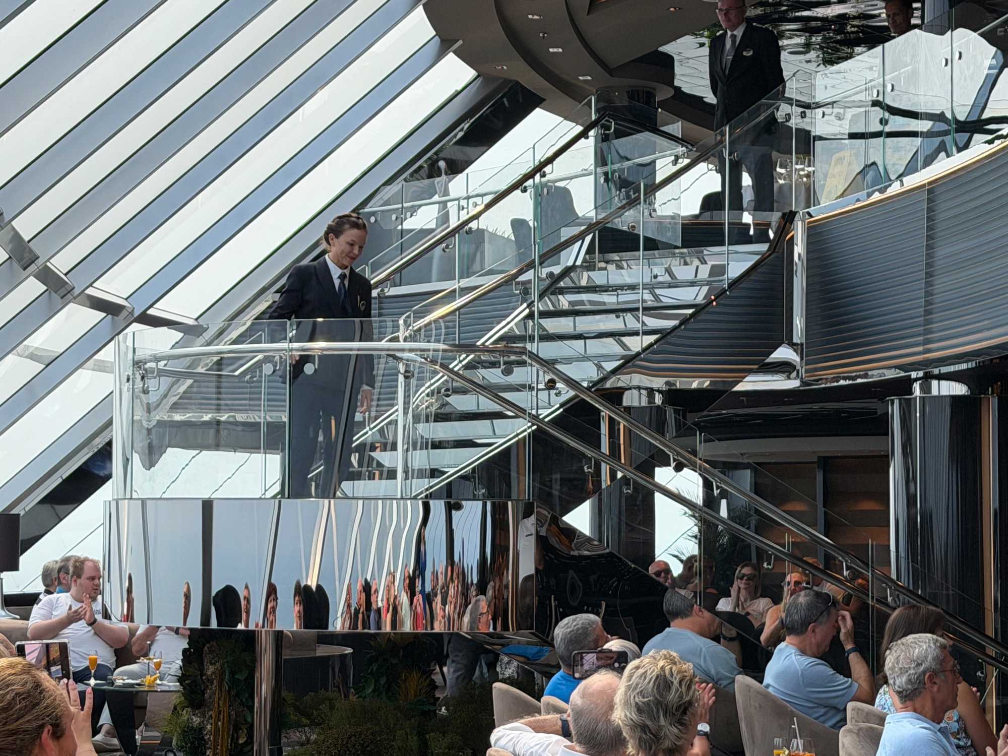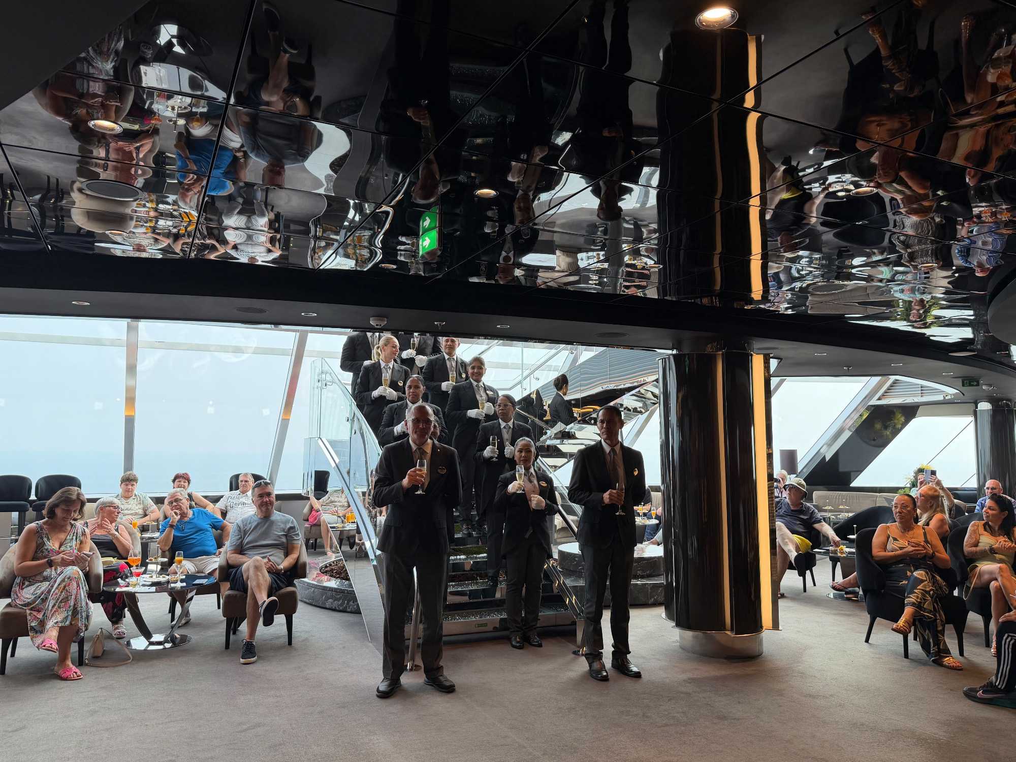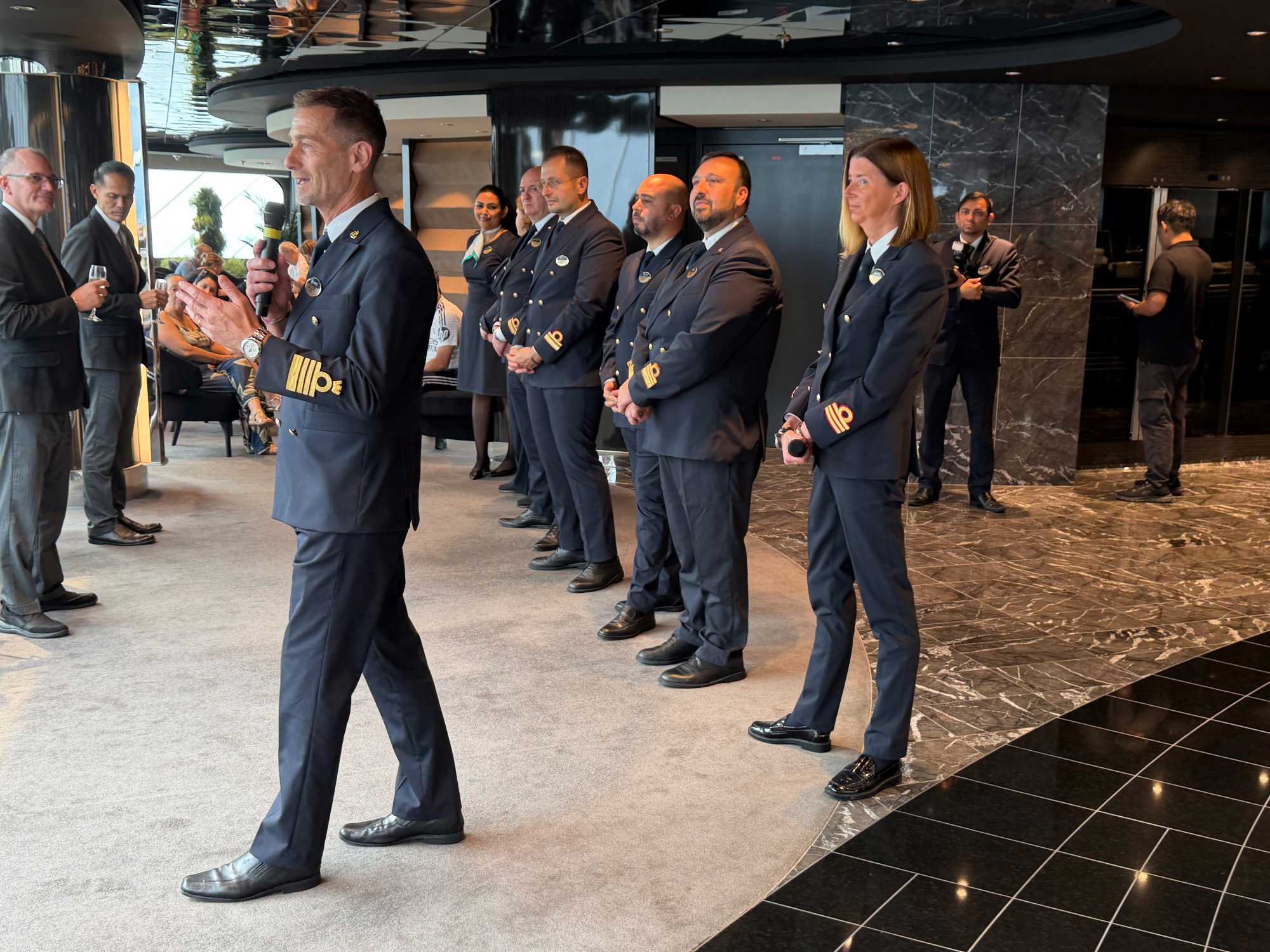L’événement se tenait dans le superbe salon privé, décoré avec élégance, où tout le personnel du Yacht Club est venu se présenter. Le commandant du navire lui-même est passé nous saluer, sourire aux lèvres, pour nous souhaiter la bienvenue et souligner sa fierté de nous compter à bord. ⚓👨✈️Ce fut un moment de grande classe, ponctué de musique, de canapés raffinés, et bien sûr de boissons à volonté servies avec art. Tous les Butlers, se démarquaient par leur gentillesse, leur humour et leur attention constante : ils veillaient à ce que chacun ne manque de rien, toujours présents avec un service impeccable. 🍸💫 on les adore ces Butlers, et en plus ils sont au moins cinq à parler français. Même le capitaine ce matin nous a parlé en français. Un autre point positif, le français à bord est omniprésent. Les menus à la salle à manger, les journaux de bord, le service concierge de notre Yacht Club avec deux personnes pouvant nous répondre en français. Incroyable!