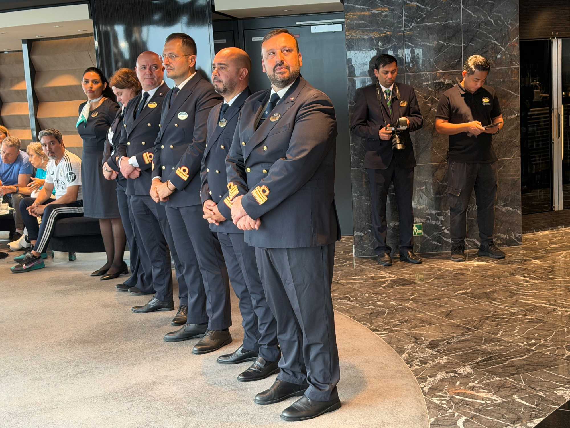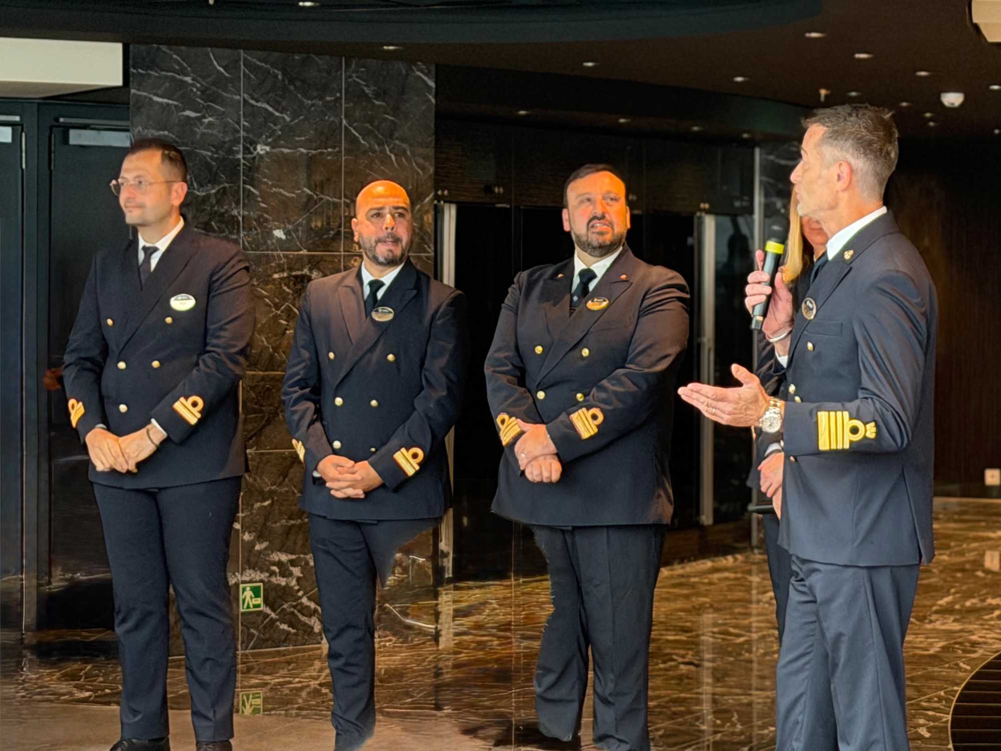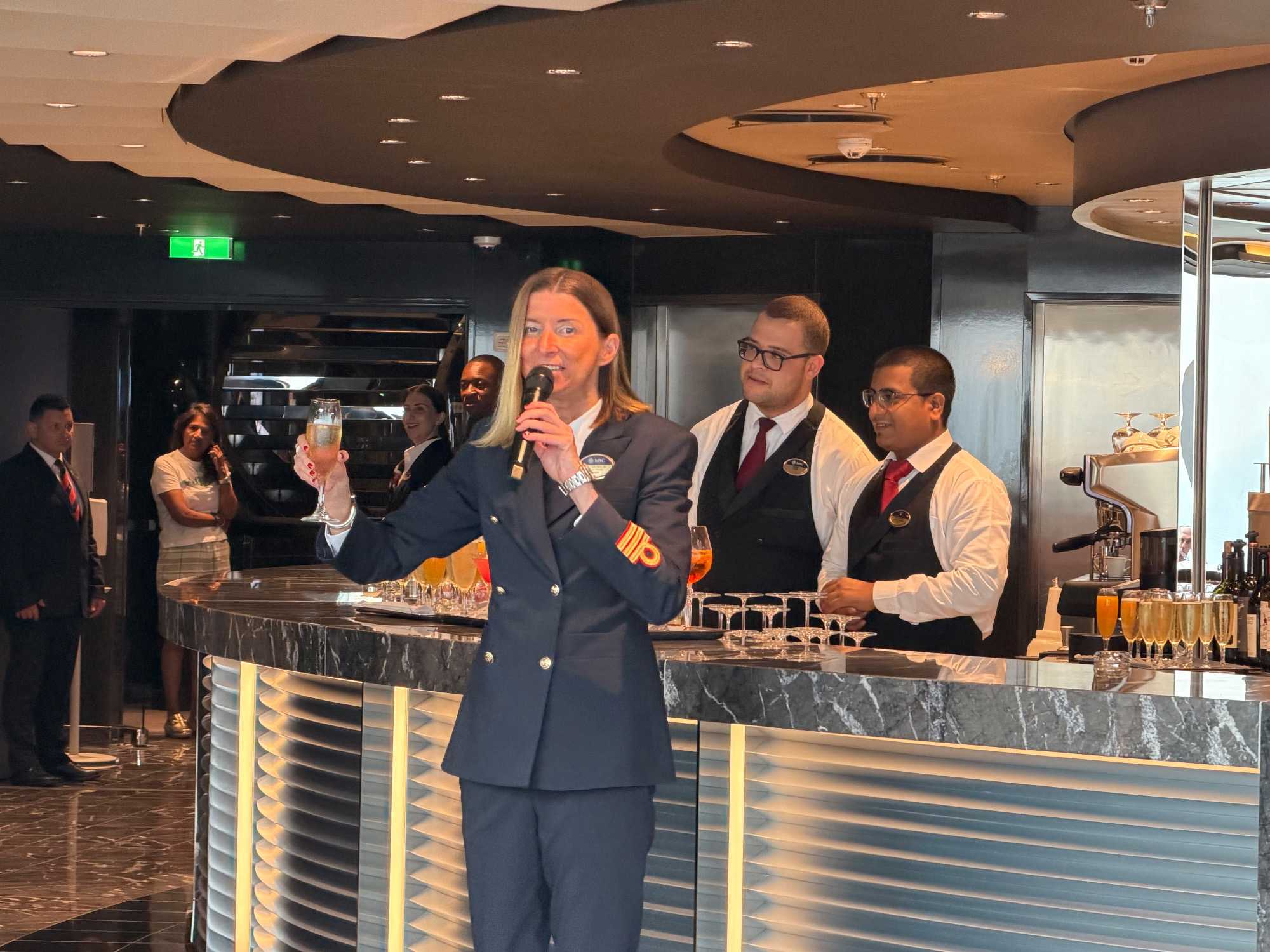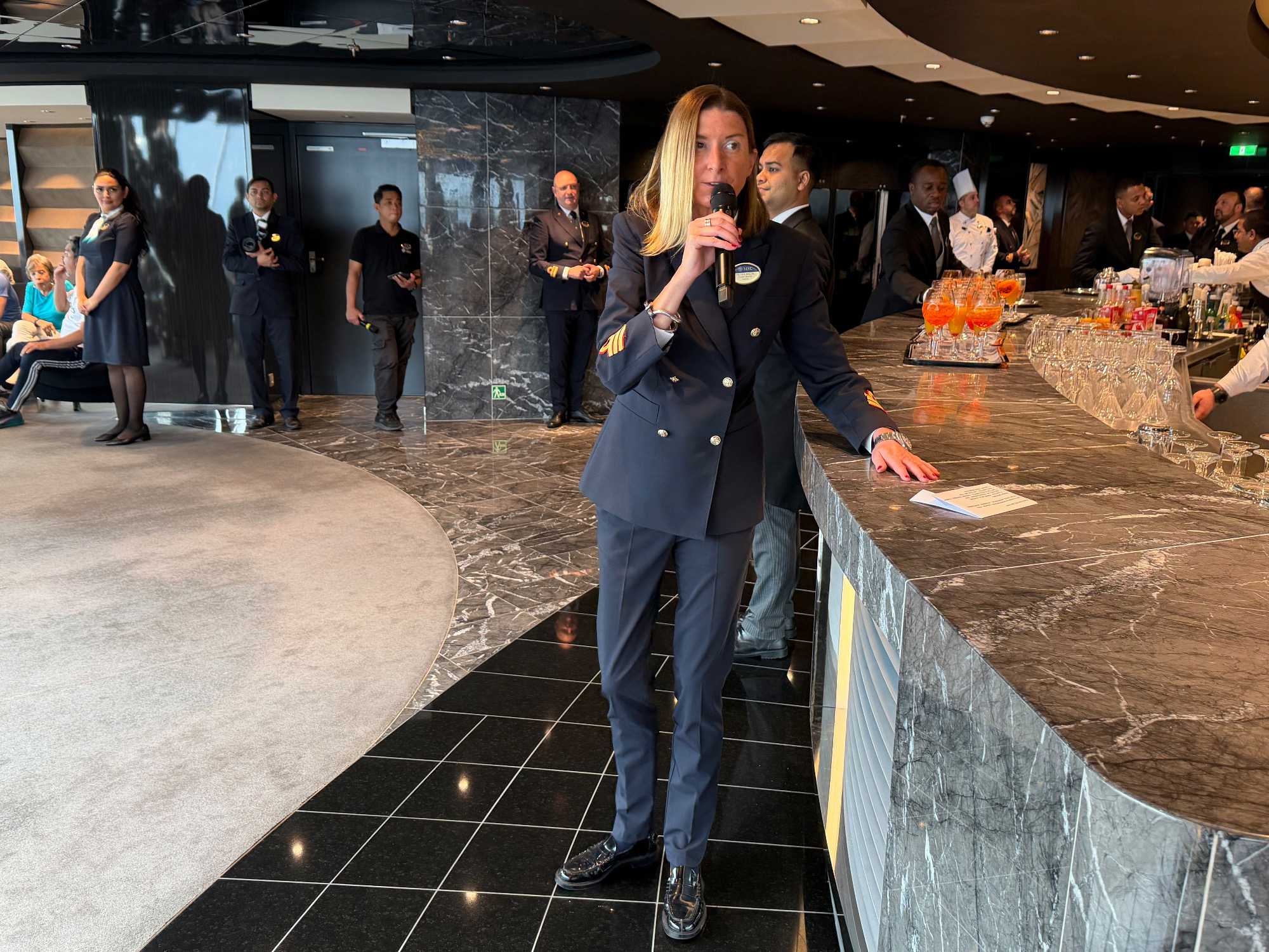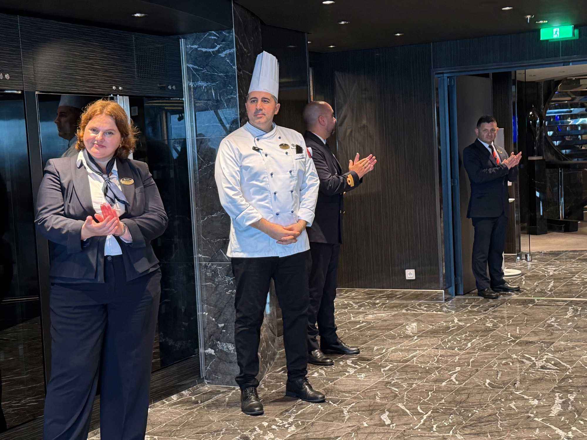 L’événement se tenait dans le superbe salon privé, décoré avec élégance, où tout le personnel du Yacht Club est venu se présenter. Le commandant du navire lui-même est passé nous saluer, sourire aux lèvres, pour nous souhaiter la bienvenue et souligner sa fierté de nous compter à bord. ⚓👨✈️Ce fut un moment de grande classe, ponctué de musique, de canapés raffinés, et bien sûr de boissons à volonté servies avec art. Tous les Butlers, se démarquaient par leur gentillesse, leur humour et leur attention constante : ils veillaient à ce que chacun ne manque de rien, toujours présents avec un service impeccable. 🍸💫 on les adore ces Butlers, et en plus ils sont au moins cinq à parler français. Même le capitaine ce matin nous a parlé en français. Un autre point positif, le français à bord est omniprésent. Les menus à la salle à manger, les journaux de bord, le service concierge de notre Yacht Club avec deux personnes pouvant nous répondre en français. Incroyable!