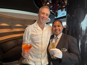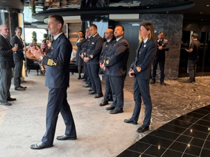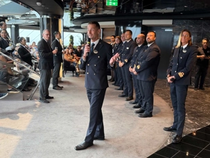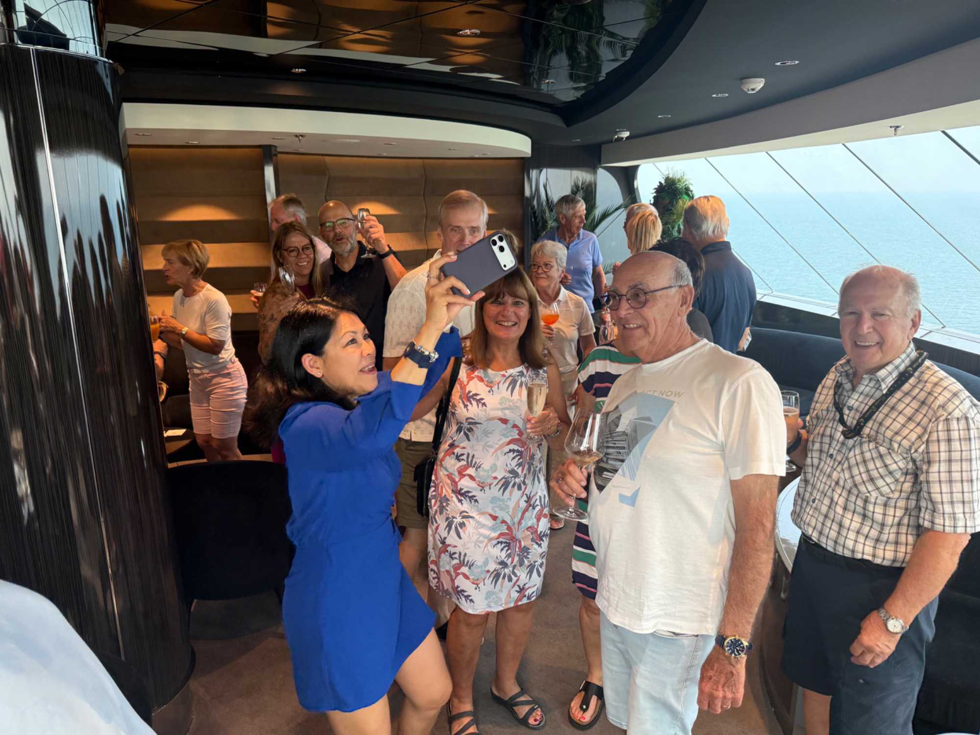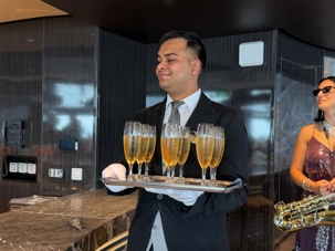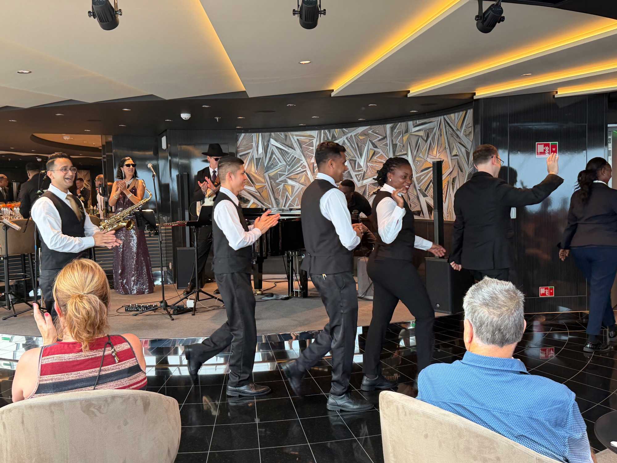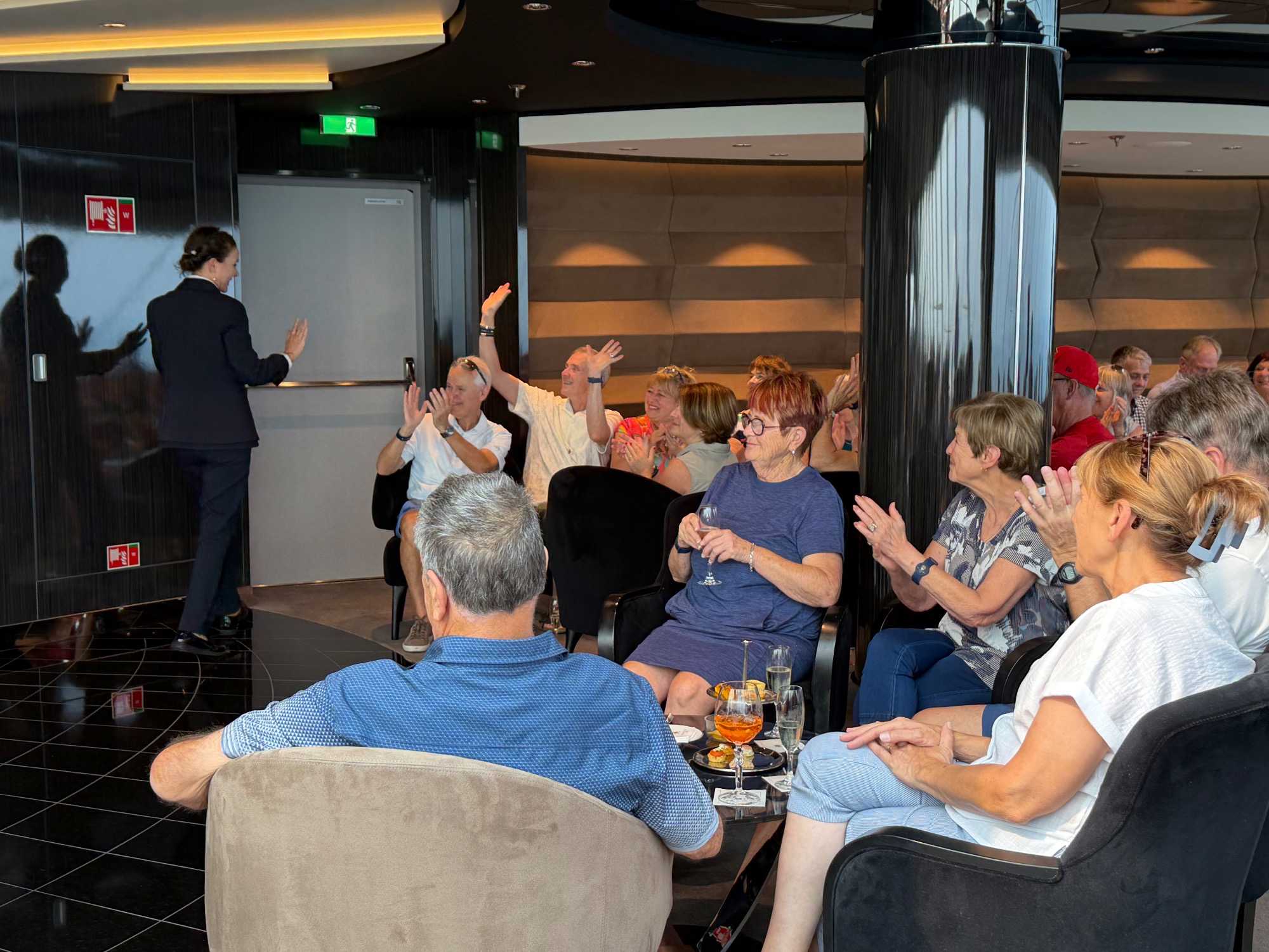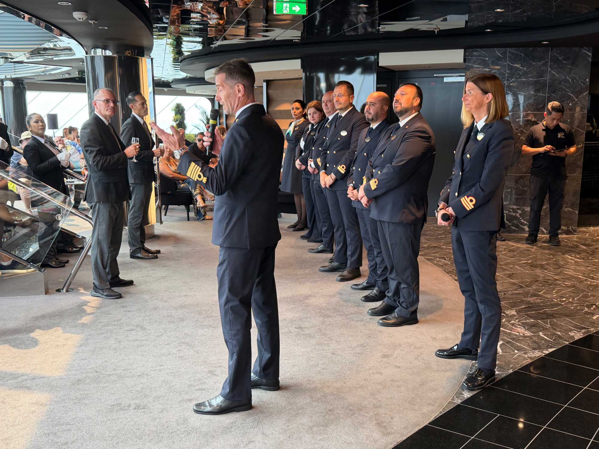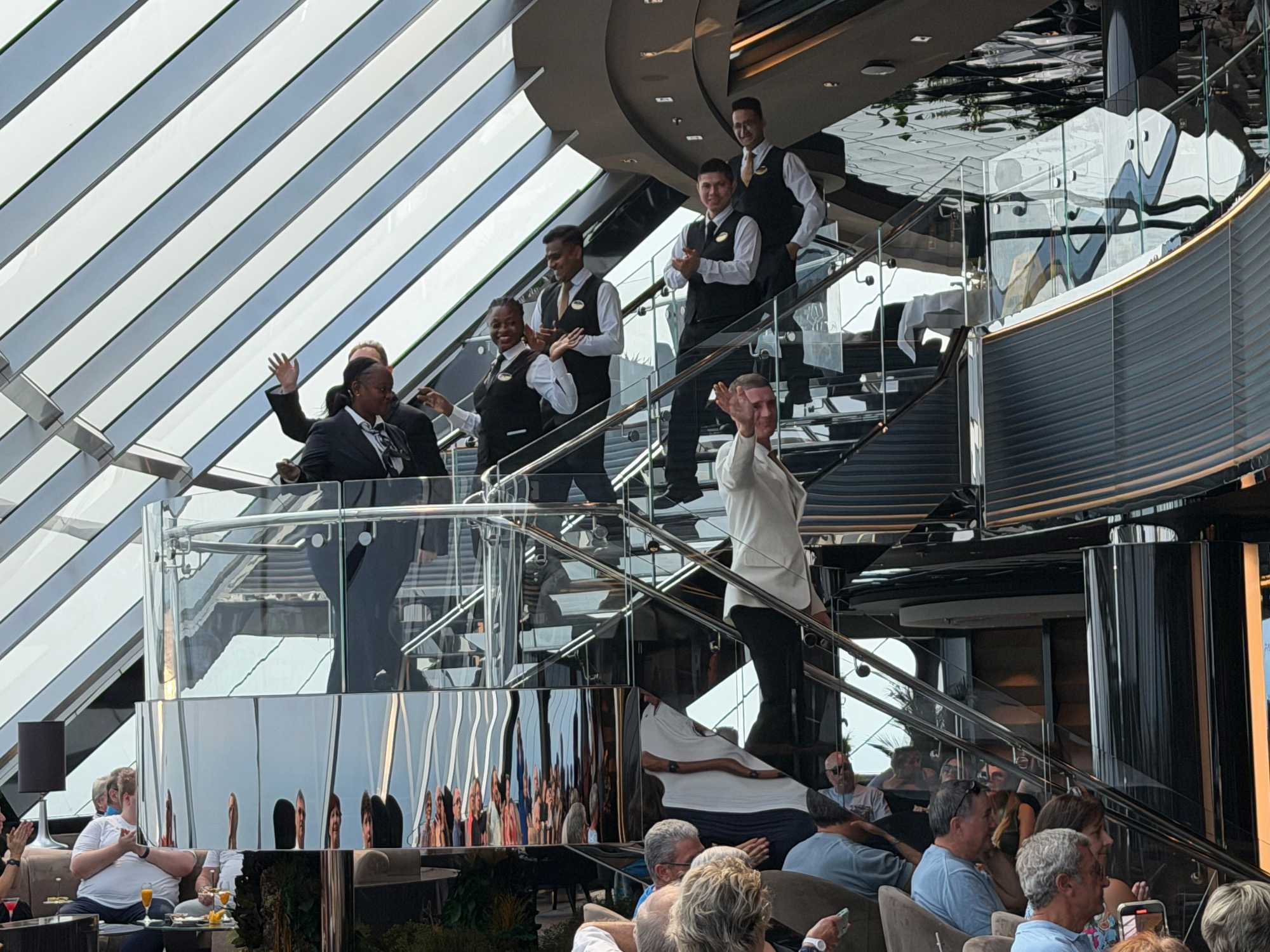 L’événement se tenait dans le superbe salon privé, décoré avec élégance, où tout le personnel du Yacht Club est venu se présenter. Le commandant du navire lui-même est passé nous saluer, sourire aux lèvres, pour nous souhaiter la bienvenue et souligner sa fierté de nous compter à bord. ⚓👨✈️Ce fut un moment de grande classe, ponctué de musique, de canapés raffinés, et bien sûr de boissons à volonté servies avec art. Tous les Butlers, se démarquaient par leur gentillesse, leur humour et leur attention constante : ils veillaient à ce que chacun ne manque de rien, toujours présents avec un service impeccable. 🍸💫 on les adore ces Butlers, et en plus ils sont au moins cinq à parler français. Même le capitaine ce matin nous a parlé en français. Un autre point positif, le français à bord est omniprésent. Les menus à la salle à manger, les journaux de bord, le service concierge de notre Yacht Club avec deux personnes pouvant nous répondre en français. Incroyable!