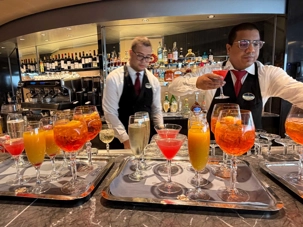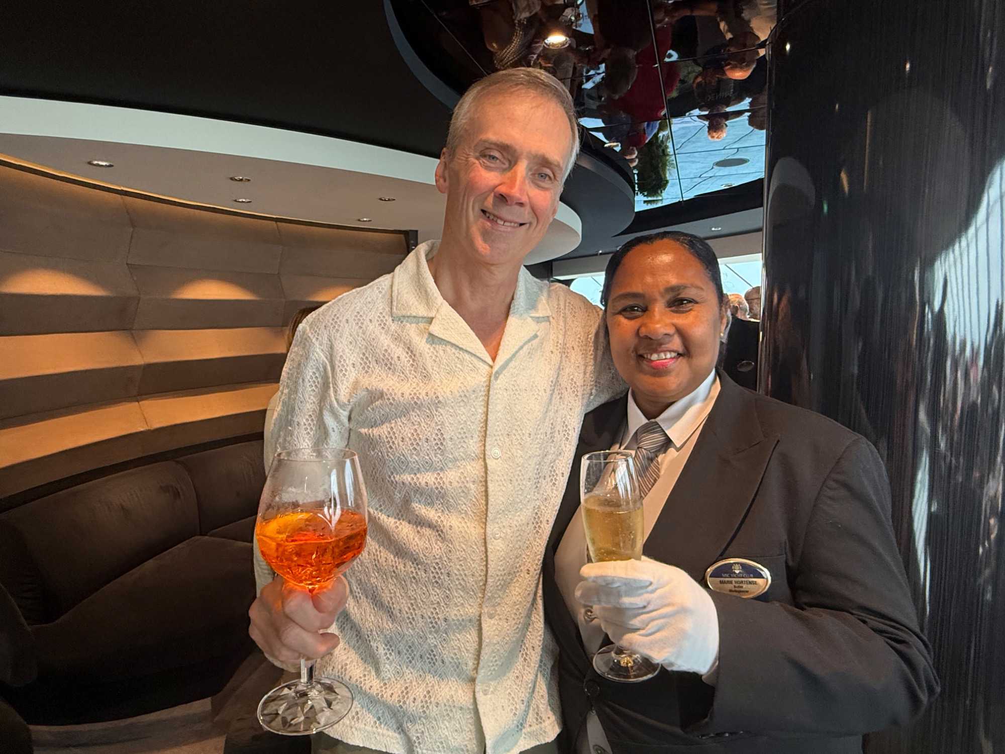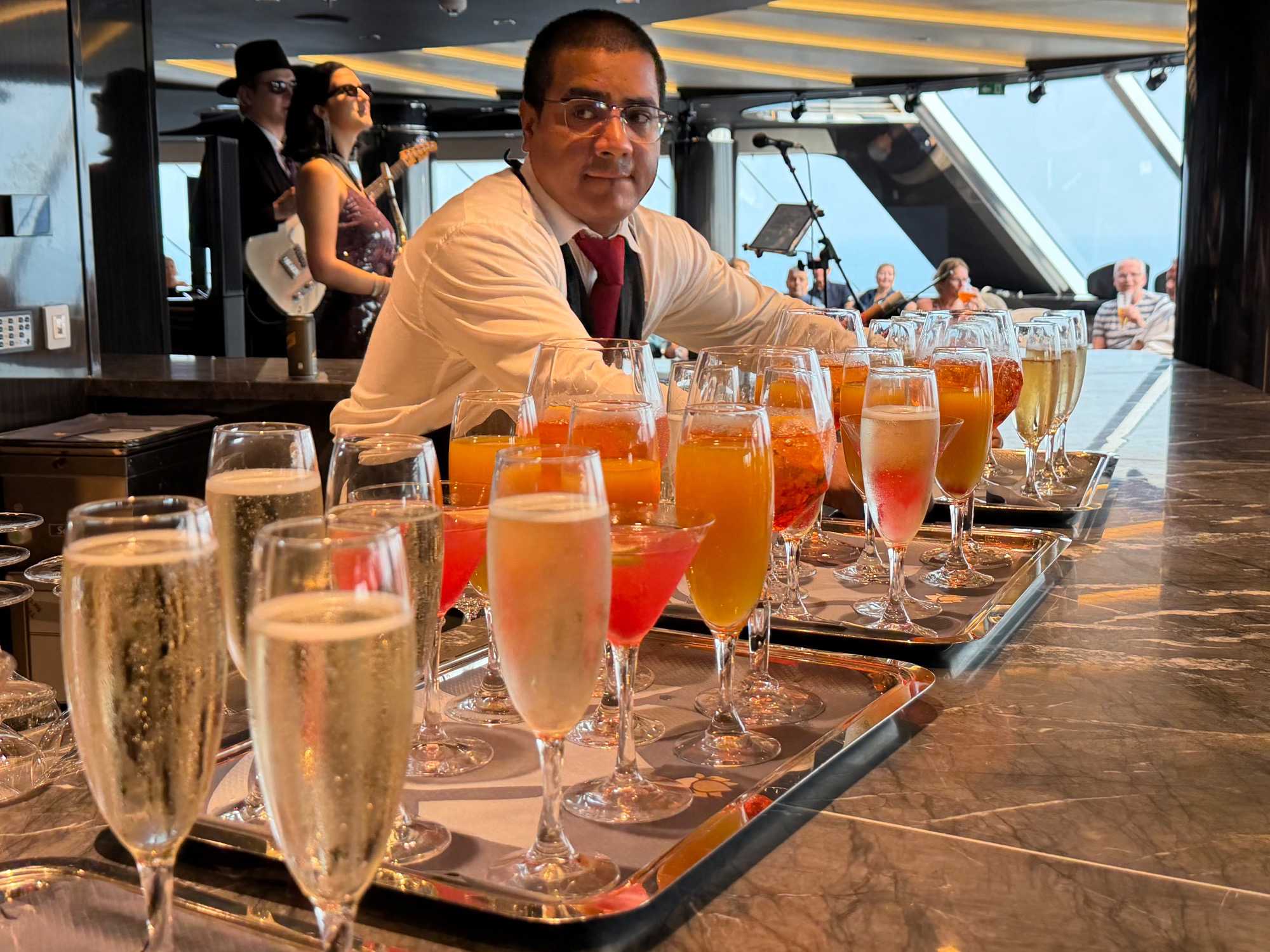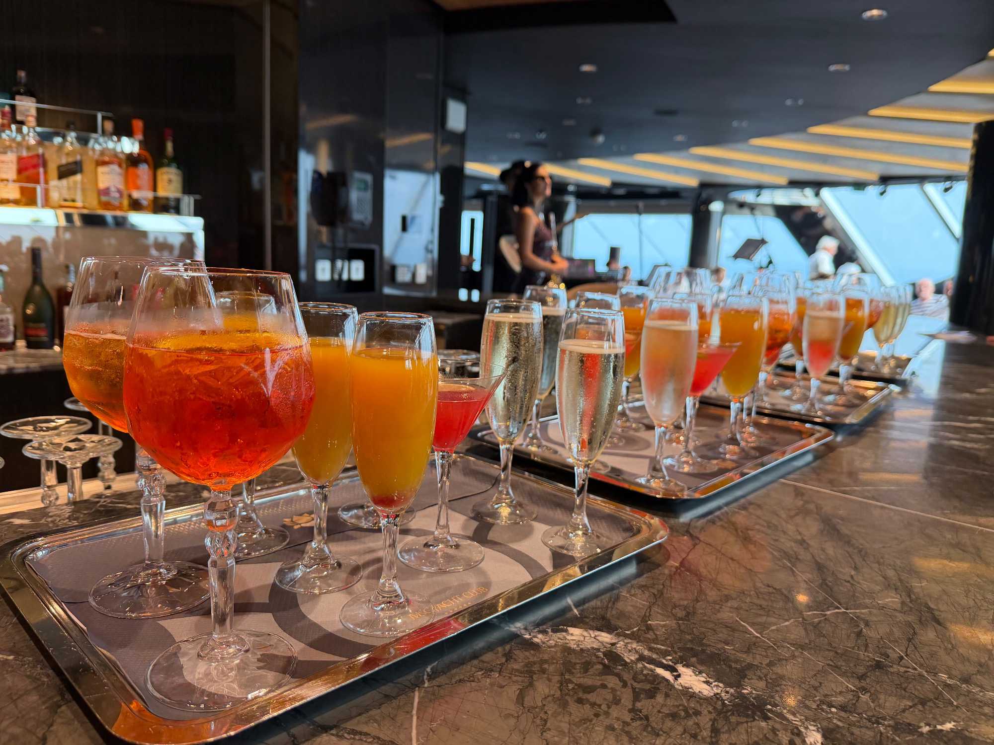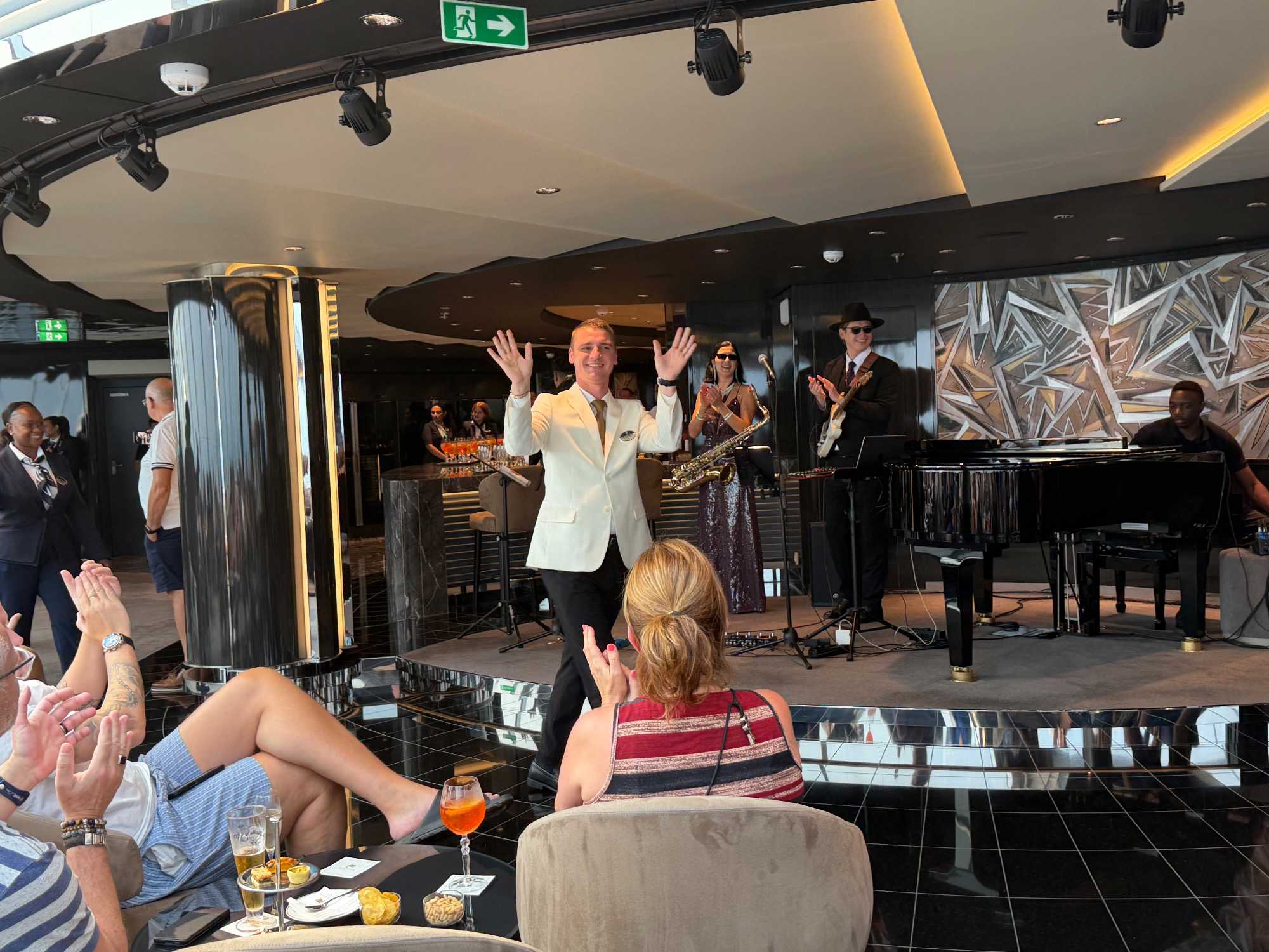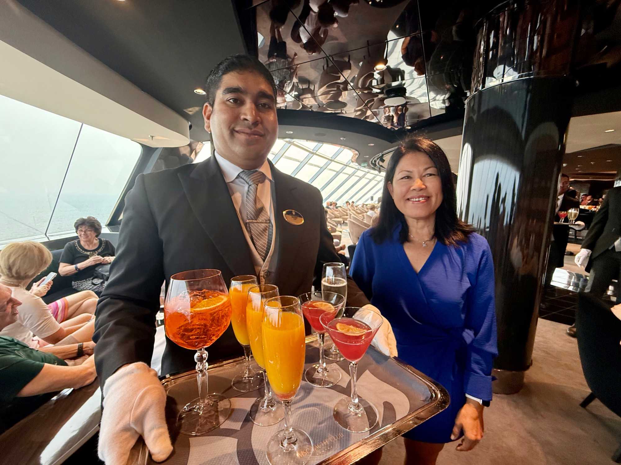 L’événement se tenait dans le superbe salon privé, décoré avec élégance, où tout le personnel du Yacht Club est venu se présenter. Le commandant du navire lui-même est passé nous saluer, sourire aux lèvres, pour nous souhaiter la bienvenue et souligner sa fierté de nous compter à bord. ⚓👨✈️Ce fut un moment de grande classe, ponctué de musique, de canapés raffinés, et bien sûr de boissons à volonté servies avec art. Tous les Butlers, se démarquaient par leur gentillesse, leur humour et leur attention constante : ils veillaient à ce que chacun ne manque de rien, toujours présents avec un service impeccable. 🍸💫 on les adore ces Butlers, et en plus ils sont au moins cinq à parler français. Même le capitaine ce matin nous a parlé en français. Un autre point positif, le français à bord est omniprésent. Les menus à la salle à manger, les journaux de bord, le service concierge de notre Yacht Club avec deux personnes pouvant nous répondre en français. Incroyable!