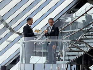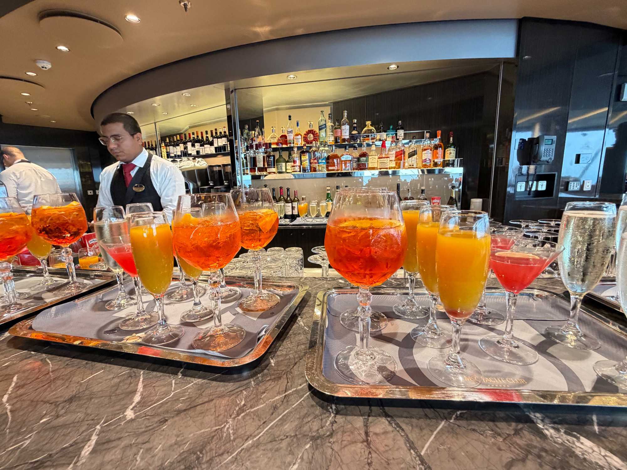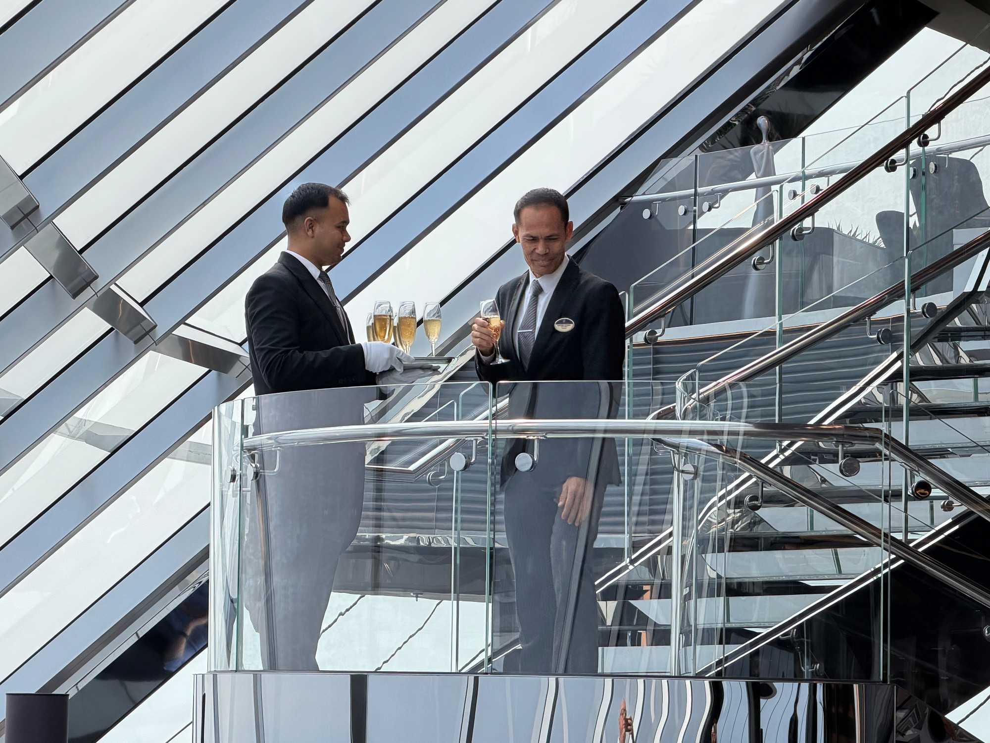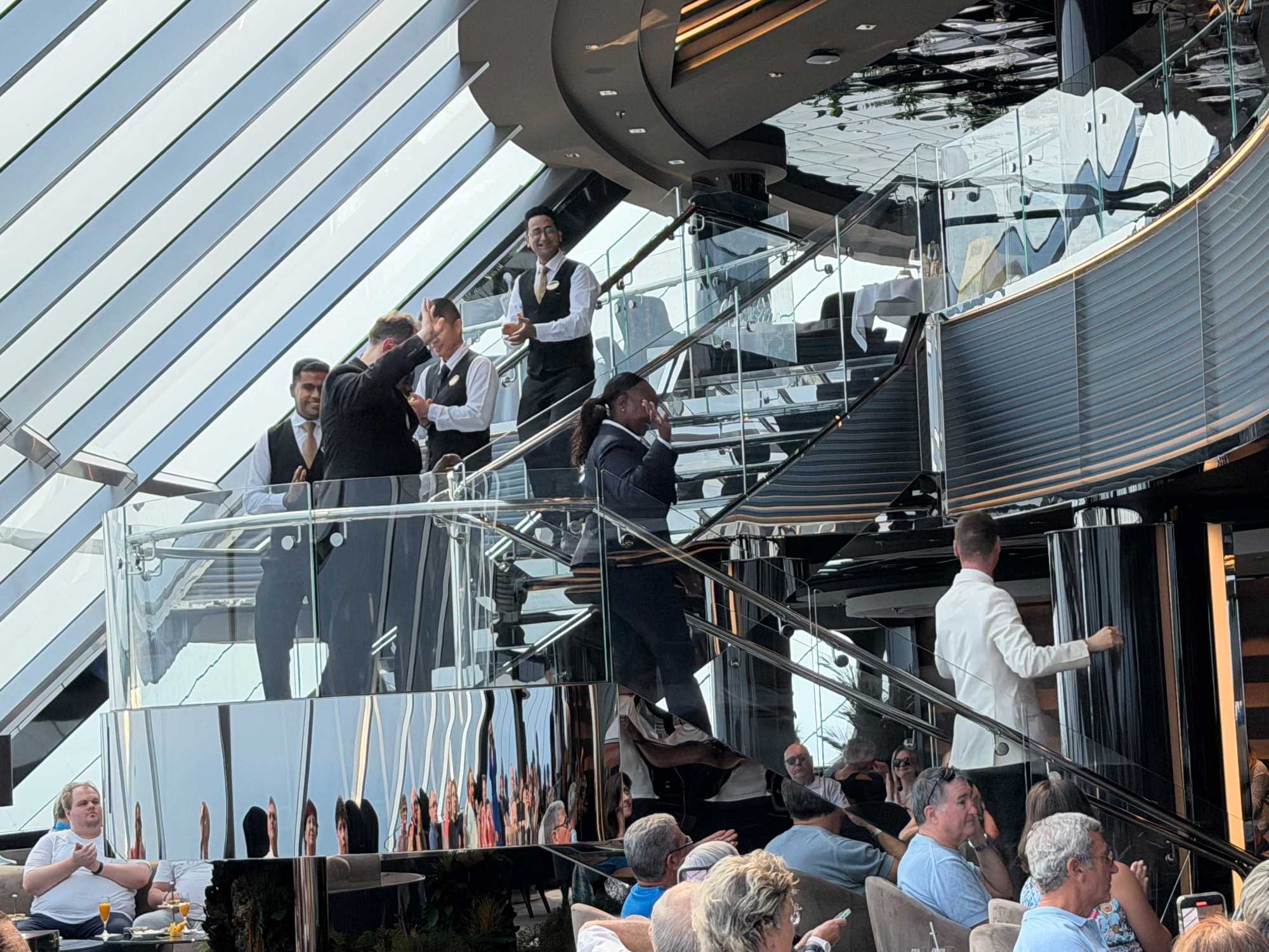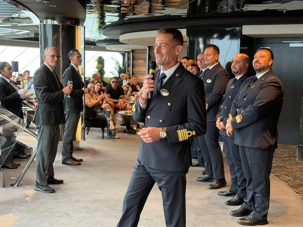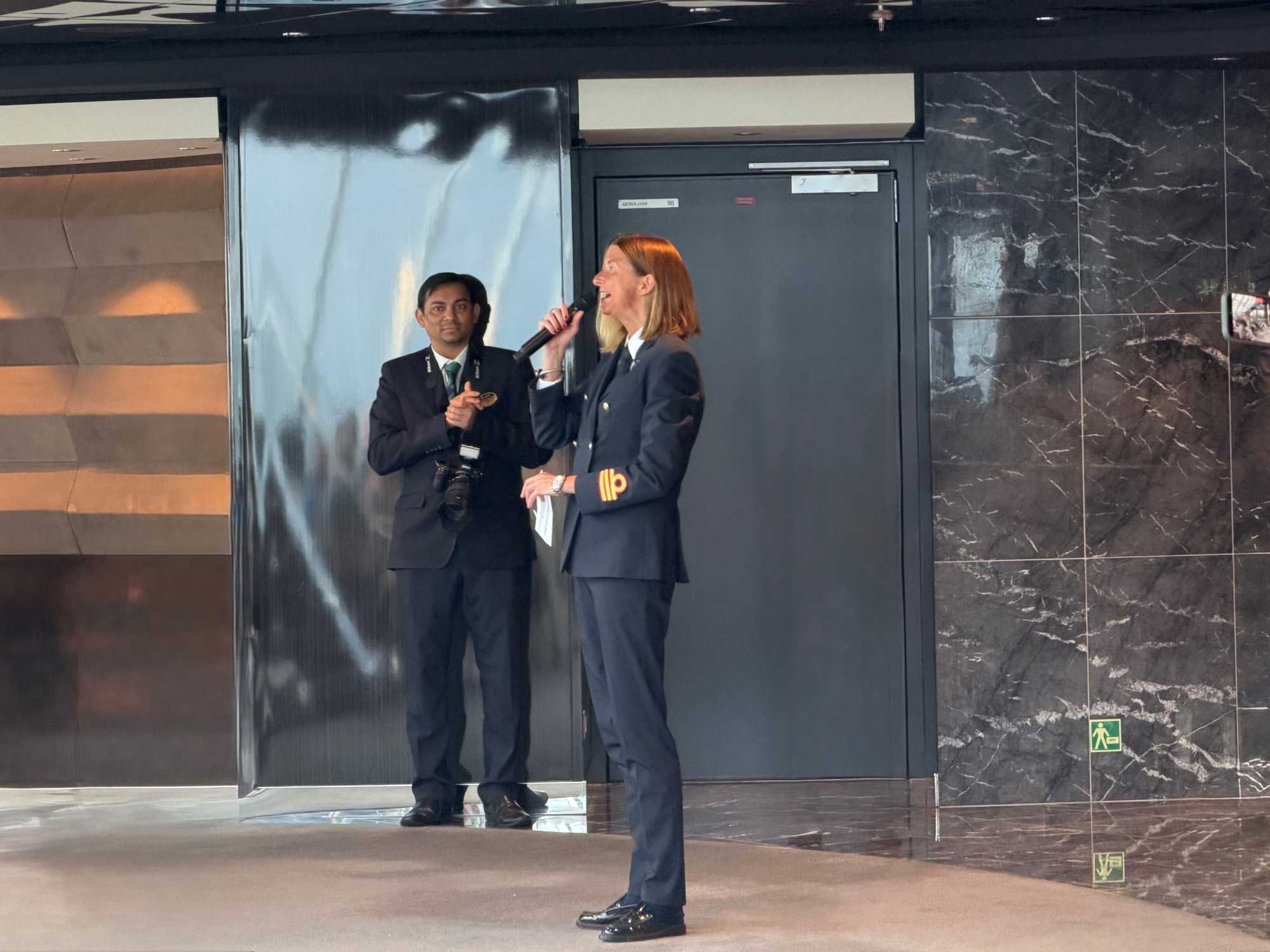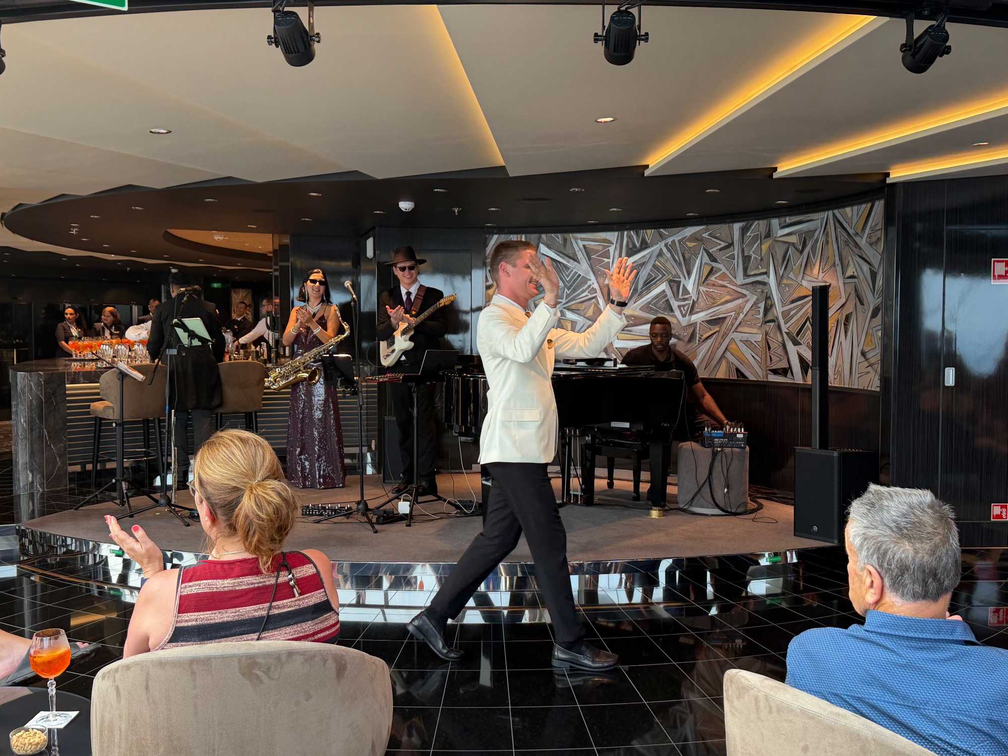 L’événement se tenait dans le superbe salon privé, décoré avec élégance, où tout le personnel du Yacht Club est venu se présenter. Le commandant du navire lui-même est passé nous saluer, sourire aux lèvres, pour nous souhaiter la bienvenue et souligner sa fierté de nous compter à bord. ⚓👨✈️Ce fut un moment de grande classe, ponctué de musique, de canapés raffinés, et bien sûr de boissons à volonté servies avec art. Tous les Butlers, se démarquaient par leur gentillesse, leur humour et leur attention constante : ils veillaient à ce que chacun ne manque de rien, toujours présents avec un service impeccable. 🍸💫 on les adore ces Butlers, et en plus ils sont au moins cinq à parler français. Même le capitaine ce matin nous a parlé en français. Un autre point positif, le français à bord est omniprésent. Les menus à la salle à manger, les journaux de bord, le service concierge de notre Yacht Club avec deux personnes pouvant nous répondre en français. Incroyable!