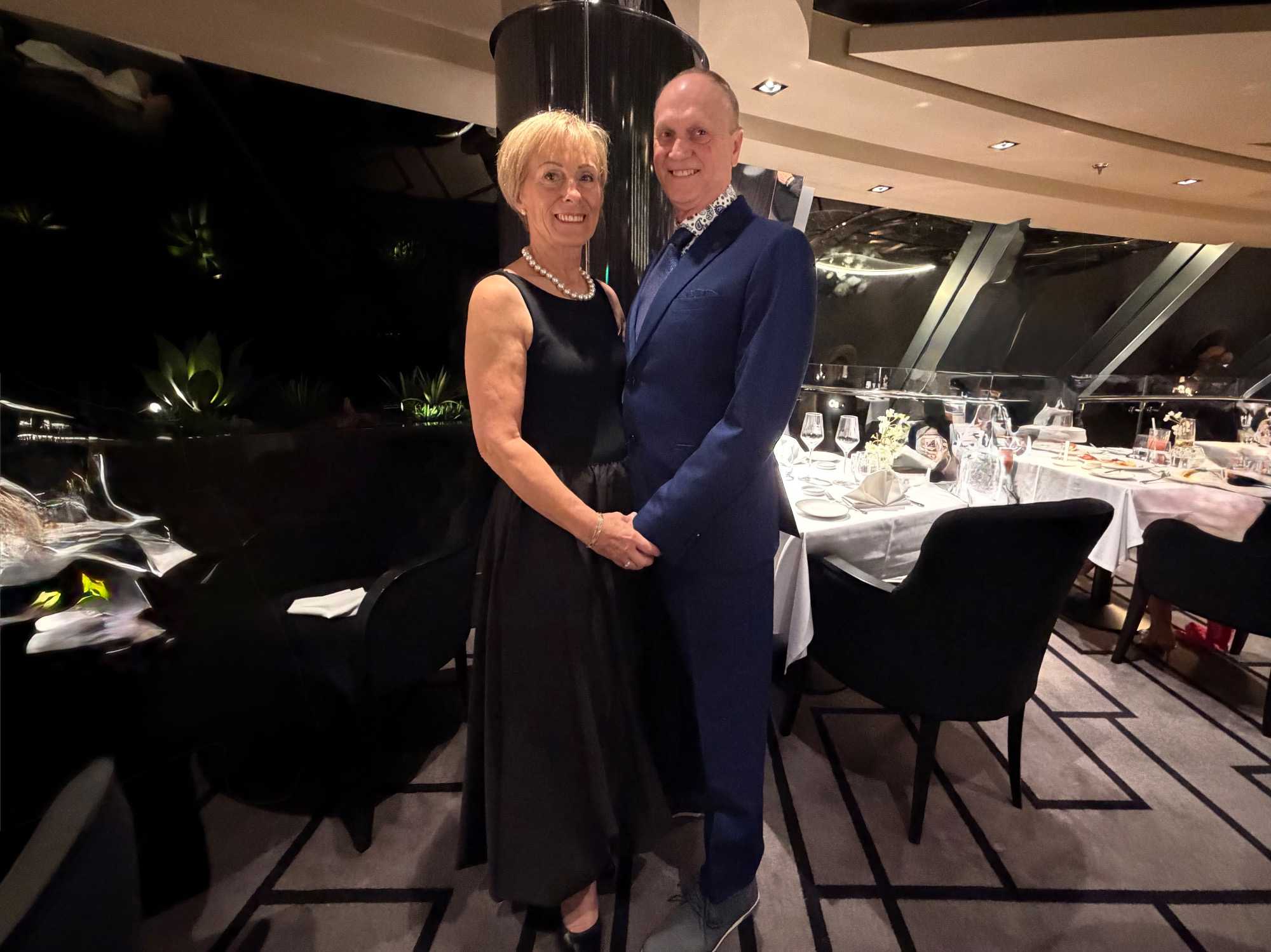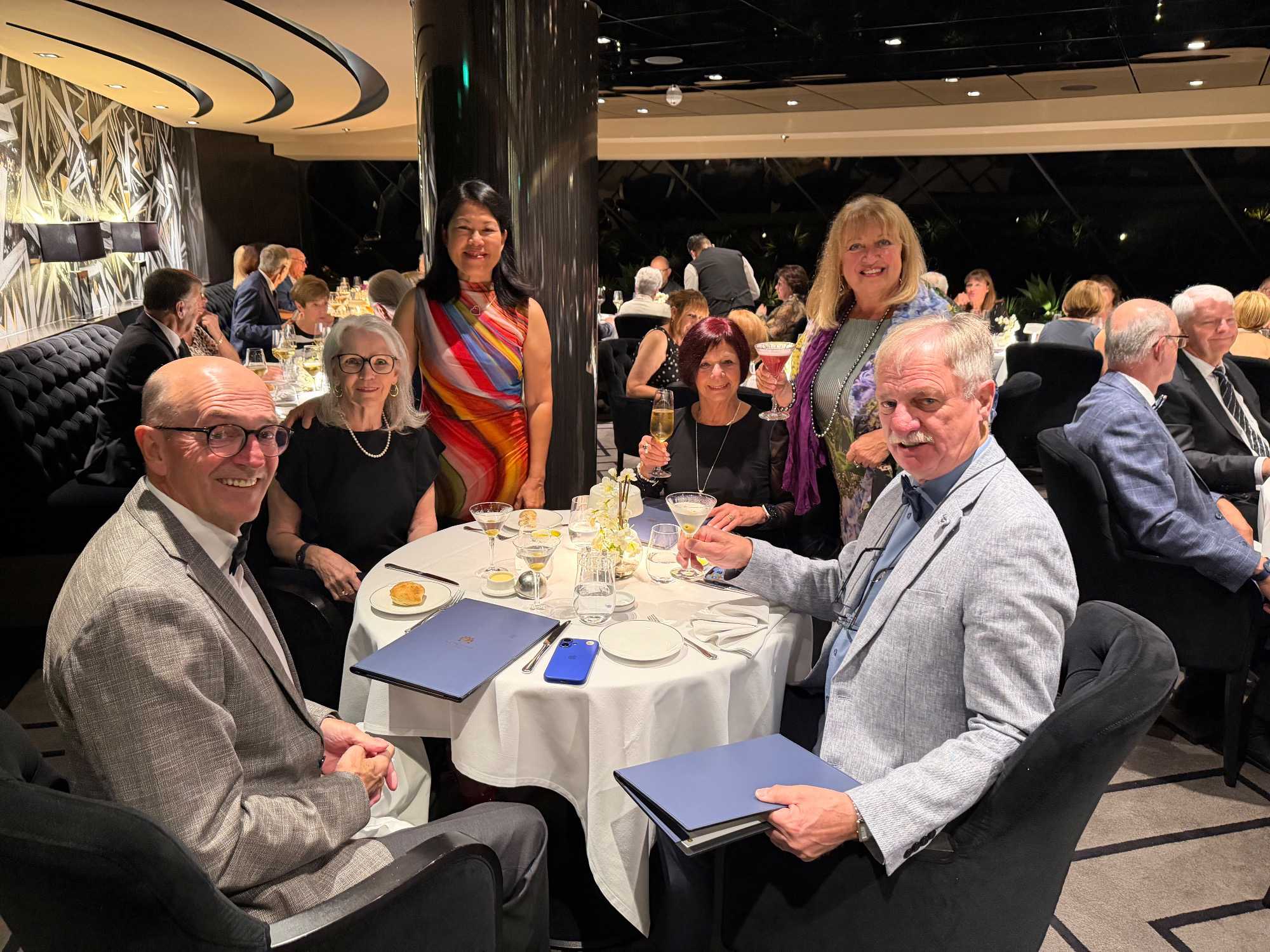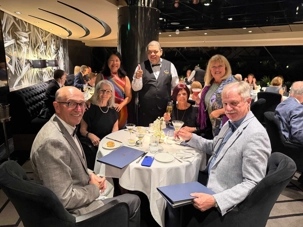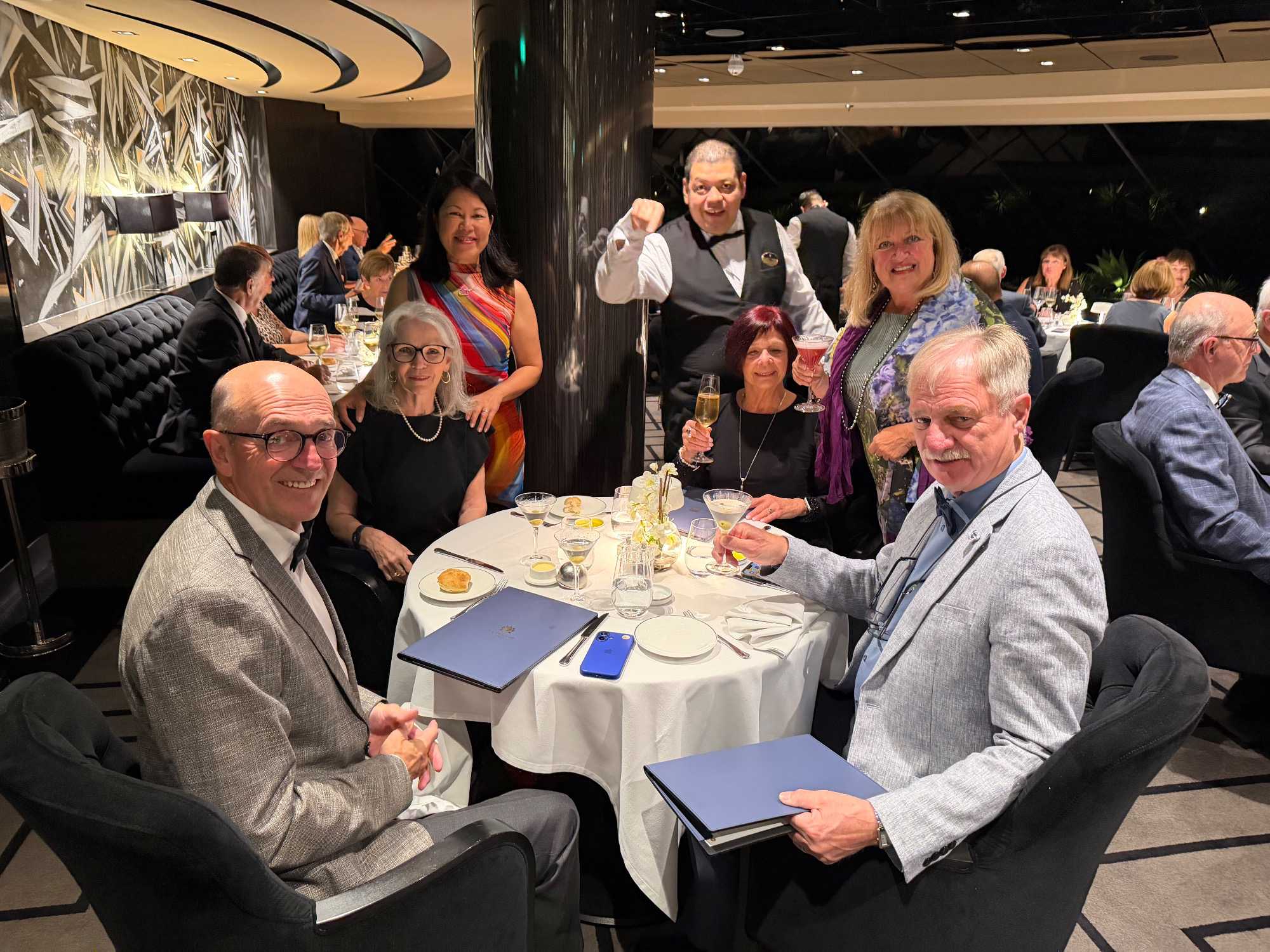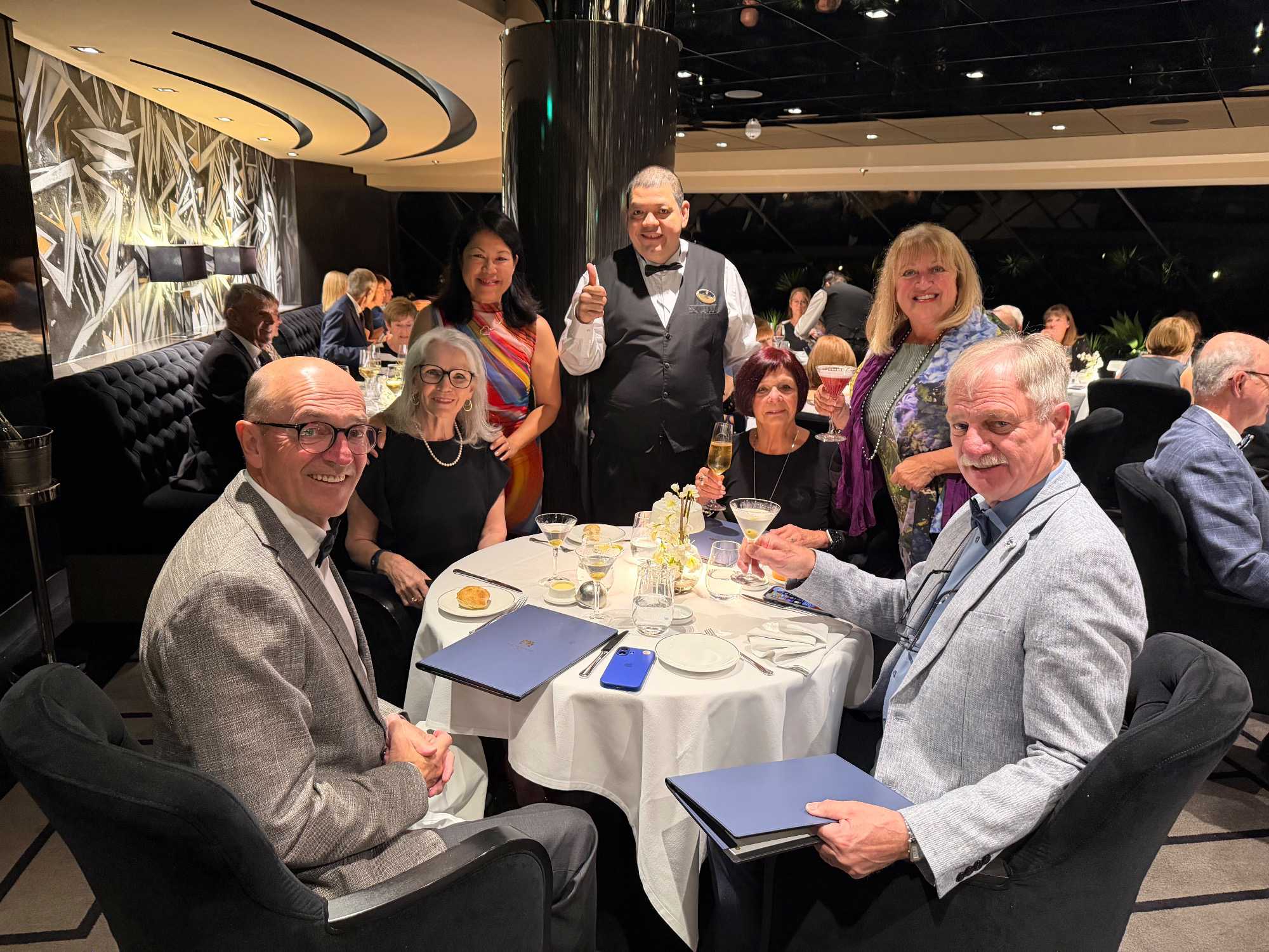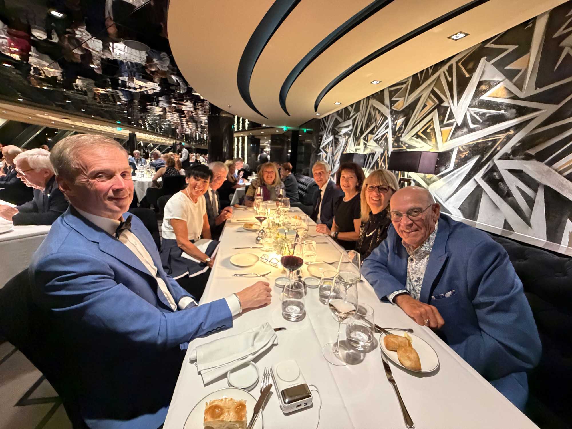 Tous les voyageurs avaient revêtu leurs plus élégantes tenues : robes scintillantes, vestons impeccables et sourires radieux. 👗🤵Nos tables réservées pour cette occasion ajoutaient une touche d’exclusivité à cette belle soirée. Le dîner fut à la hauteur de l’événement : mets raffinés, vins soigneusement choisis, service attentionné. 🍷🍽️ La musique, les rires et les conversations ont accompagné cette belle soirée placée sous le signe de l’élégance et de la convivialité.