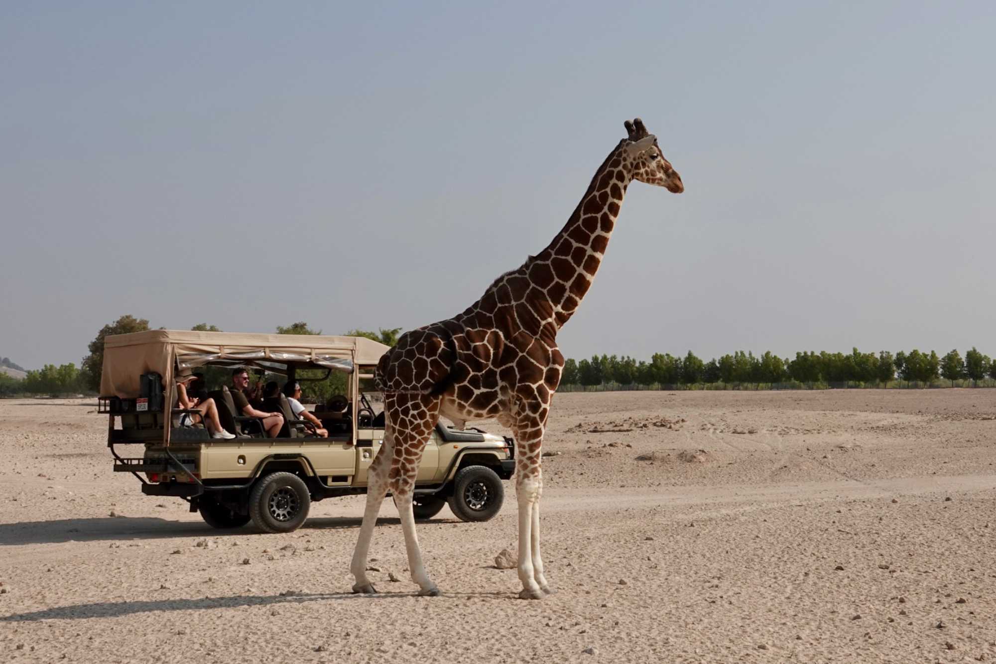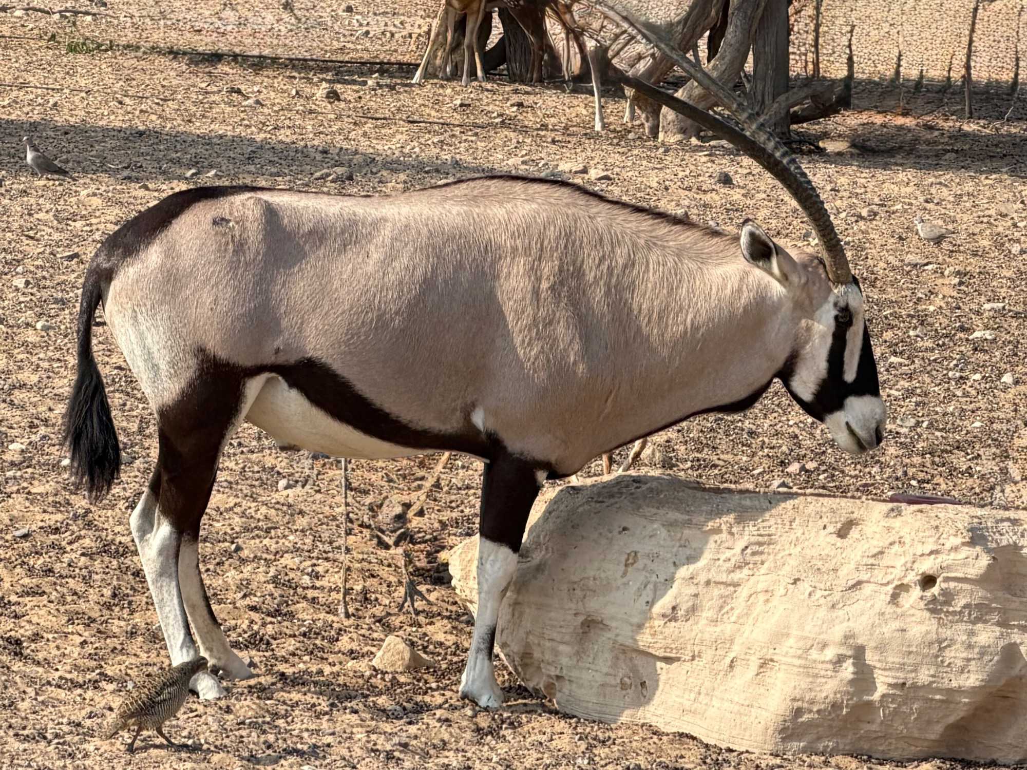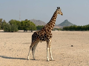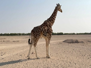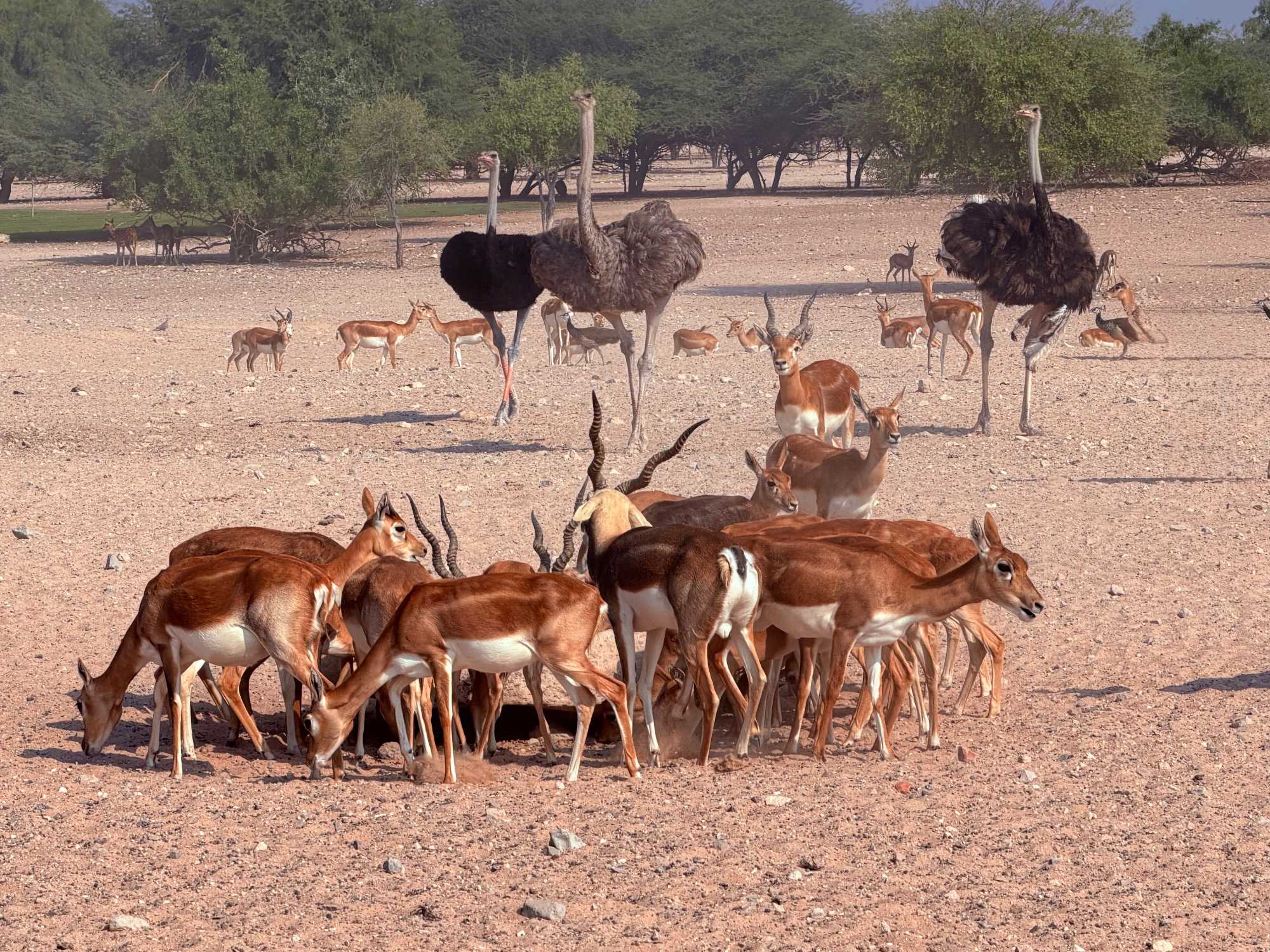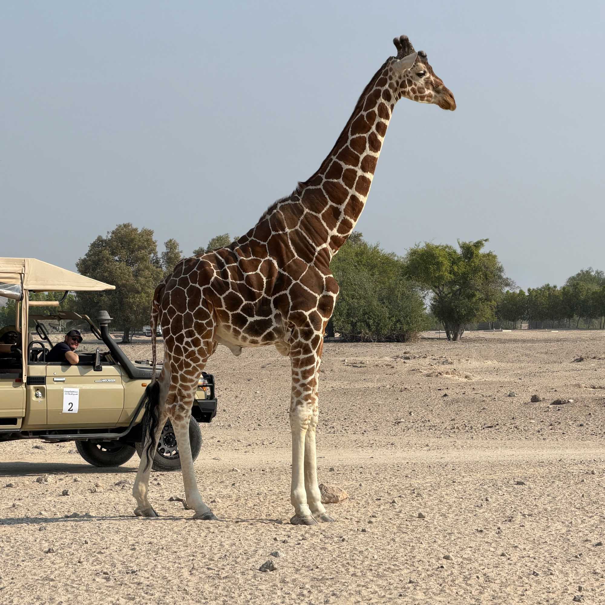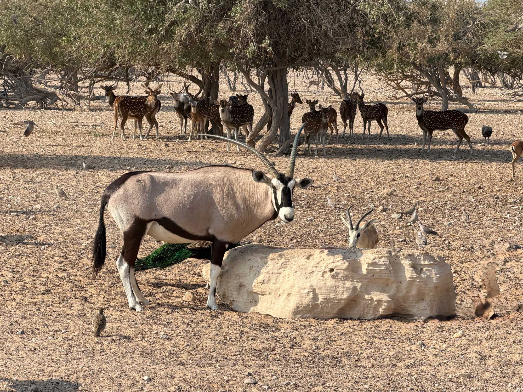 Arrivés au lieu de départ, trois jeeps de safari nous attendaient, chacune avec son guide. Nous avons embarqué pour un tour d’environ une heure et demie au cœur de cette île si particulière. Sir Bani Yas n’est pas un simple lieu touristique : c’est une réserve naturelle née de la vision incroyable du Sheikh Zayed, fondateur des Émirats arabes unis, qui rêvait de créer ici un sanctuaire pour la faune en danger. Au fil du safari, nous avons été plongés dans cette vision : girafes, oryx d’Arabie, gazelles, autruches… Les animaux traversaient notre chemin en toute liberté, parfaitement chez eux. Le guide expliquait l’histoire de l’île, les efforts de conservation et les différentes espèces que nous apercevions. Pour ma part, j’étais accompagnée d’un guide originaire du Ghana, Charles, un homme absolument charmant, drôle et attachant. Ses petites chansons, son humour chaleureux et son regard passionné sur la nature ont rendu cette balade encore plus magique.