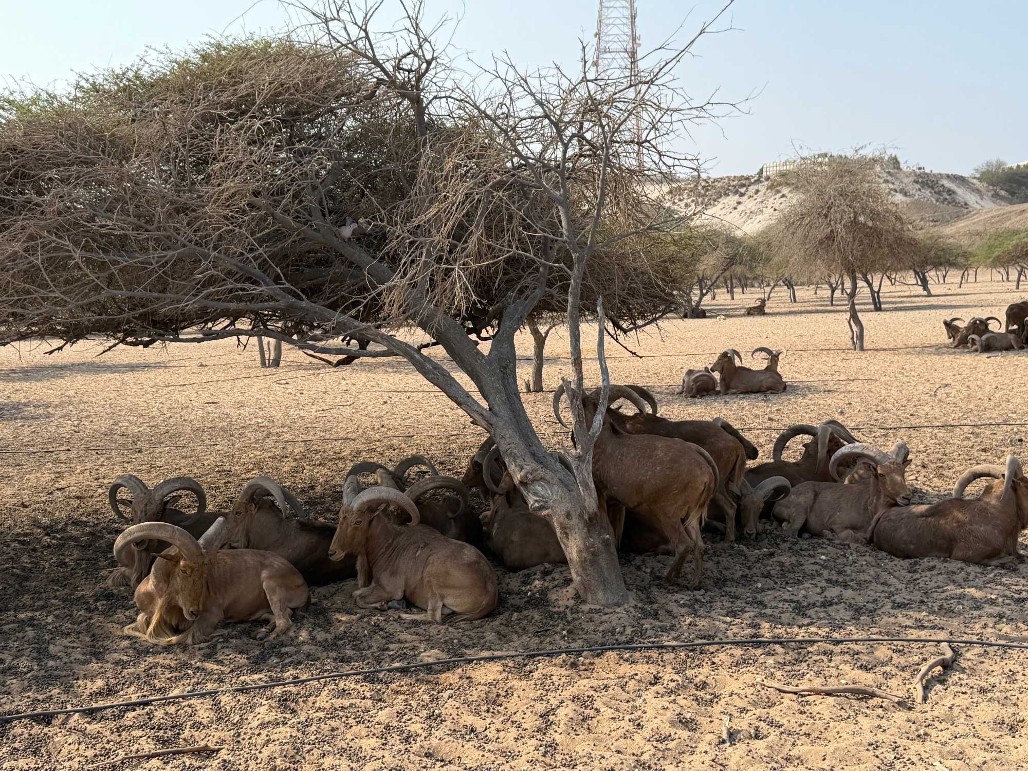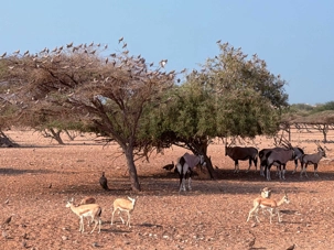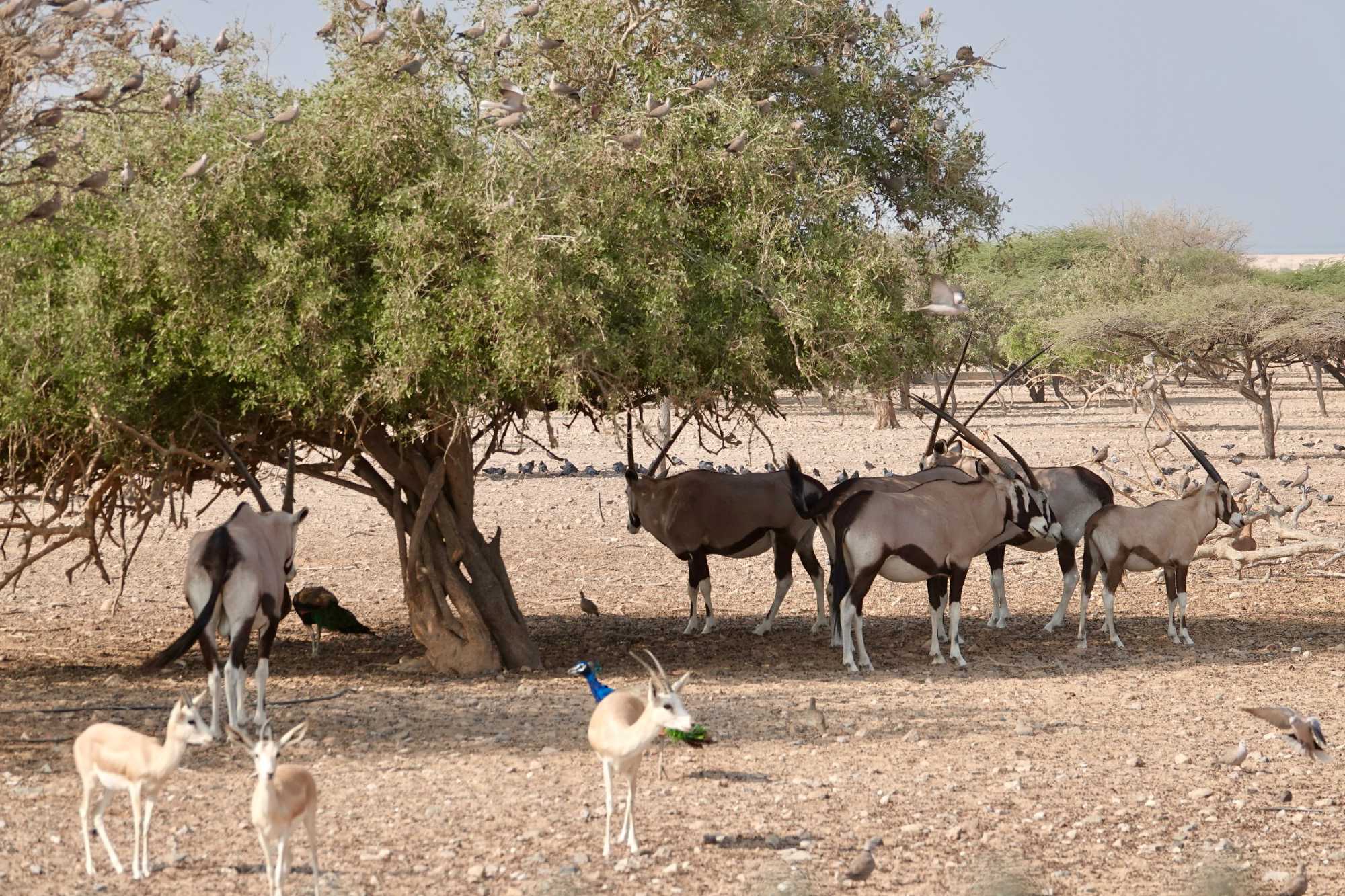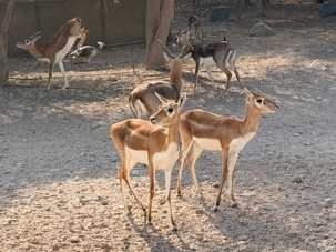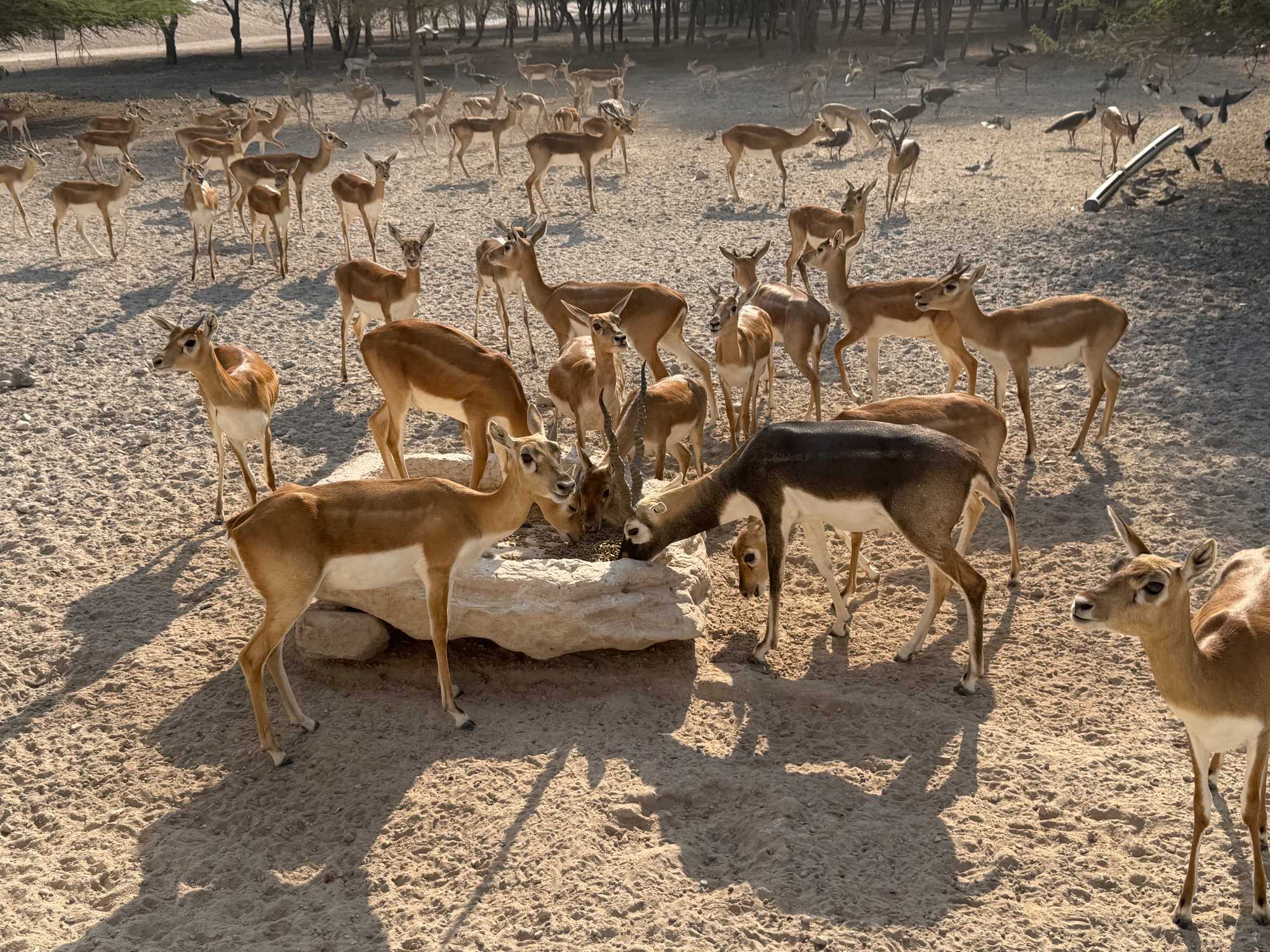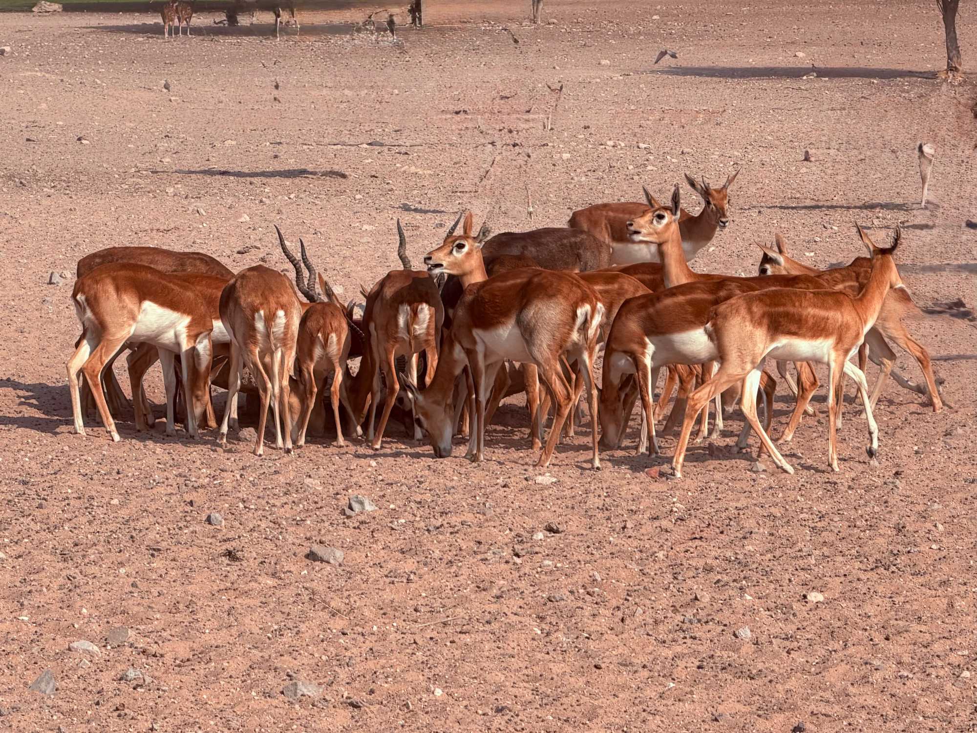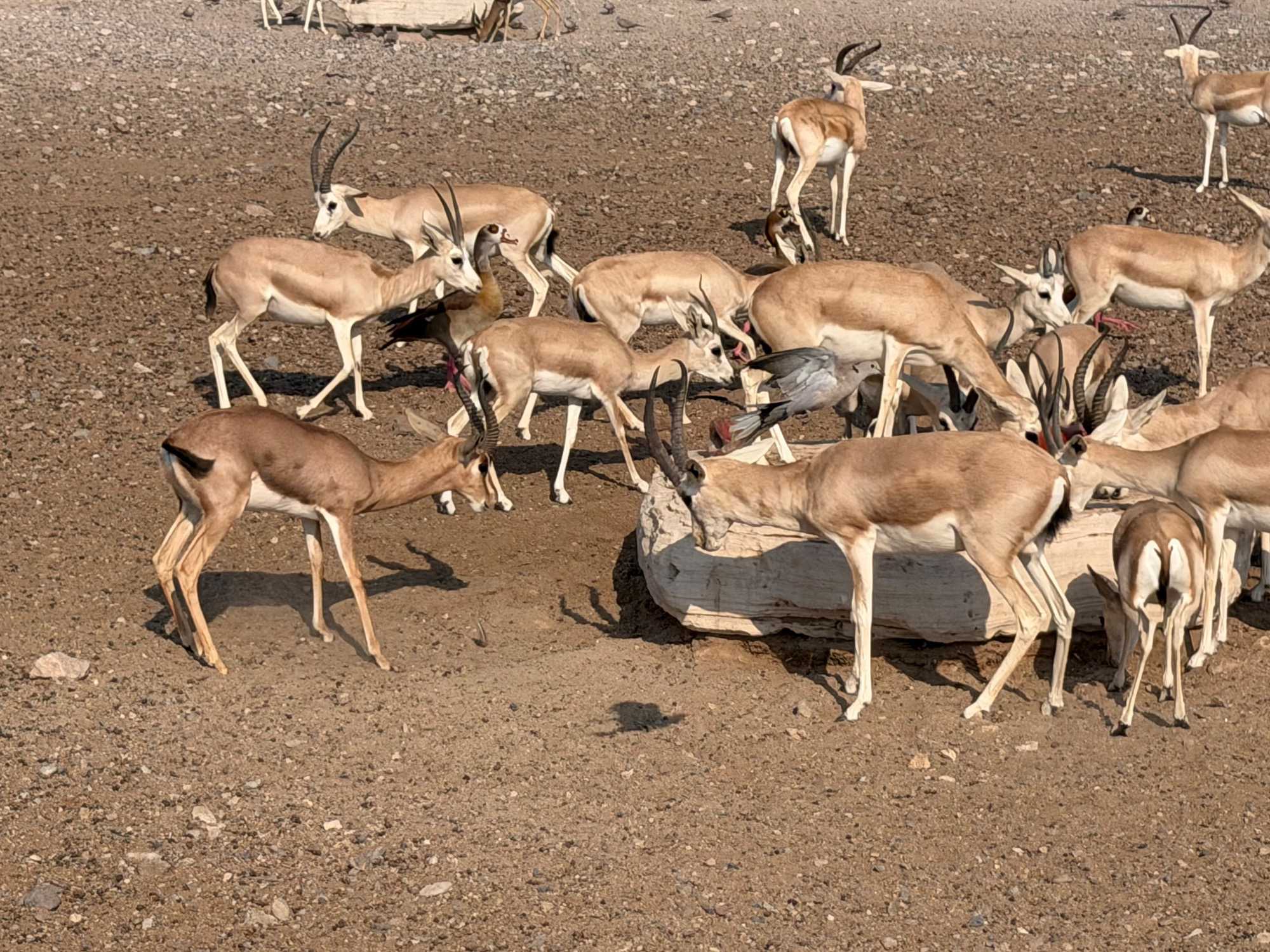 Arrivés au lieu de départ, trois jeeps de safari nous attendaient, chacune avec son guide. Nous avons embarqué pour un tour d’environ une heure et demie au cœur de cette île si particulière. Sir Bani Yas n’est pas un simple lieu touristique : c’est une réserve naturelle née de la vision incroyable du Sheikh Zayed, fondateur des Émirats arabes unis, qui rêvait de créer ici un sanctuaire pour la faune en danger. Au fil du safari, nous avons été plongés dans cette vision : girafes, oryx d’Arabie, gazelles, autruches… Les animaux traversaient notre chemin en toute liberté, parfaitement chez eux. Le guide expliquait l’histoire de l’île, les efforts de conservation et les différentes espèces que nous apercevions. Pour ma part, j’étais accompagnée d’un guide originaire du Ghana, Charles, un homme absolument charmant, drôle et attachant. Ses petites chansons, son humour chaleureux et son regard passionné sur la nature ont rendu cette balade encore plus magique.
