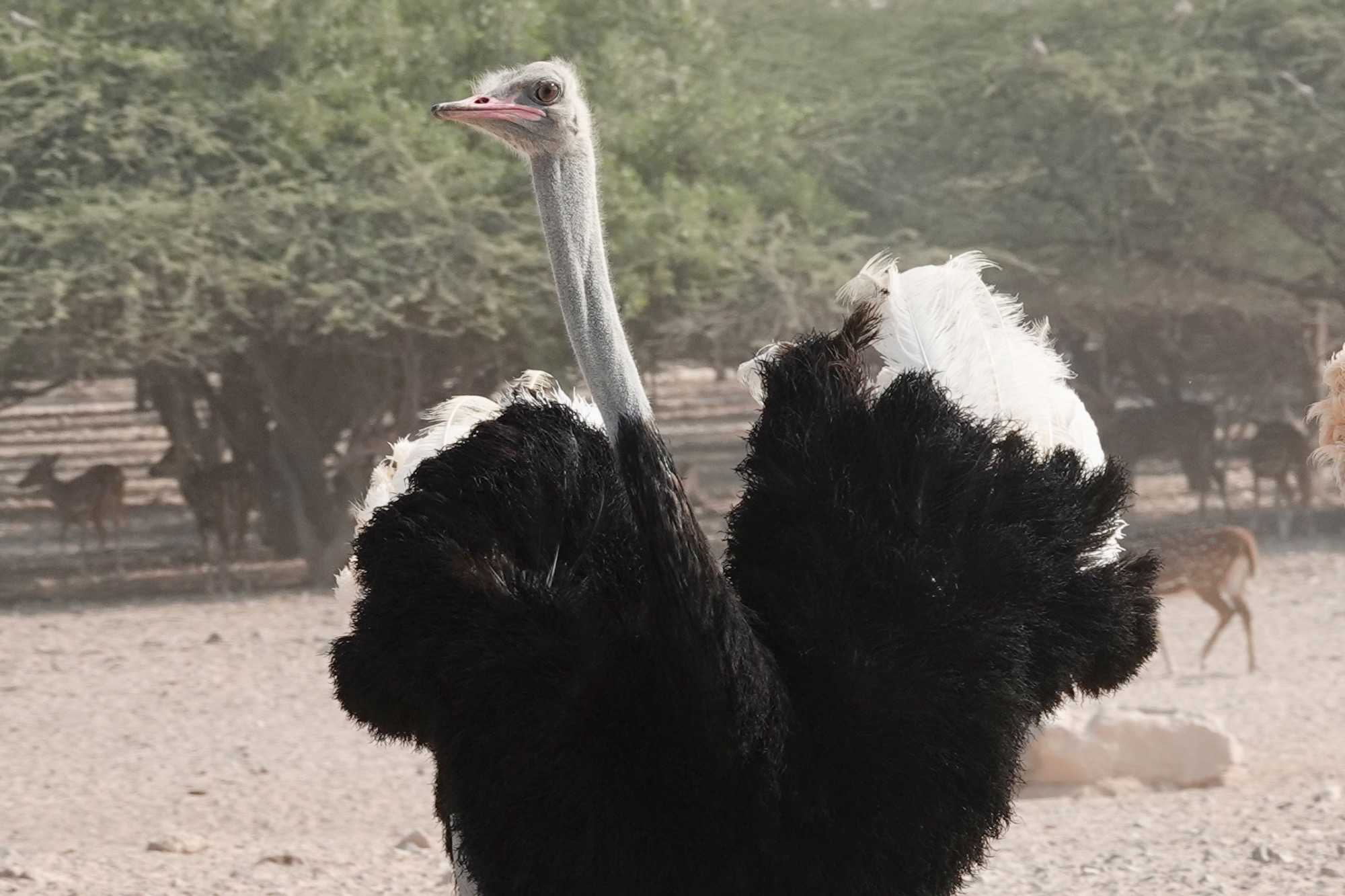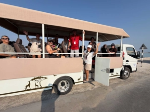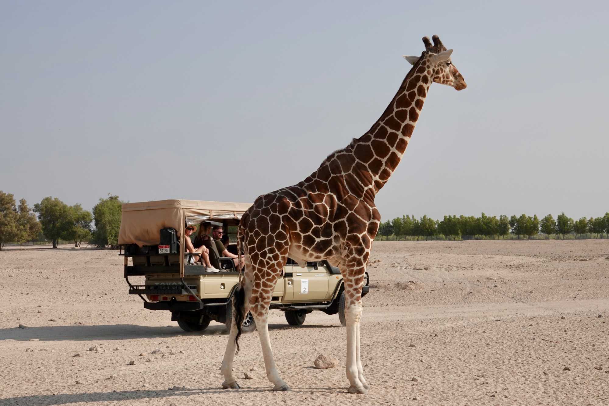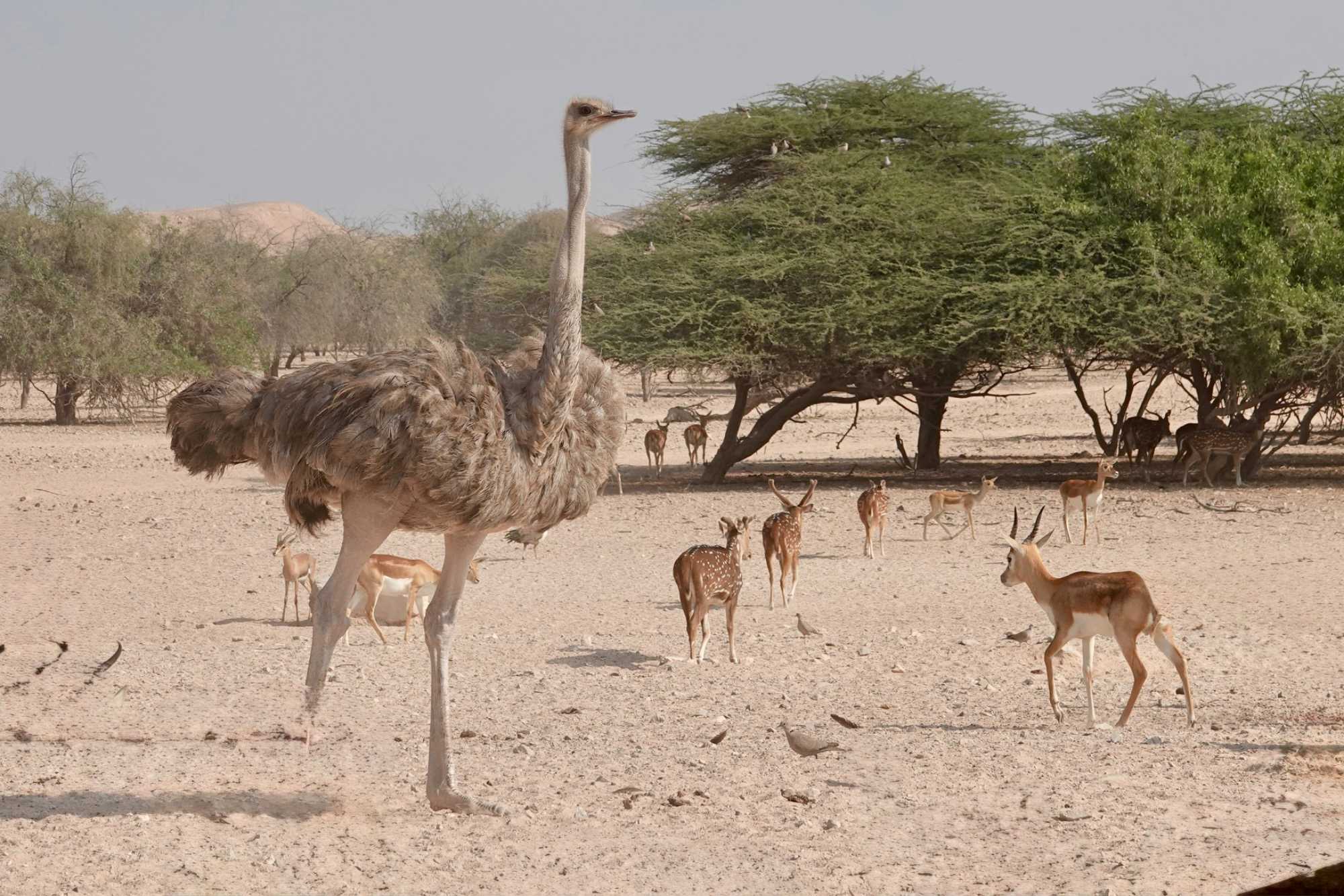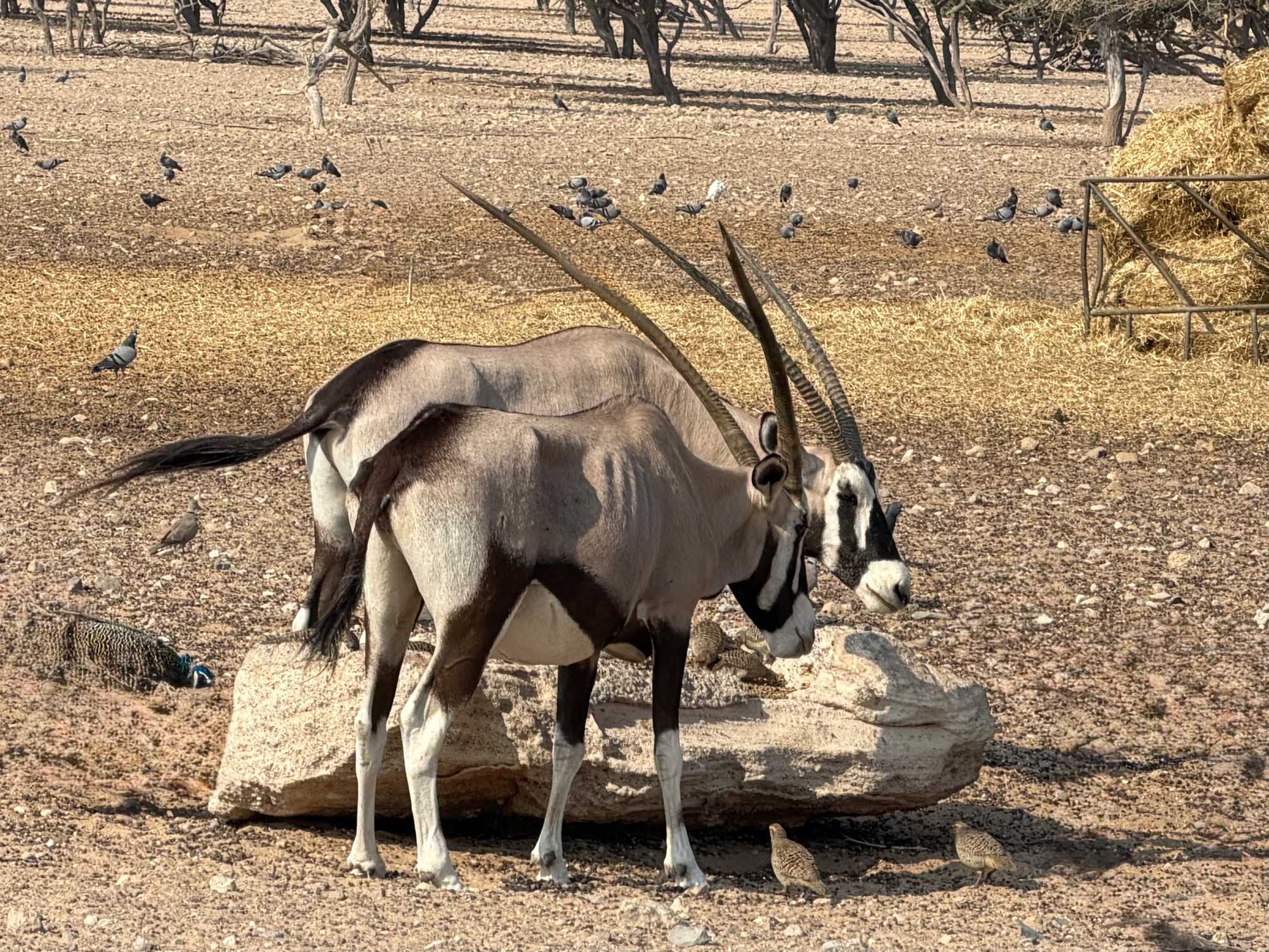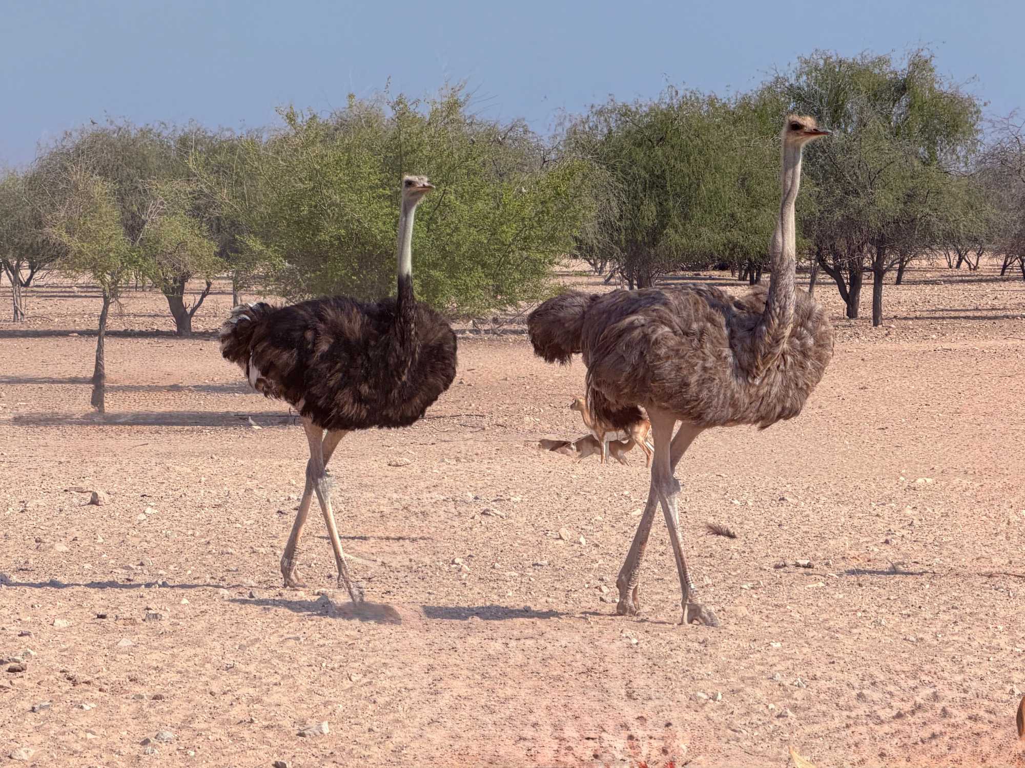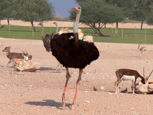 Arrivés au lieu de départ, trois jeeps de safari nous attendaient, chacune avec son guide. Nous avons embarqué pour un tour d’environ une heure et demie au cœur de cette île si particulière. Sir Bani Yas n’est pas un simple lieu touristique : c’est une réserve naturelle née de la vision incroyable du Sheikh Zayed, fondateur des Émirats arabes unis, qui rêvait de créer ici un sanctuaire pour la faune en danger. Au fil du safari, nous avons été plongés dans cette vision : girafes, oryx d’Arabie, gazelles, autruches… Les animaux traversaient notre chemin en toute liberté, parfaitement chez eux. Le guide expliquait l’histoire de l’île, les efforts de conservation et les différentes espèces que nous apercevions. Pour ma part, j’étais accompagnée d’un guide originaire du Ghana, Charles, un homme absolument charmant, drôle et attachant. Ses petites chansons, son humour chaleureux et son regard passionné sur la nature ont rendu cette balade encore plus magique.