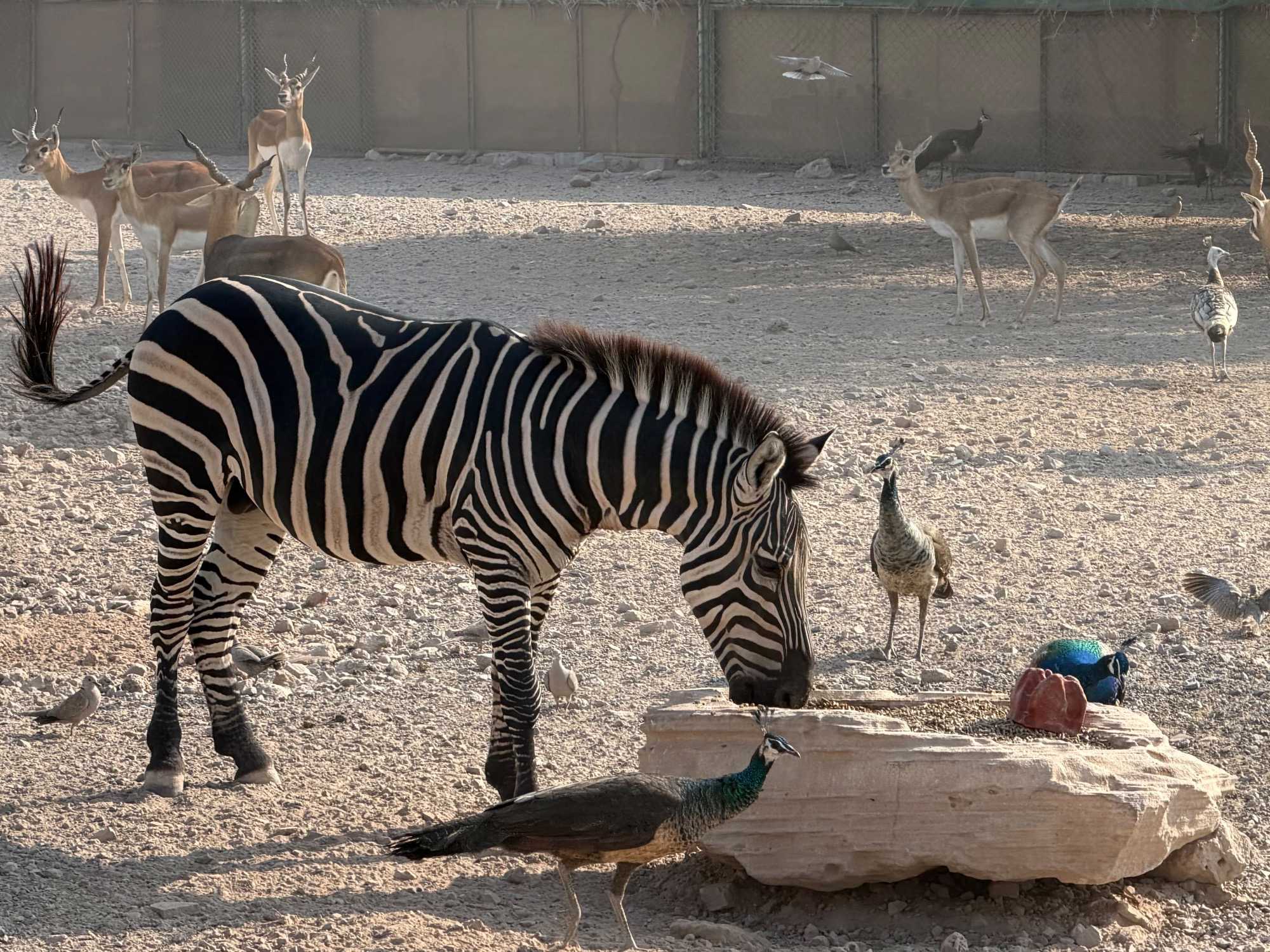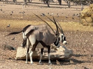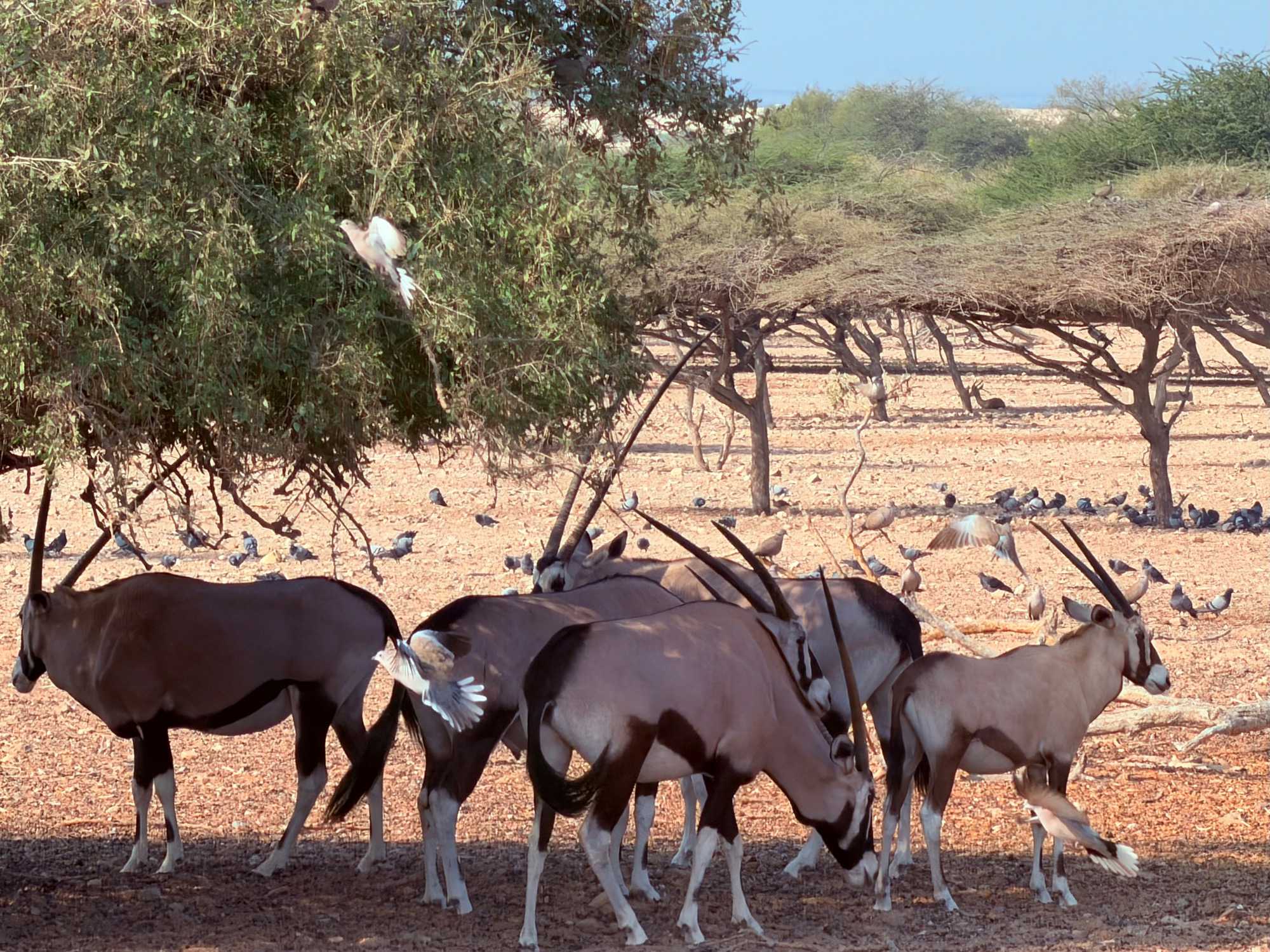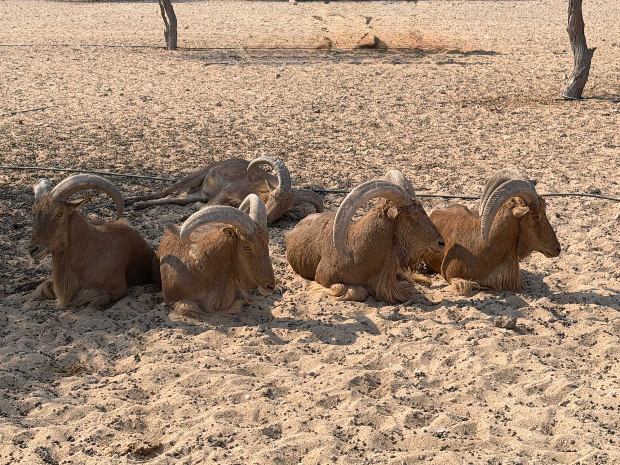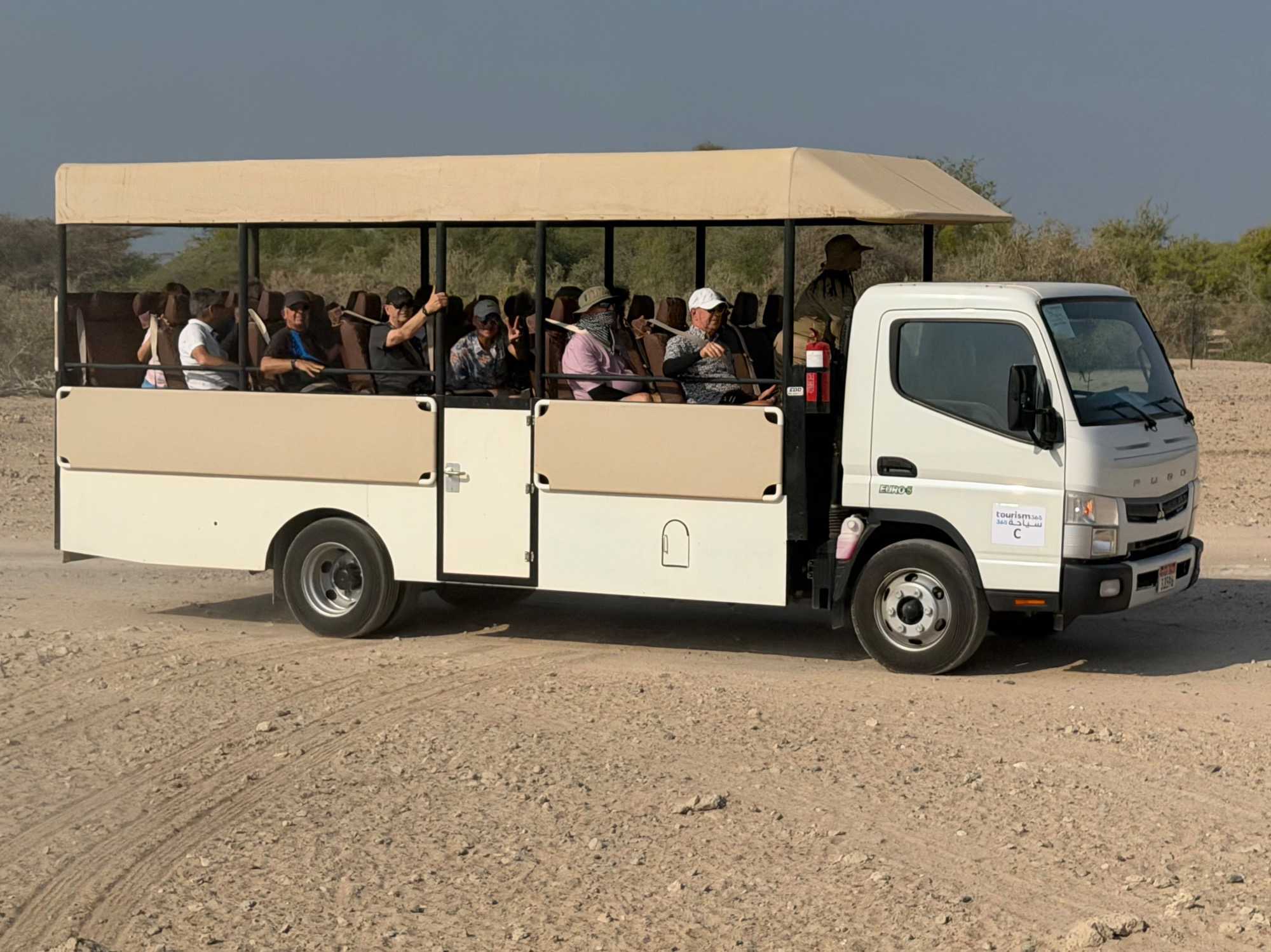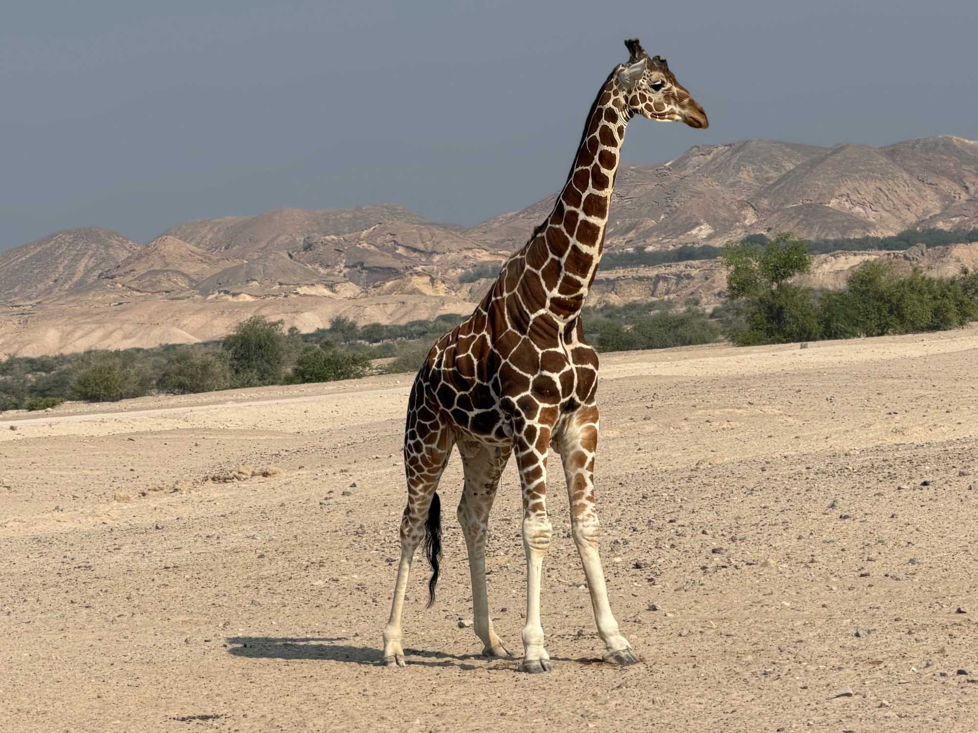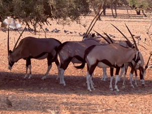 Arrivés au lieu de départ, trois jeeps de safari nous attendaient, chacune avec son guide. Nous avons embarqué pour un tour d’environ une heure et demie au cœur de cette île si particulière. Sir Bani Yas n’est pas un simple lieu touristique : c’est une réserve naturelle née de la vision incroyable du Sheikh Zayed, fondateur des Émirats arabes unis, qui rêvait de créer ici un sanctuaire pour la faune en danger. Au fil du safari, nous avons été plongés dans cette vision : girafes, oryx d’Arabie, gazelles, autruches… Les animaux traversaient notre chemin en toute liberté, parfaitement chez eux. Le guide expliquait l’histoire de l’île, les efforts de conservation et les différentes espèces que nous apercevions. Pour ma part, j’étais accompagnée d’un guide originaire du Ghana, Charles, un homme absolument charmant, drôle et attachant. Ses petites chansons, son humour chaleureux et son regard passionné sur la nature ont rendu cette balade encore plus magique.