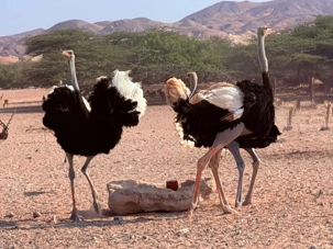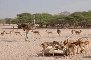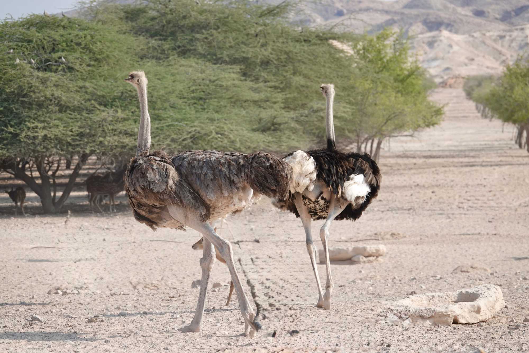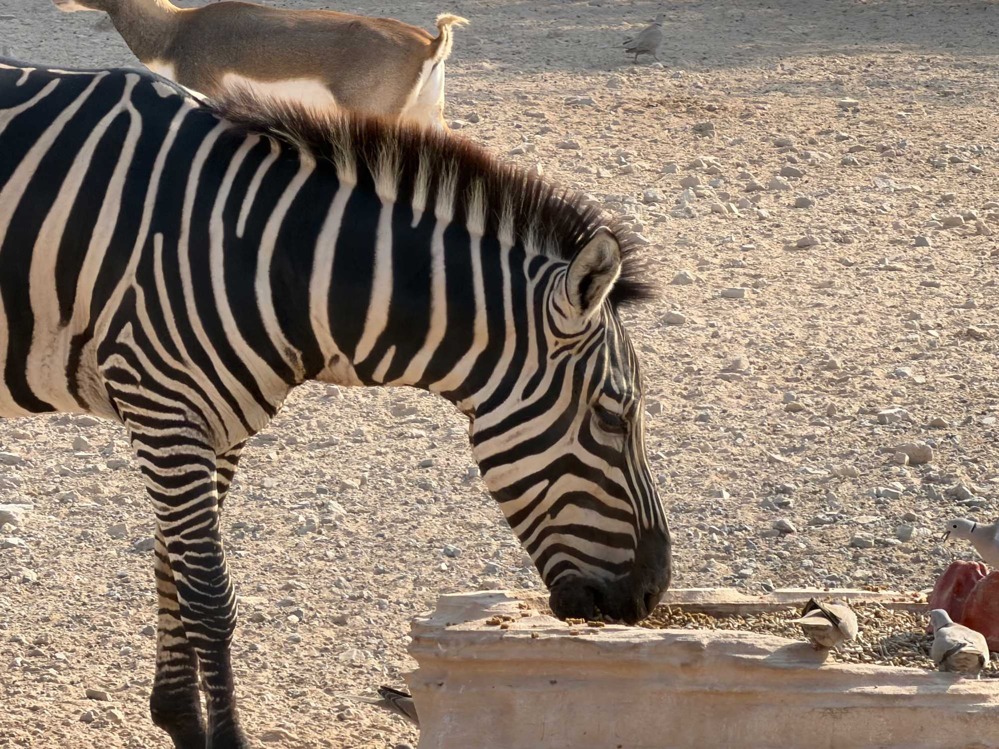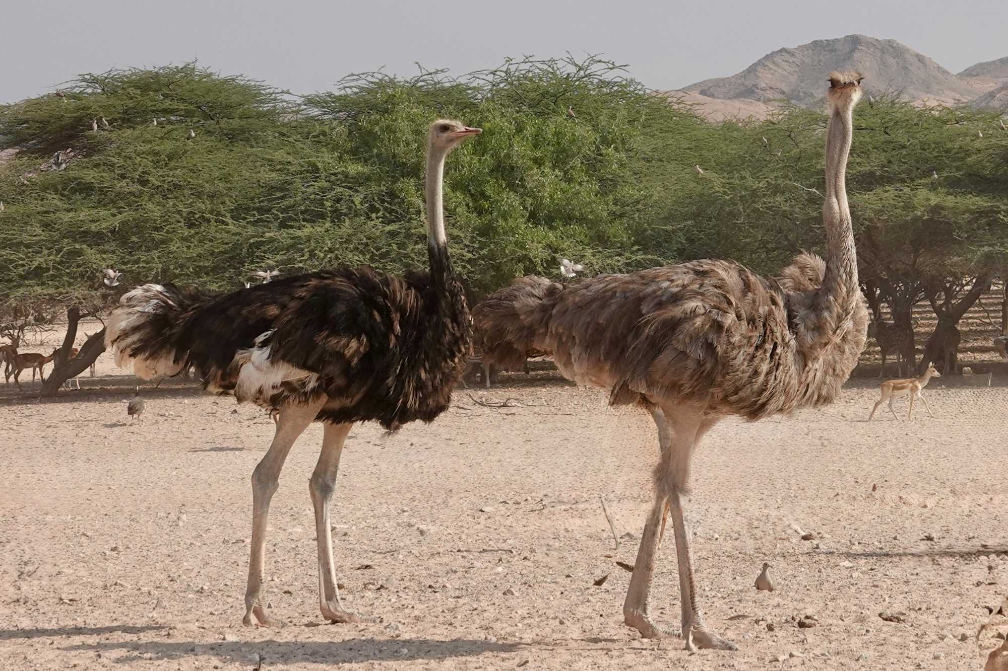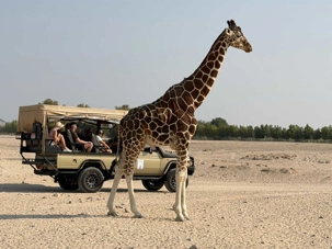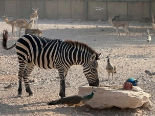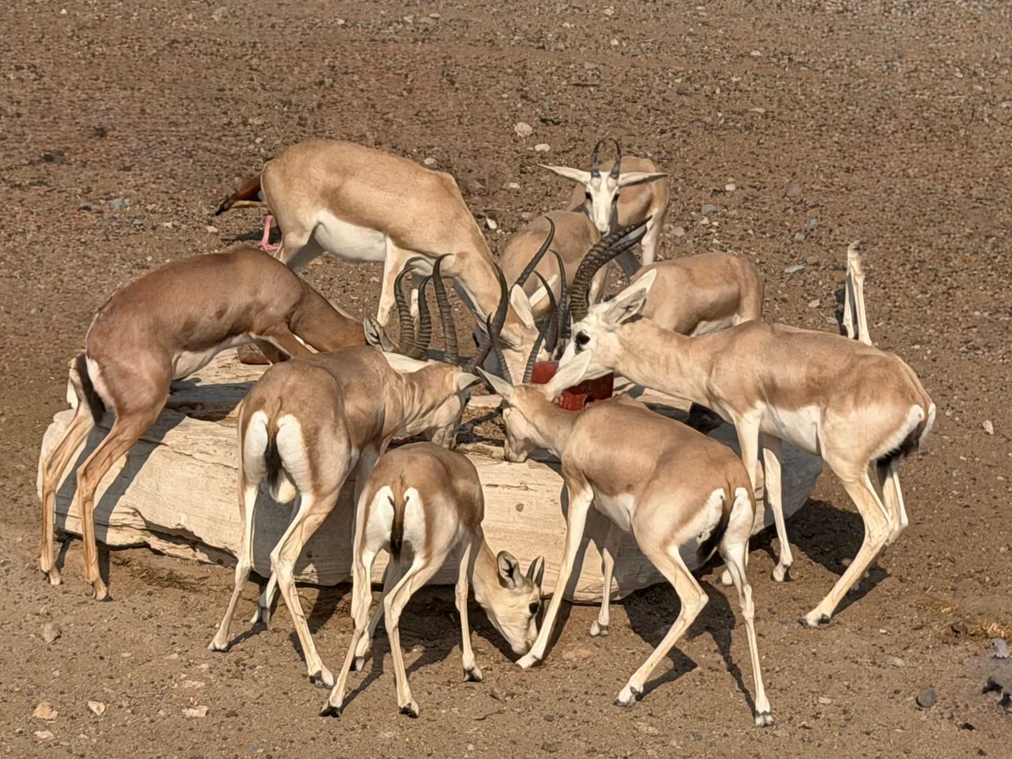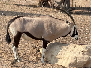 Arrivés au lieu de départ, trois jeeps de safari nous attendaient, chacune avec son guide. Nous avons embarqué pour un tour d’environ une heure et demie au cœur de cette île si particulière. Sir Bani Yas n’est pas un simple lieu touristique : c’est une réserve naturelle née de la vision incroyable du Sheikh Zayed, fondateur des Émirats arabes unis, qui rêvait de créer ici un sanctuaire pour la faune en danger. Au fil du safari, nous avons été plongés dans cette vision : girafes, oryx d’Arabie, gazelles, autruches… Les animaux traversaient notre chemin en toute liberté, parfaitement chez eux. Le guide expliquait l’histoire de l’île, les efforts de conservation et les différentes espèces que nous apercevions. Pour ma part, j’étais accompagnée d’un guide originaire du Ghana, Charles, un homme absolument charmant, drôle et attachant. Ses petites chansons, son humour chaleureux et son regard passionné sur la nature ont rendu cette balade encore plus magique.
