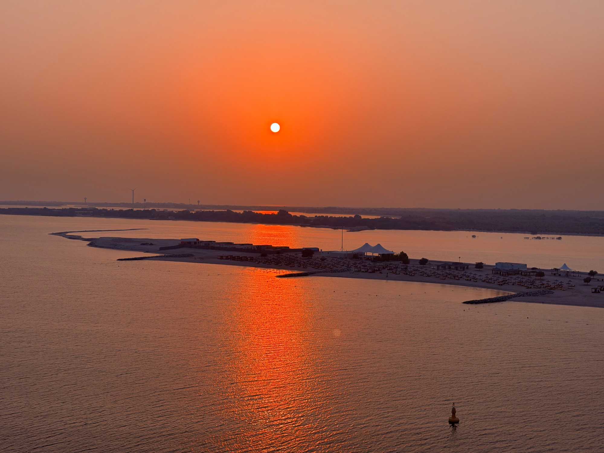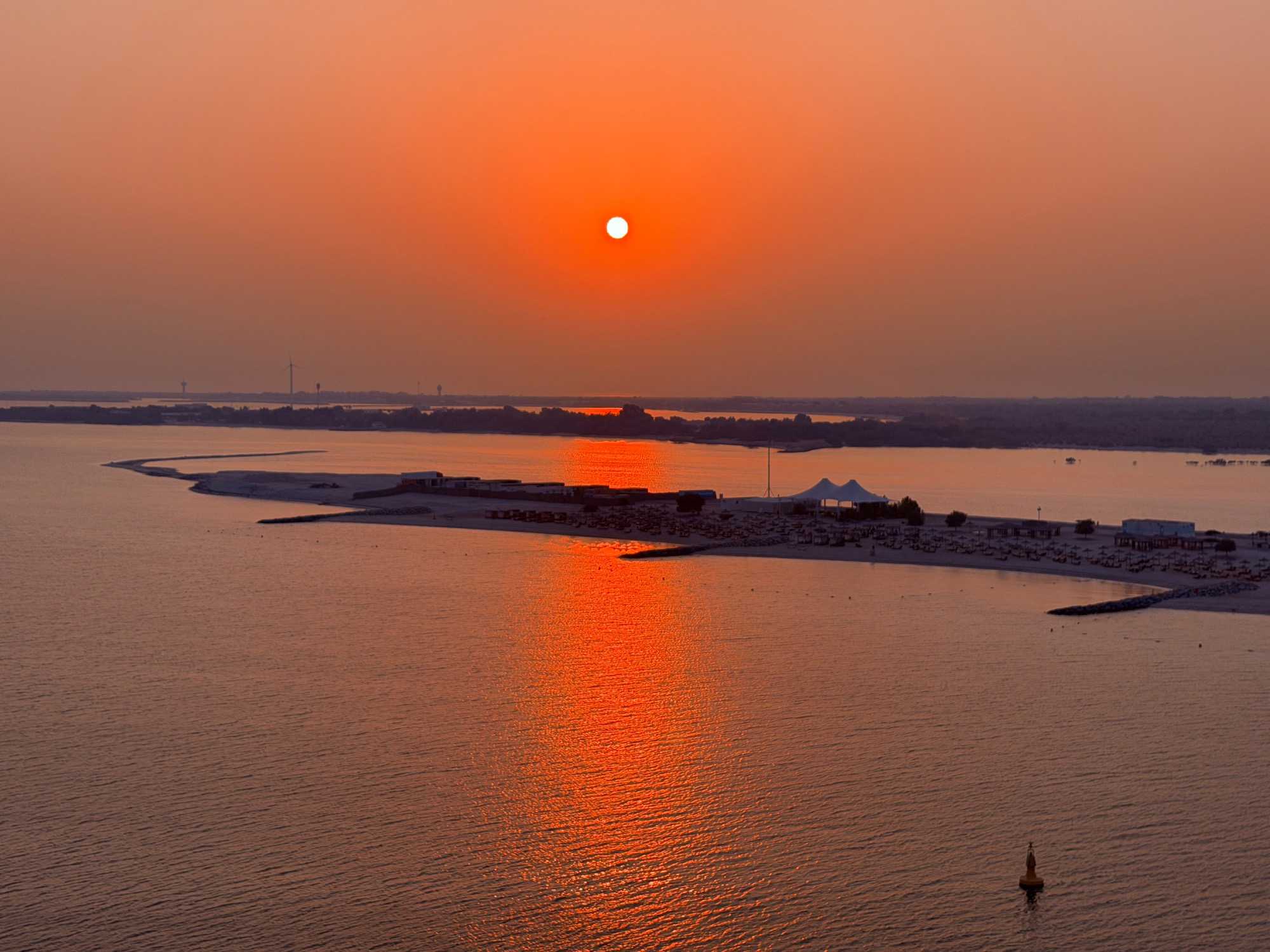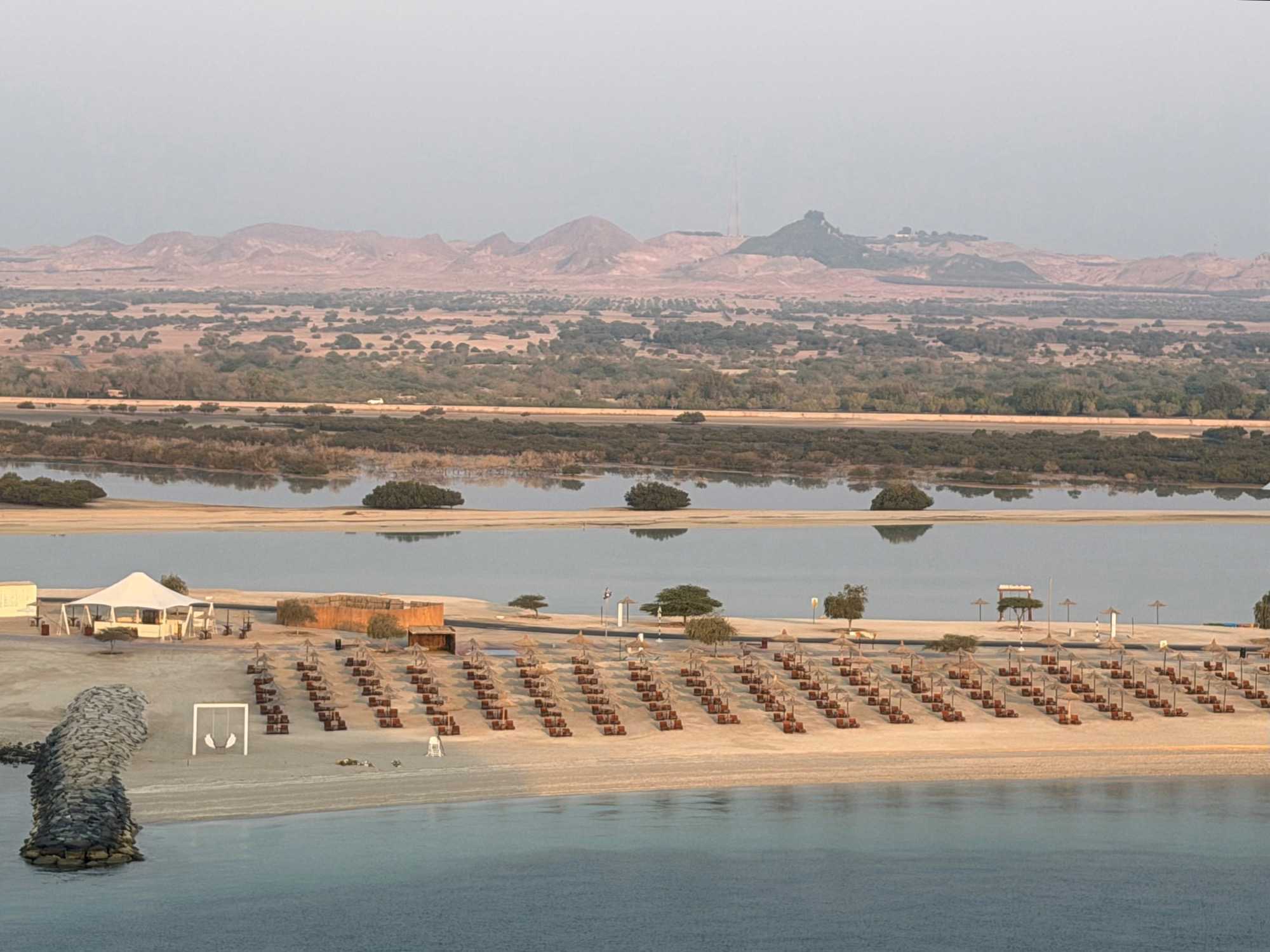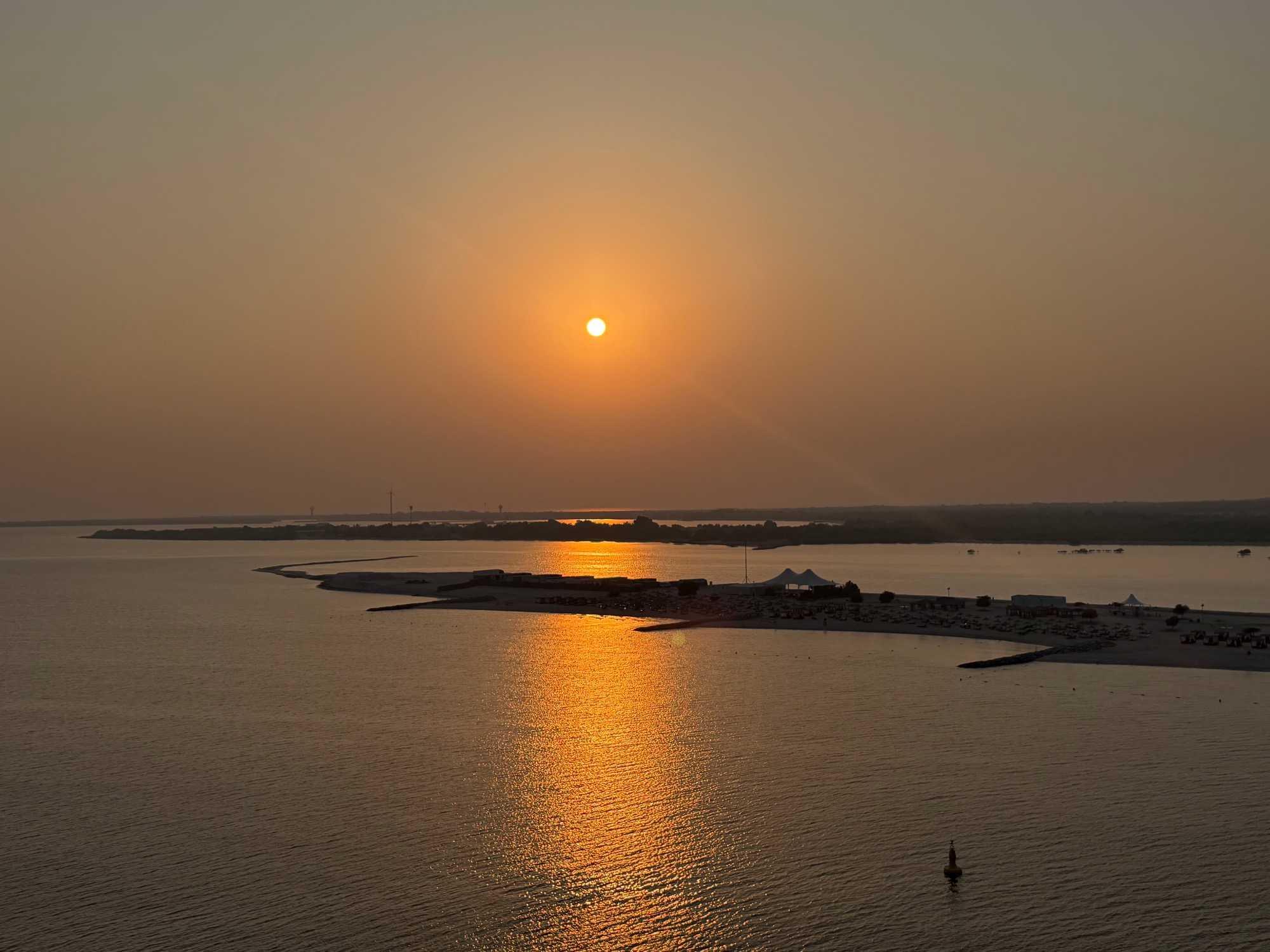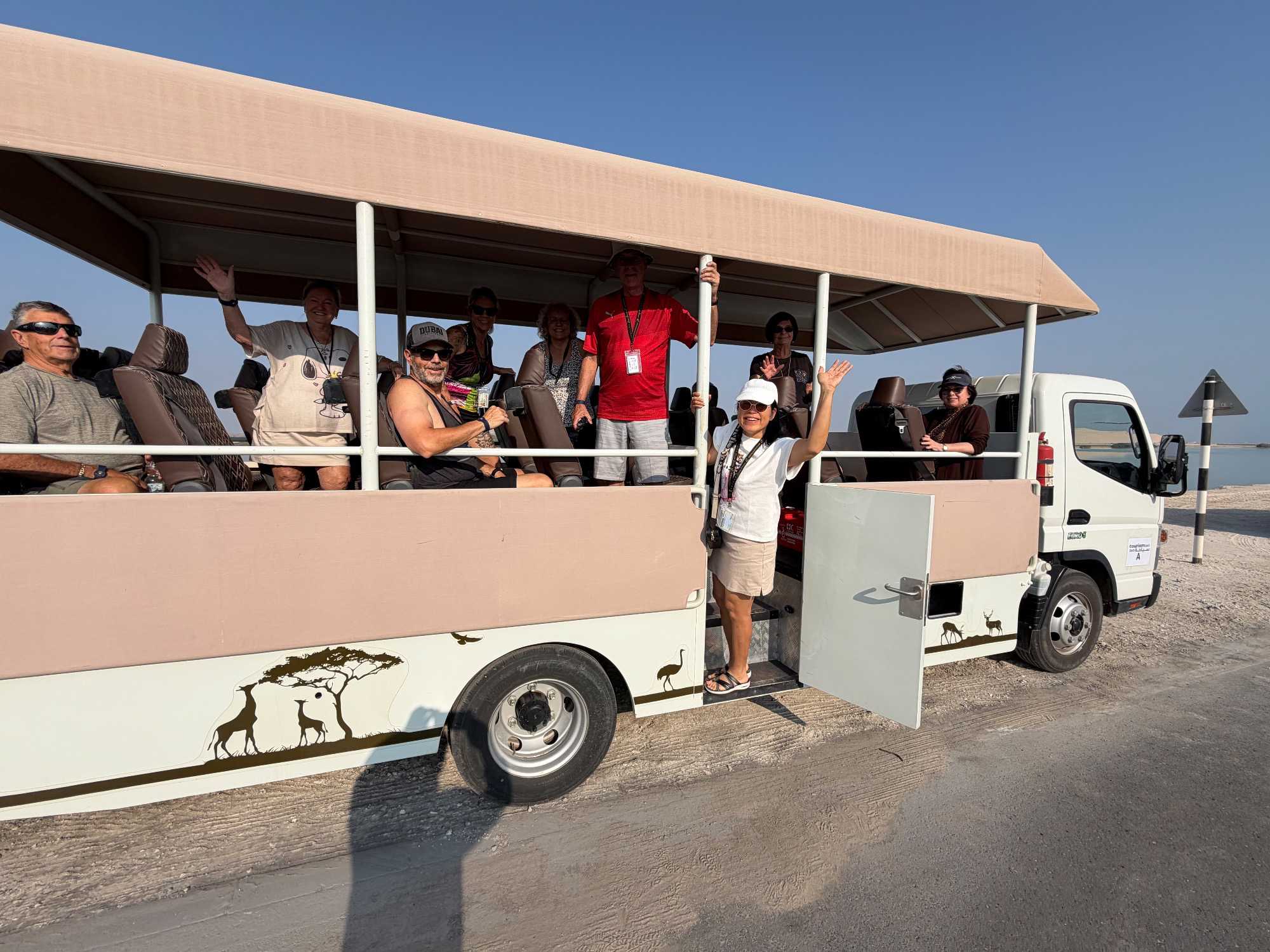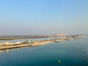 Ce matin, lorsque j’ai ouvert les rideaux de ma cabine, j’ai tout de suite senti que cette journée serait exceptionnelle. Le navire glissait silencieusement vers une île étonnante, presque irréelle : Sir Bani Yas, un joyau posé sur la mer, entouré d’une lumière dorée. Nous étions enveloppés dans une atmosphère de calme absolu. Habituellement, le vent souffle très fort sur cette île, mais aujourd’hui, la mer était d’une tranquillité parfaite et la météo absolument sublime. Quelle chance nous avons eue !