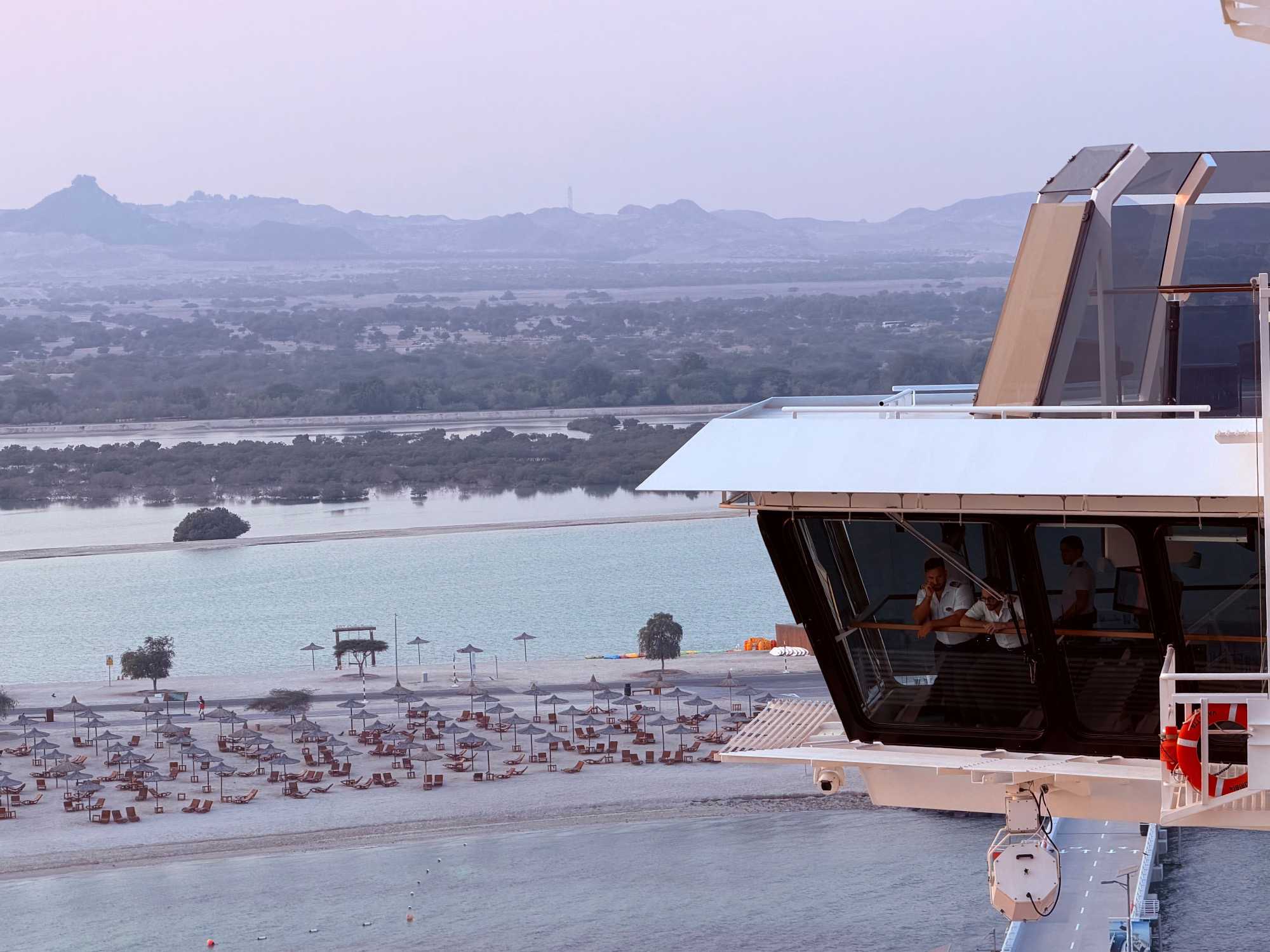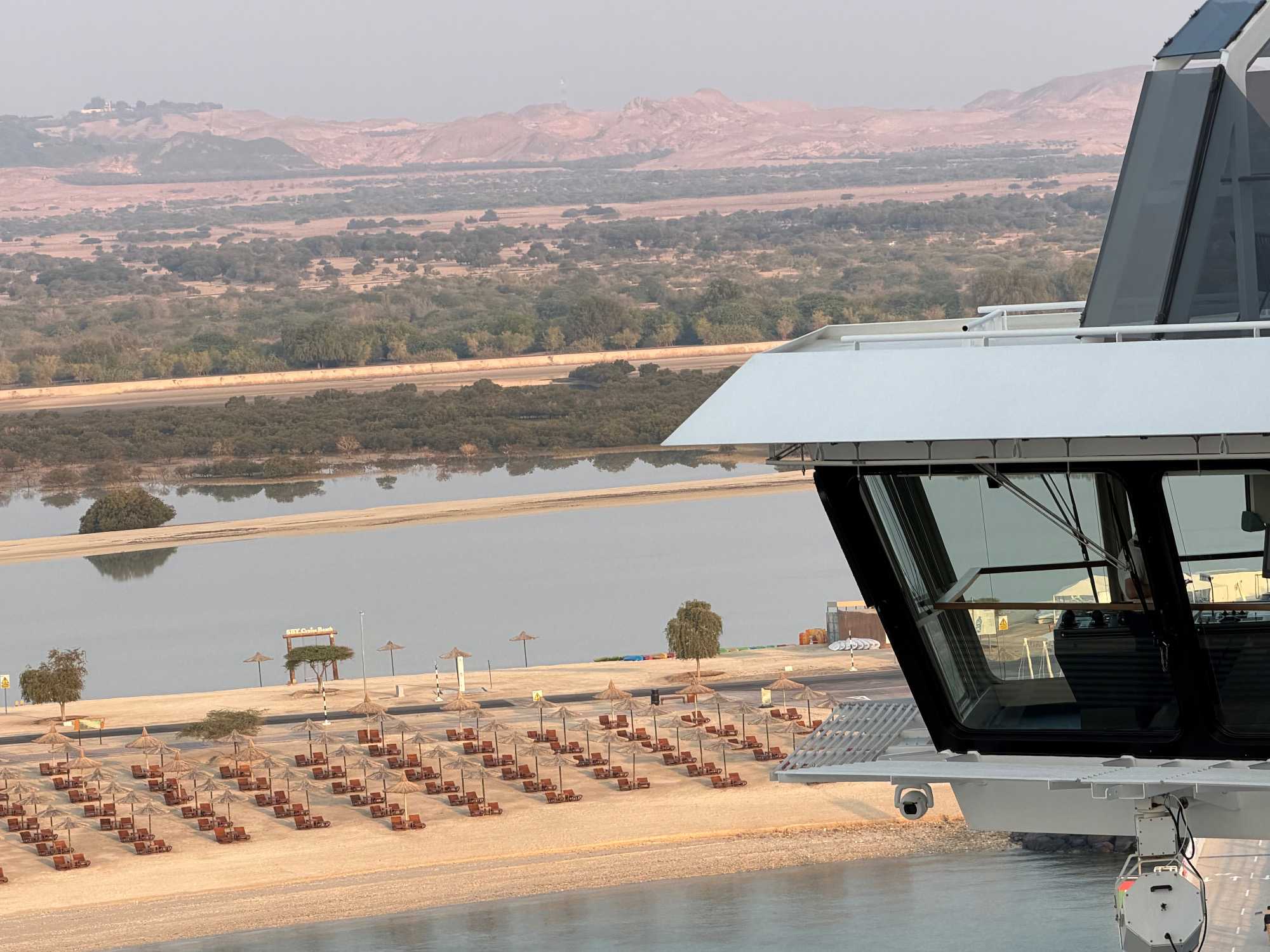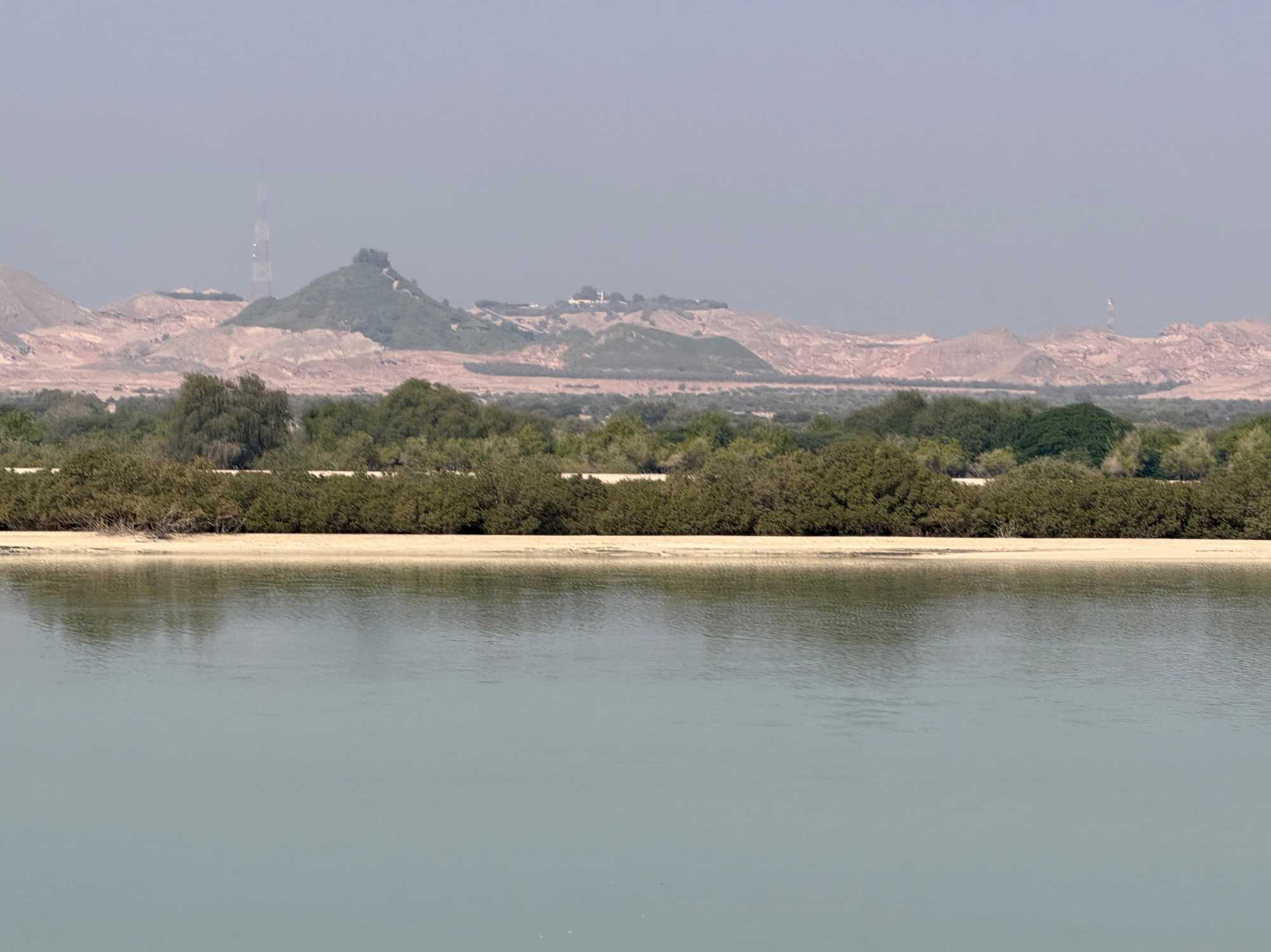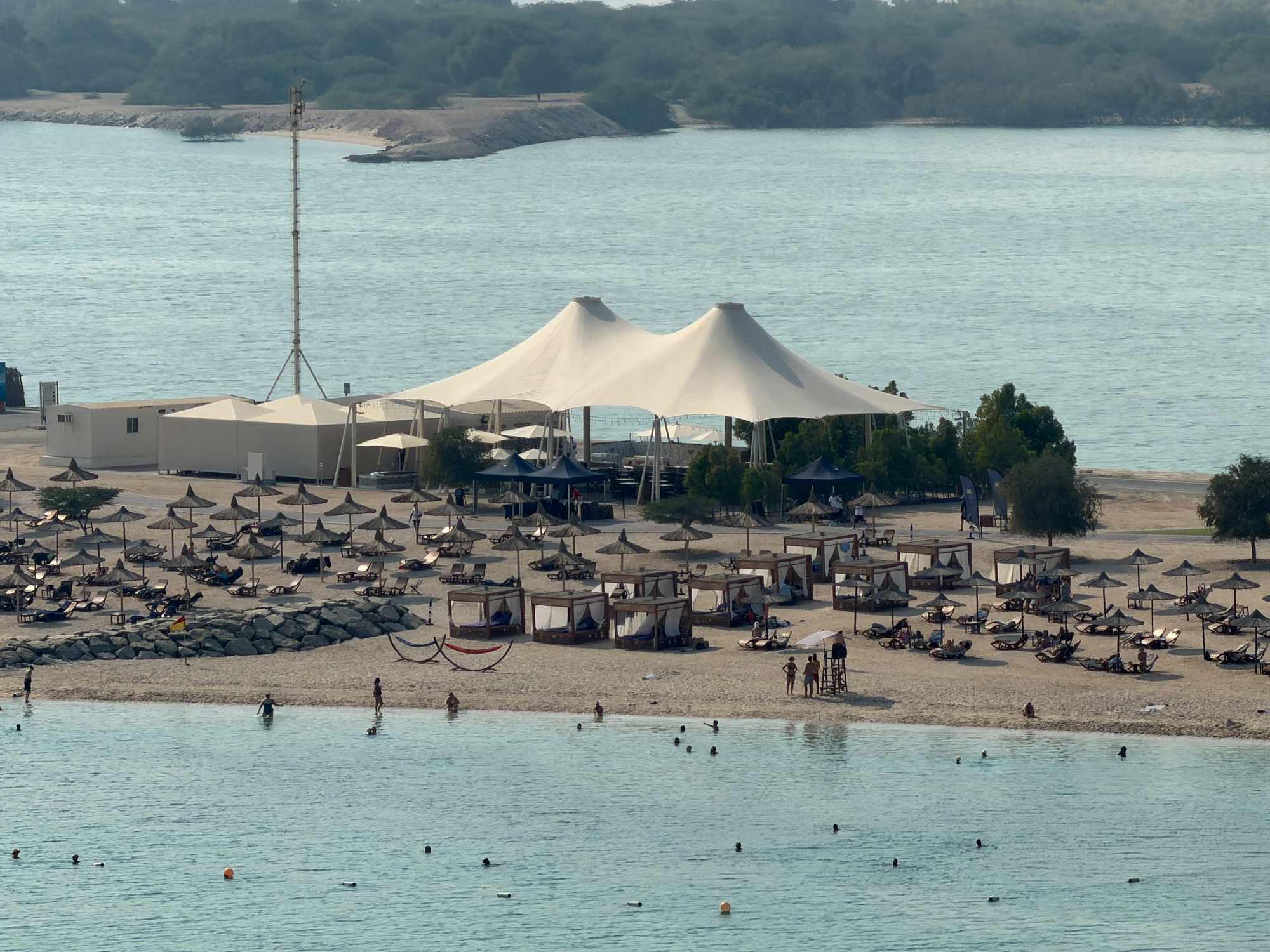 Ce matin, lorsque j’ai ouvert les rideaux de ma cabine, j’ai tout de suite senti que cette journée serait exceptionnelle. Le navire glissait silencieusement vers une île étonnante, presque irréelle : Sir Bani Yas, un joyau posé sur la mer, entouré d’une lumière dorée. Nous étions enveloppés dans une atmosphère de calme absolu. Habituellement, le vent souffle très fort sur cette île, mais aujourd’hui, la mer était d’une tranquillité parfaite et la météo absolument sublime. Quelle chance nous avons eue !
