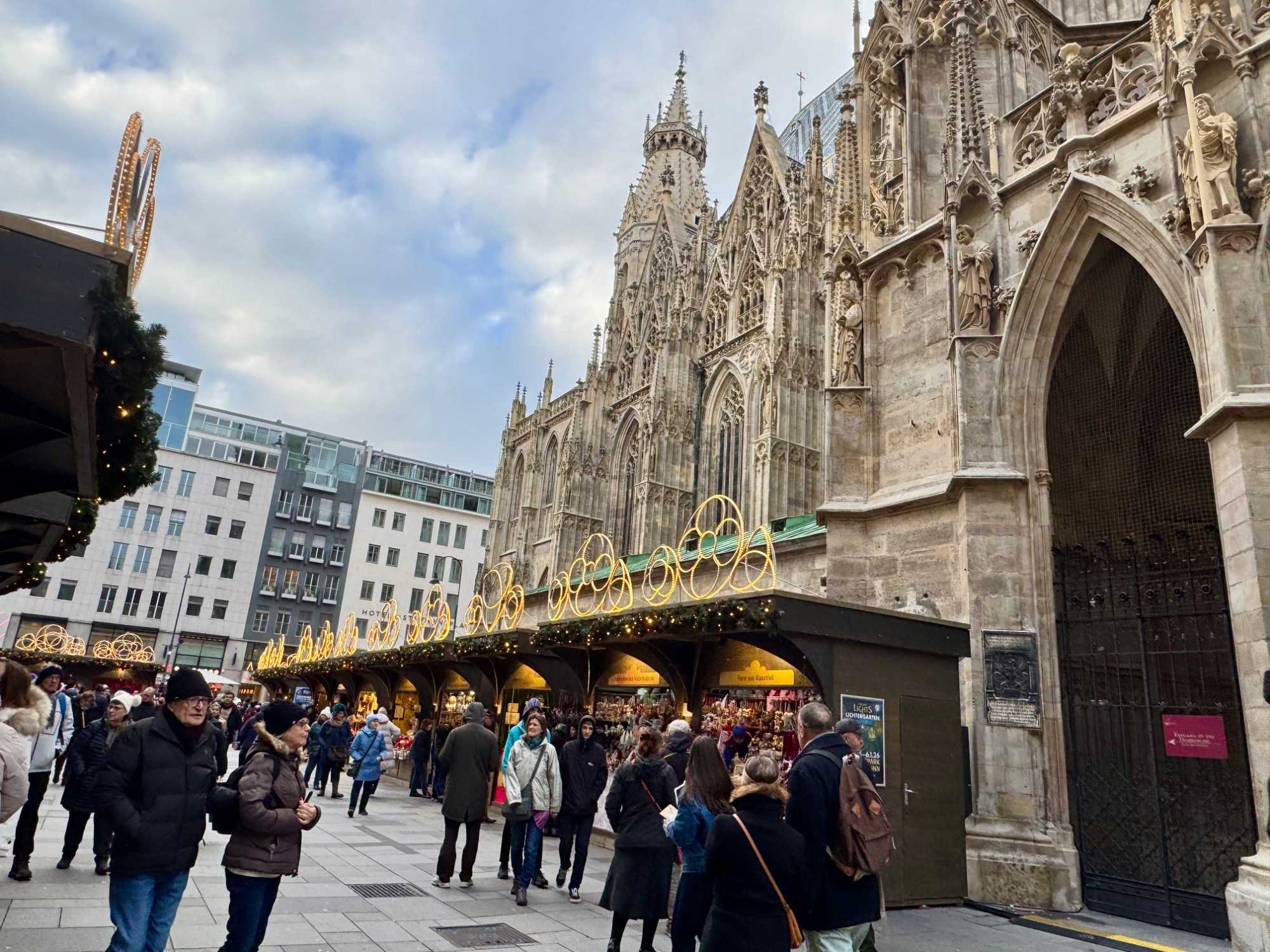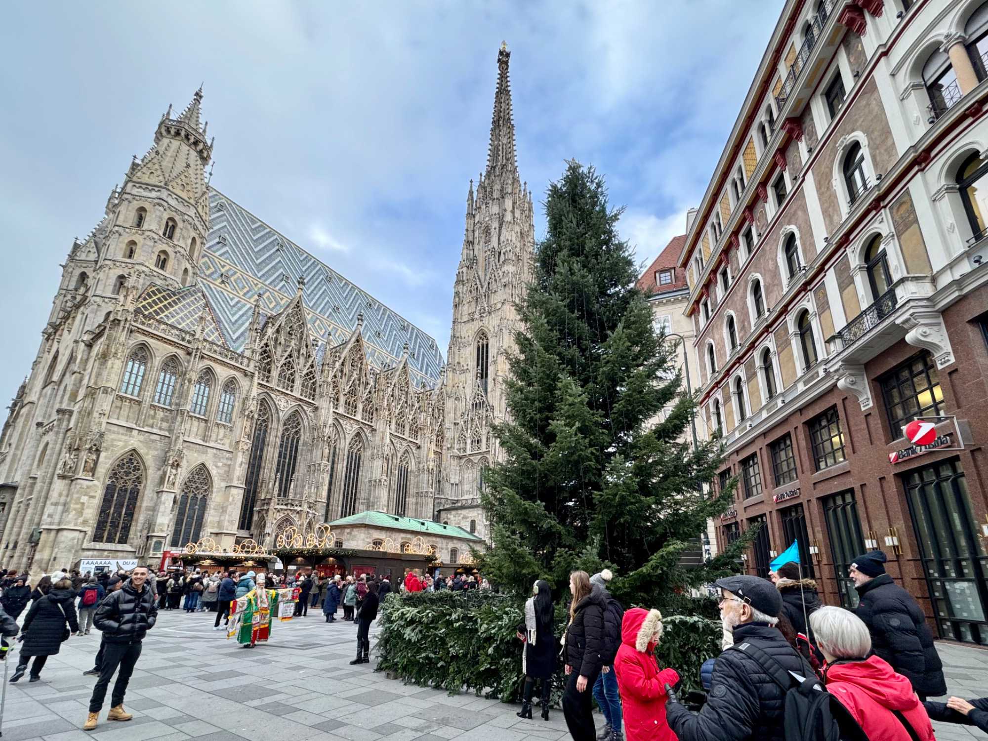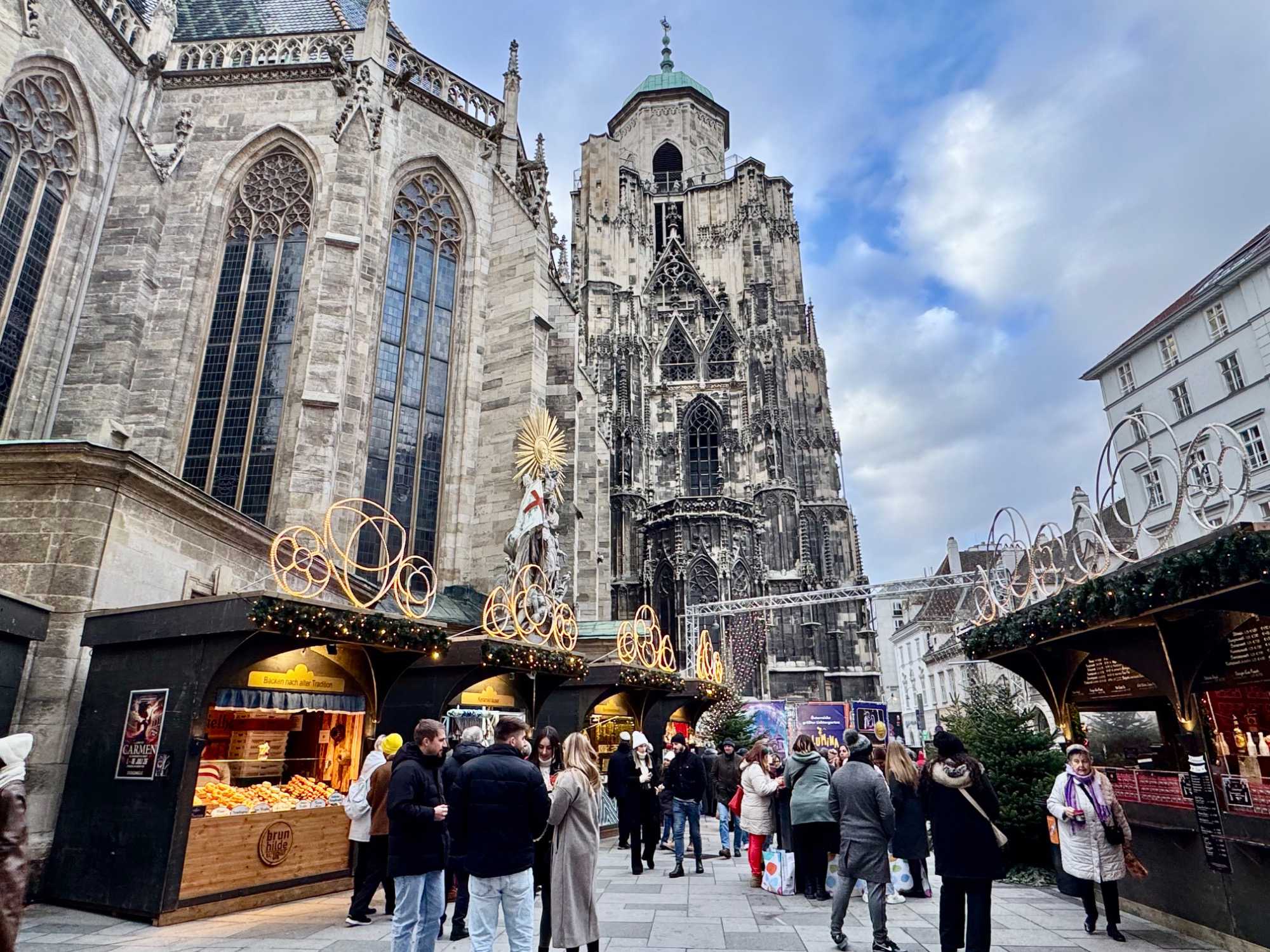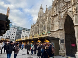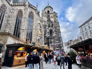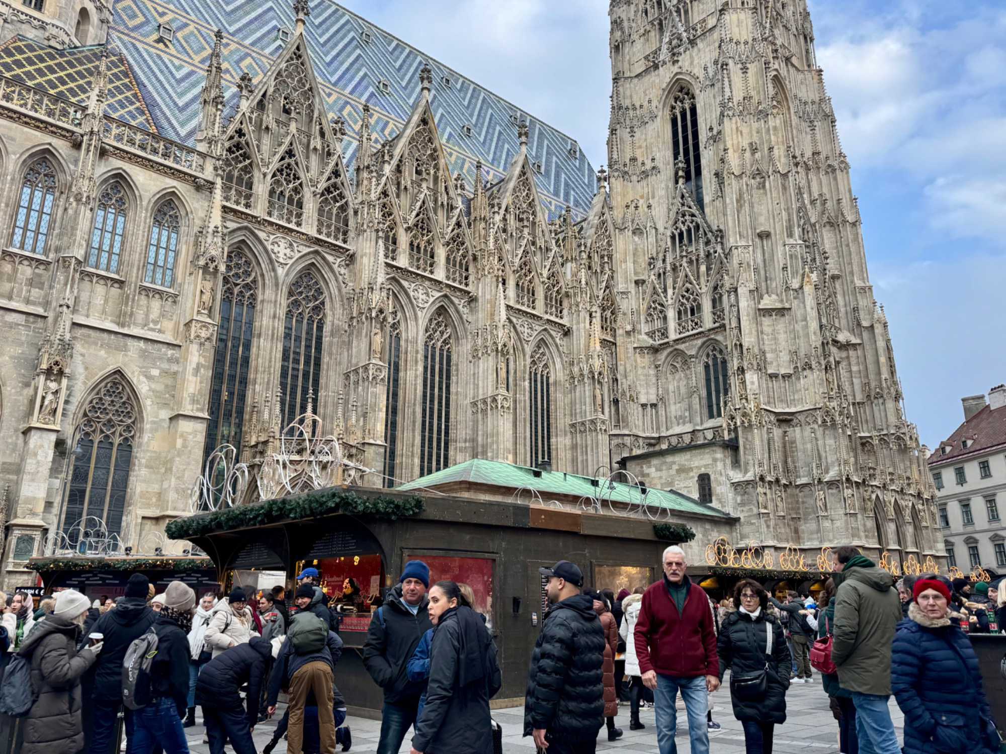 Après ce repas délicieux, un temps libre est accordé en début d’après-midi. Plutôt que de rester dans le quartier des musées, nous partons nous balader au centre-ville de Vienne. Certains voyageurs choisissent de flâner le long des rues élégantes, d’autres de savourer un café, mais la plupart se dirigent vers la cathédrale Saint-Étienne. Nous admirons son impressionnante architecture gothique et son toit aux tuiles colorées avant de parcourir le marché de Noël installé sur la Stephansplatz. Les petites échoppes illuminées, les parfums d’épices, de vin chaud et de douceurs viennoises créent une ambiance chaleureuse et festive.