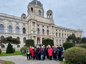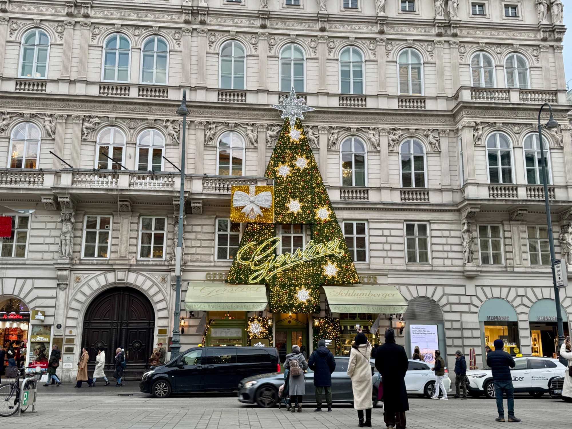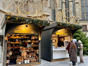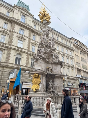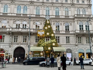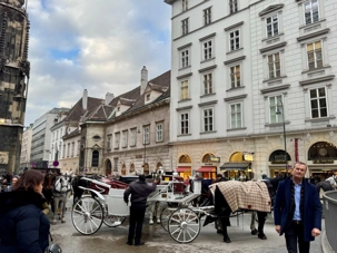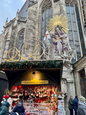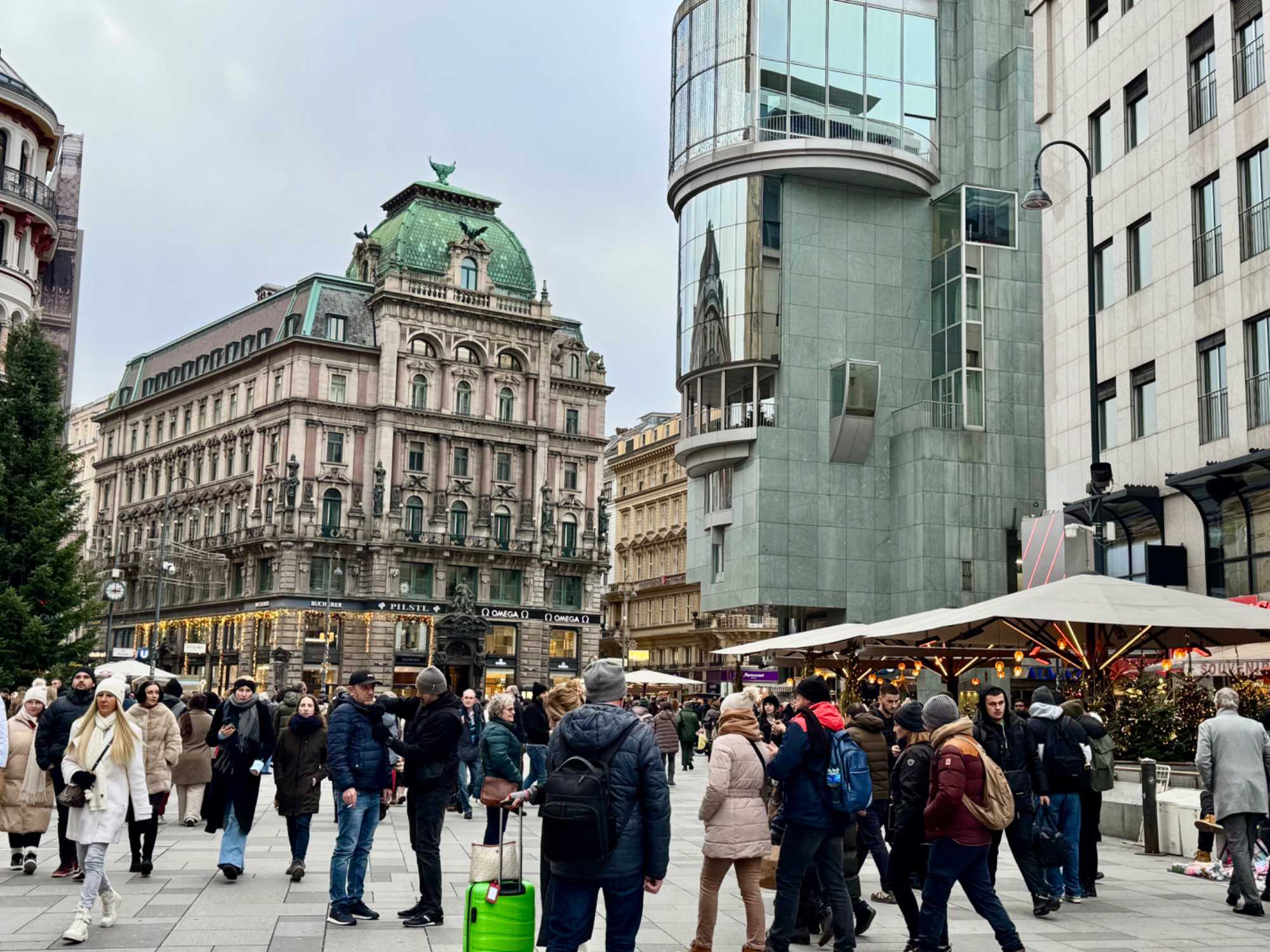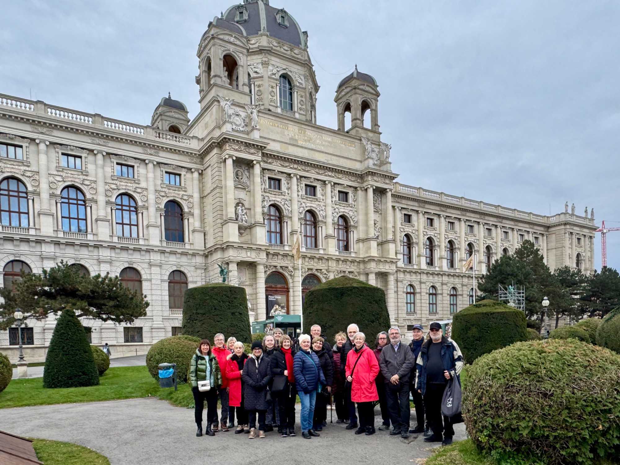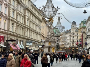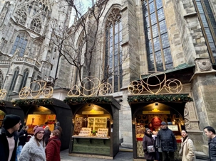 Après ce repas délicieux, un temps libre est accordé en début d’après-midi. Plutôt que de rester dans le quartier des musées, nous partons nous balader au centre-ville de Vienne. Certains voyageurs choisissent de flâner le long des rues élégantes, d’autres de savourer un café, mais la plupart se dirigent vers la cathédrale Saint-Étienne. Nous admirons son impressionnante architecture gothique et son toit aux tuiles colorées avant de parcourir le marché de Noël installé sur la Stephansplatz. Les petites échoppes illuminées, les parfums d’épices, de vin chaud et de douceurs viennoises créent une ambiance chaleureuse et festive.