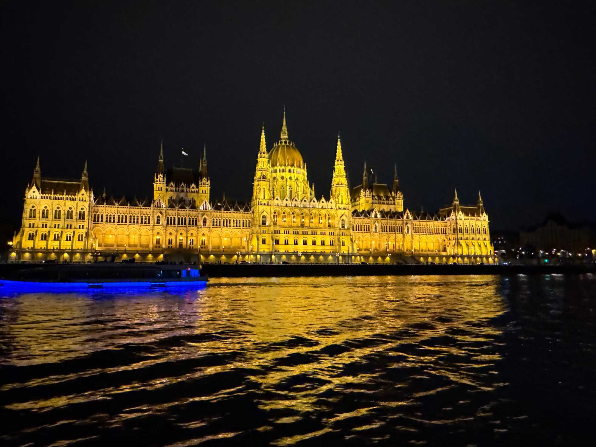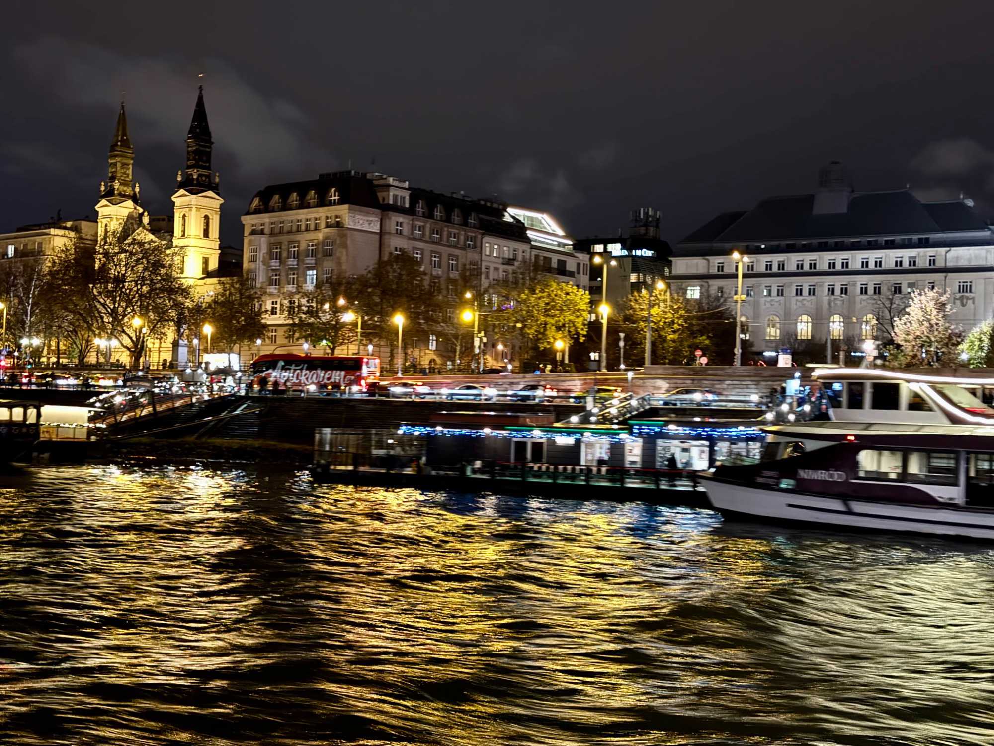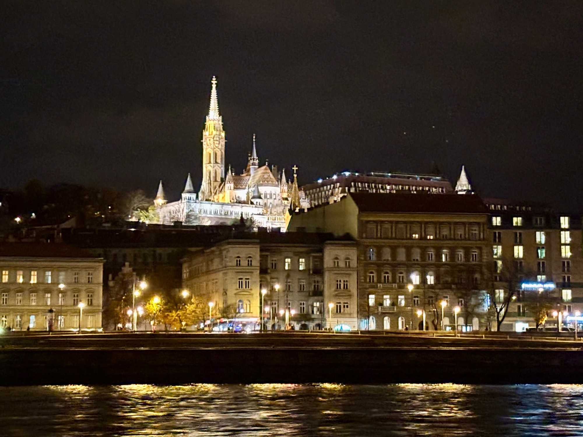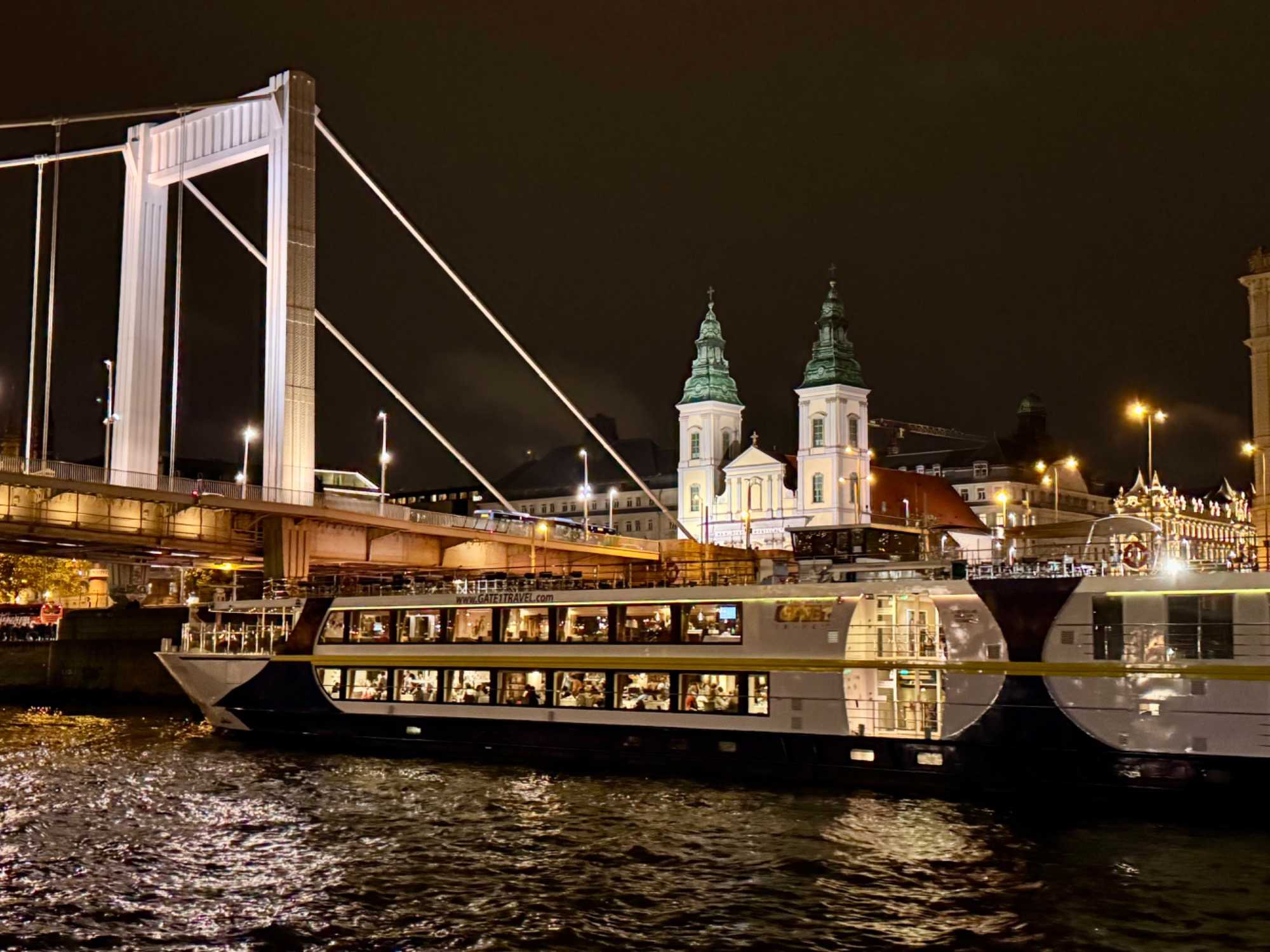 Lorsque la nuit tombe, le MS Douce France quitte lentement Budapest. Depuis le pont, les voyageurs admirent une dernière fois la ville illuminée : les ponts dorés, le Parlement resplendissant, la silhouette du château… Un tableau magique qui s’estompe doucement alors que nous mettons cap sur Bratislava.