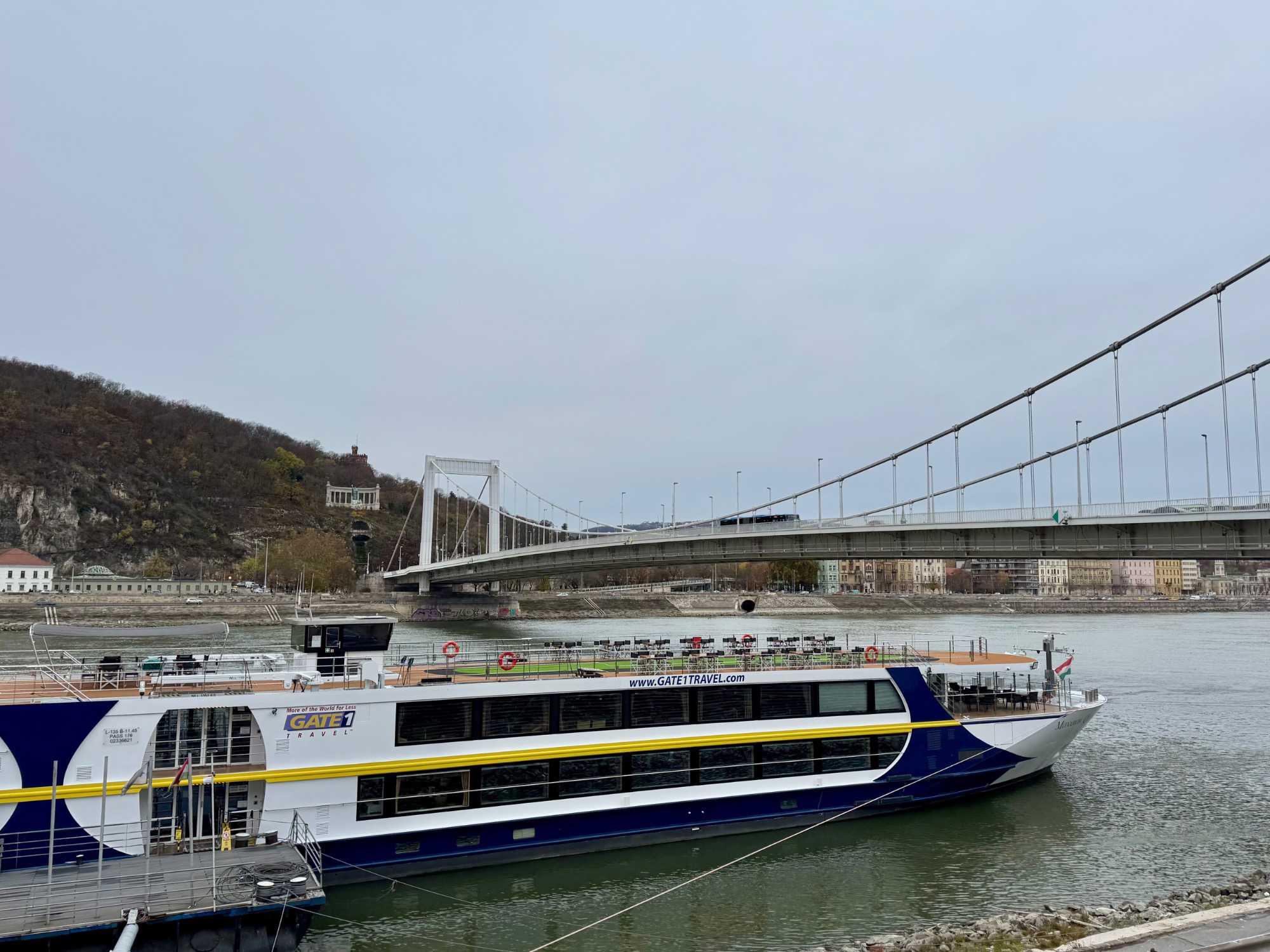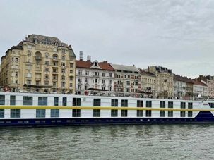 À l’aube d’une matinée fraîche et partiellement ennuagée, notre navire poursuit paisiblement sa route sur les eaux calmes du Danube. Le fleuve s’élargit progressivement, laissant apparaître au loin les plaines hongroises baignées de lumière. C’est un privilège d’assister à ce spectacle matinal depuis le pont du MS Douce France, où chacun savoure ce moment de sérénité avant d’aborder une journée riche en découvertes.